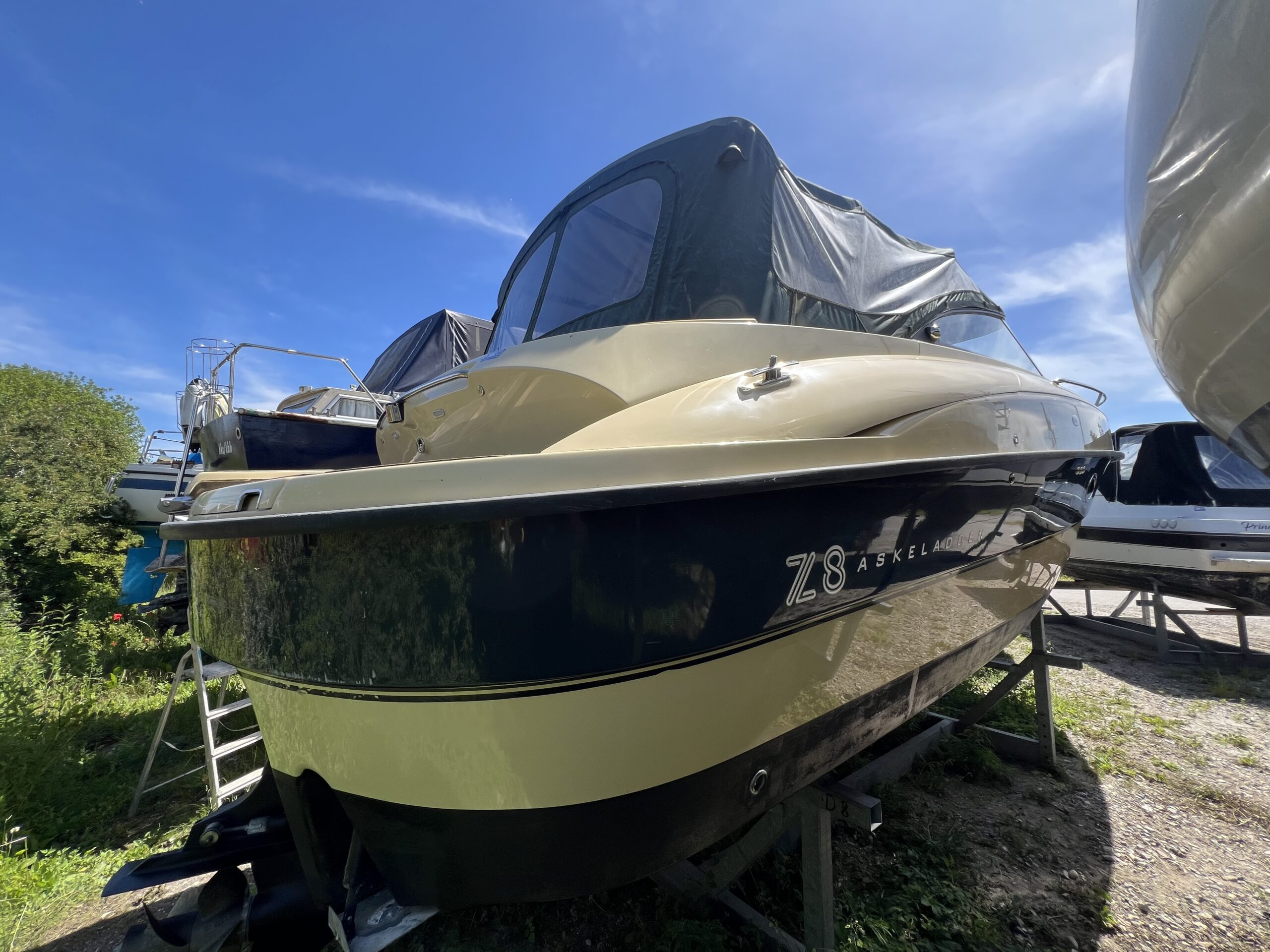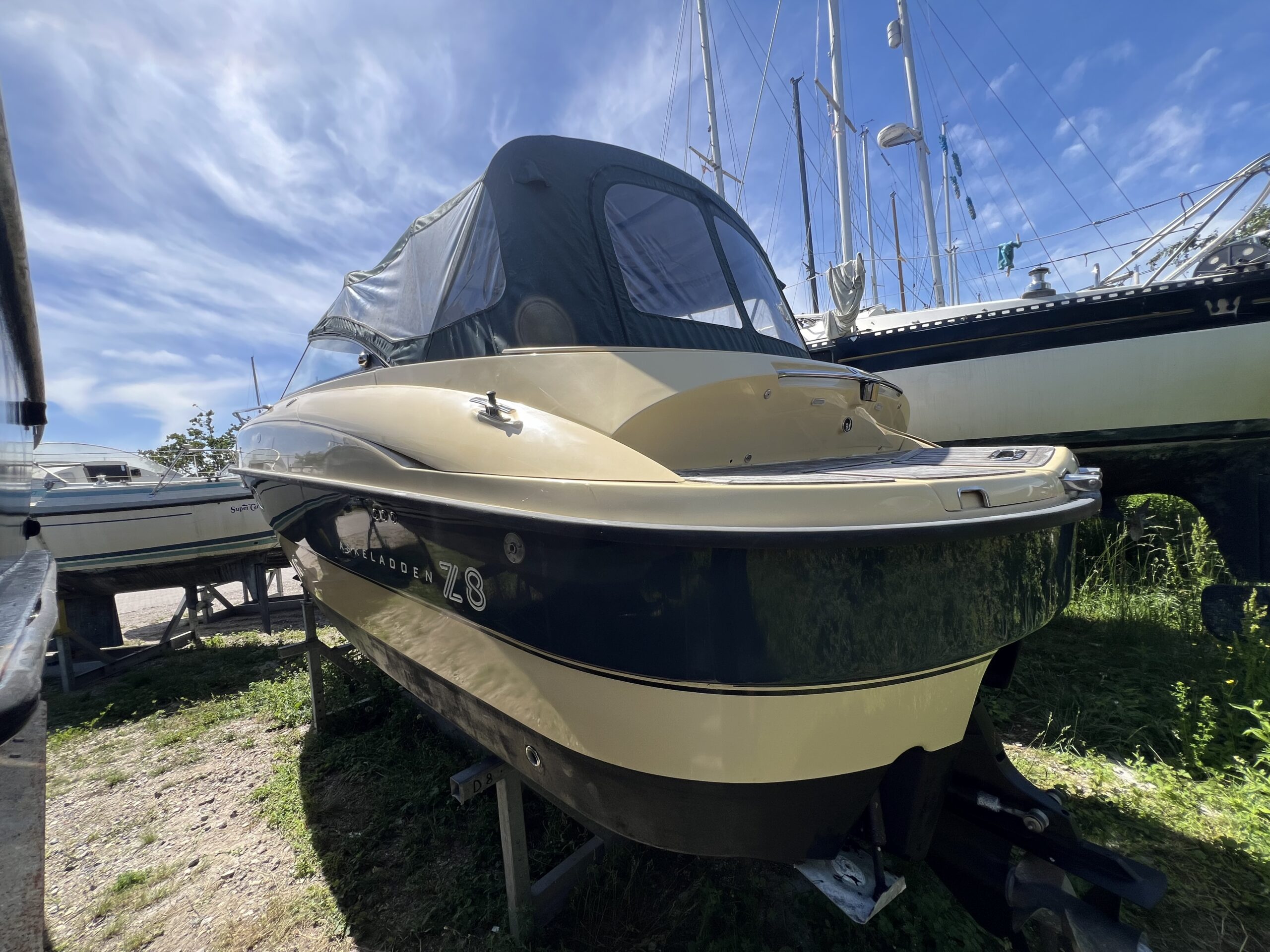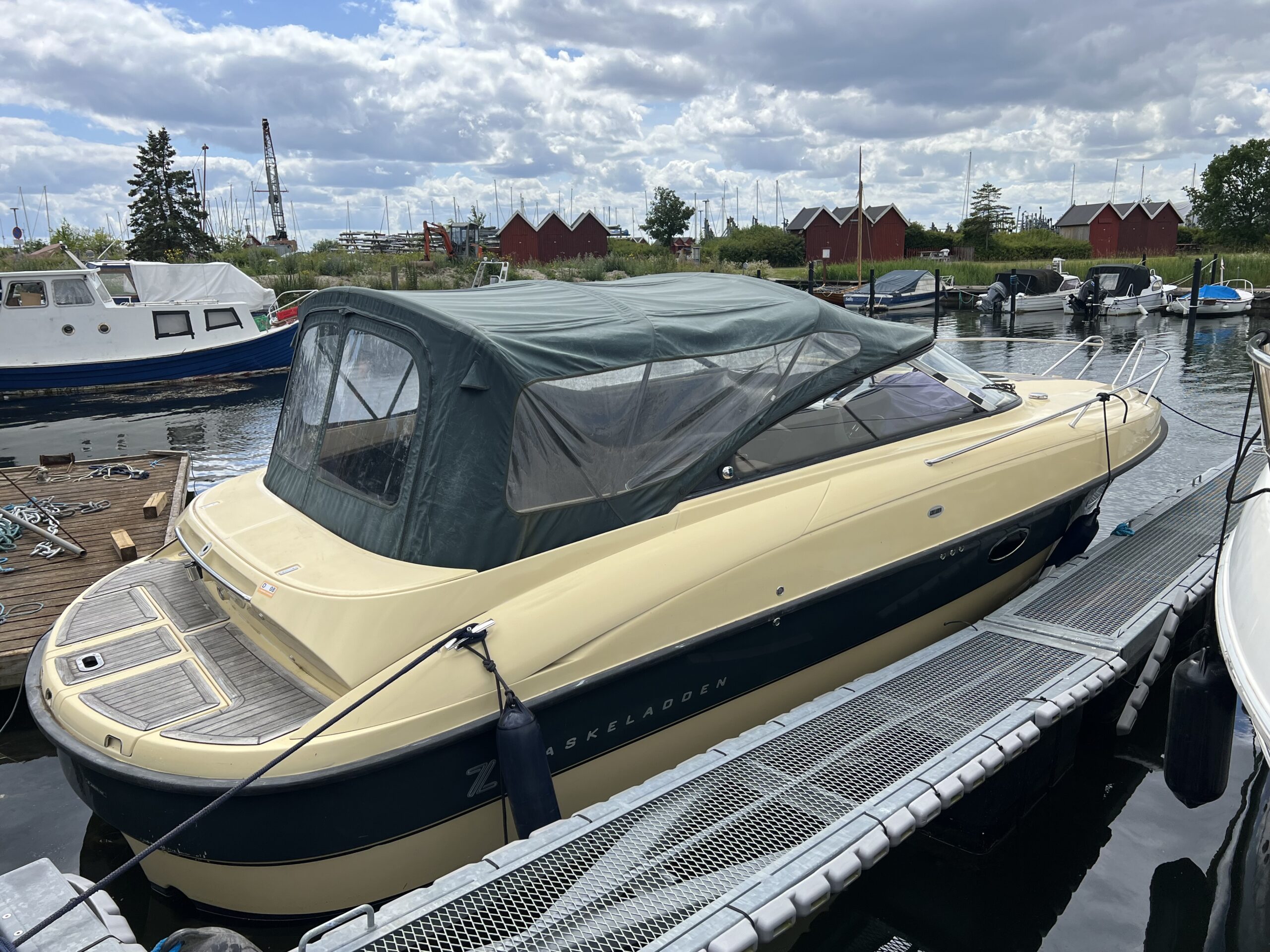 Askeladden Z8 Luksus og kvalitet daycruiser med diesel indenbords motor, Den har et gennemført finish og særlig elegance samtidig med den er solidt bygget med et stærk skrogkonstruktion. Cockpittet byder på langsgående sofa agter med bordløsning. Smart passagersæde med vipbar ryg så yderligere to siddepladser kan indgå i en “sofagruppe” agter. Vendbar Førestol med fint udsyn og lille “wetbar” med vask, koldt vand og køleskab. Kahytten er hyggelig med fin plads for overnatning endda med lille toilet rum.