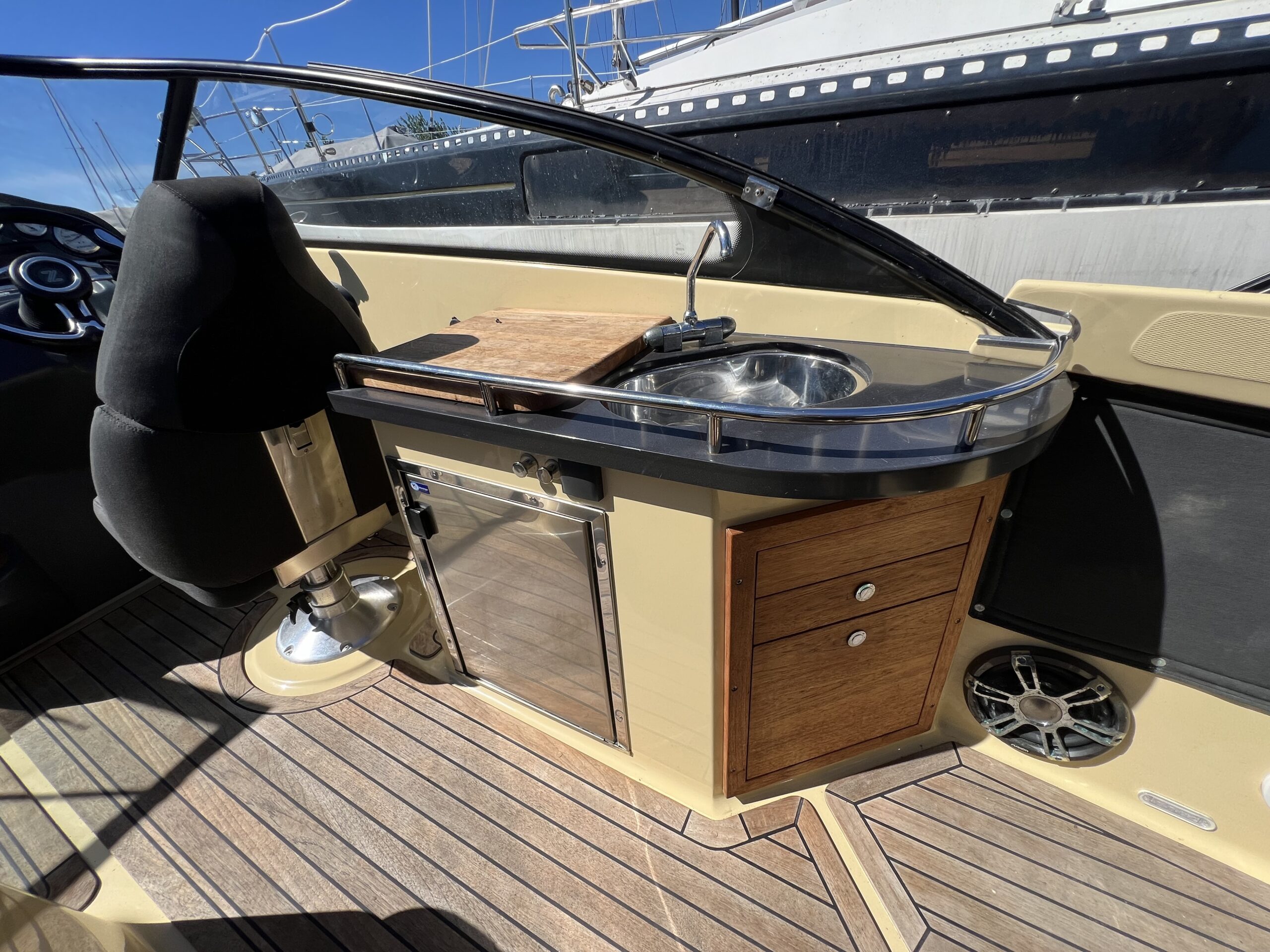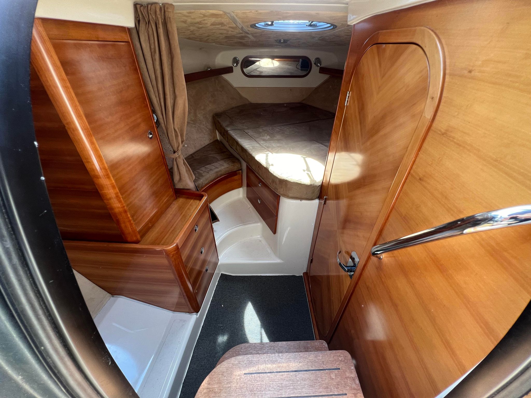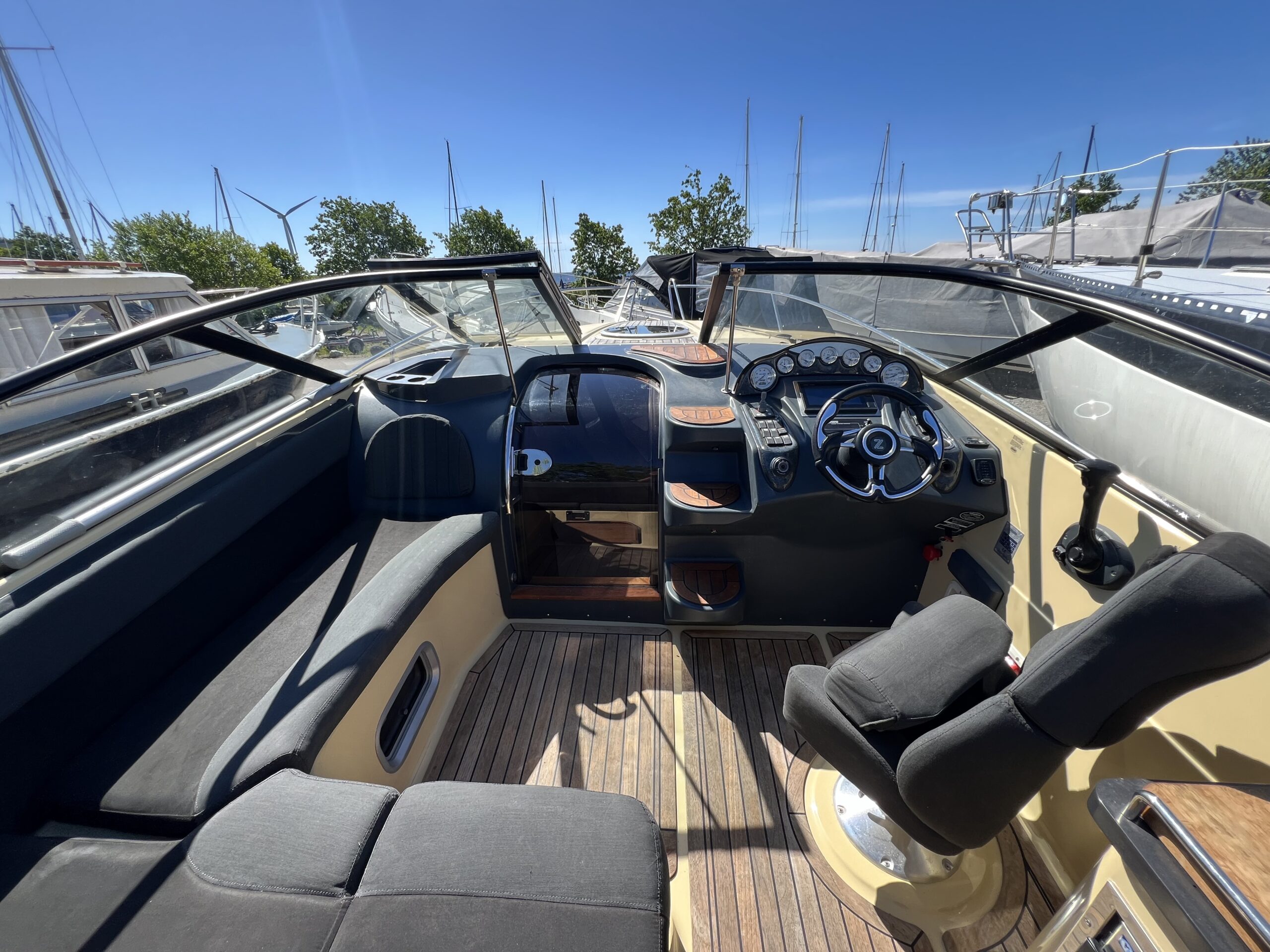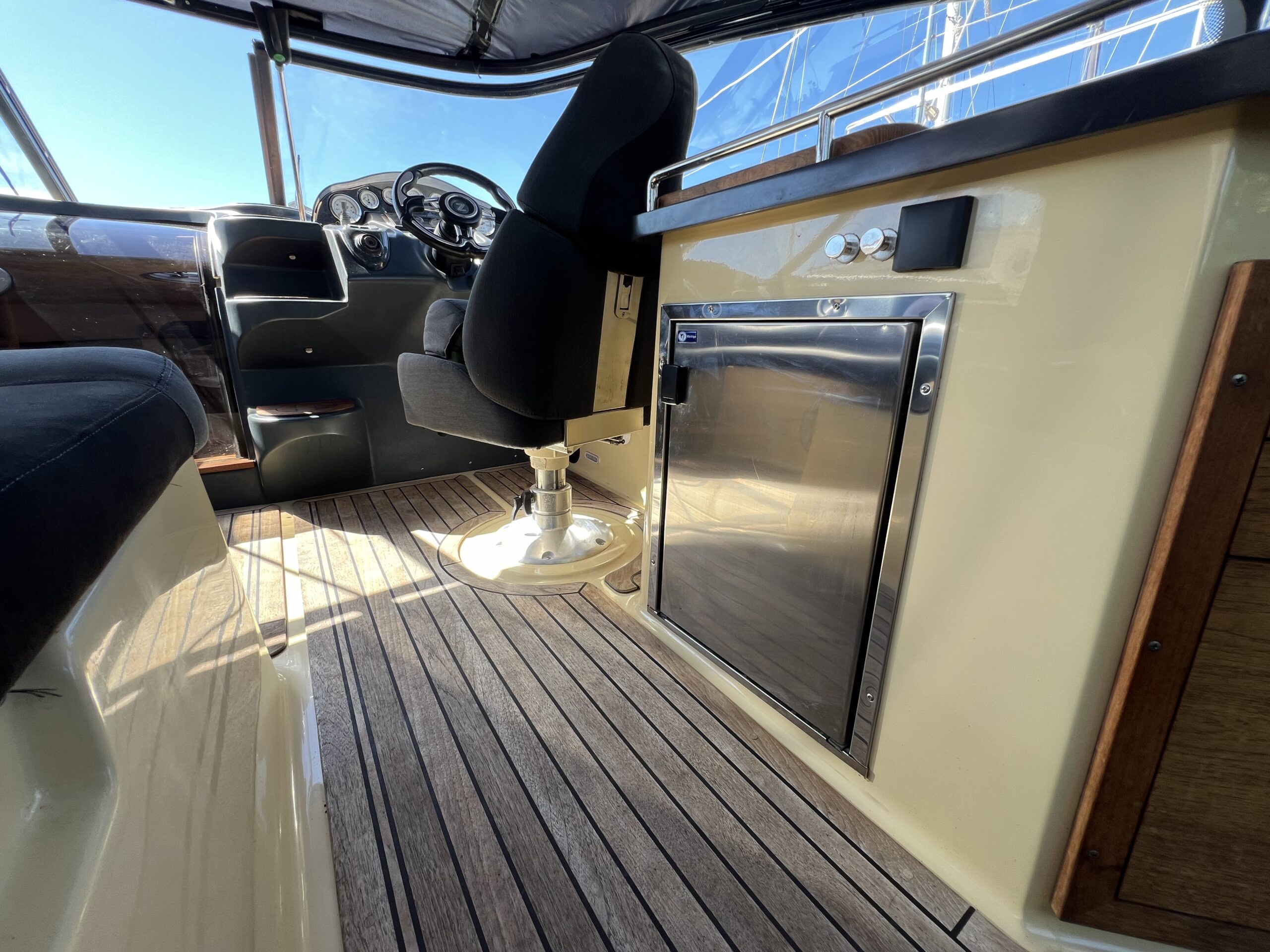 Askeladden Z8 Luksus og kvalitet daycruiser med diesel indenbords motor, Den har et gennemført finish og særlig elegance samtidig med den er solidt bygget med et stærk skrogkonstruktion. Cockpittet byder på langsgående sofa agter med bordløsning. Smart passagersæde med vipbar ryg så yderligere to siddepladser kan indgå i en “sofagruppe” agter. Vendbar Førestol med fint udsyn og lille “wetbar” med vask, koldt vand og køleskab. Kahytten er hyggelig med fin plads for overnatning endda med lille toilet rum.