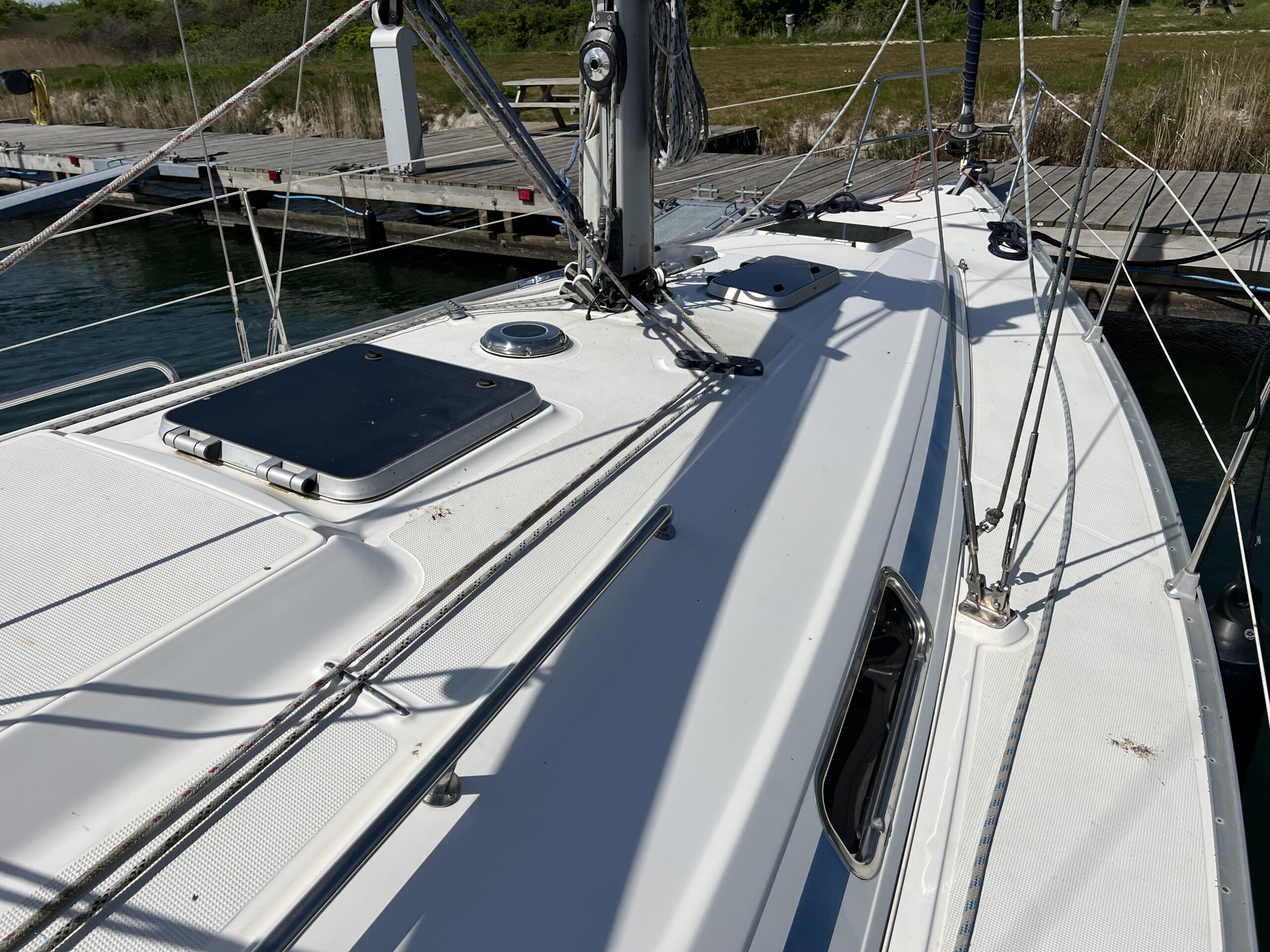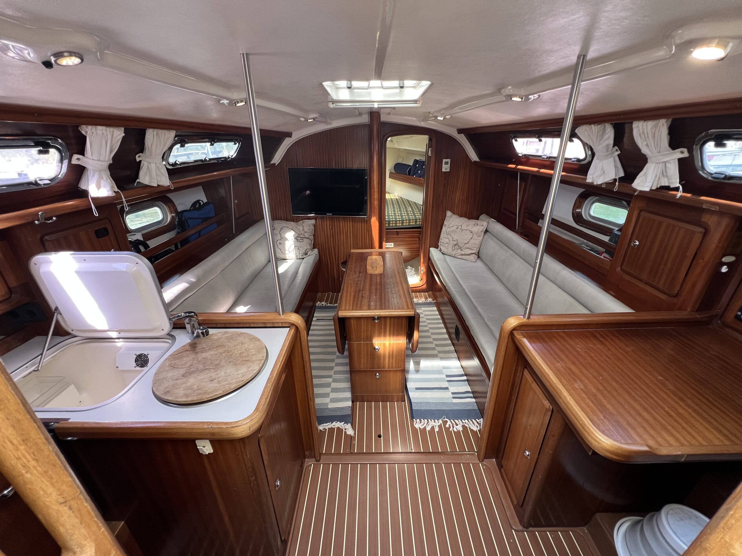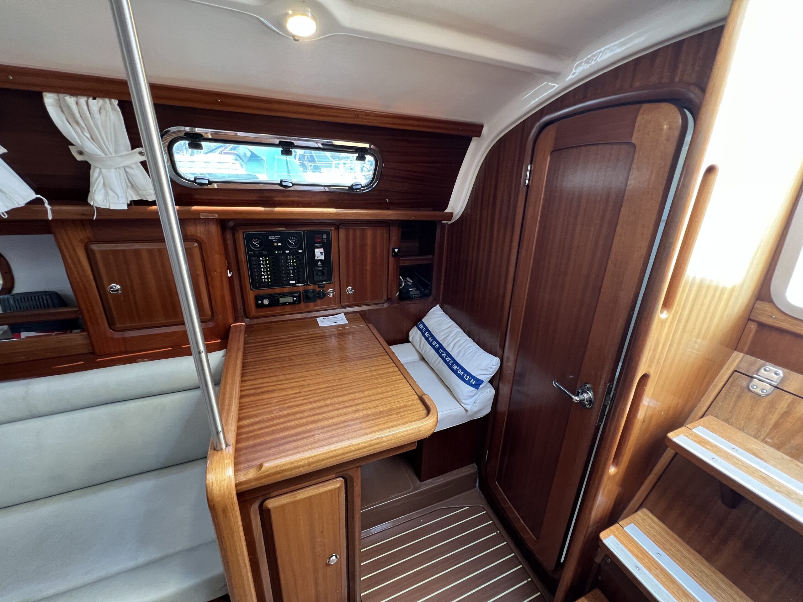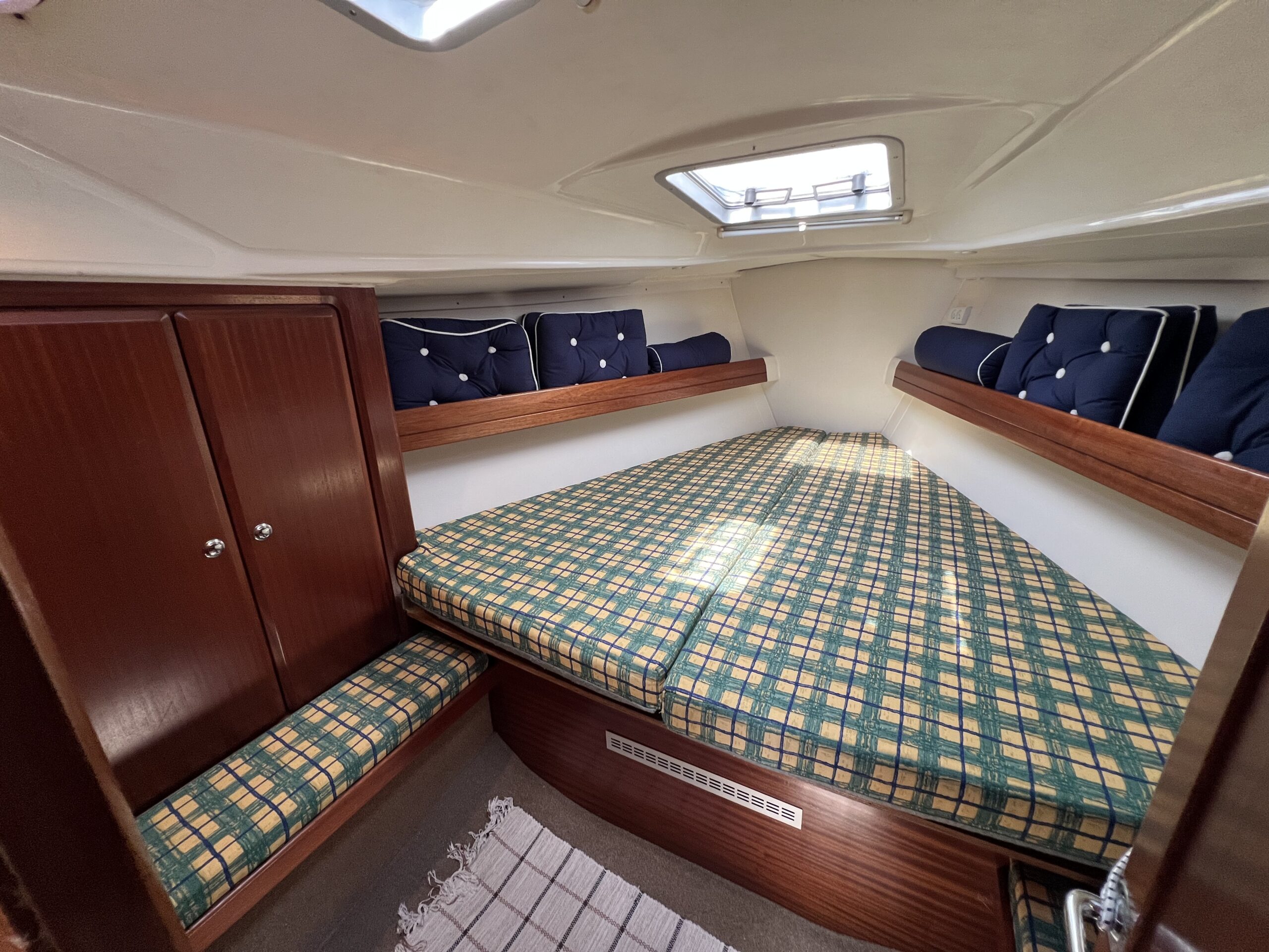 Flot og velholdt 2 kahytsversion med rullestorsejl og masser af lækkert udstyr. Stort cockpit med teakdørk og ratstyring med instrumentkonsol. Nedgang til flot og hyggelig salon med pantrysektion. En agterkahyt med dobbelt-køje og skabsplads. Midtskibs sofaarrangement med to langsgående sofaer som kan omgøres til to voksenkøjer og fint bord med klapper. Fremme fokahyt med owners dobbelt-køje og også her skabsløsning. Toiletrum med vaskmodul og brusemulighed med varmt og koldt vand. En virkelig velfungerende, velindrettet og velpasset Bavaria lige til at overtage. Bemærk ekstraudstyrslisten hvor vi lige fremhæver rullestorsejl, Fuld cockpit kaleche, Bovpropel, varmt vand, varmeanlæg og teak – hvad kan man ønske sig mere ?