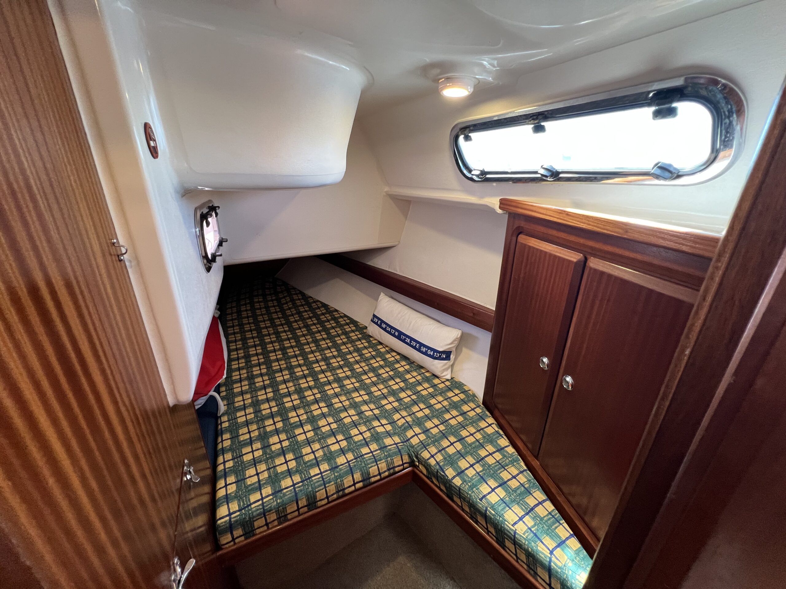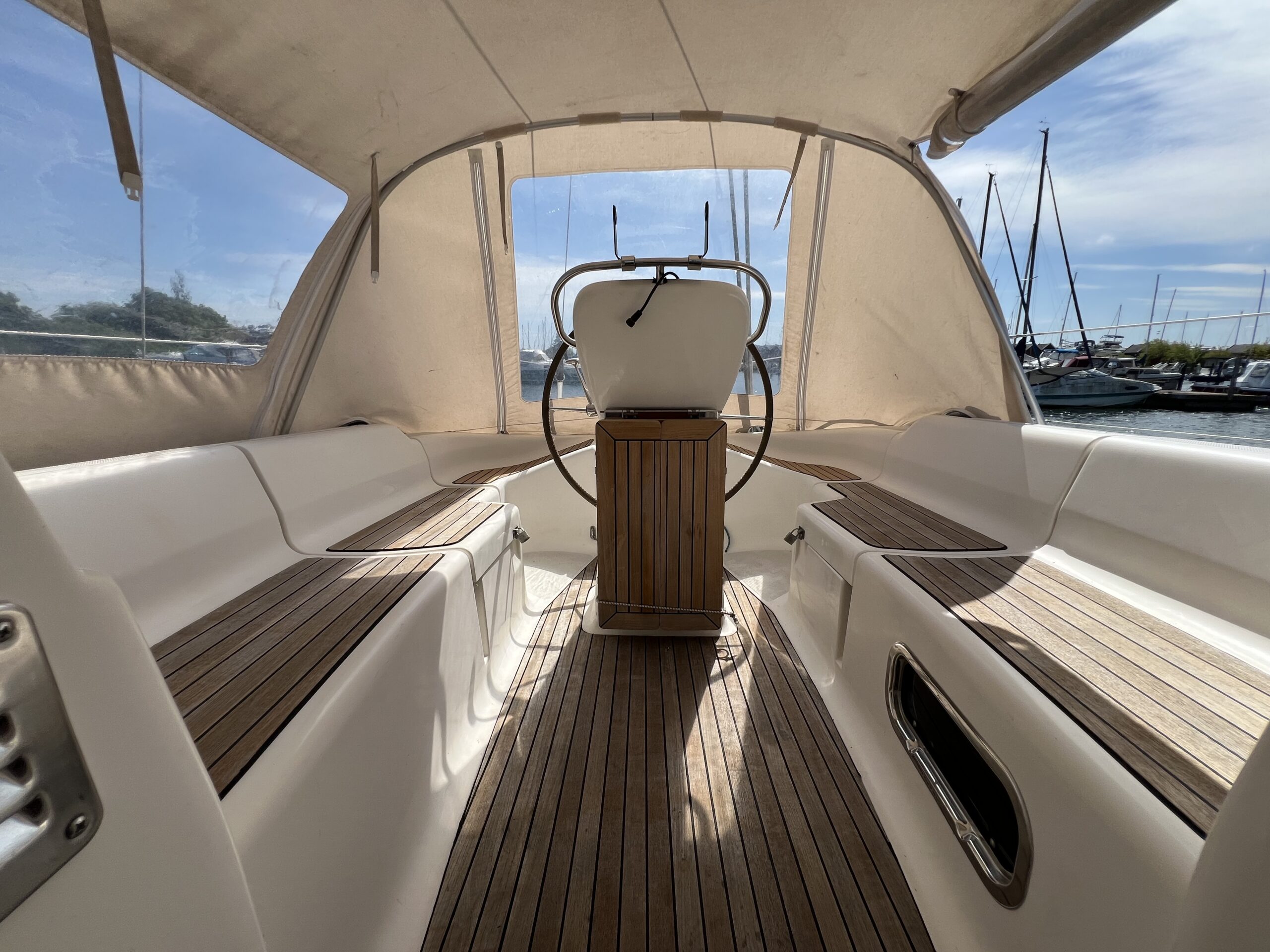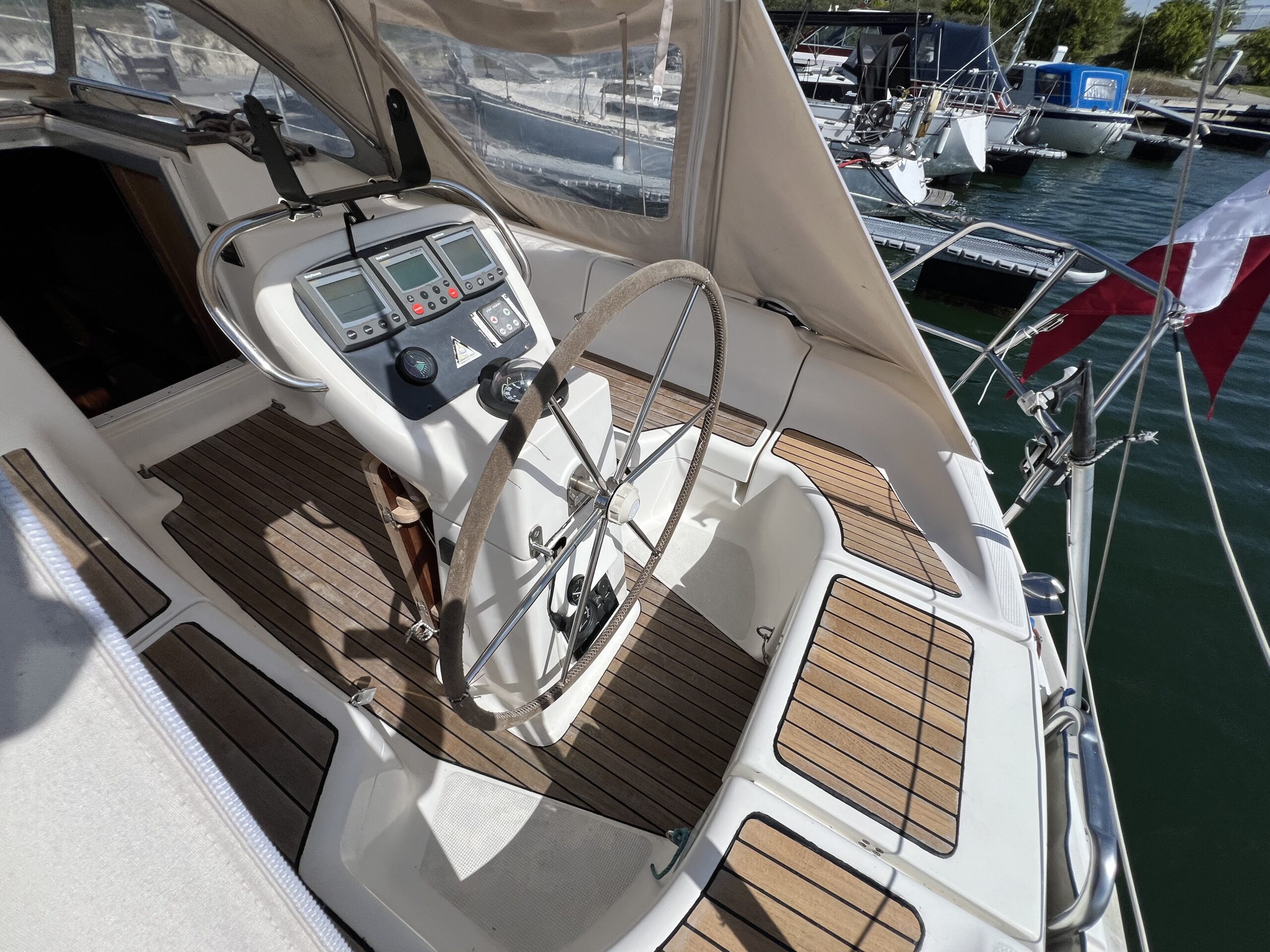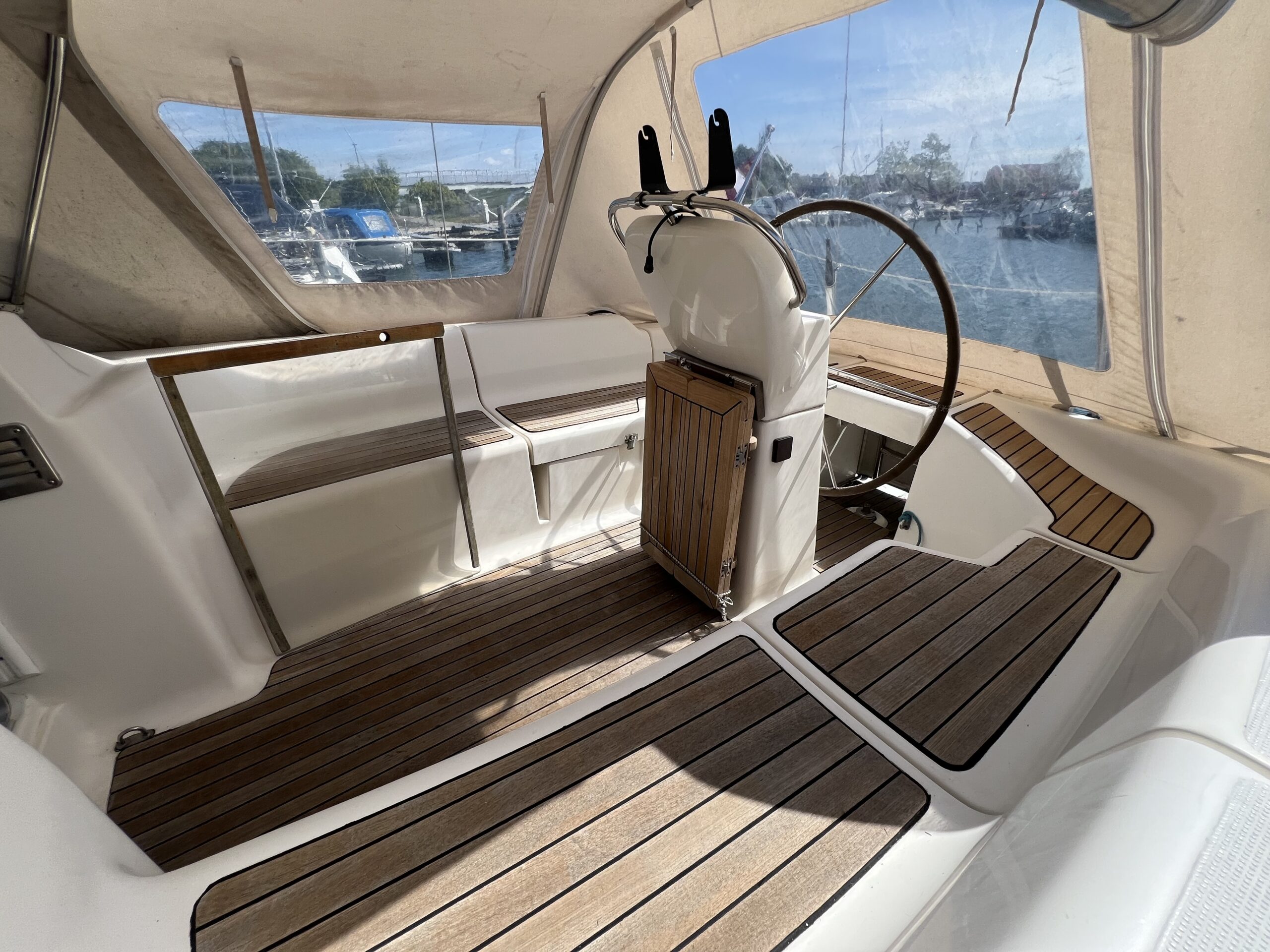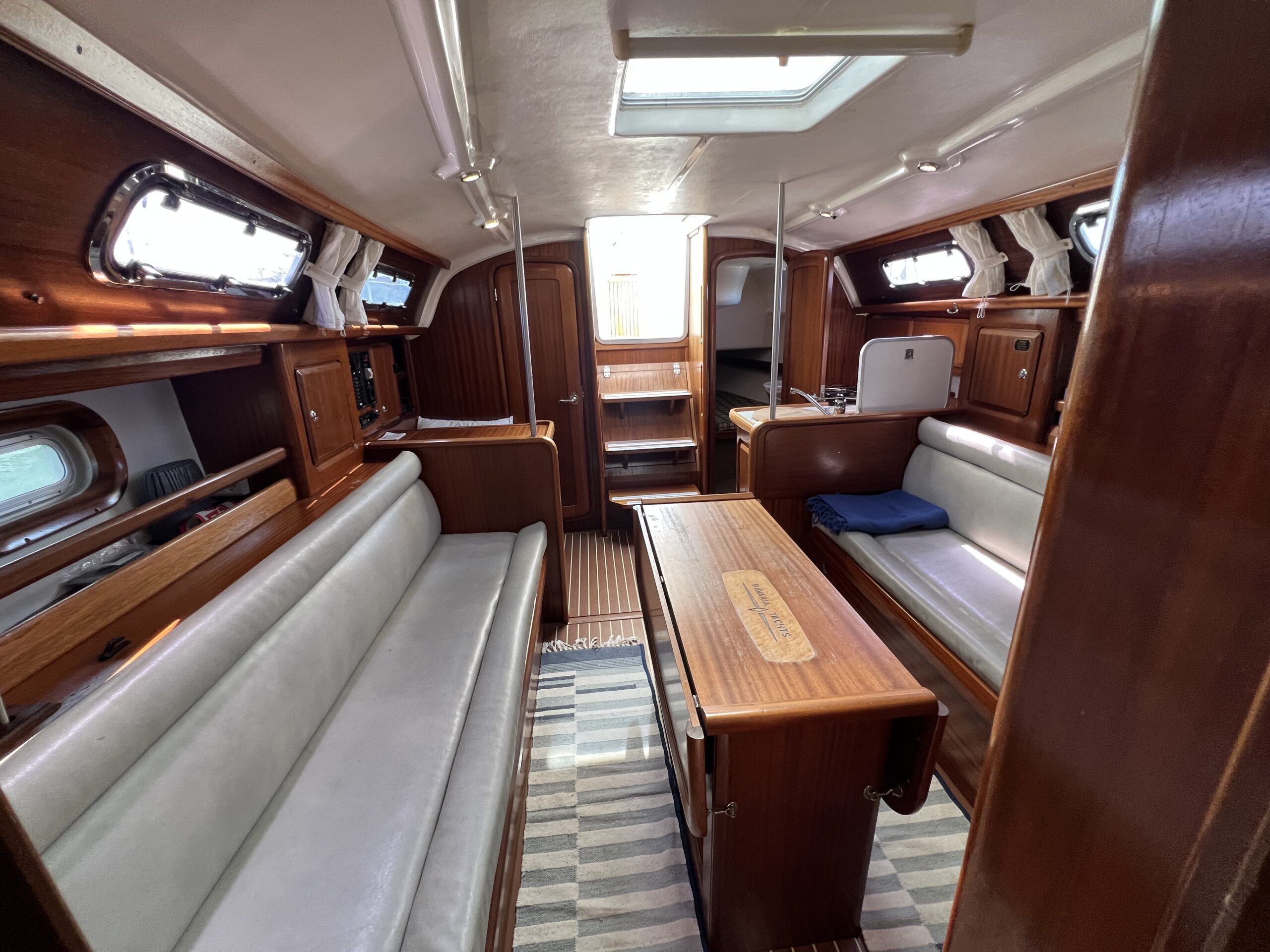 Flot og velholdt 2 kahytsversion med rullestorsejl og masser af lækkert udstyr. Stort cockpit med teakdørk og ratstyring med instrumentkonsol. Nedgang til flot og hyggelig salon med pantrysektion. En agterkahyt med dobbelt-køje og skabsplads. Midtskibs sofaarrangement med to langsgående sofaer som kan omgøres til to voksenkøjer og fint bord med klapper. Fremme fokahyt med owners dobbelt-køje og også her skabsløsning. Toiletrum med vaskmodul og brusemulighed med varmt og koldt vand. En virkelig velfungerende, velindrettet og velpasset Bavaria lige til at overtage. Bemærk ekstraudstyrslisten hvor vi lige fremhæver rullestorsejl, Fuld cockpit kaleche, Bovpropel, varmt vand, varmeanlæg og teak – hvad kan man ønske sig mere ?