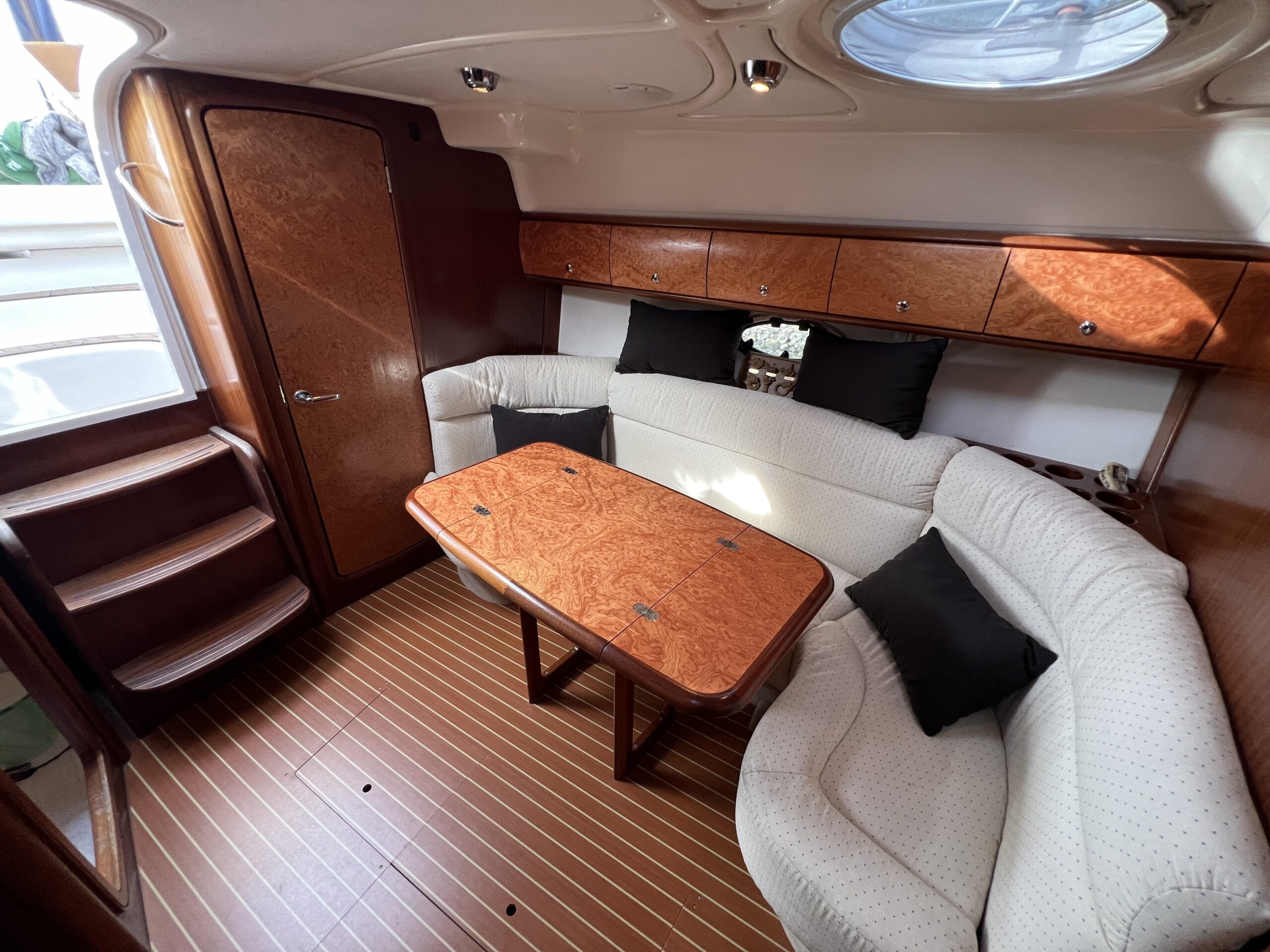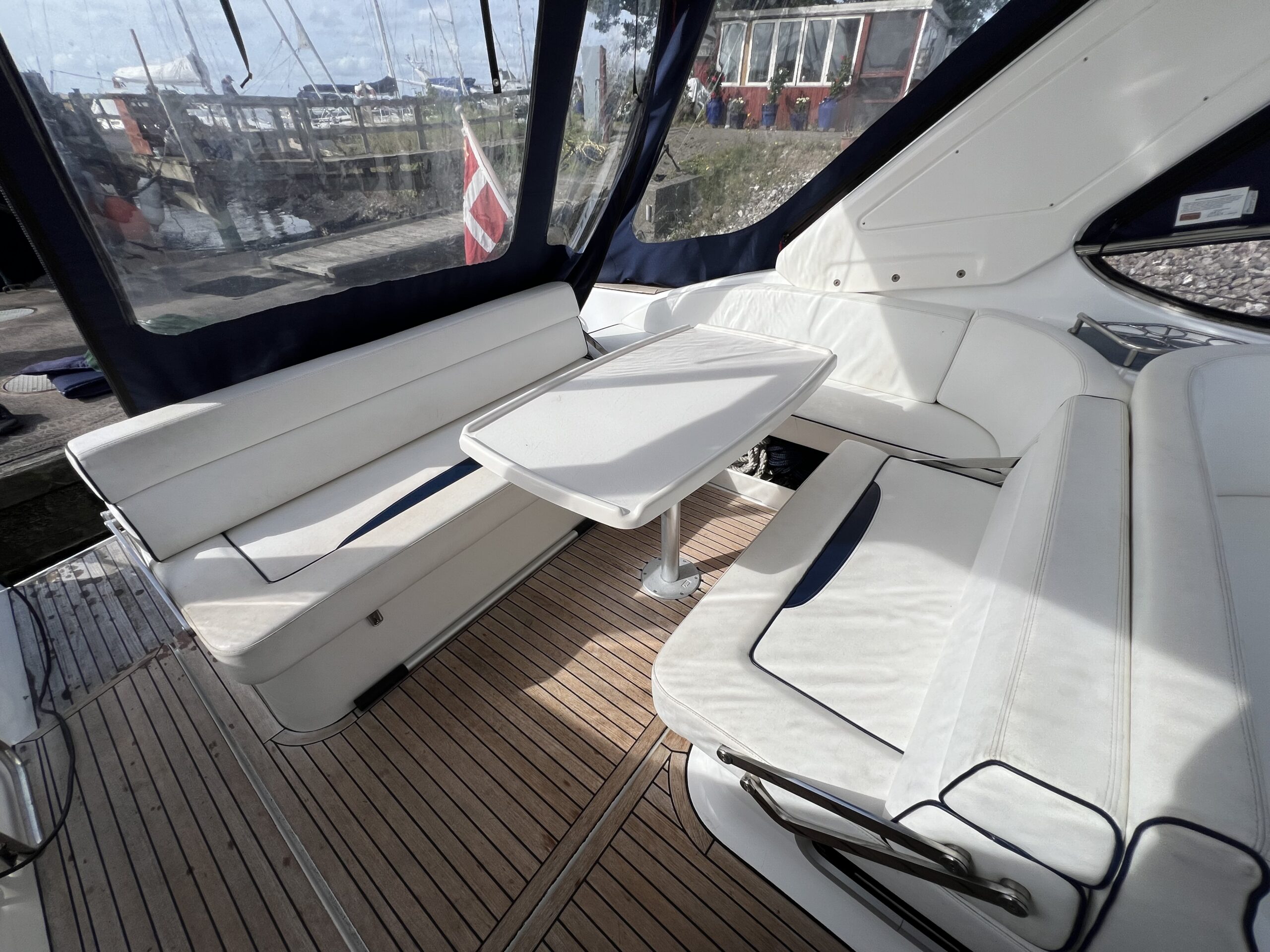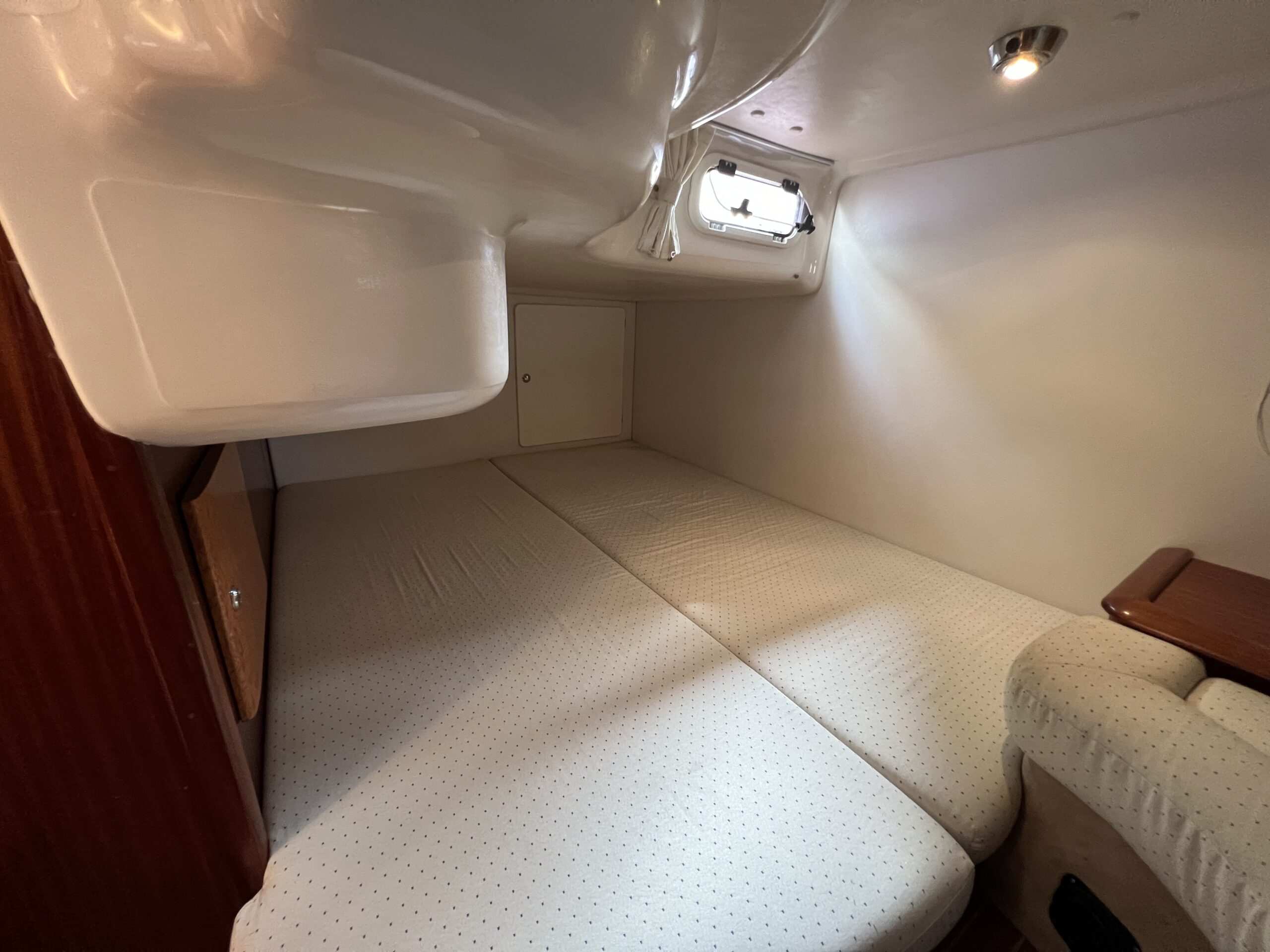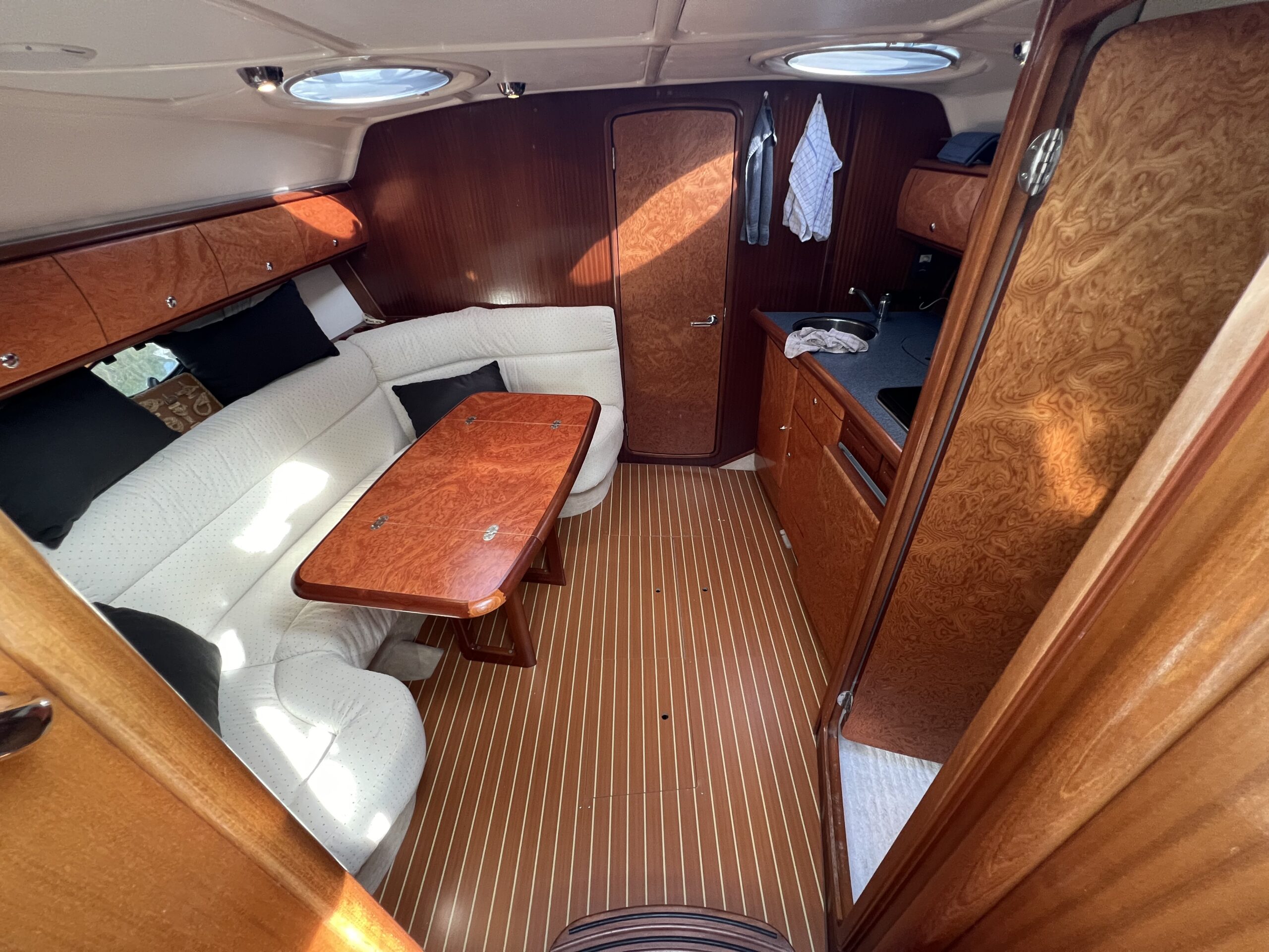 Virkelig en lækkerbisken for den kræsne sejler. 34 fod luxus – Skønt cockpit med stor sofagruppe med bordløsning i kombination med Køleskab og vask. Fremme førerplads og modsat loungesofa. Nedgang til flot apteret salon med stor u-sofa og langsgående pantrysektion. Fremme Lukkelig dobbelt køjeplads og yderligere lukkelig agter kahyt med dobbelt køje. Båden er udstyret med Bov propel og 2 X Volvo Penta KAD300 der årligt er serviceret og passet af professionelle.