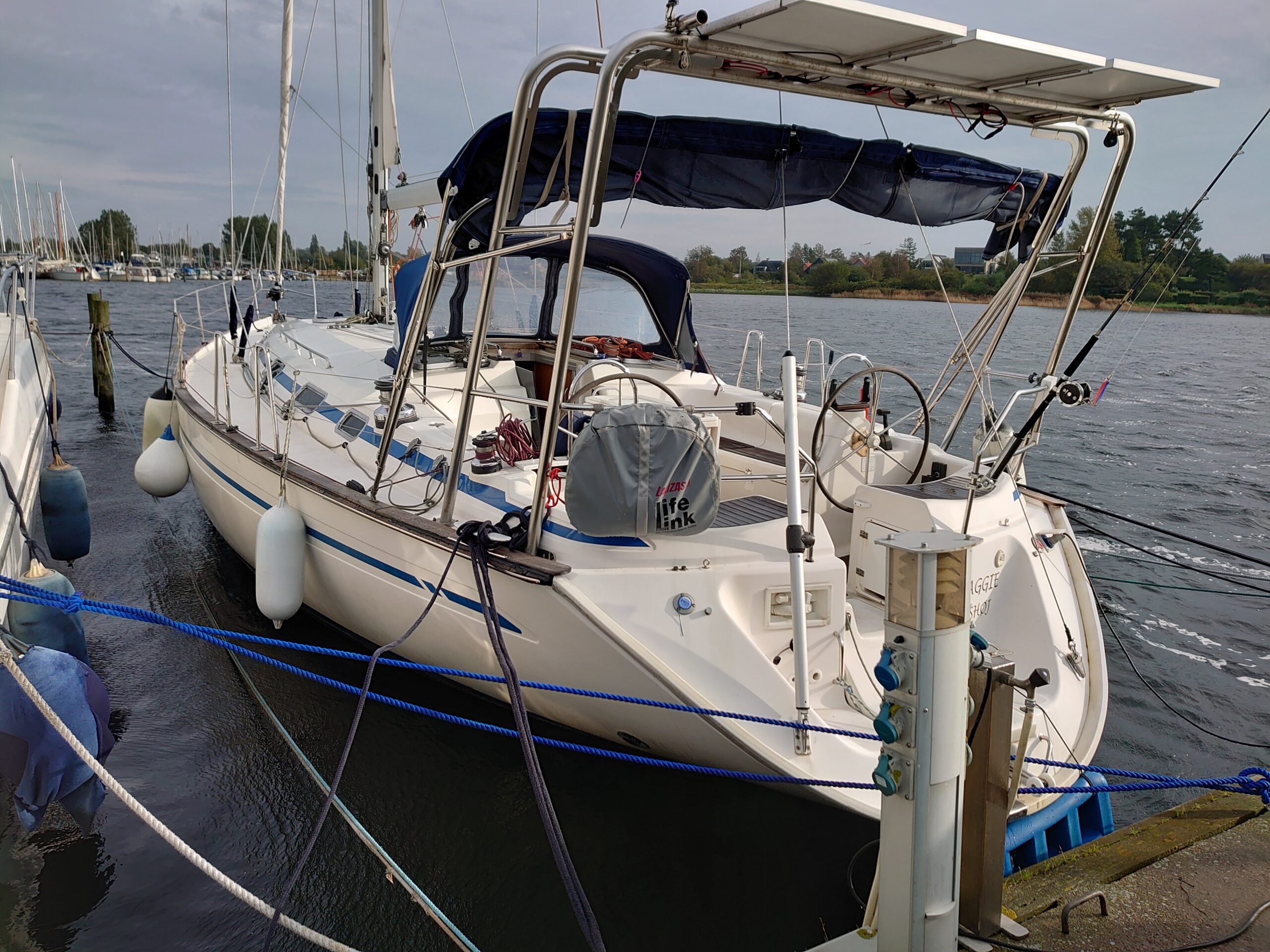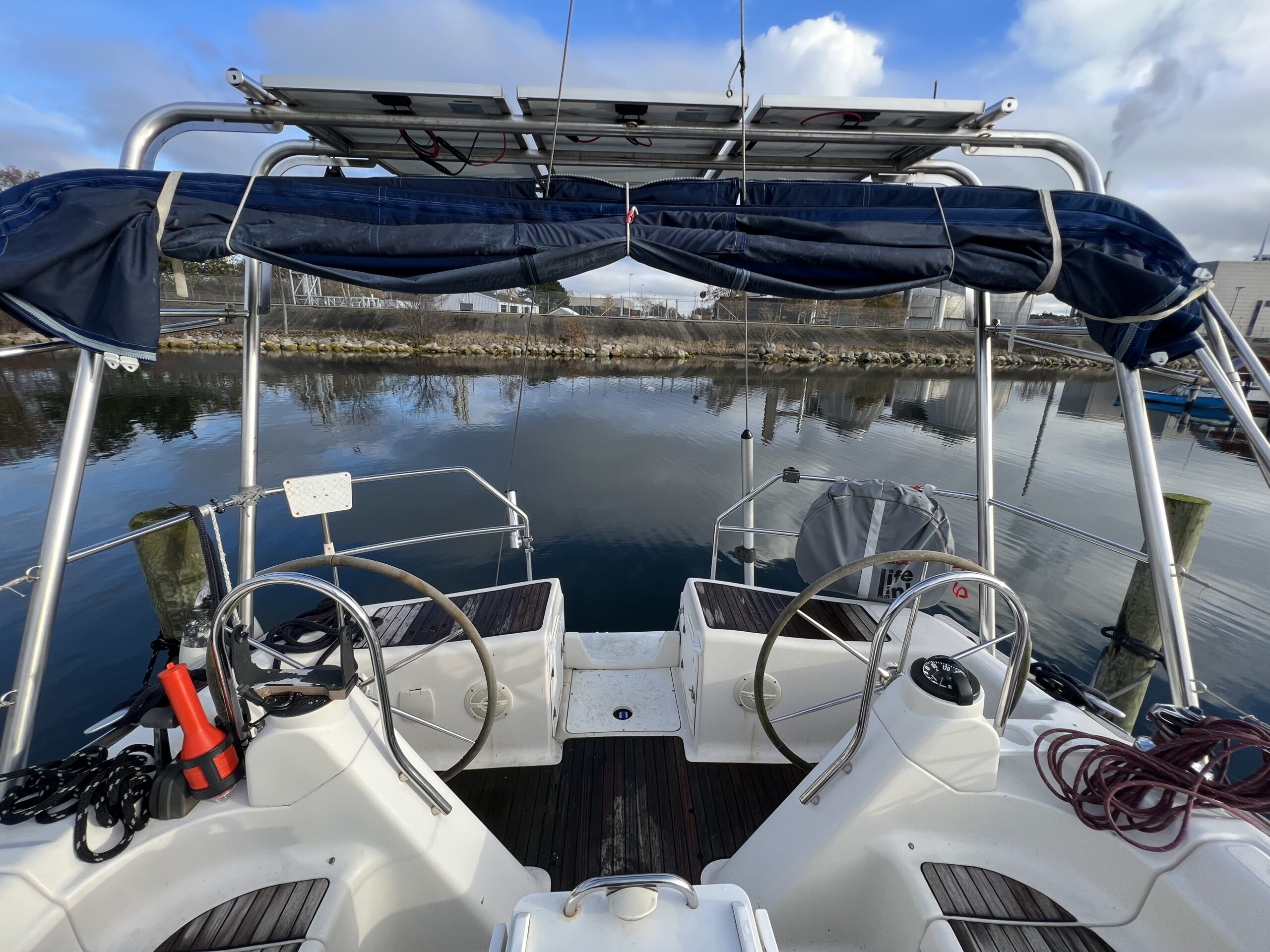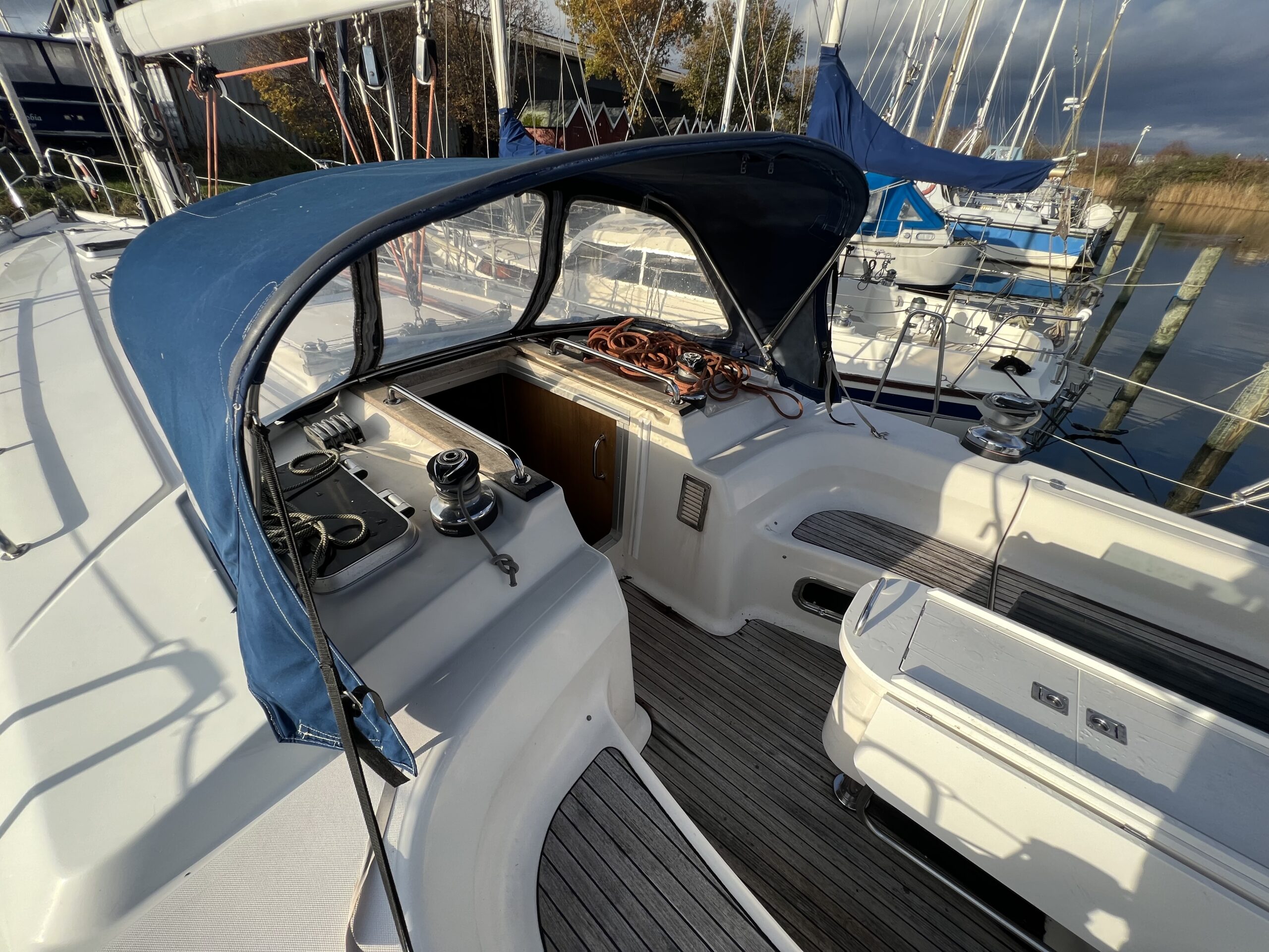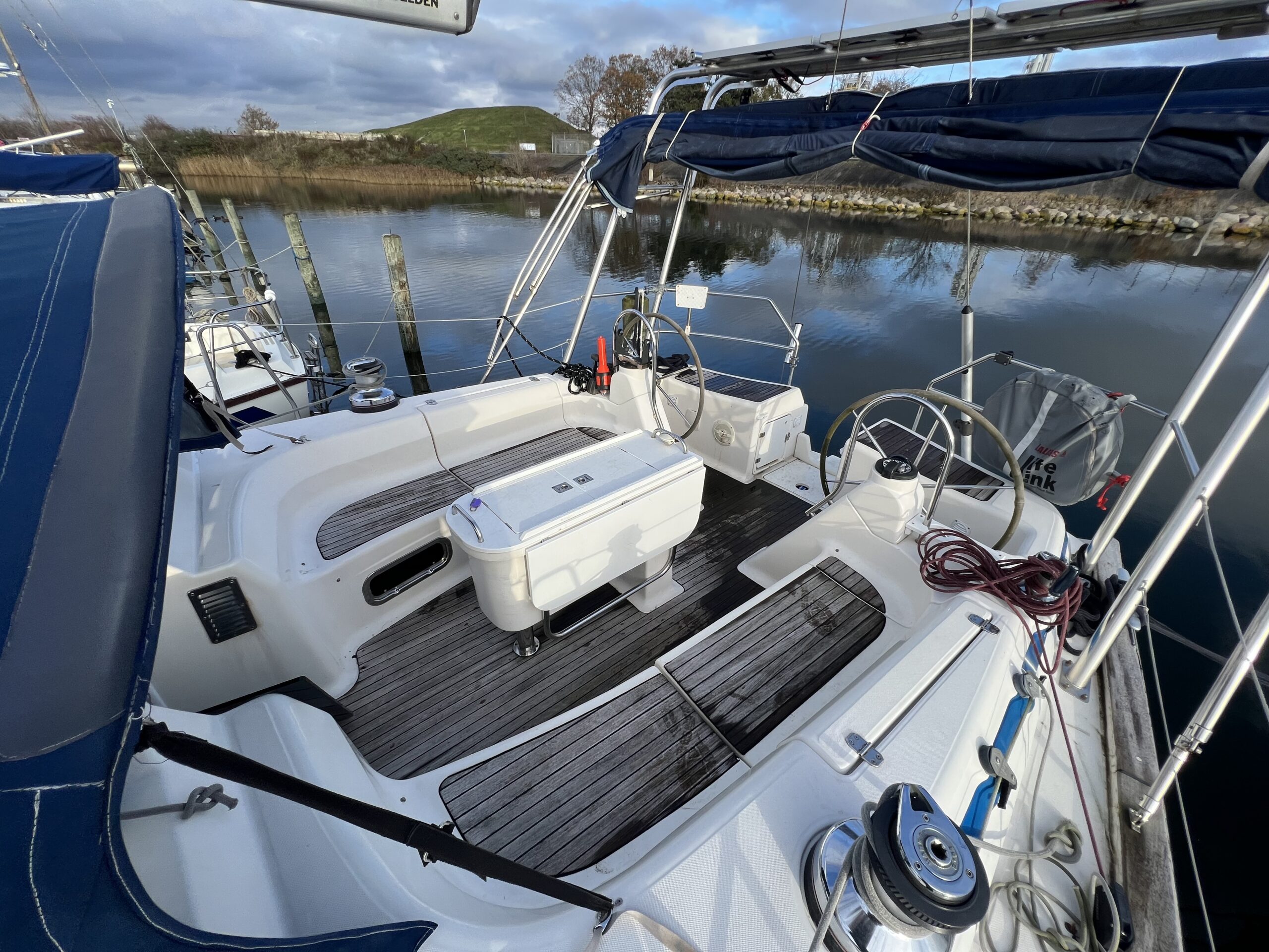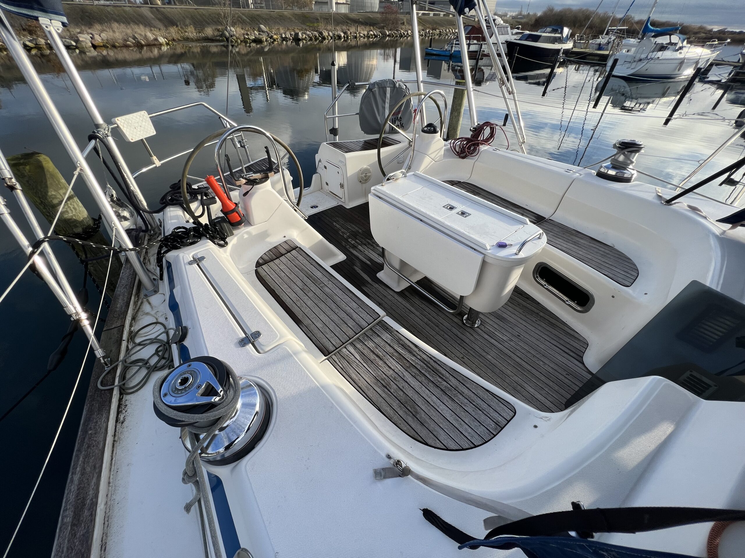4 kahytsversion, med masser af lækkert udstyr. Stort cockpit med teakdørk og ratstyring, instrumentkonsol med betjening af Bovpropel.