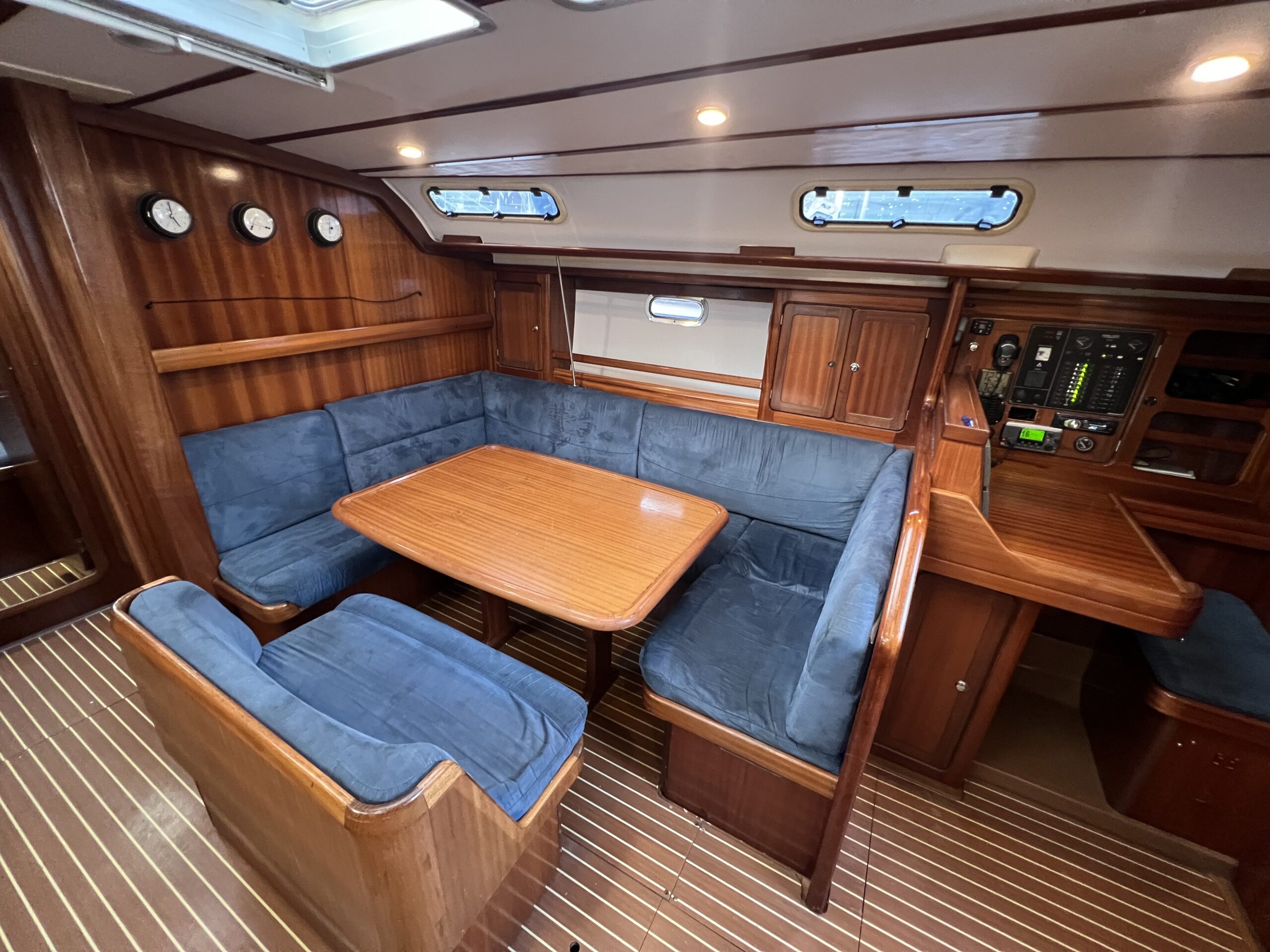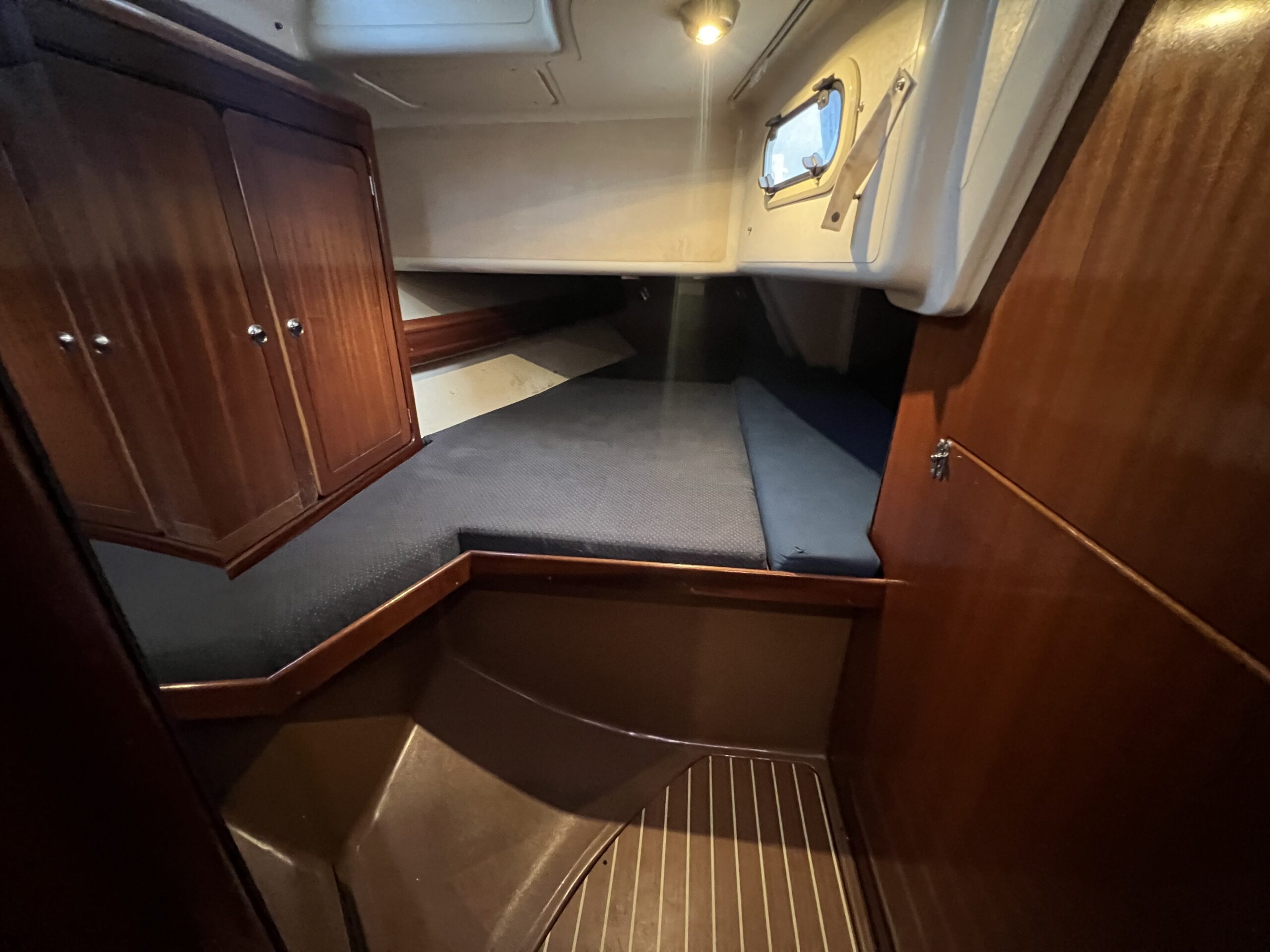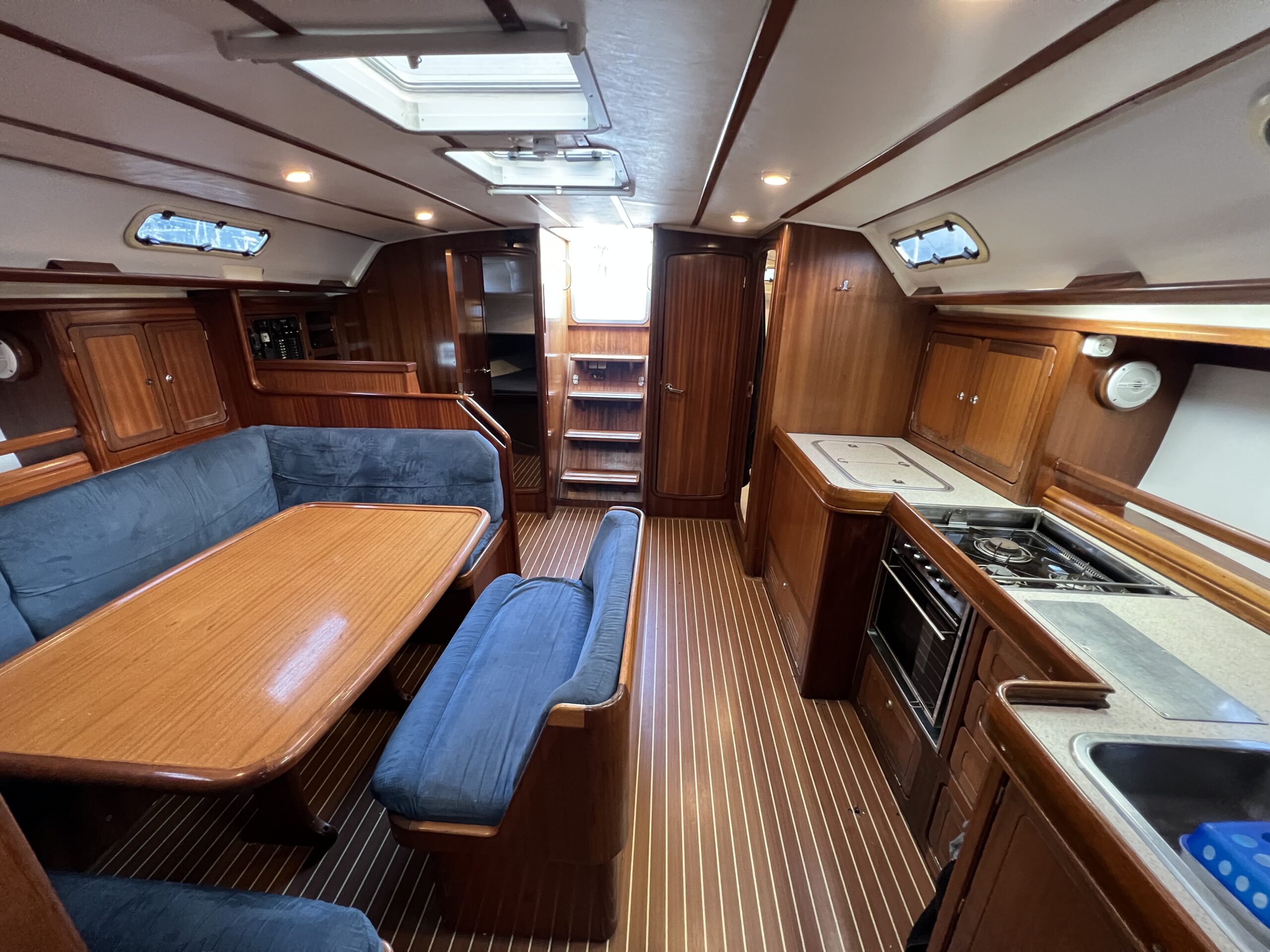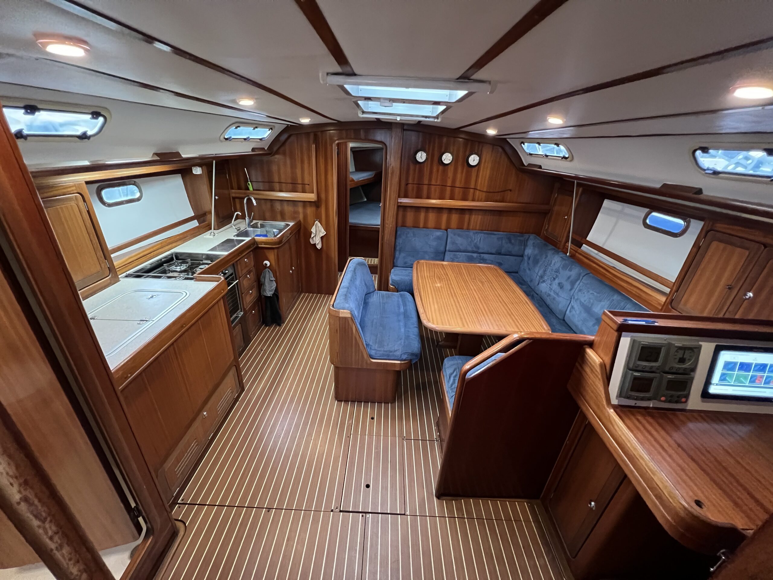 Nedgang til flot og rummelig salon med god størrelse pantrysektion. To agterkahytter med hver sin dobbelt-køje og skabsplads. Toiletrum med vaskmodul og brusemulighed med varmt og koldt vand. Sofaarrangement med to U-sofa. Fremme er der 2 kahytter med dobbeltkøjer og ekstra overkøje og også her skabsløsning. Til forkahytterne er der samtidig et toilet. så ialt 3 toiletter i båden. En virkelig velfungerende Sejlbåd, lige til at overtage. Bemærk ekstraudstyrslisten hvor vi fremhæver Nyere Kortplottere, Bovpropel, rullestorsejl, varmt vand. – hvad kan man ønske sig mere ?’