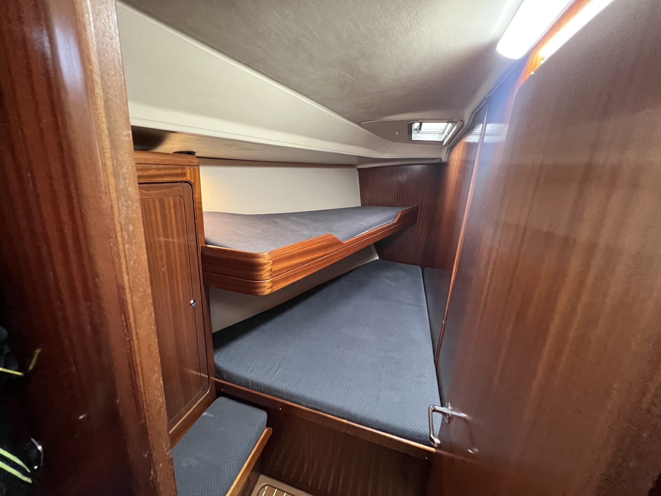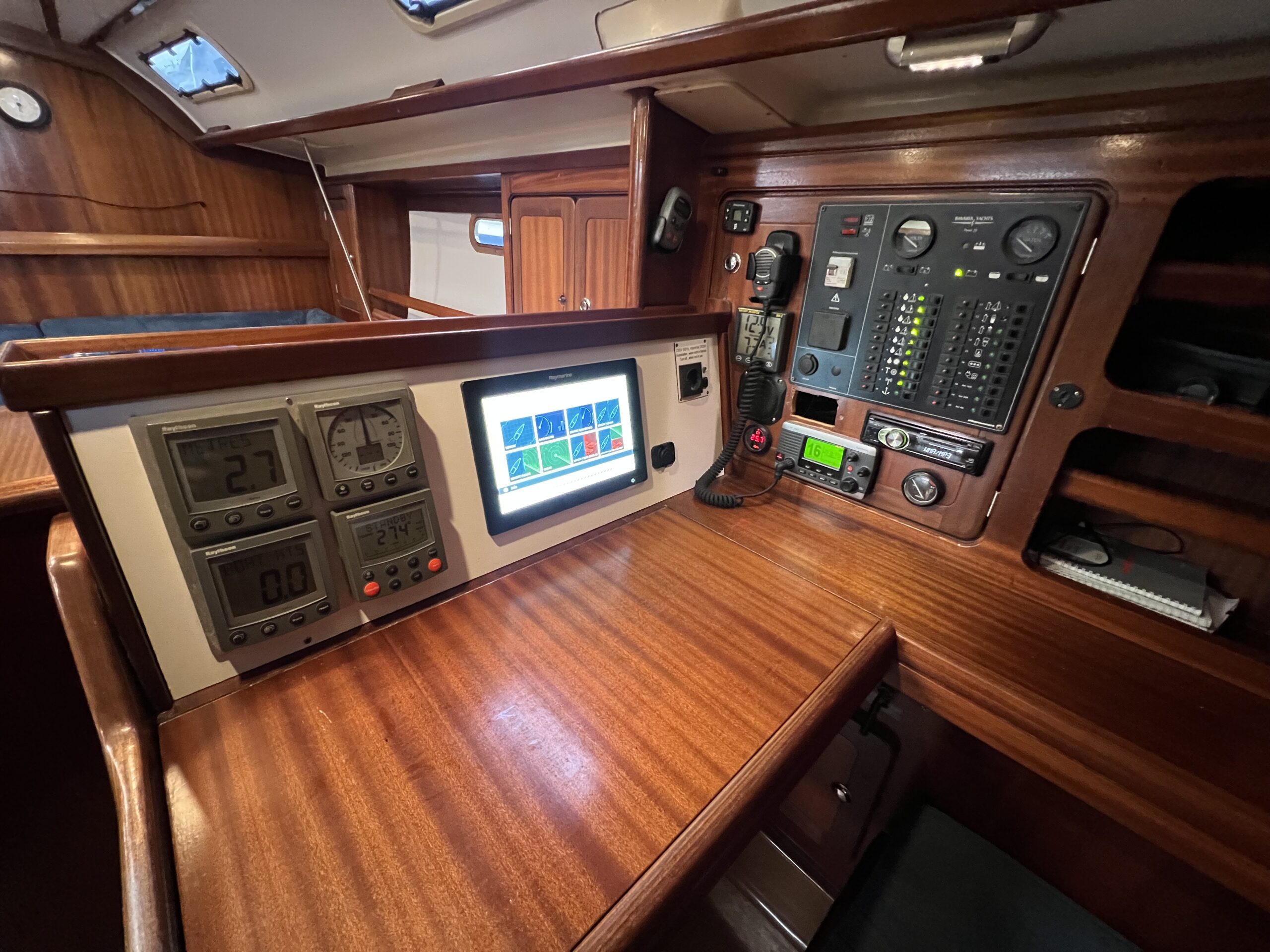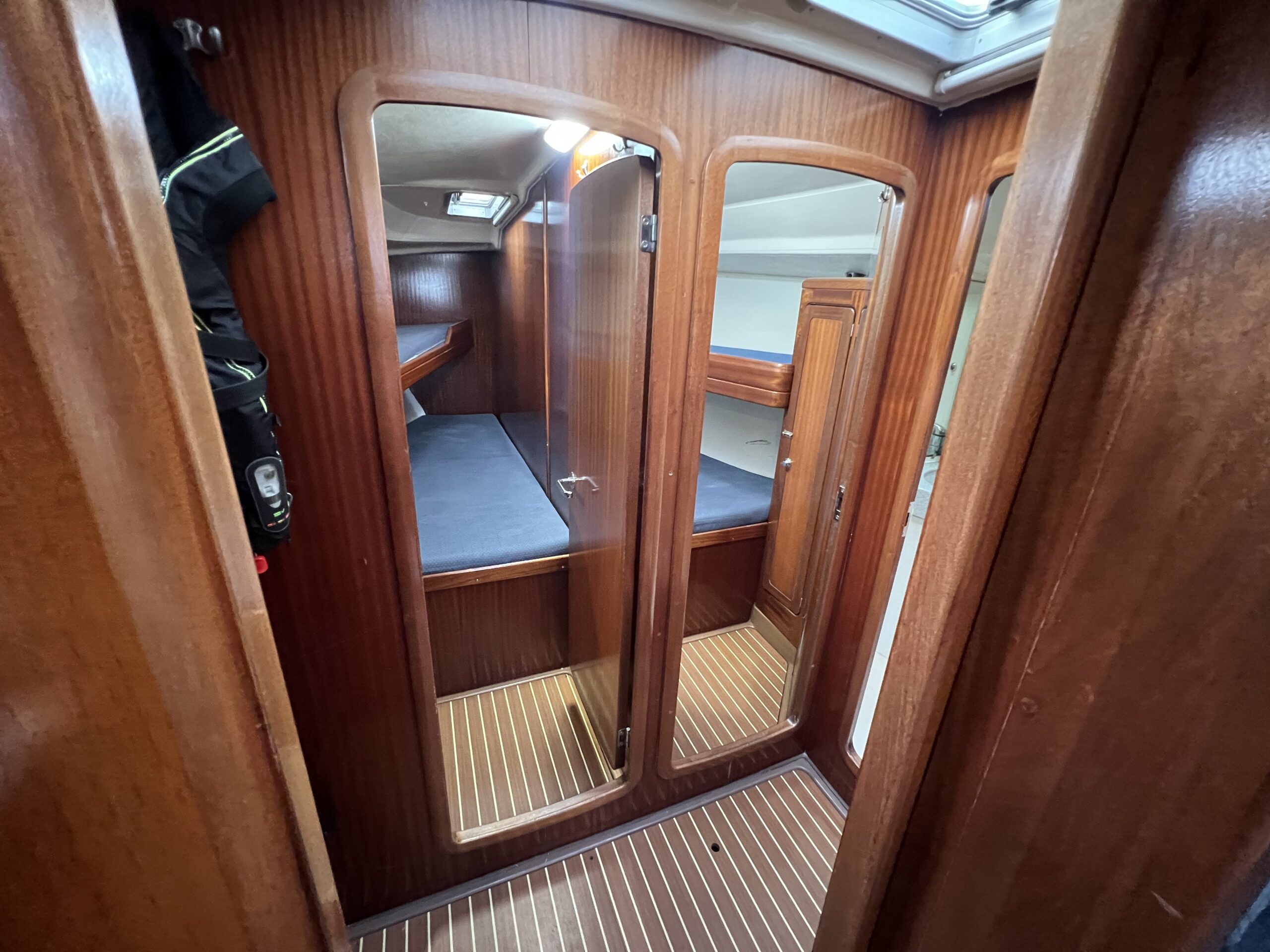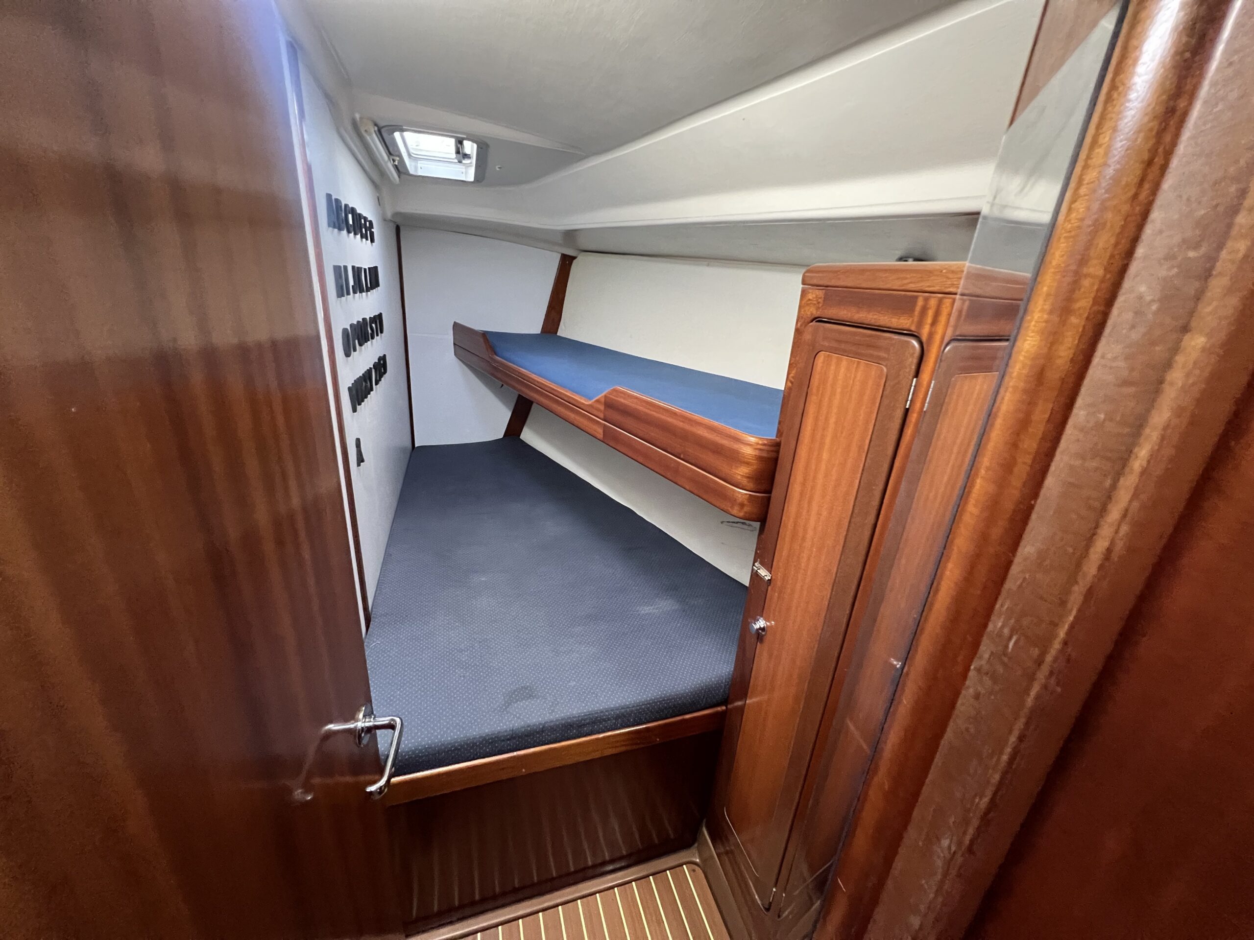 Nedgang til flot og rummelig salon med god størrelse pantrysektion. To agterkahytter med hver sin dobbelt-køje og skabsplads. Toiletrum med vaskmodul og brusemulighed med varmt og koldt vand. Sofaarrangement med to U-sofa. Fremme er der 2 kahytter med dobbeltkøjer og ekstra overkøje og også her skabsløsning. Til forkahytterne er der samtidig et toilet. så ialt 3 toiletter i båden. En virkelig velfungerende Sejlbåd, lige til at overtage. Bemærk ekstraudstyrslisten hvor vi fremhæver Nyere Kortplottere, Bovpropel, rullestorsejl, varmt vand. – hvad kan man ønske sig mere ?’