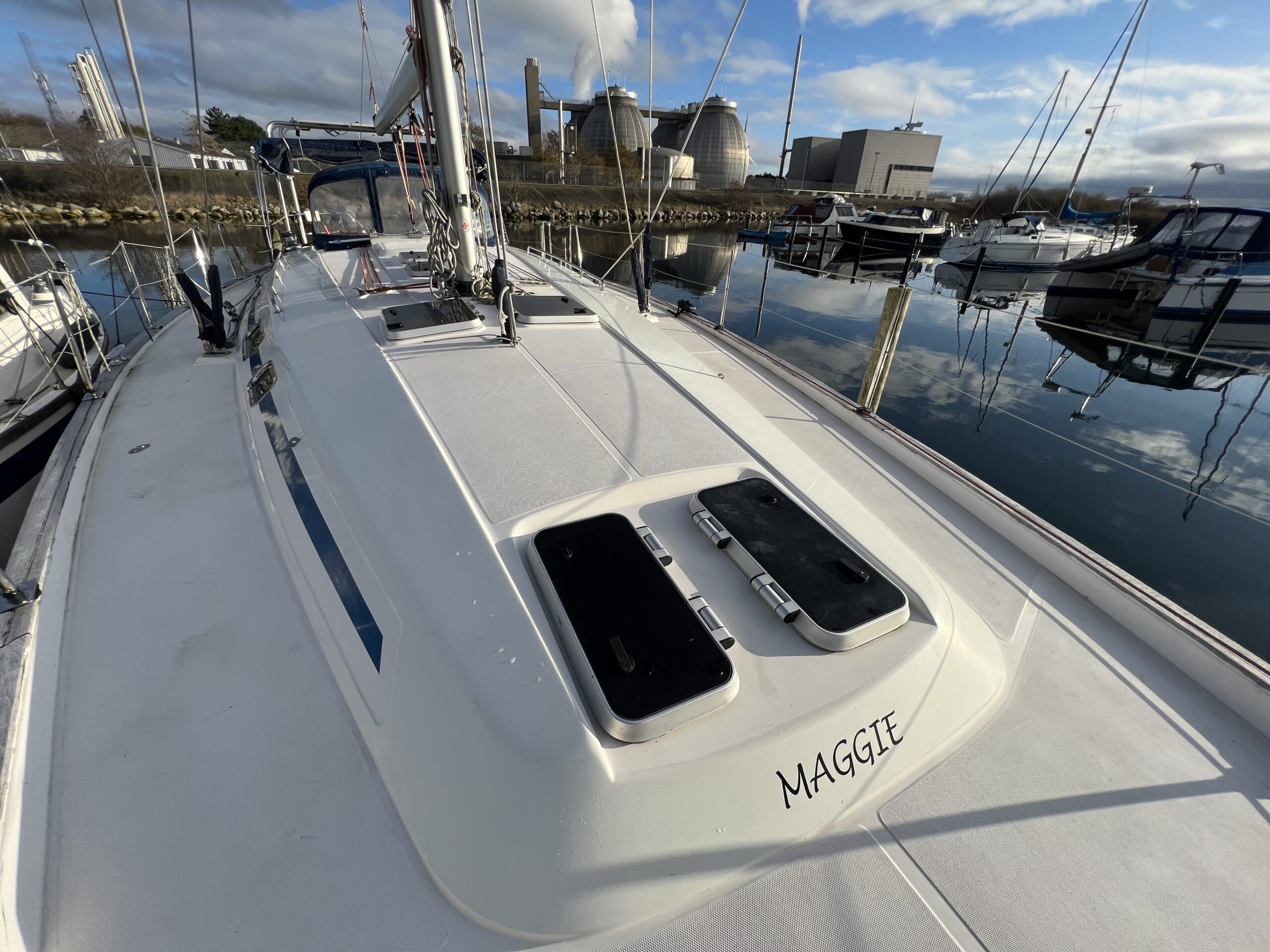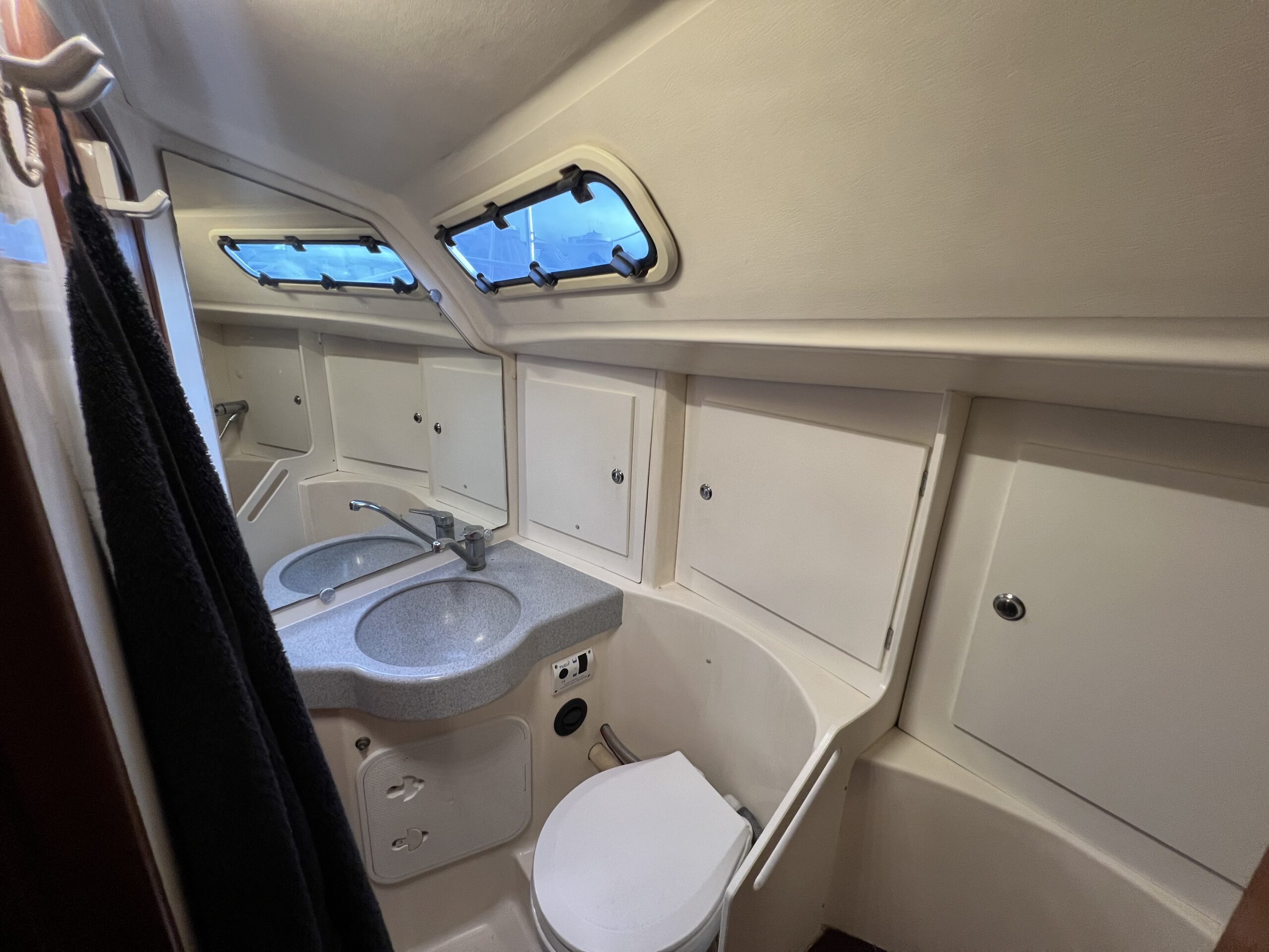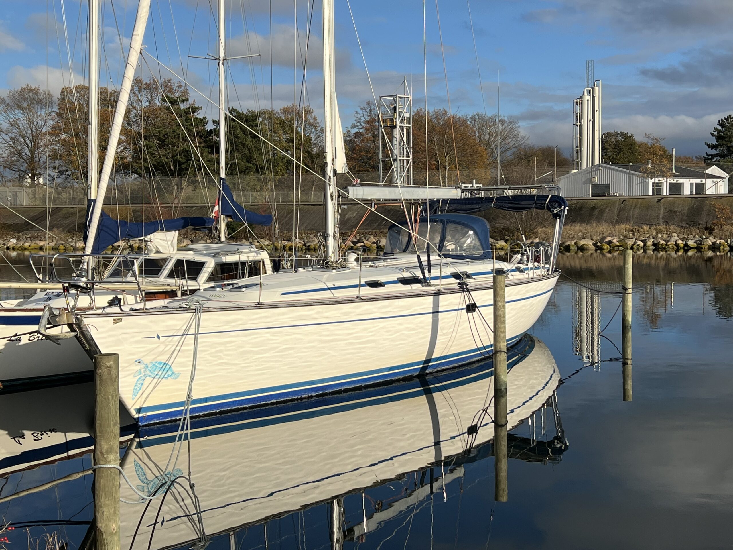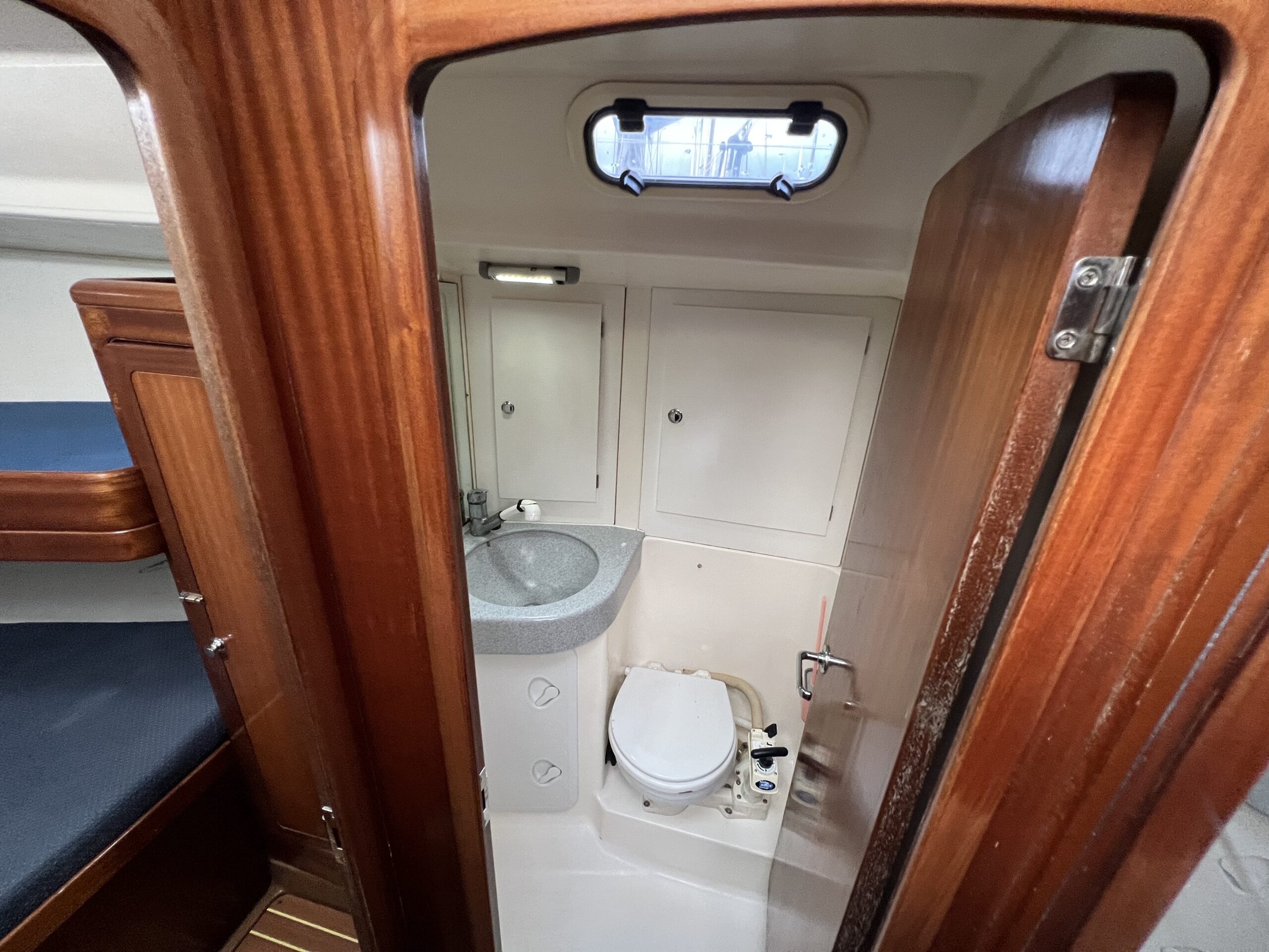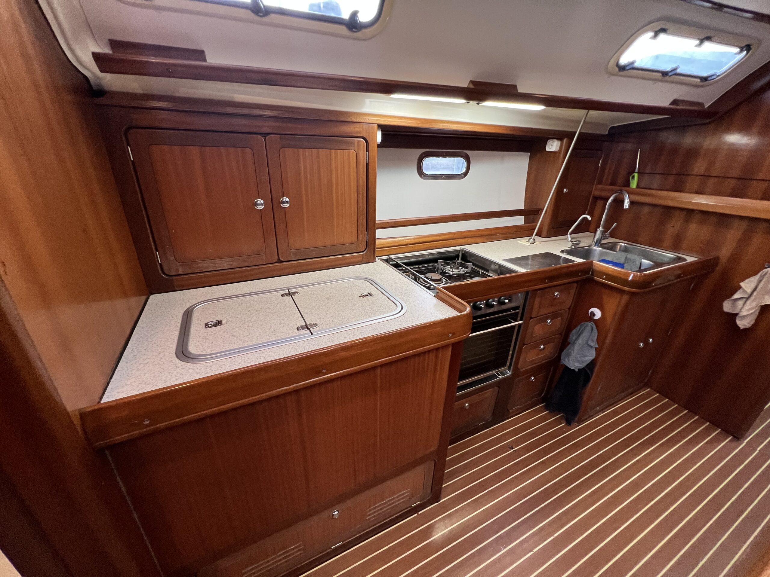 Nedgang til flot og rummelig salon med god størrelse pantrysektion. To agterkahytter med hver sin dobbelt-køje og skabsplads. Toiletrum med vaskmodul og brusemulighed med varmt og koldt vand. Sofaarrangement med to U-sofa. Fremme er der 2 kahytter med dobbeltkøjer og ekstra overkøje og også her skabsløsning. Til forkahytterne er der samtidig et toilet. så ialt 3 toiletter i båden. En virkelig velfungerende Sejlbåd, lige til at overtage. Bemærk ekstraudstyrslisten hvor vi fremhæver Nyere Kortplottere, Bovpropel, rullestorsejl, varmt vand. – hvad kan man ønske sig mere ?’