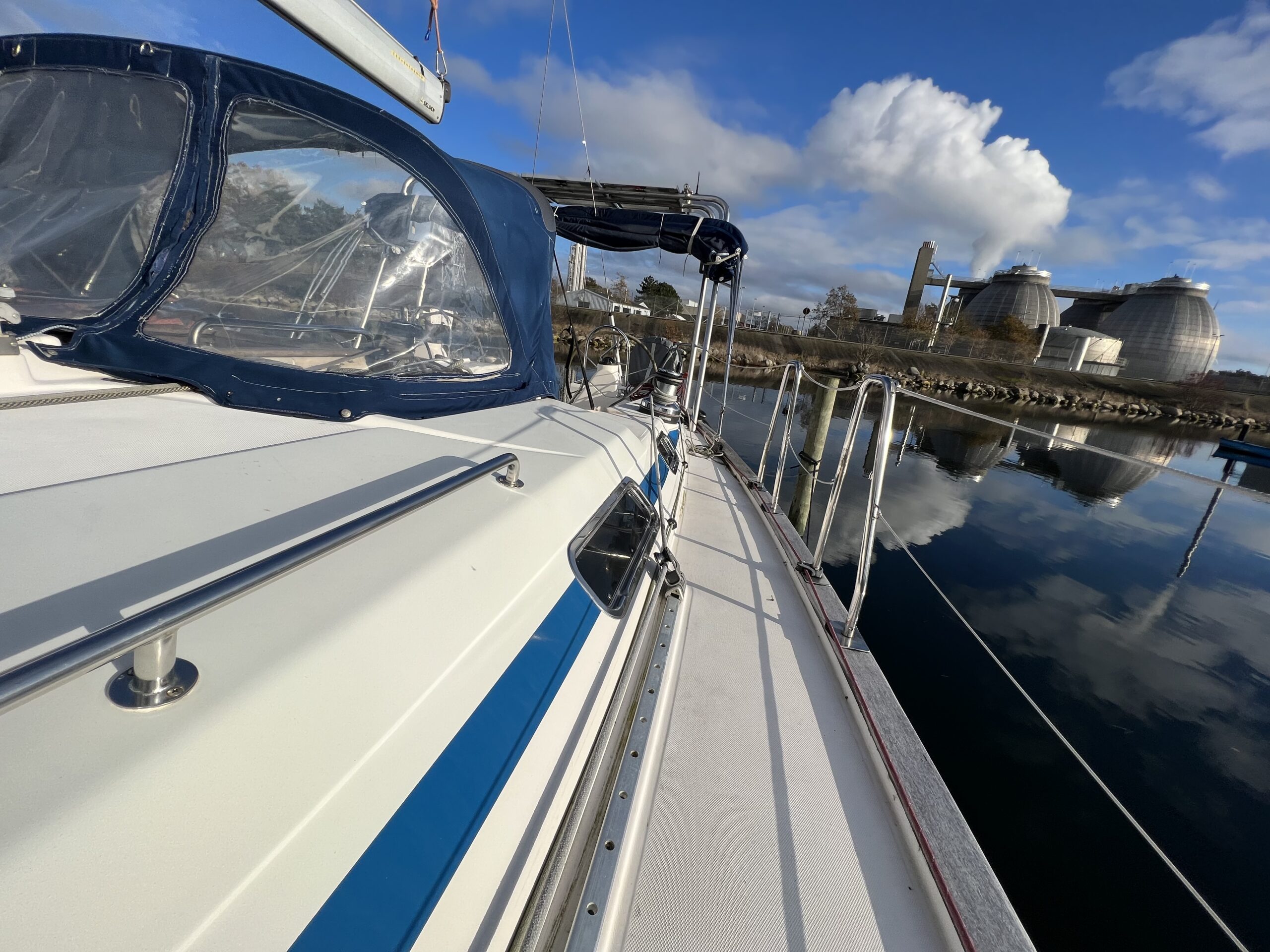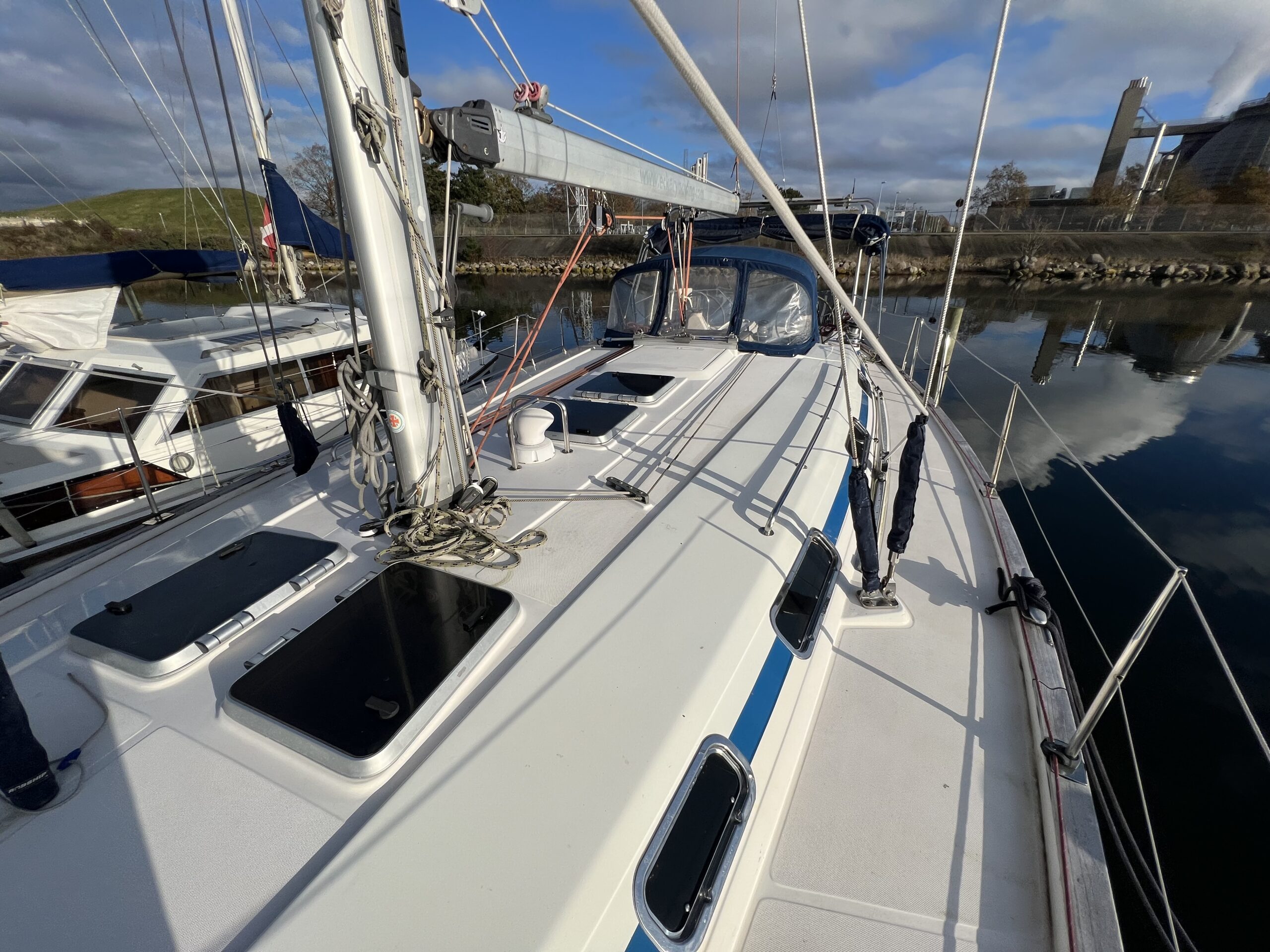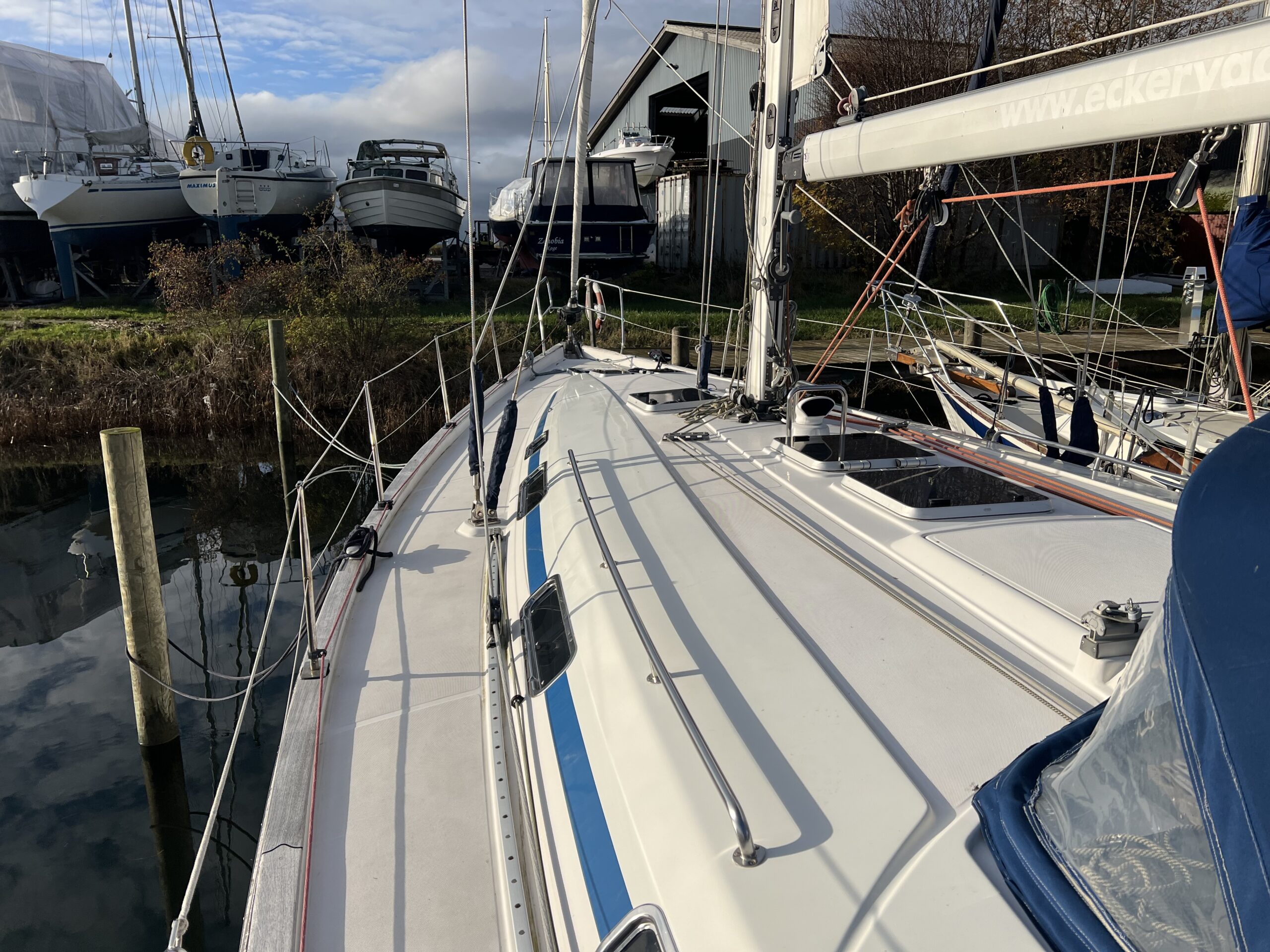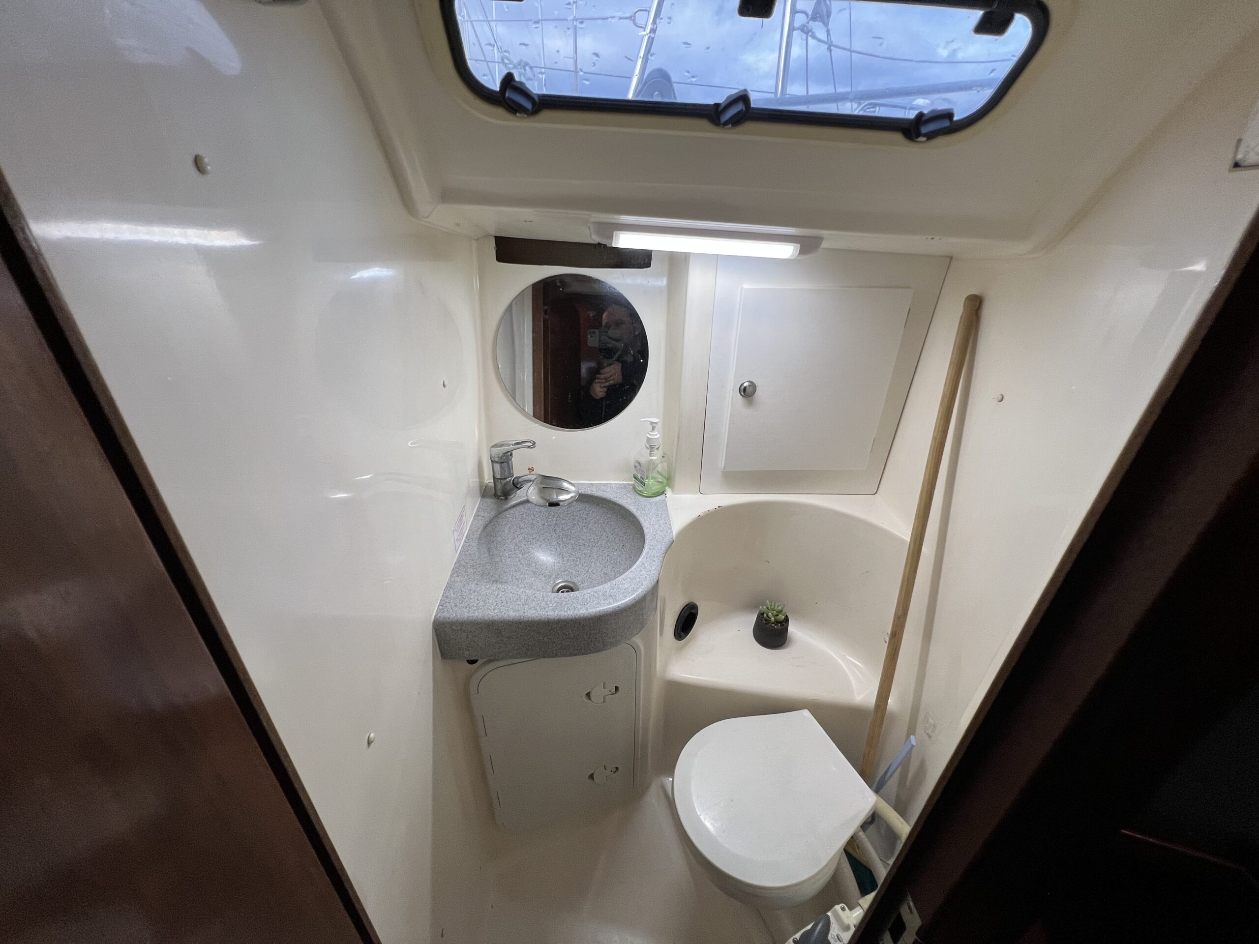 Nedgang til flot og rummelig salon med god størrelse pantrysektion. To agterkahytter med hver sin dobbelt-køje og skabsplads. Toiletrum med vaskmodul og brusemulighed med varmt og koldt vand. Sofaarrangement med to U-sofa. Fremme er der 2 kahytter med dobbeltkøjer og ekstra overkøje og også her skabsløsning. Til forkahytterne er der samtidig et toilet. så ialt 3 toiletter i båden. En virkelig velfungerende Sejlbåd, lige til at overtage. Bemærk ekstraudstyrslisten hvor vi fremhæver Nyere Kortplottere, Bovpropel, rullestorsejl, varmt vand. – hvad kan man ønske sig mere ?’