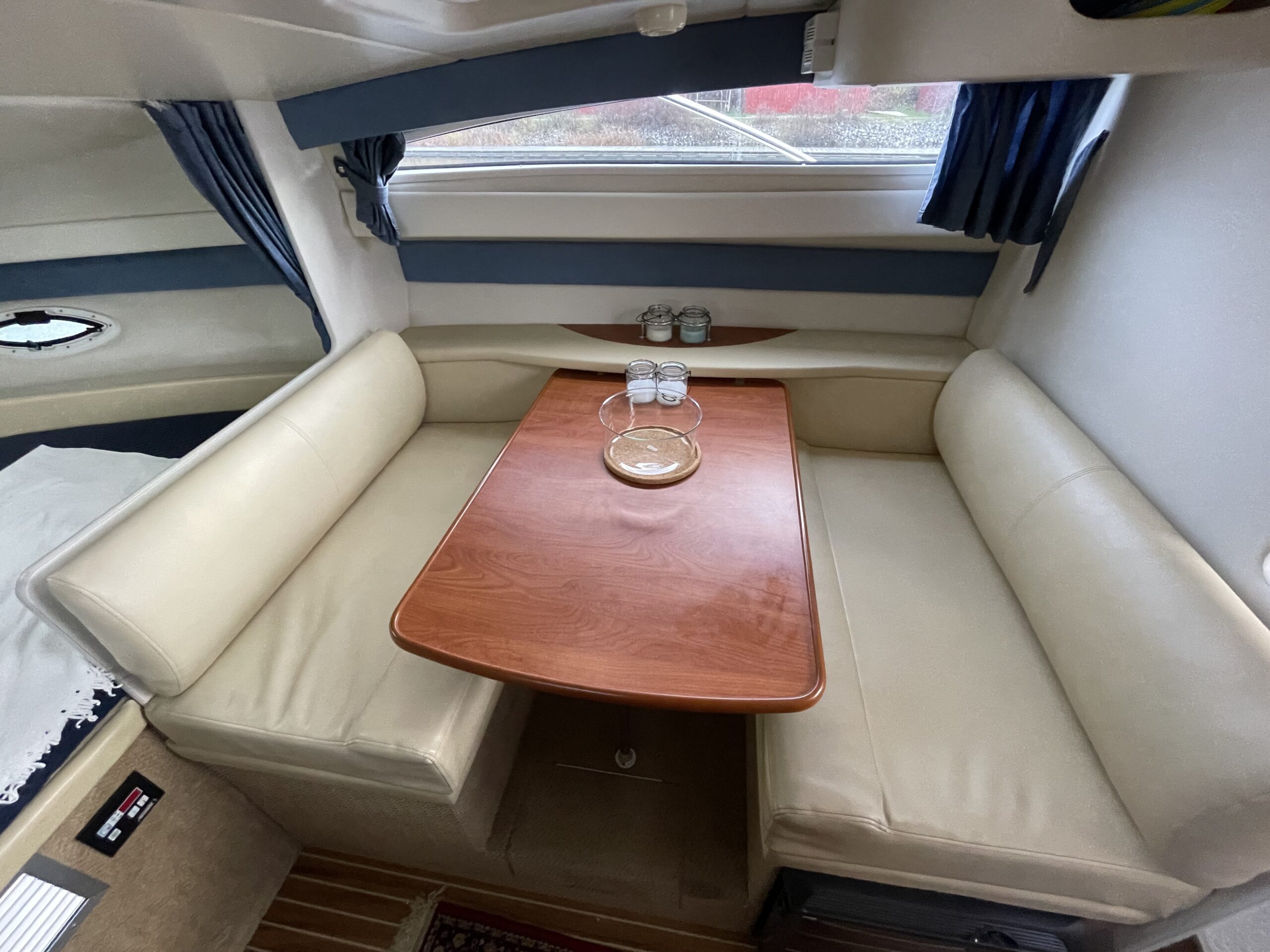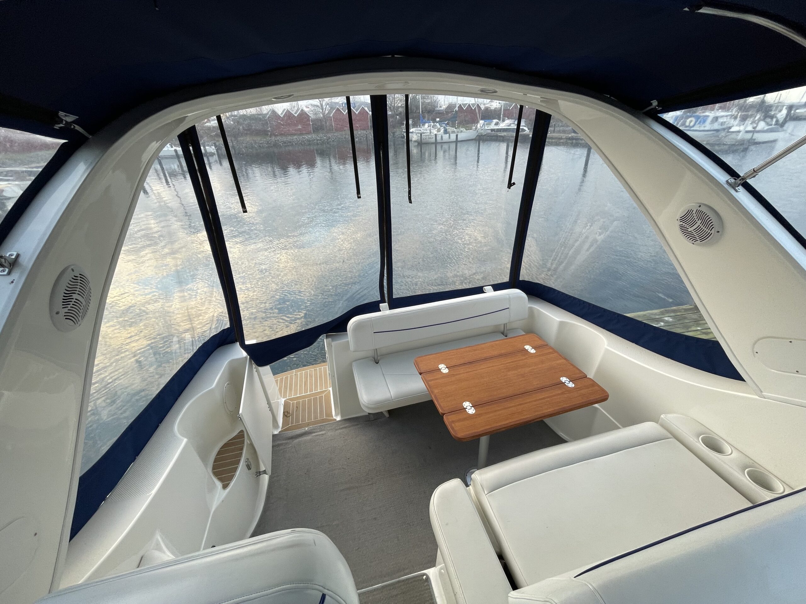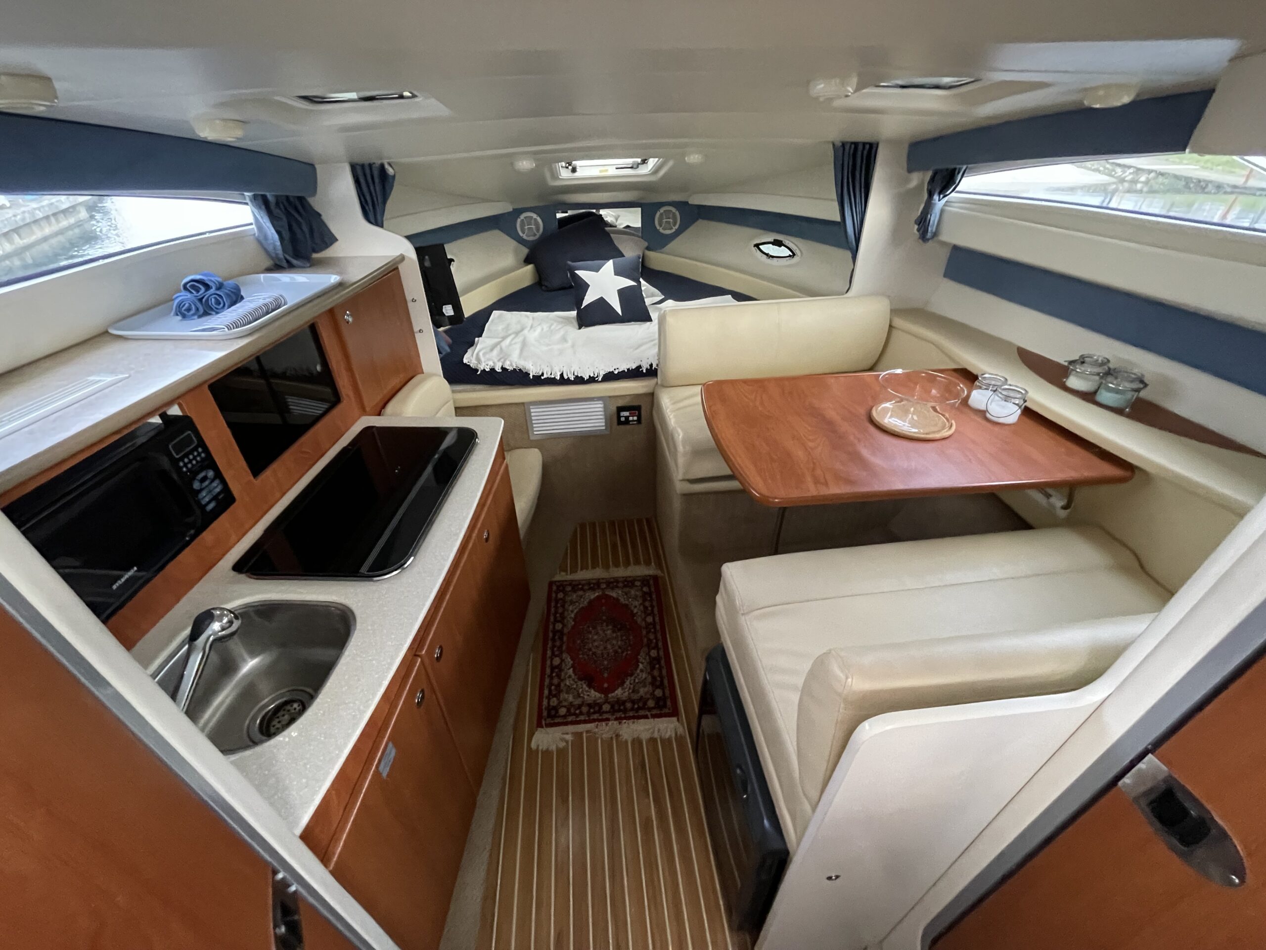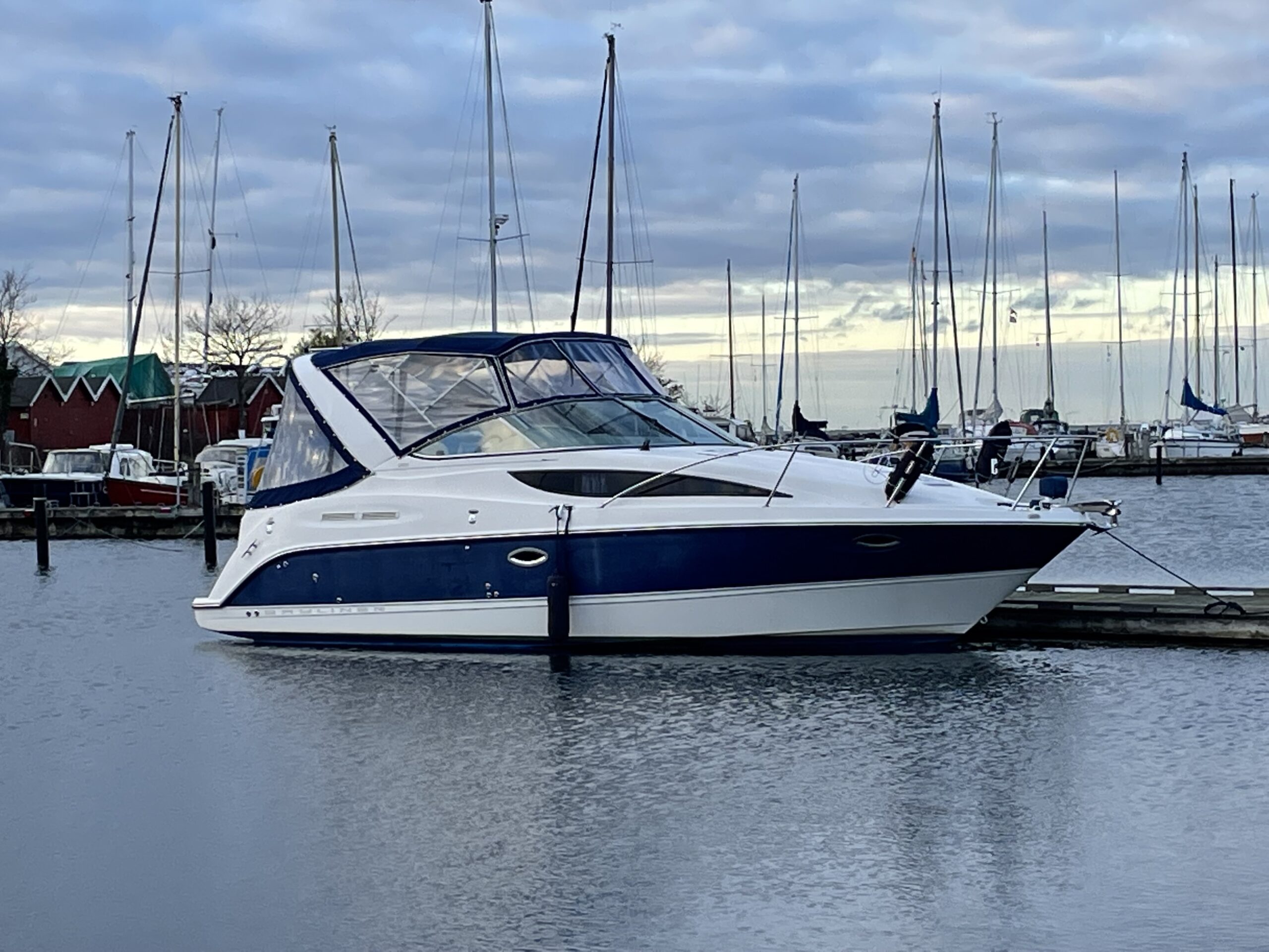 En af markedets mest populære cruisere i 28 fods klassen. Fantastisk velindrettet med rigeligt plads til familie på 4+. Godt cockpit med heldækkende camperkaleche. Stor sofagruppe med bordløsning. Førerplads med godt udsyn over instrumentbord og god læ bag det store vindspejl. Nedgang til hyggelig kahyt med langsgående pantrysektion med vask, dobbelt kogeblus microovn og køleskab. Dinettearrangement som kan omgøres til dobbeltkøje. Toiletrum med vask og brusemulighed. Agterkøje med dør og rigeligt plads til to voksne. Fremme yderligere dobbelt køje. Overalt er der fine gennemtænkte løsninger og båden byder på masser af plads og rum. En virkelig velindrettet båd med den rigtige maskine og det rigtige udstyr. BEMÆRK der er i 2020 ilagt FABRIKSNY Mercruiser 383 MAG MPI PLUS med 350HK i båden.