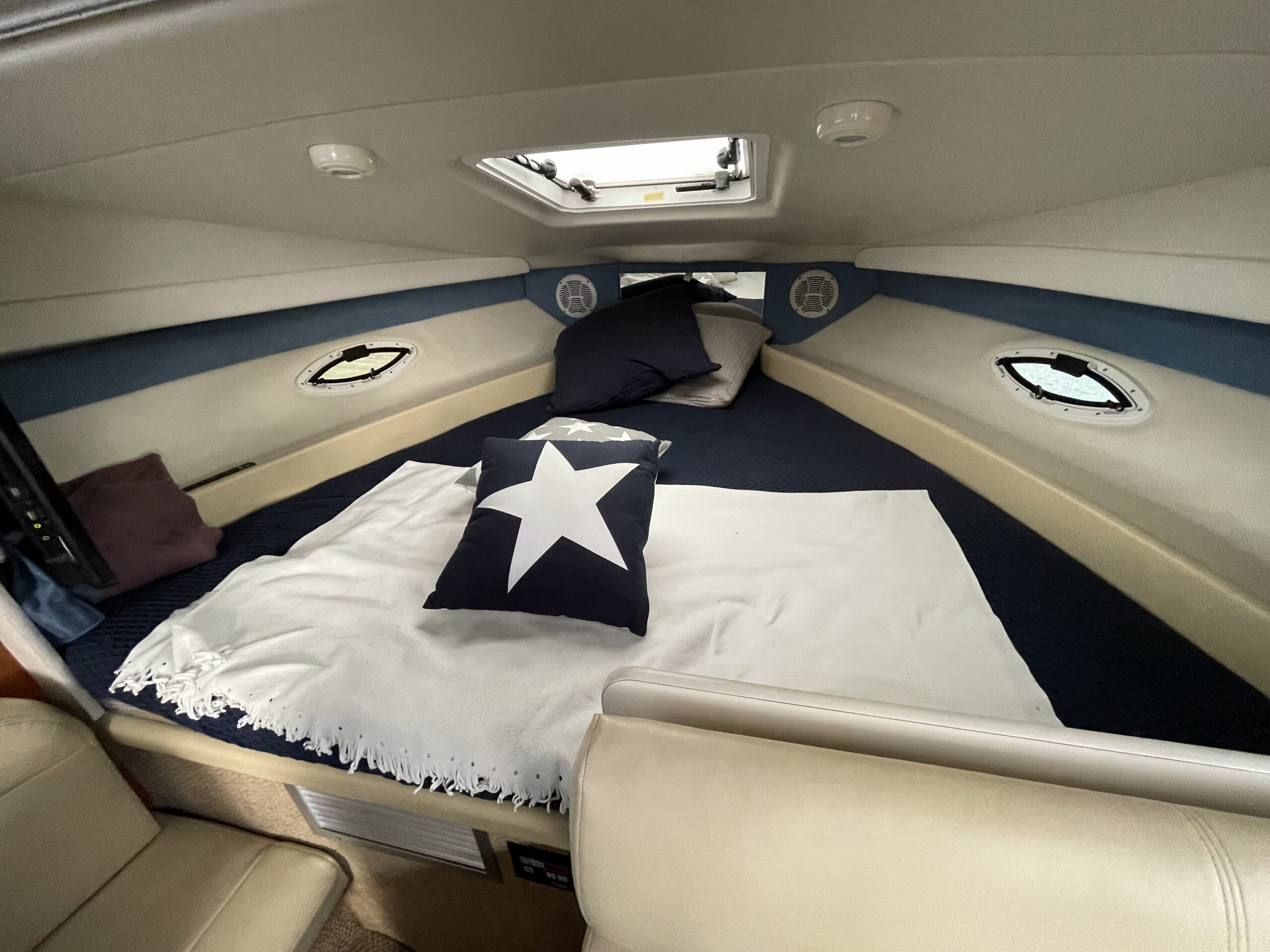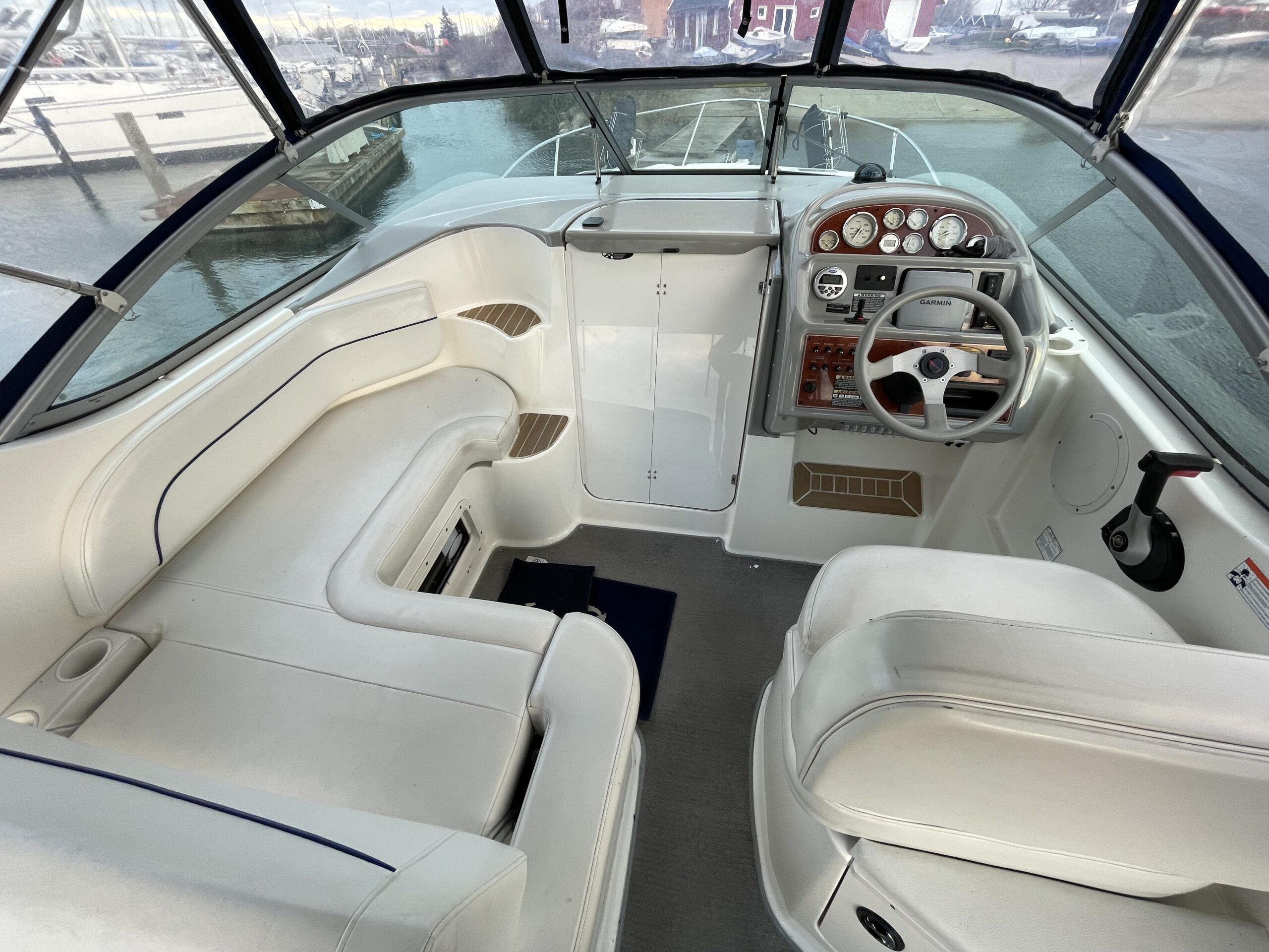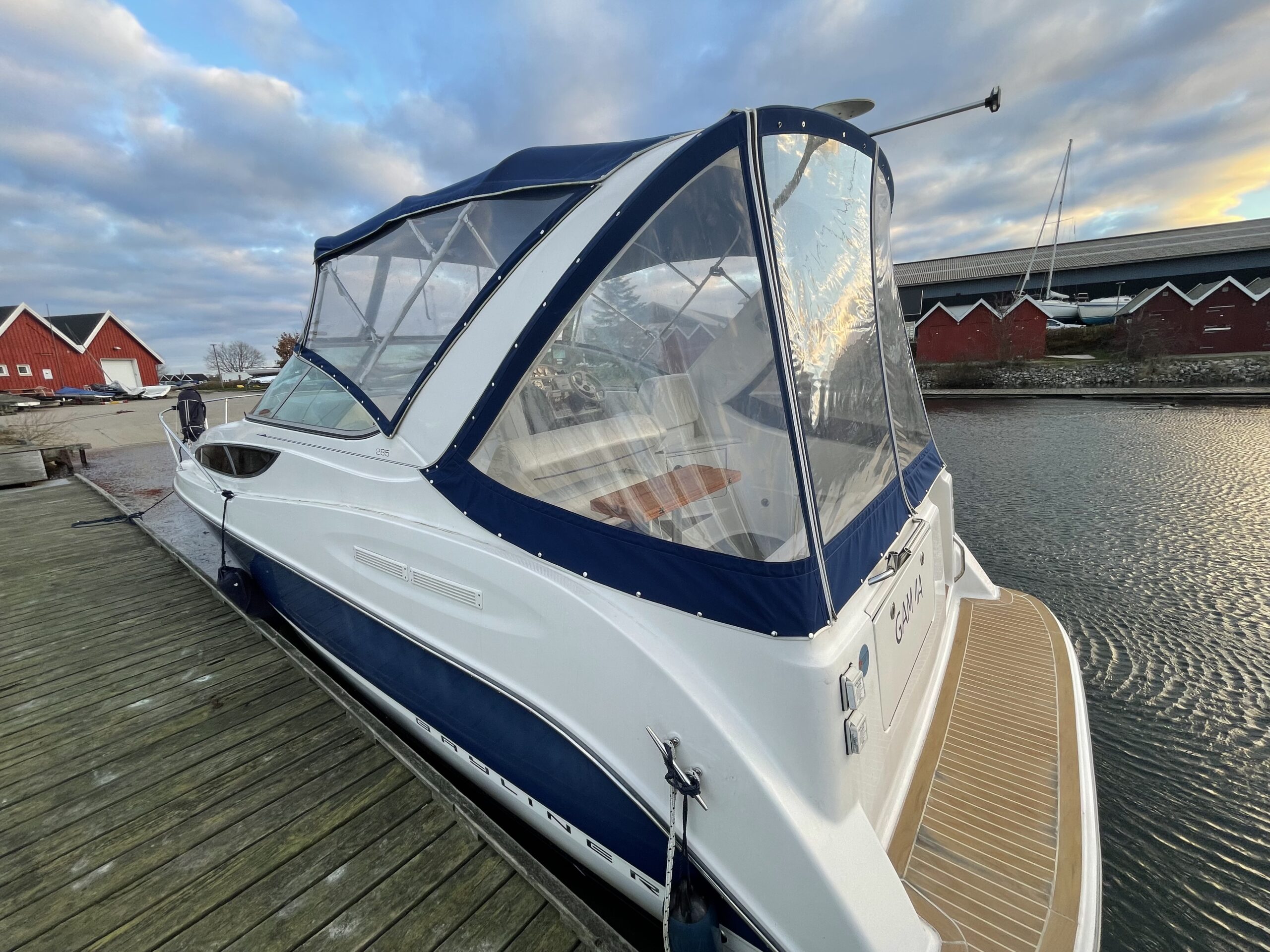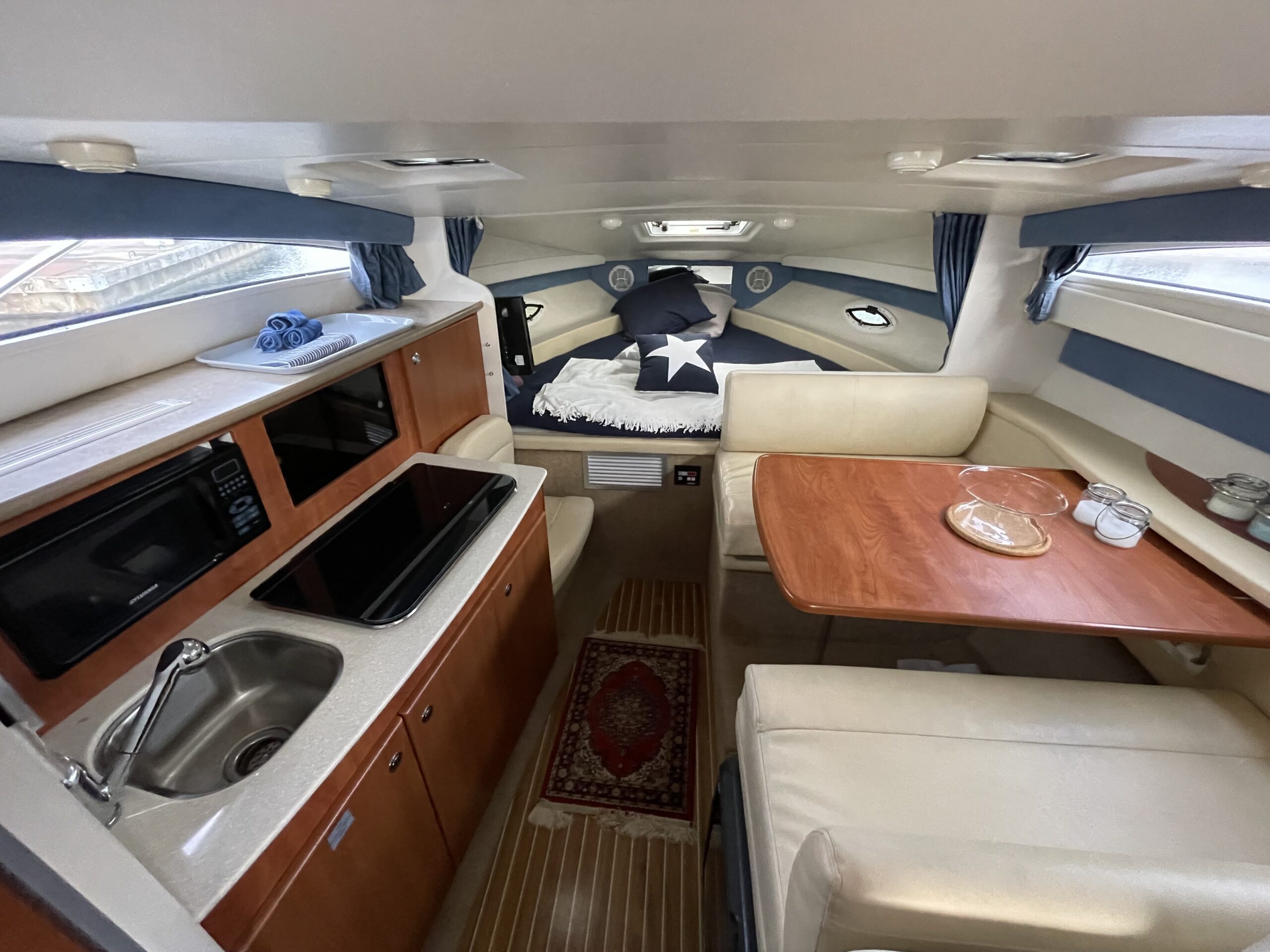 En af markedets mest populære cruisere i 28 fods klassen. Fantastisk velindrettet med rigeligt plads til familie på 4+. Godt cockpit med heldækkende camperkaleche. Stor sofagruppe med bordløsning. Førerplads med godt udsyn over instrumentbord og god læ bag det store vindspejl. Nedgang til hyggelig kahyt med langsgående pantrysektion med vask, dobbelt kogeblus microovn og køleskab. Dinettearrangement som kan omgøres til dobbeltkøje. Toiletrum med vask og brusemulighed. Agterkøje med dør og rigeligt plads til to voksne. Fremme yderligere dobbelt køje. Overalt er der fine gennemtænkte løsninger og båden byder på masser af plads og rum. En virkelig velindrettet båd med den rigtige maskine og det rigtige udstyr. BEMÆRK der er i 2020 ilagt FABRIKSNY Mercruiser 383 MAG MPI PLUS med 350HK i båden.