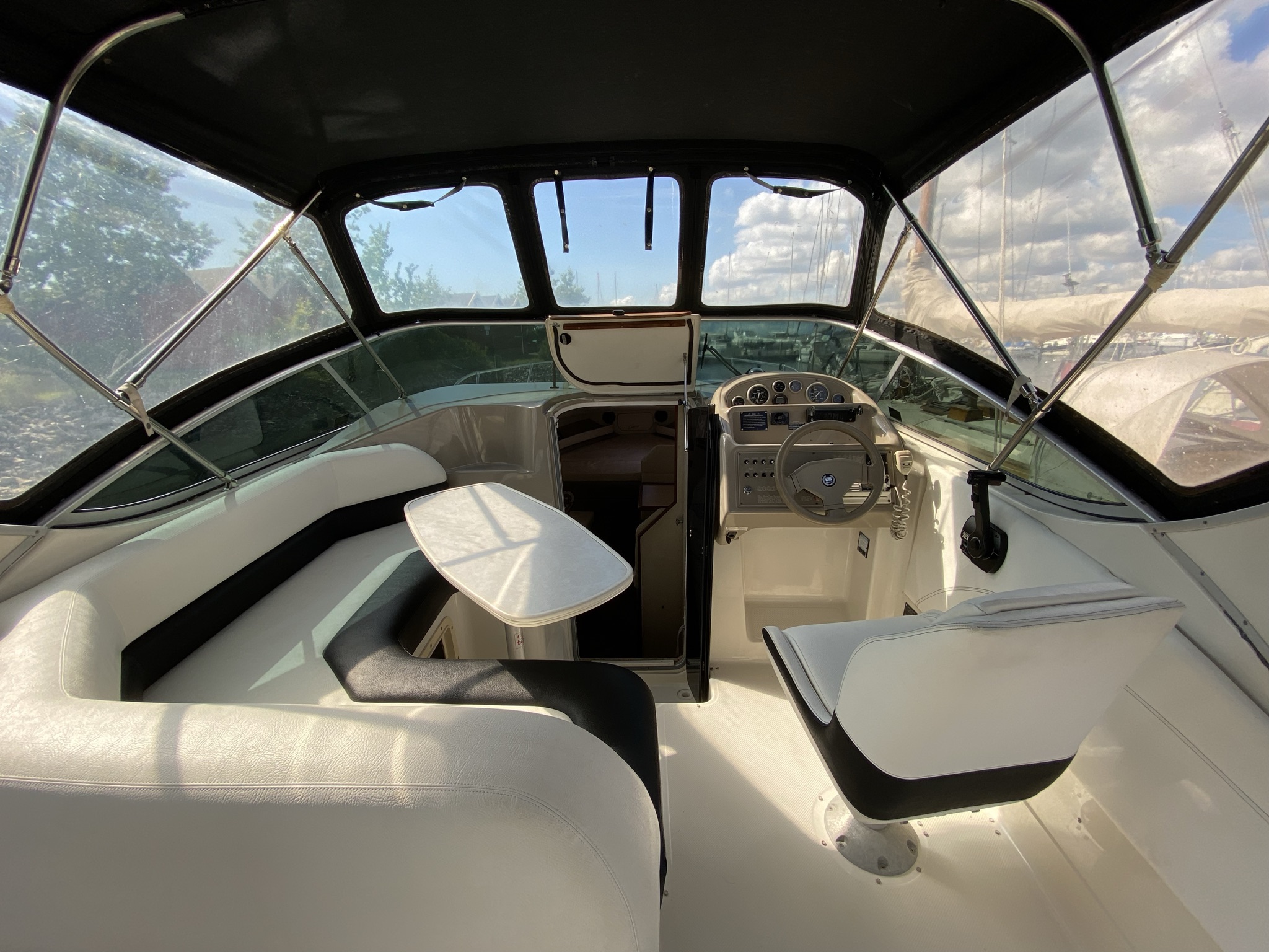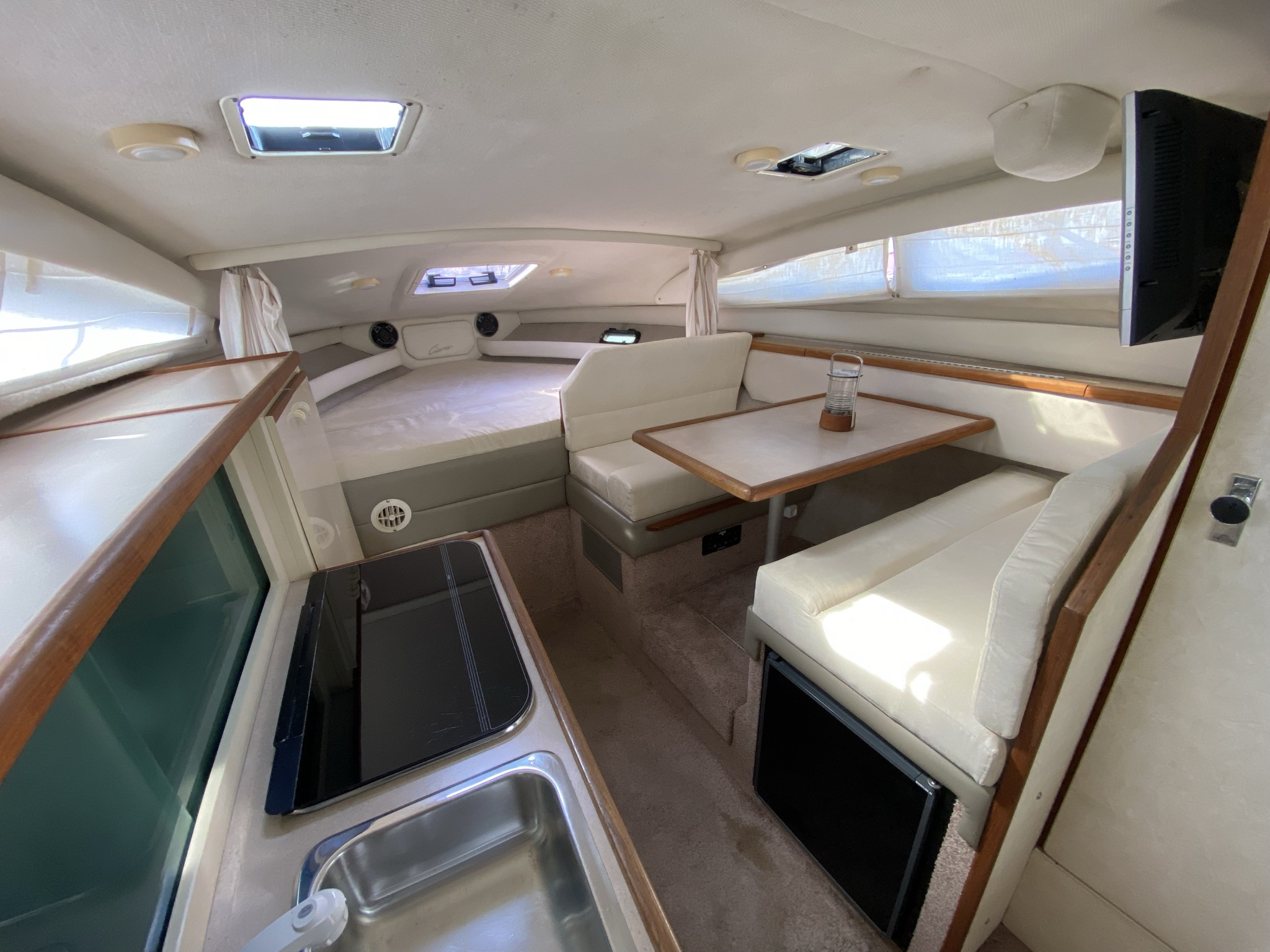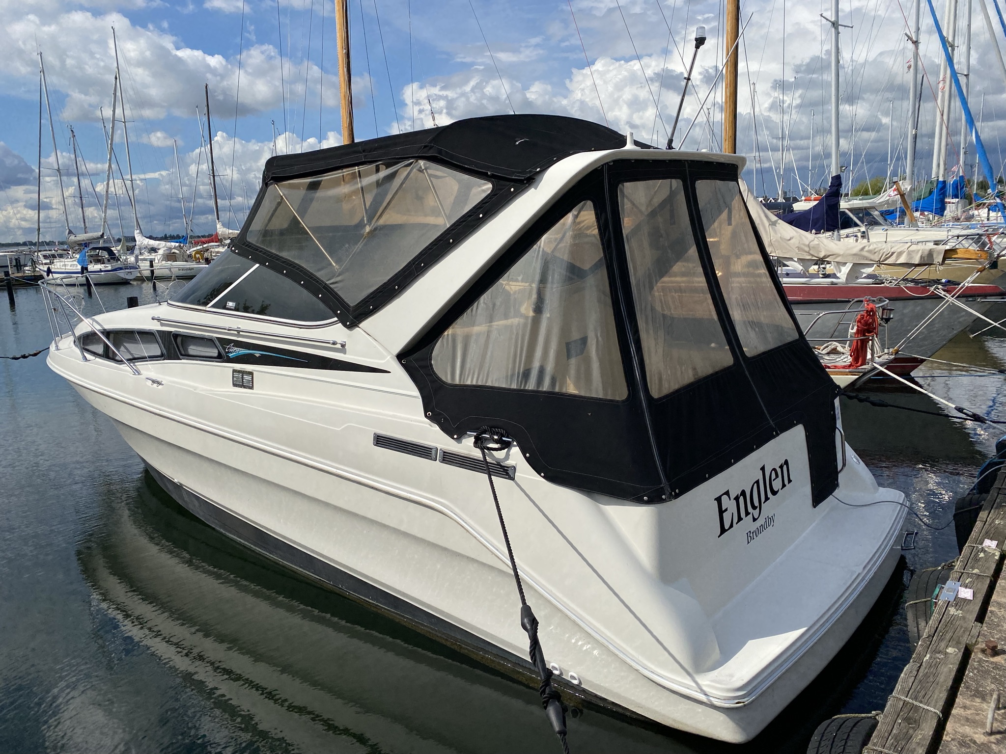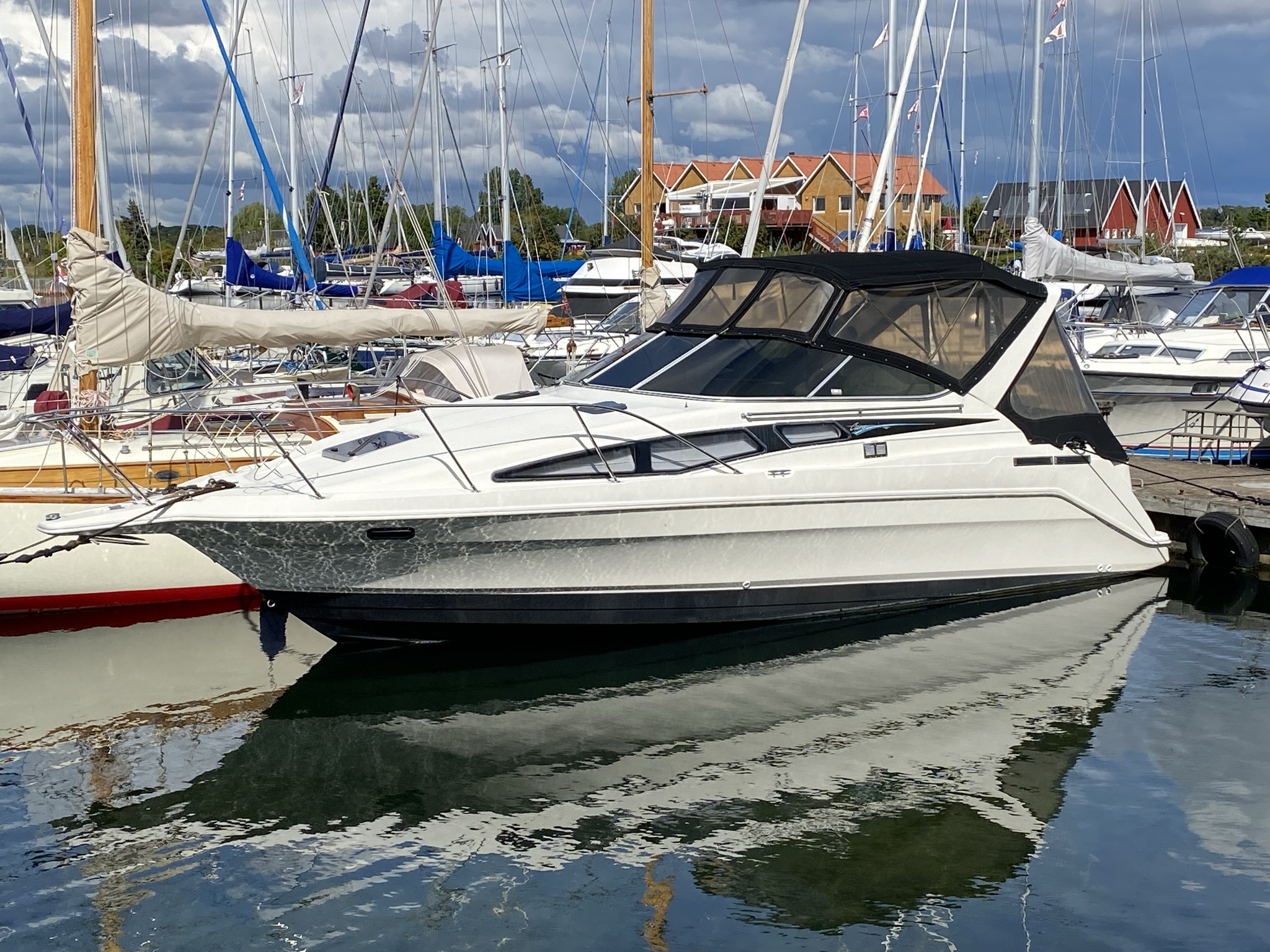 En af markedets mest populære cruisere i 28 fods klassen. Fantastisk velindrettet med rigeligt plads til familie på 4+. Godt cockpit med heldækkende nyere camper kaleche. Stor sofagruppe med bordløsning. Føreplads med godt udsyn over instrumentbord og god læ bag det store vindspejl. Nedgang til hyggelig kahyt med langsgående pantrysektion med vask, dobbelt kogeblus og køleskab. Dinettearrangement som kan omgøres til dobbeltkøje. Toiletrum med vaskemodul og god brusemulighed. Agterkøje med rigeligt plads til to voksne, Fremme yderligere dobbelt køje. Overalt er der fine gennemtænkte løsninger og båden byder på masser af plads og rum. En virkelig velindrettet båd med 7,4 L 330 hk motor i. en virkelig fin båd. motor serviceret hvert år.