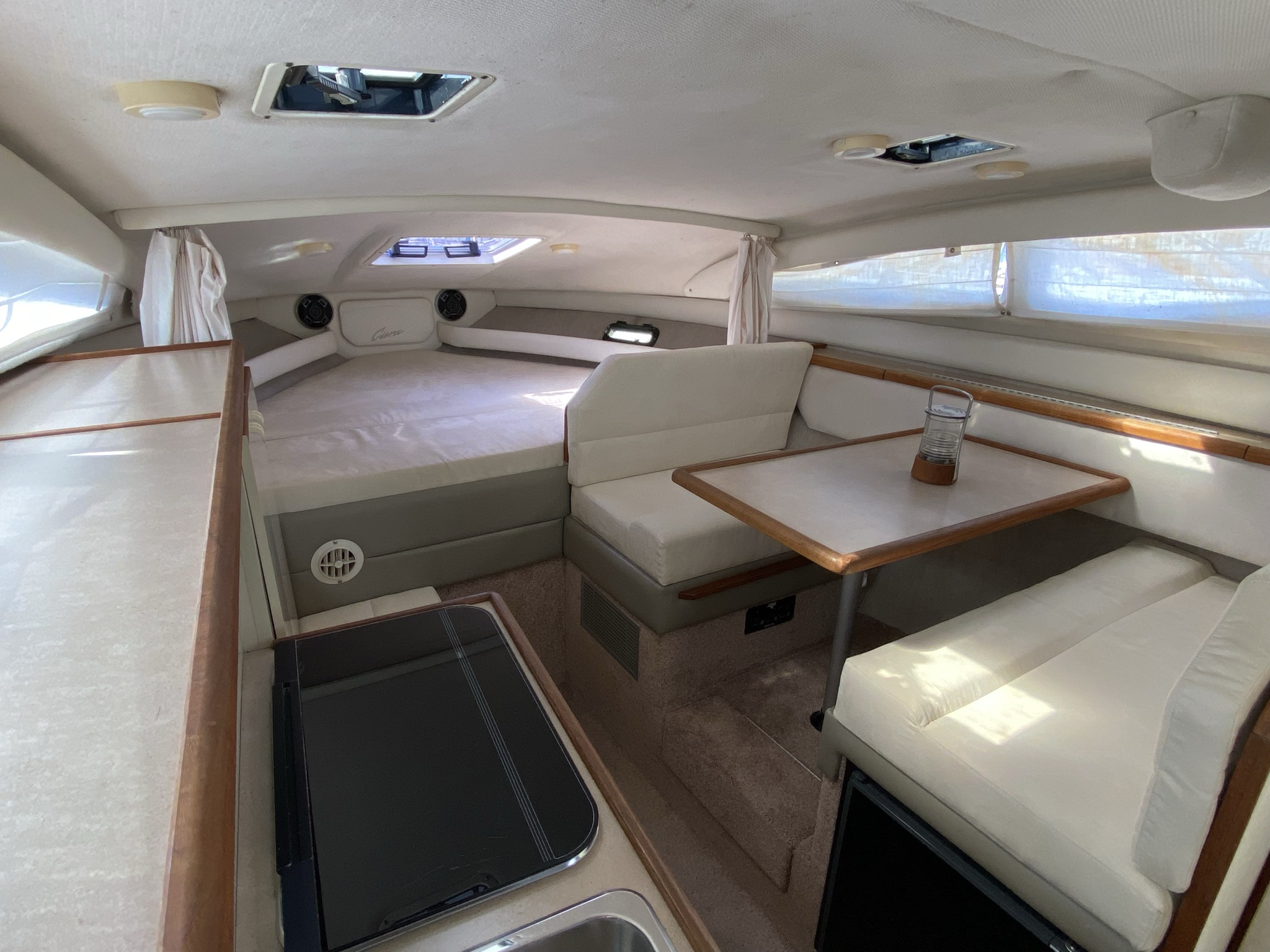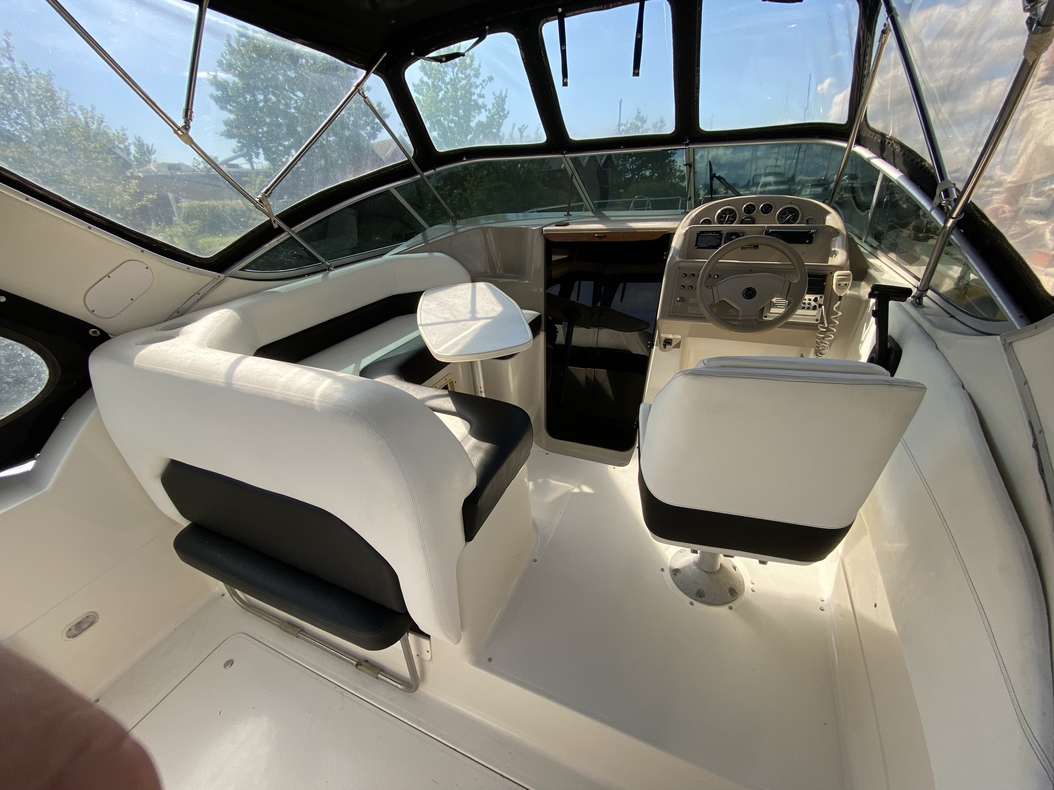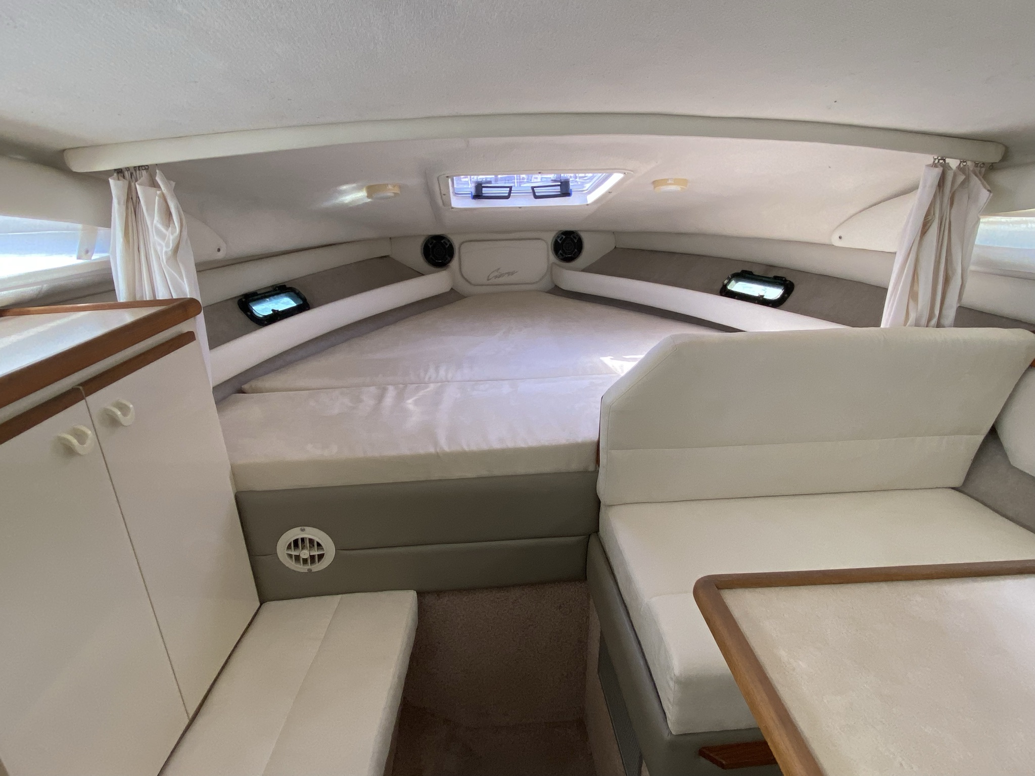 En af markedets mest populære cruisere i 28 fods klassen. Fantastisk velindrettet med rigeligt plads til familie på 4+. Godt cockpit med heldækkende nyere camper kaleche. Stor sofagruppe med bordløsning. Føreplads med godt udsyn over instrumentbord og god læ bag det store vindspejl. Nedgang til hyggelig kahyt med langsgående pantrysektion med vask, dobbelt kogeblus og køleskab. Dinettearrangement som kan omgøres til dobbeltkøje. Toiletrum med vaskemodul og god brusemulighed. Agterkøje med rigeligt plads til to voksne, Fremme yderligere dobbelt køje. Overalt er der fine gennemtænkte løsninger og båden byder på masser af plads og rum. En virkelig velindrettet båd med 7,4 L 330 hk motor i. en virkelig fin båd. motor serviceret hvert år.