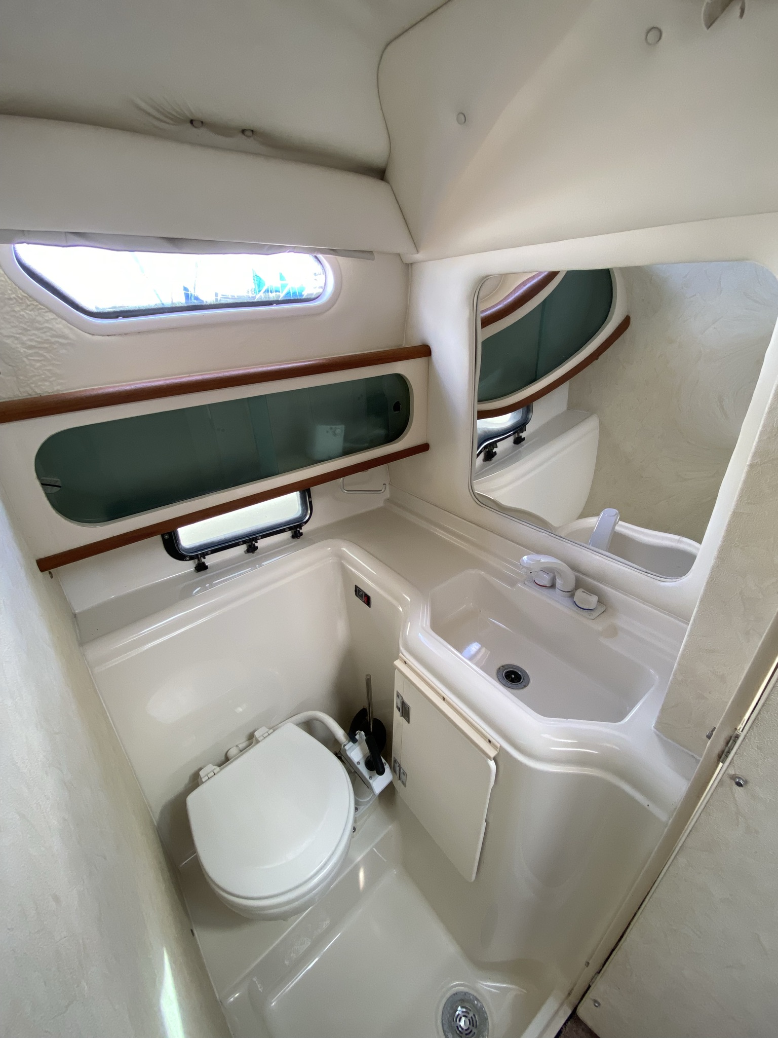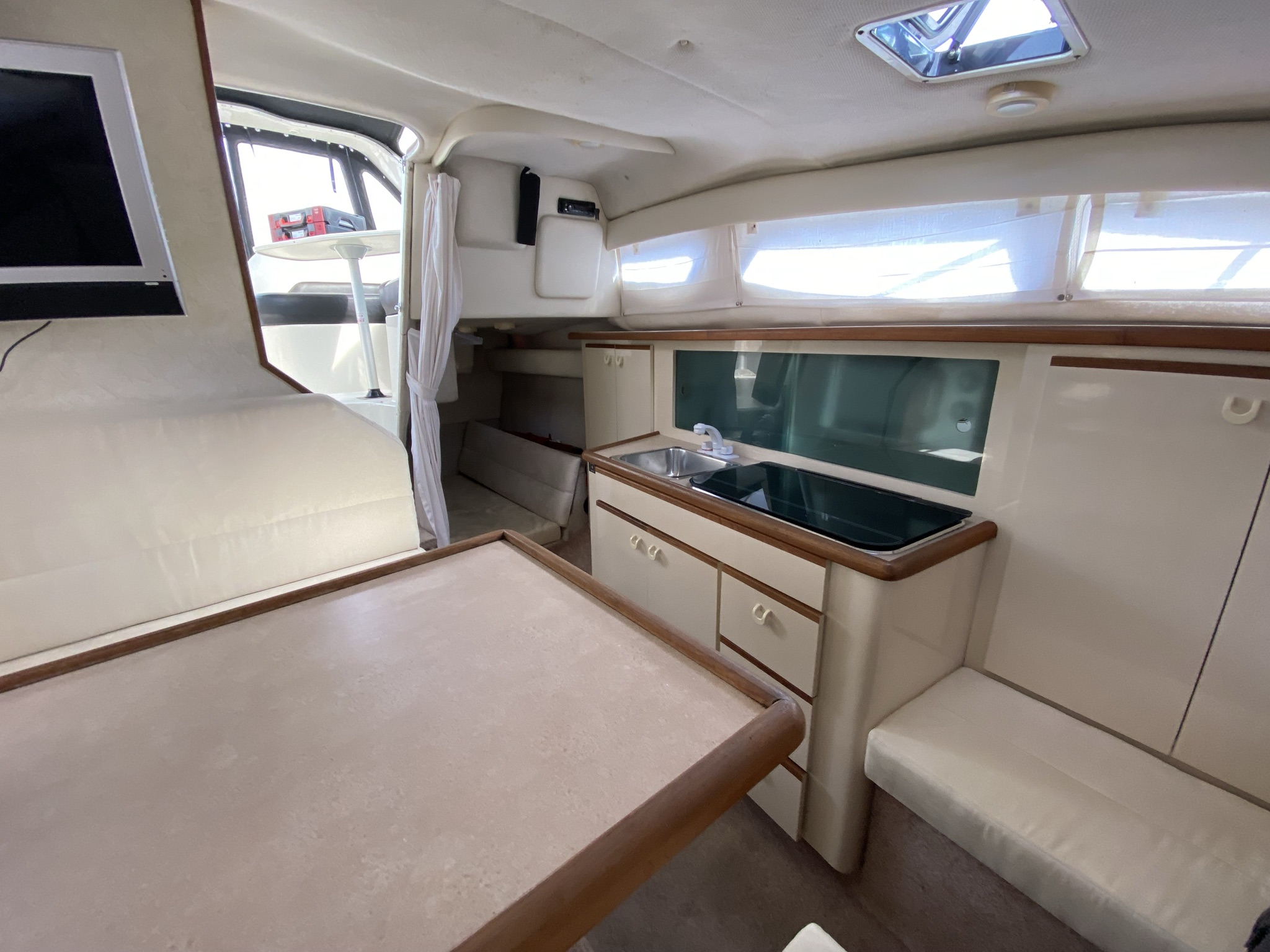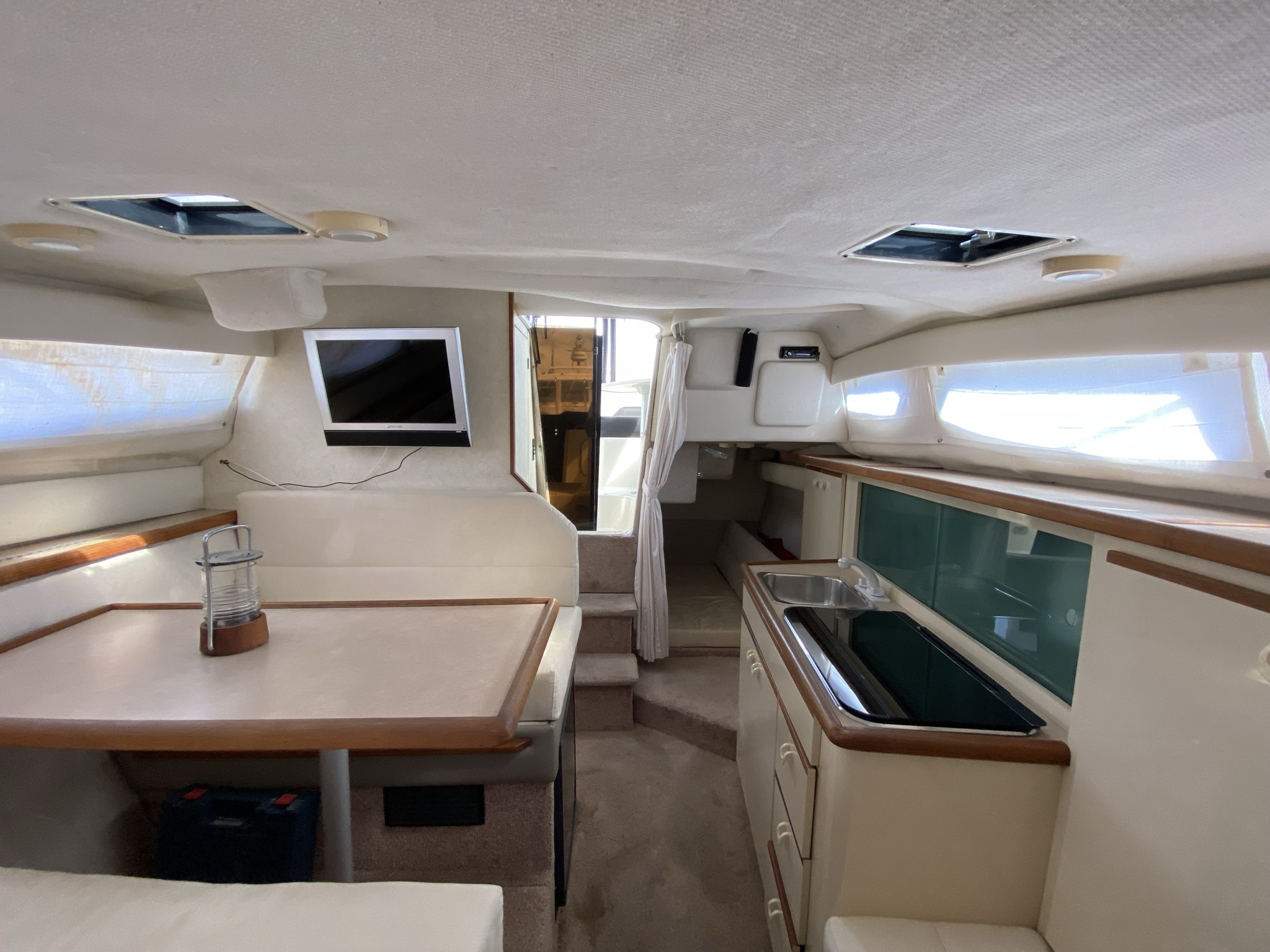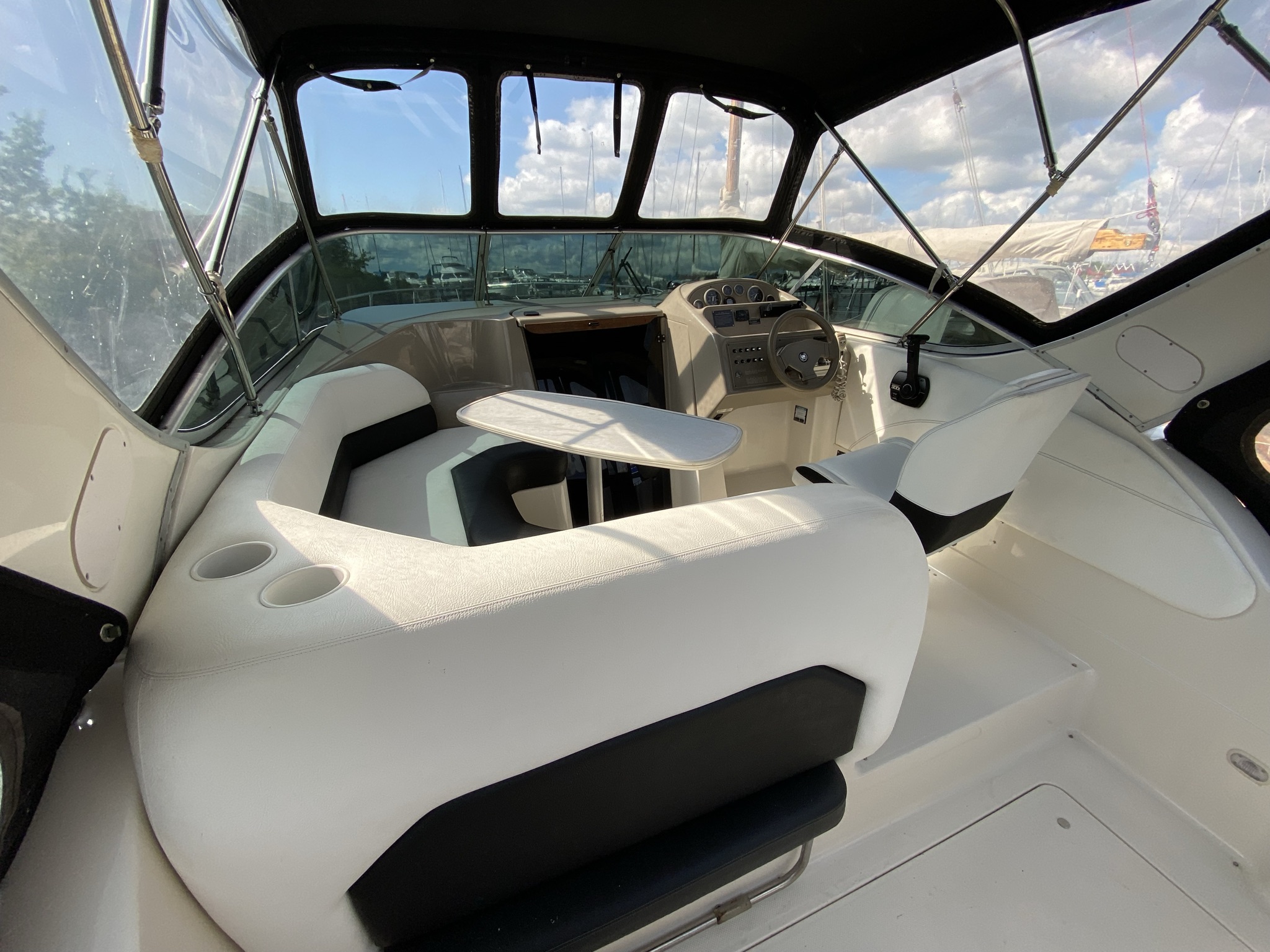 En af markedets mest populære cruisere i 28 fods klassen. Fantastisk velindrettet med rigeligt plads til familie på 4+. Godt cockpit med heldækkende nyere camper kaleche. Stor sofagruppe med bordløsning. Føreplads med godt udsyn over instrumentbord og god læ bag det store vindspejl. Nedgang til hyggelig kahyt med langsgående pantrysektion med vask, dobbelt kogeblus og køleskab. Dinettearrangement som kan omgøres til dobbeltkøje. Toiletrum med vaskemodul og god brusemulighed. Agterkøje med rigeligt plads til to voksne, Fremme yderligere dobbelt køje. Overalt er der fine gennemtænkte løsninger og båden byder på masser af plads og rum. En virkelig velindrettet båd med 7,4 L 330 hk motor i. en virkelig fin båd. motor serviceret hvert år.