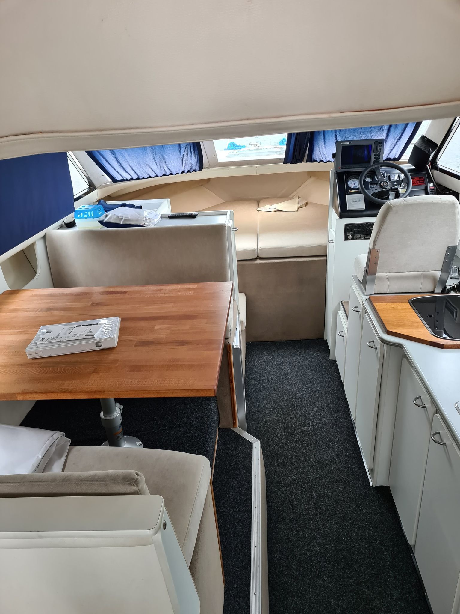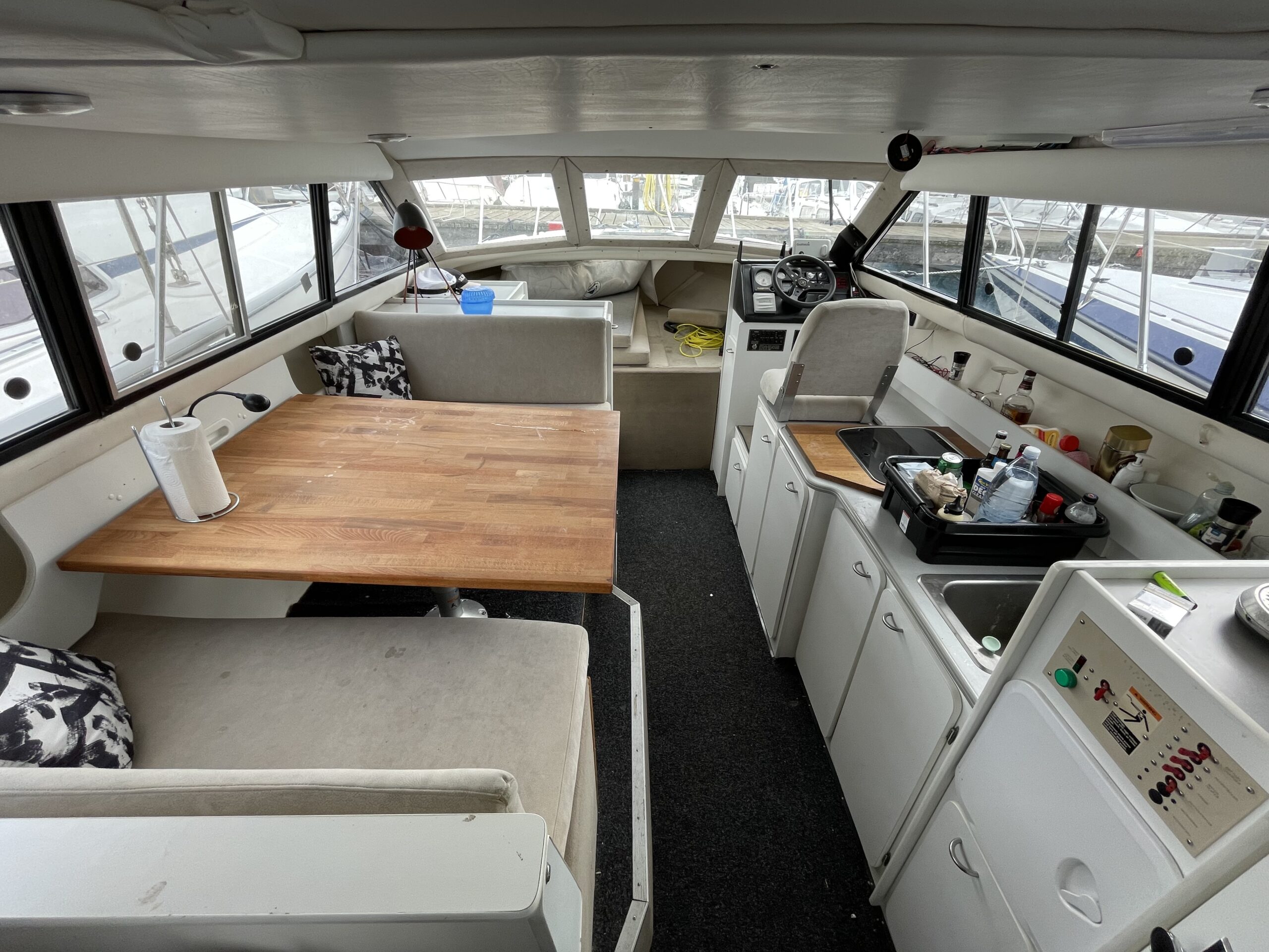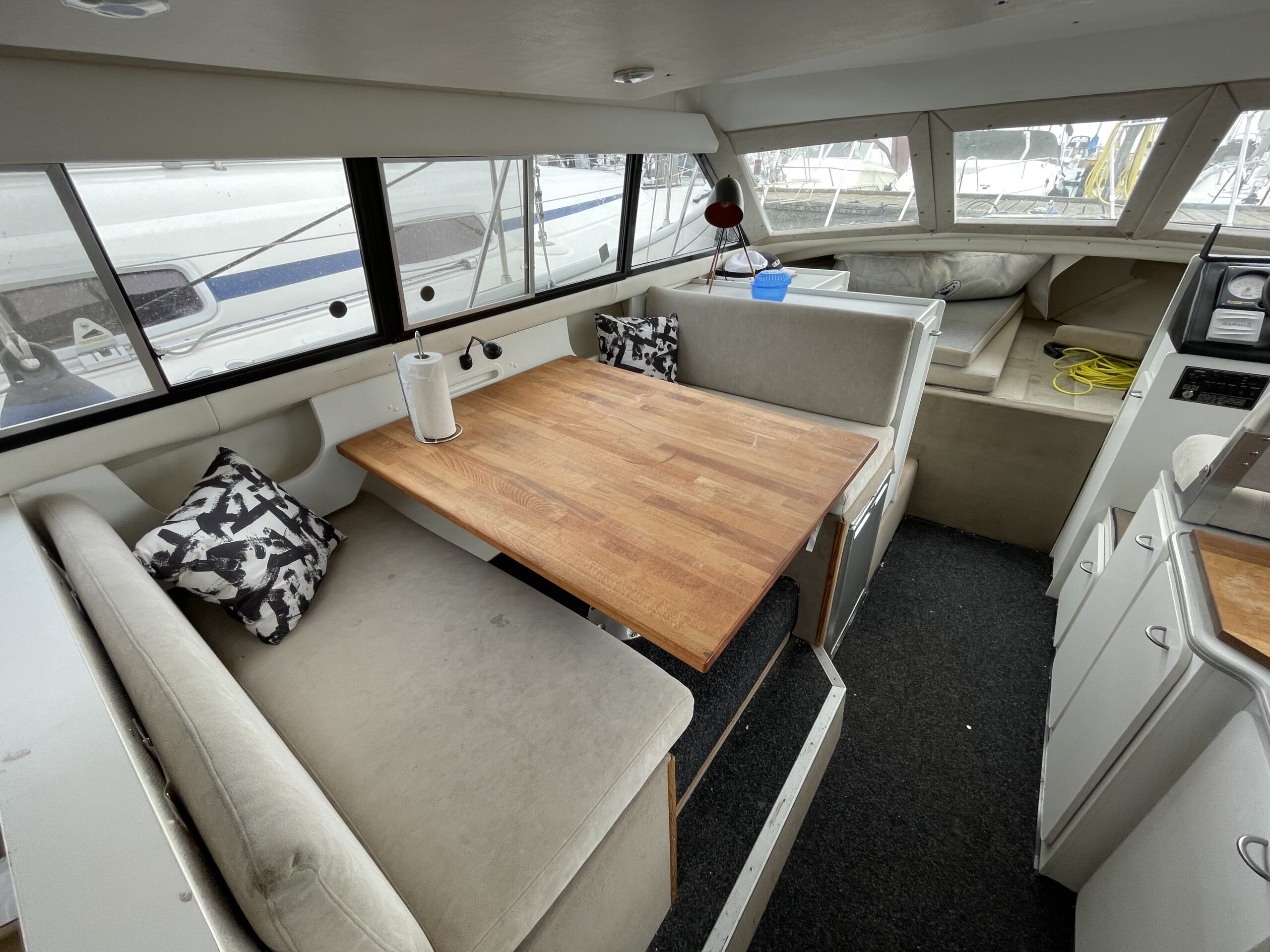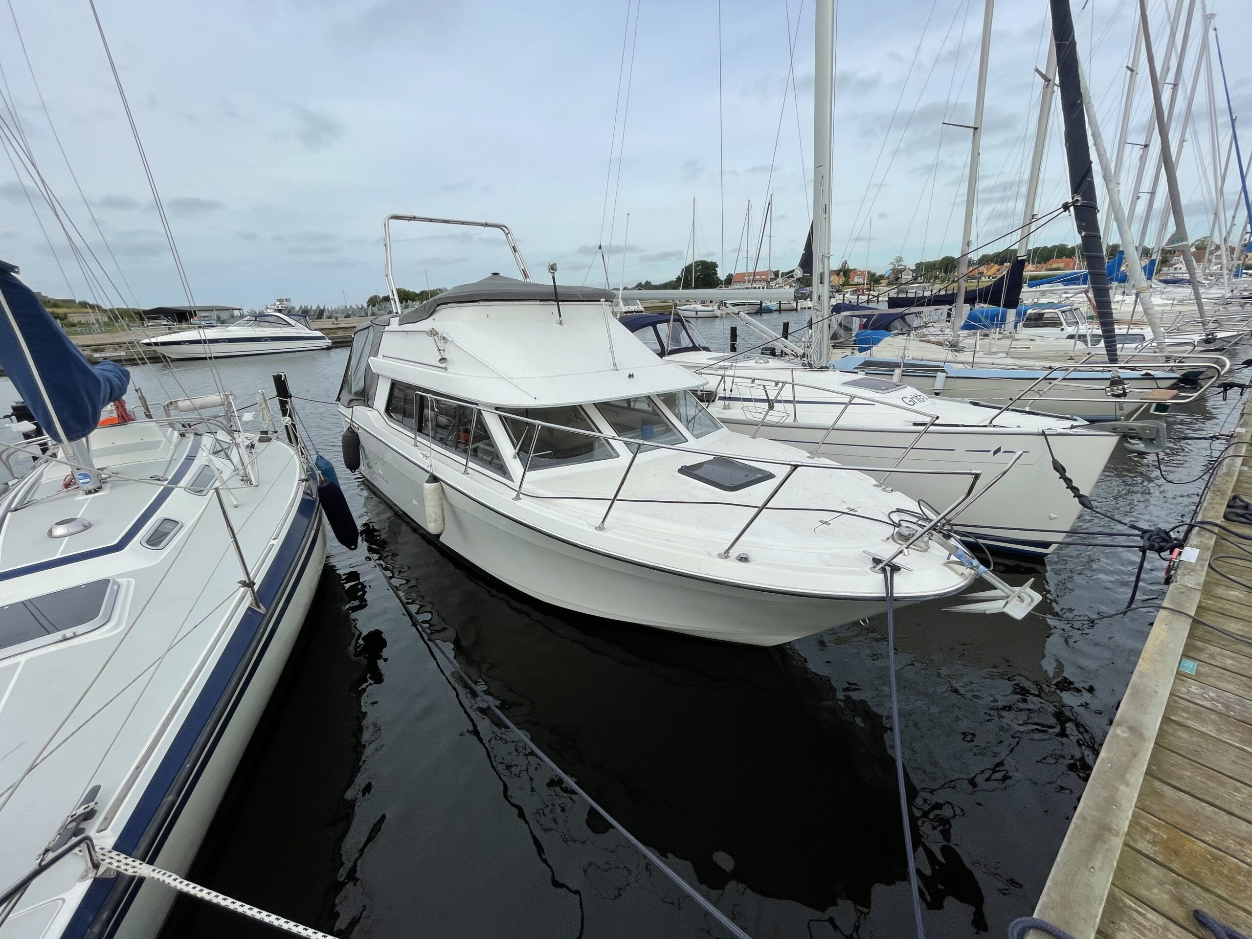 Flot amerikansk weekendcruiser med lækre detaljer, anderledes design og indretning end du normalt. Agterdæk med plads til hele familien rundt om bordet. adgang via dør til salon med pantrysektion og sofagruppe. Her kan sofaen omgøres til kæmpe dobbeltkøje med smart løsning. Sovepladser i fronten, Toiletrum med vaskemodul og brusemulighed. Stor ny badeplatform.