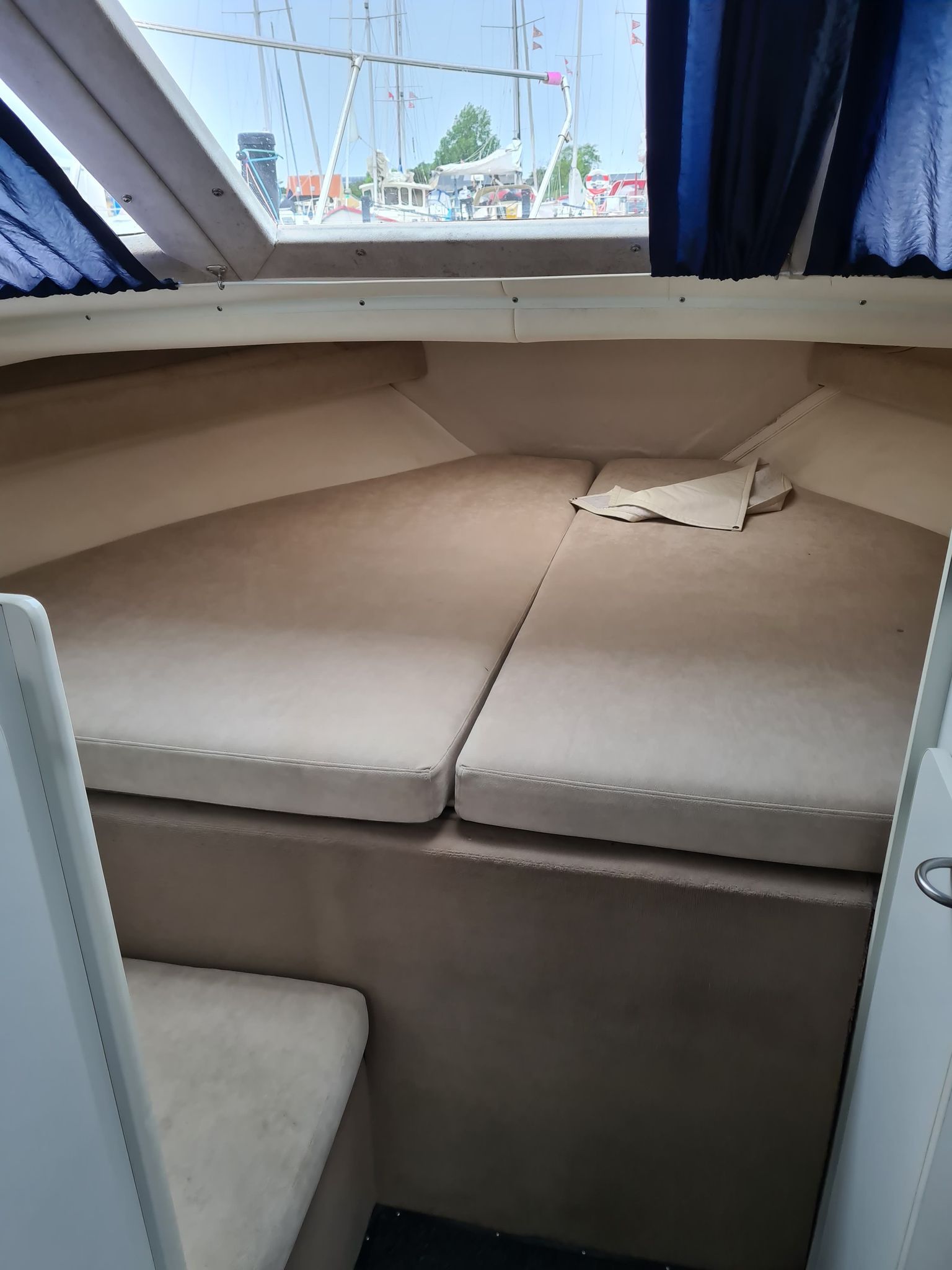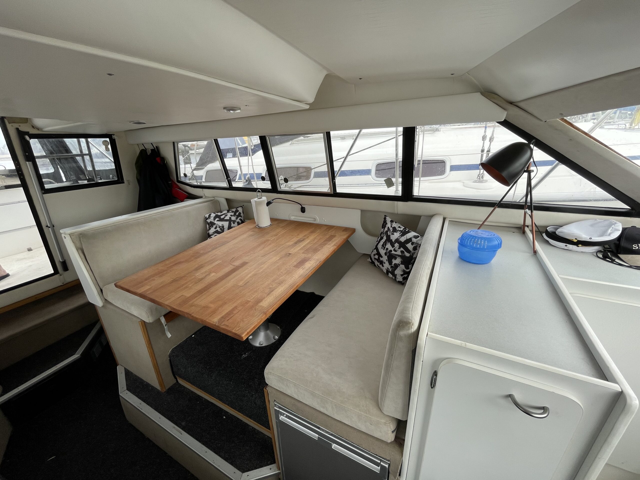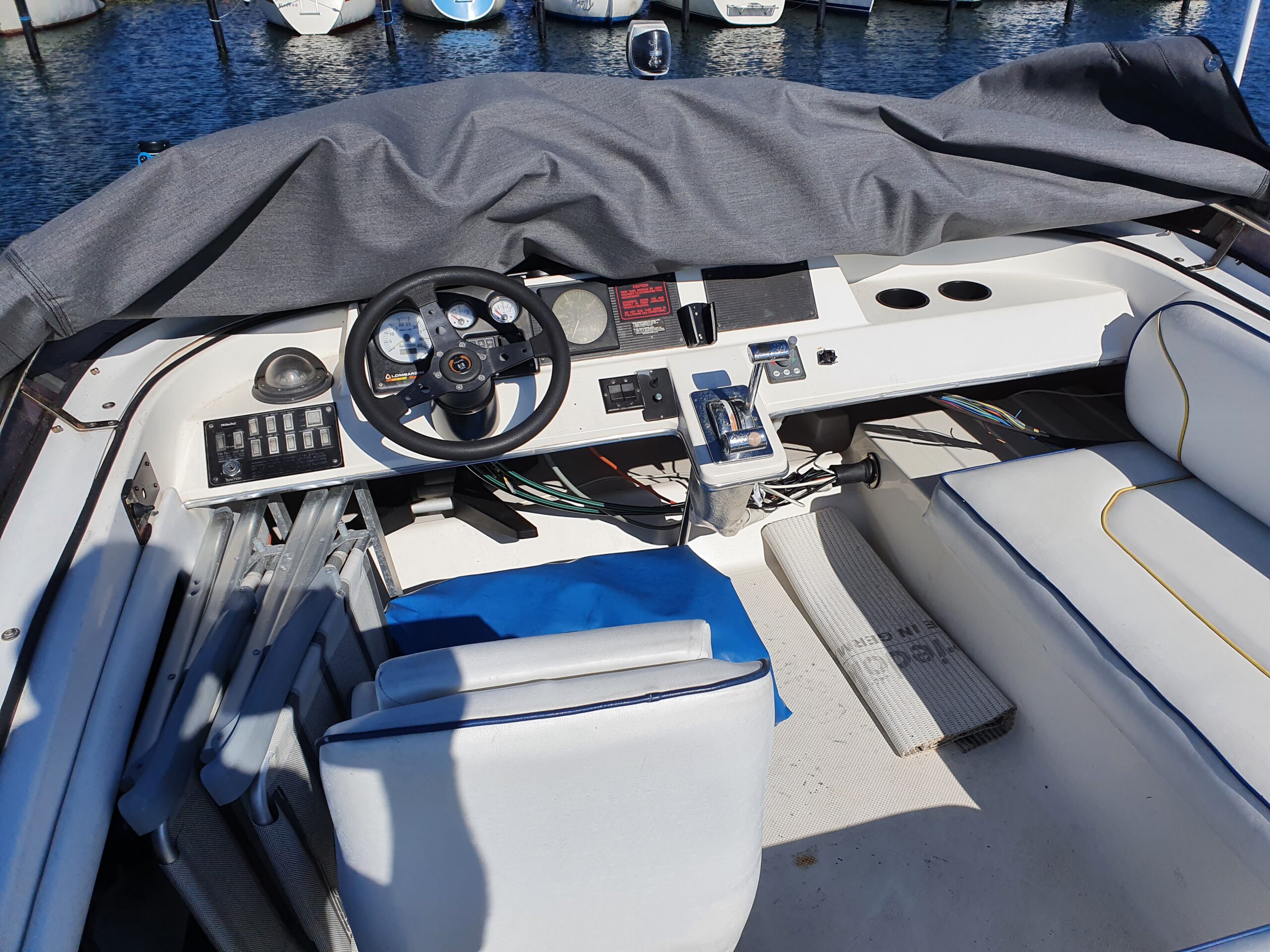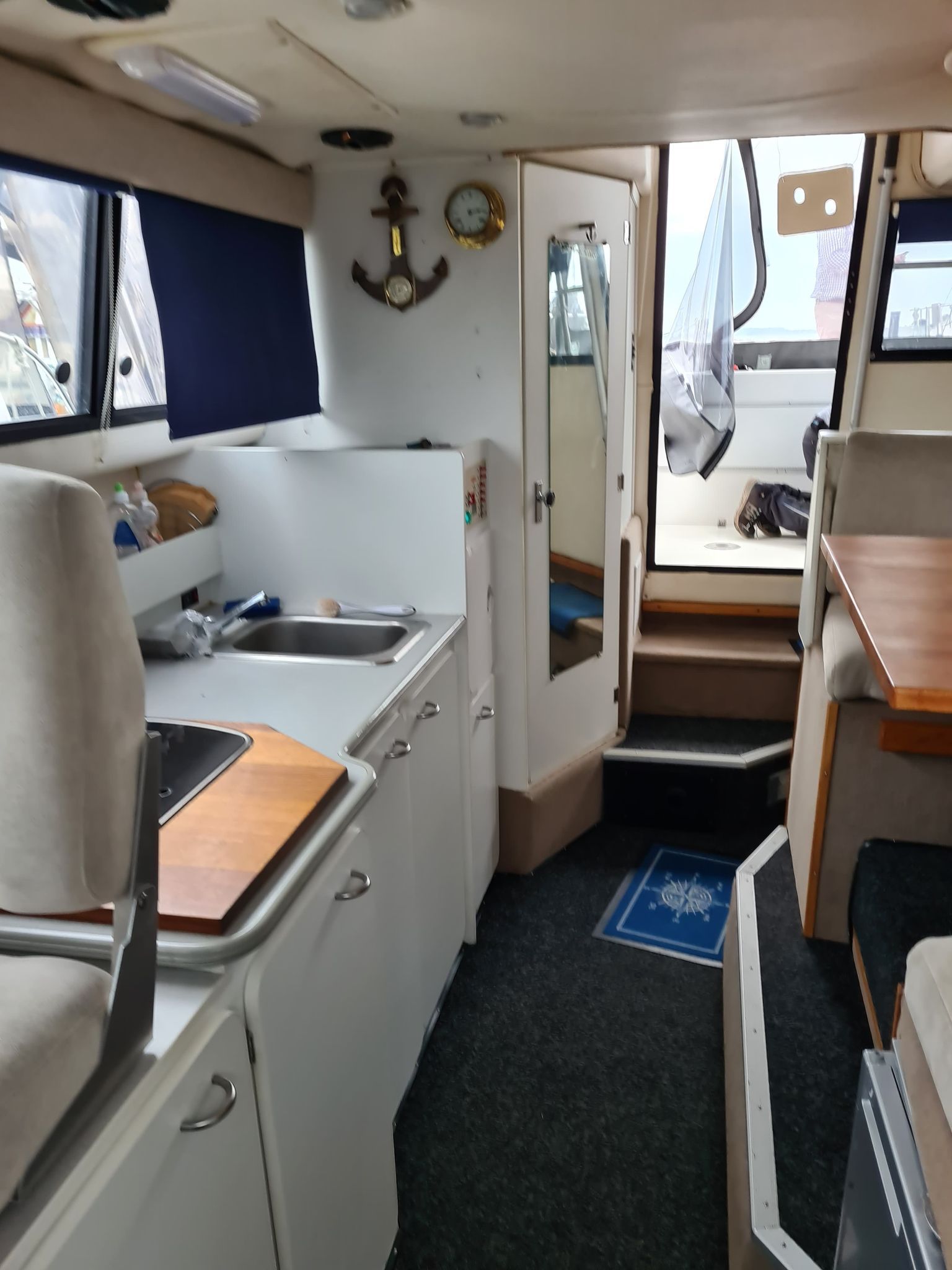 Flot amerikansk weekendcruiser med lækre detaljer, anderledes design og indretning end du normalt. Agterdæk med plads til hele familien rundt om bordet. adgang via dør til salon med pantrysektion og sofagruppe. Her kan sofaen omgøres til kæmpe dobbeltkøje med smart løsning. Sovepladser i fronten, Toiletrum med vaskemodul og brusemulighed. Stor ny badeplatform.