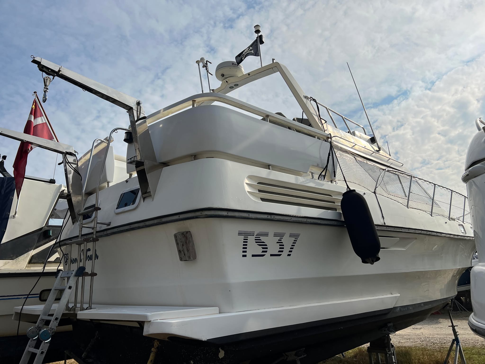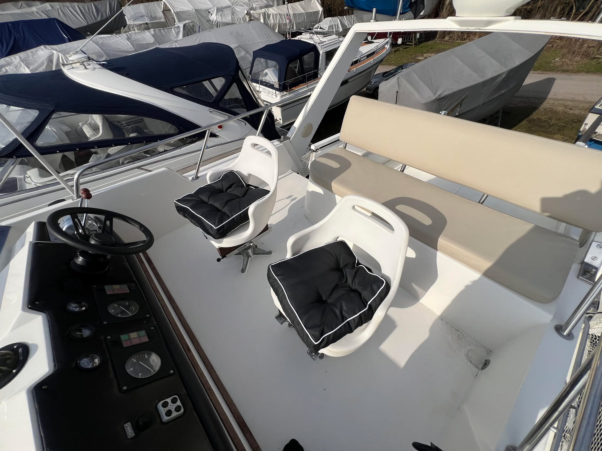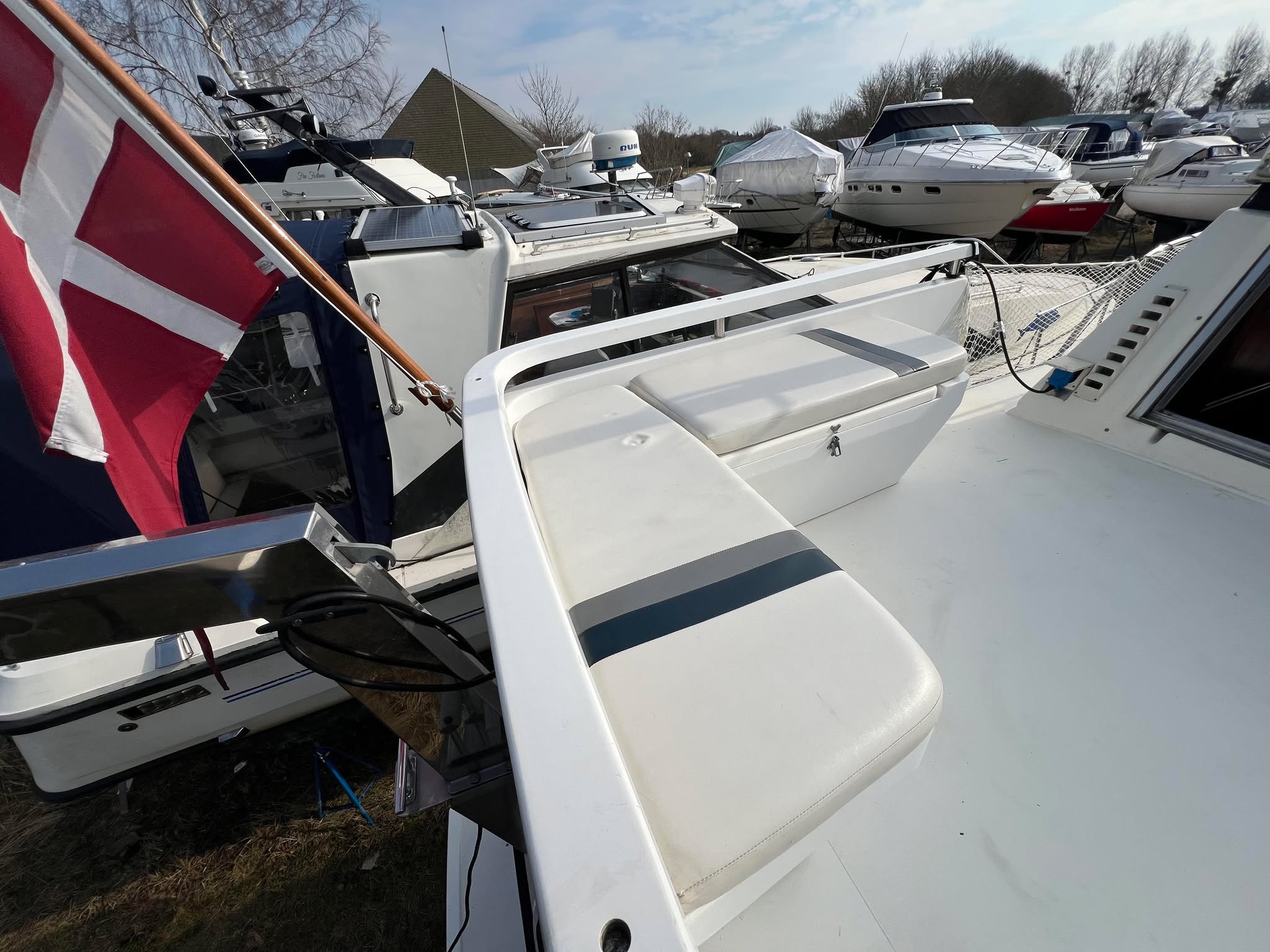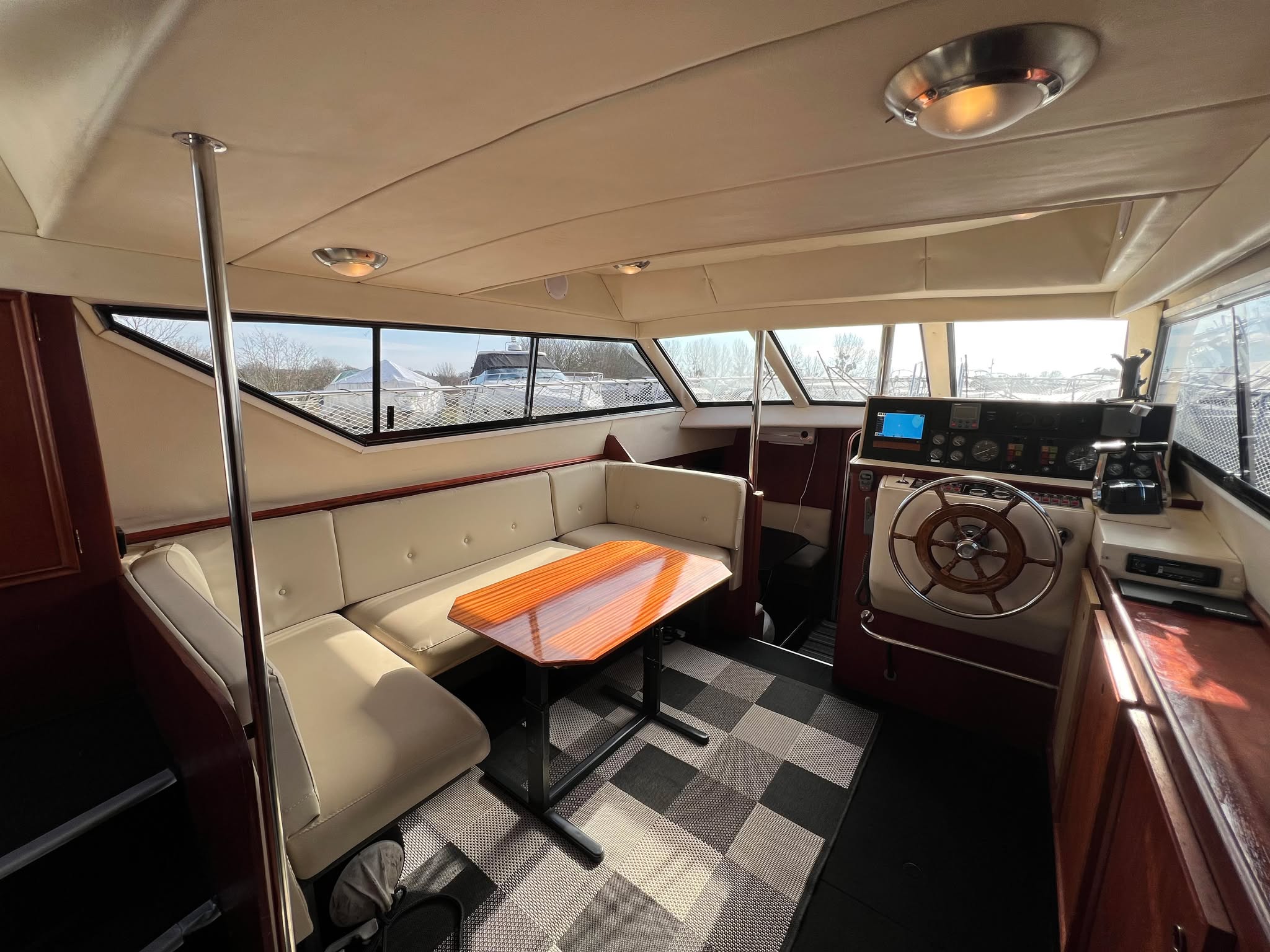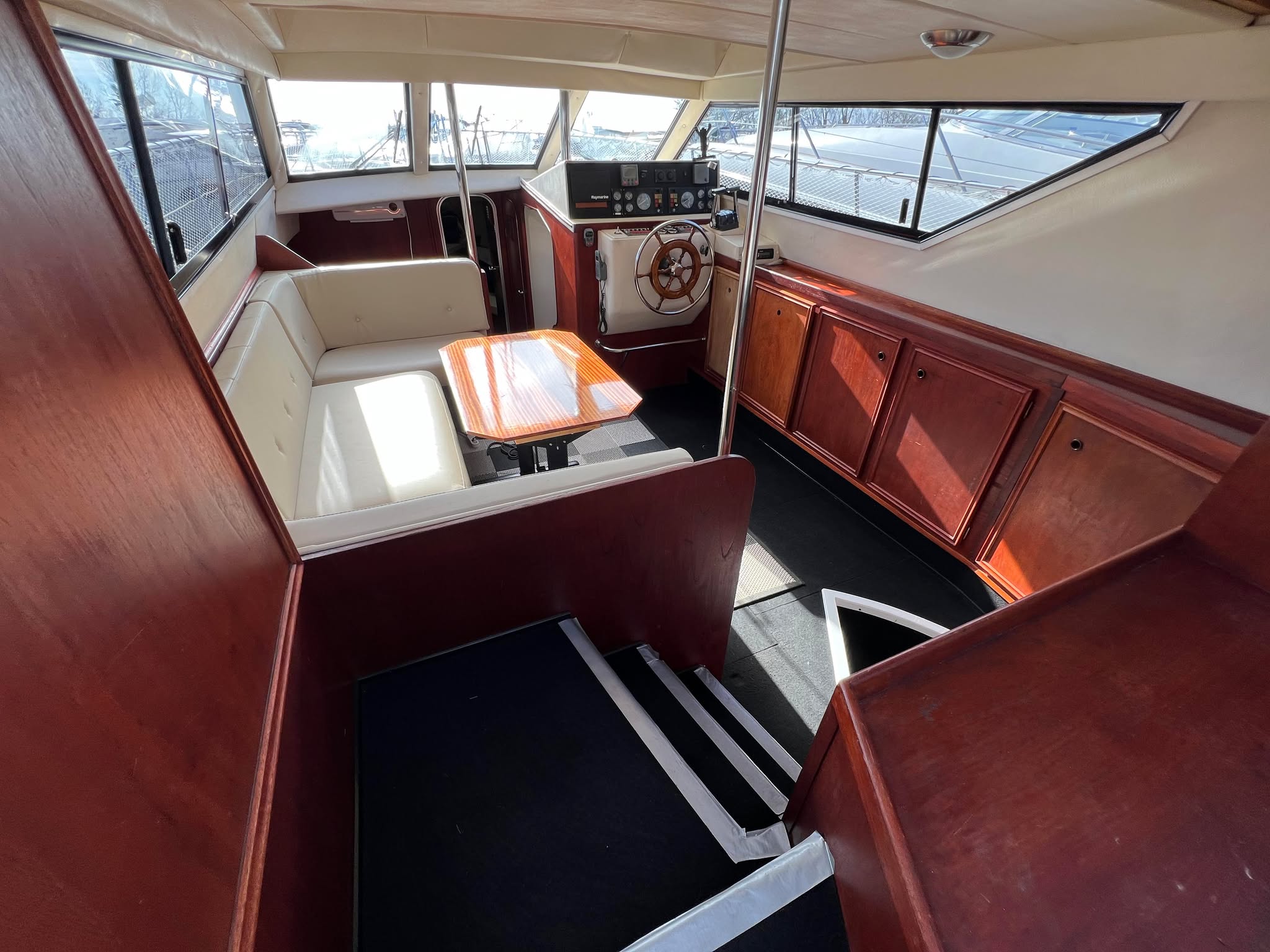 Birchwood TS 37 med Stort agterdæk med gode sidde pladser og nyere hynder til. opgang til flybridge hvor man kan har komplet instrumentering. Fra agtertdæk er der nedgang til en rummelig salon, stor sofa arrangement med pæne hynder, der hurtigt kan gøres til en dobbelt soveplads. Fra Salon ned til Pantry afdelingen med stor spise plads der også kan omgøres til dobbelt soveplads, Toilet rum med brus med holdingtank.