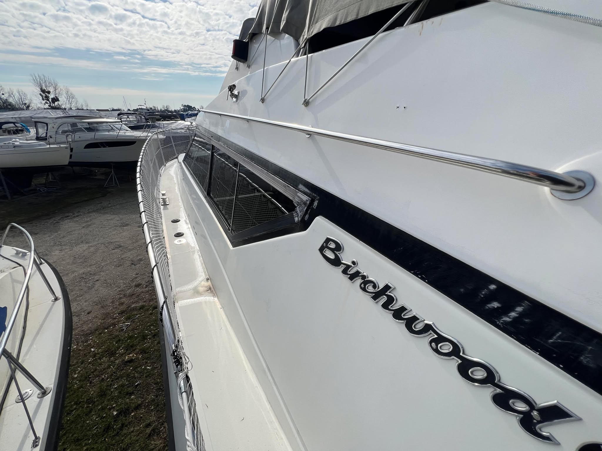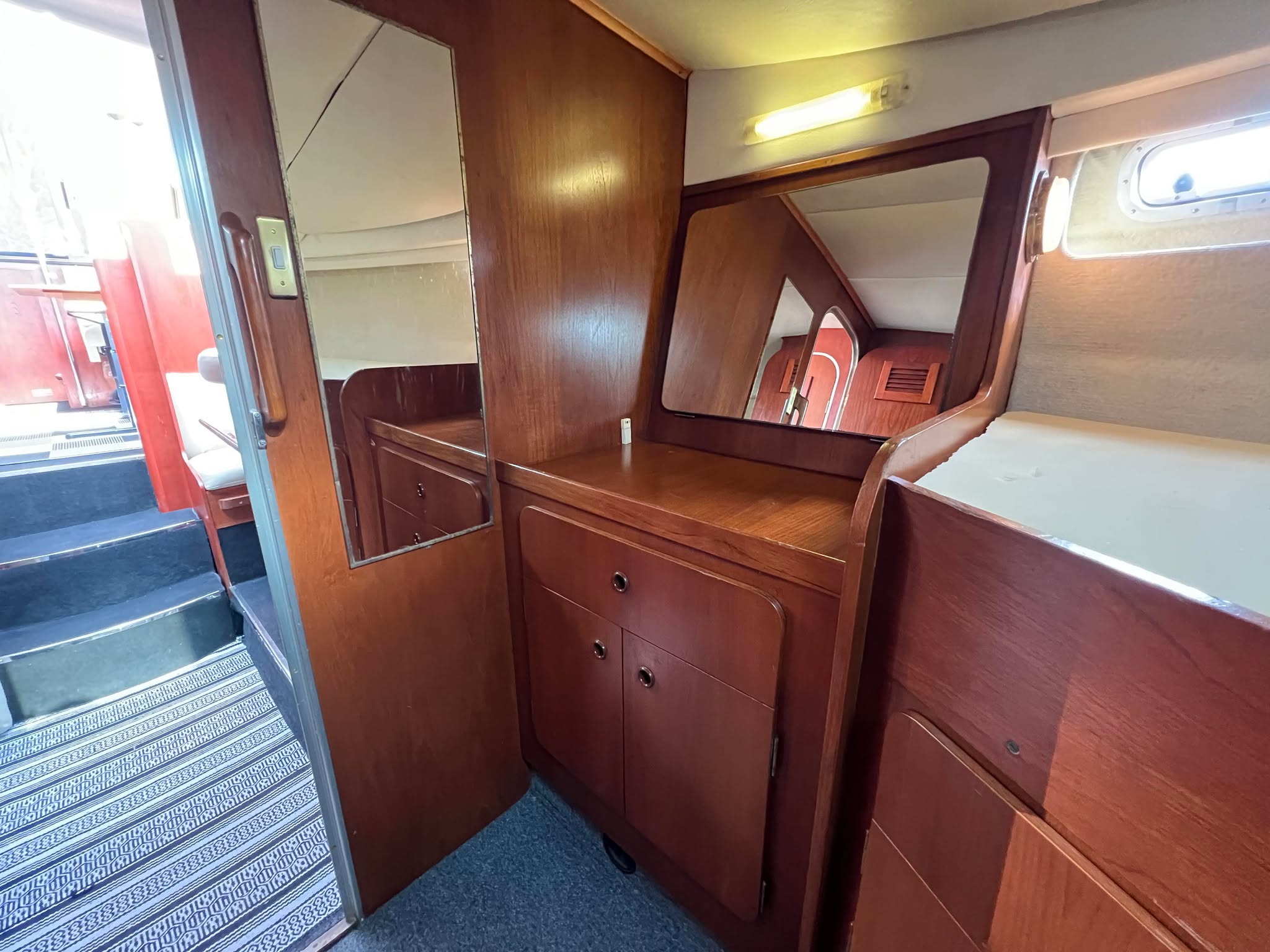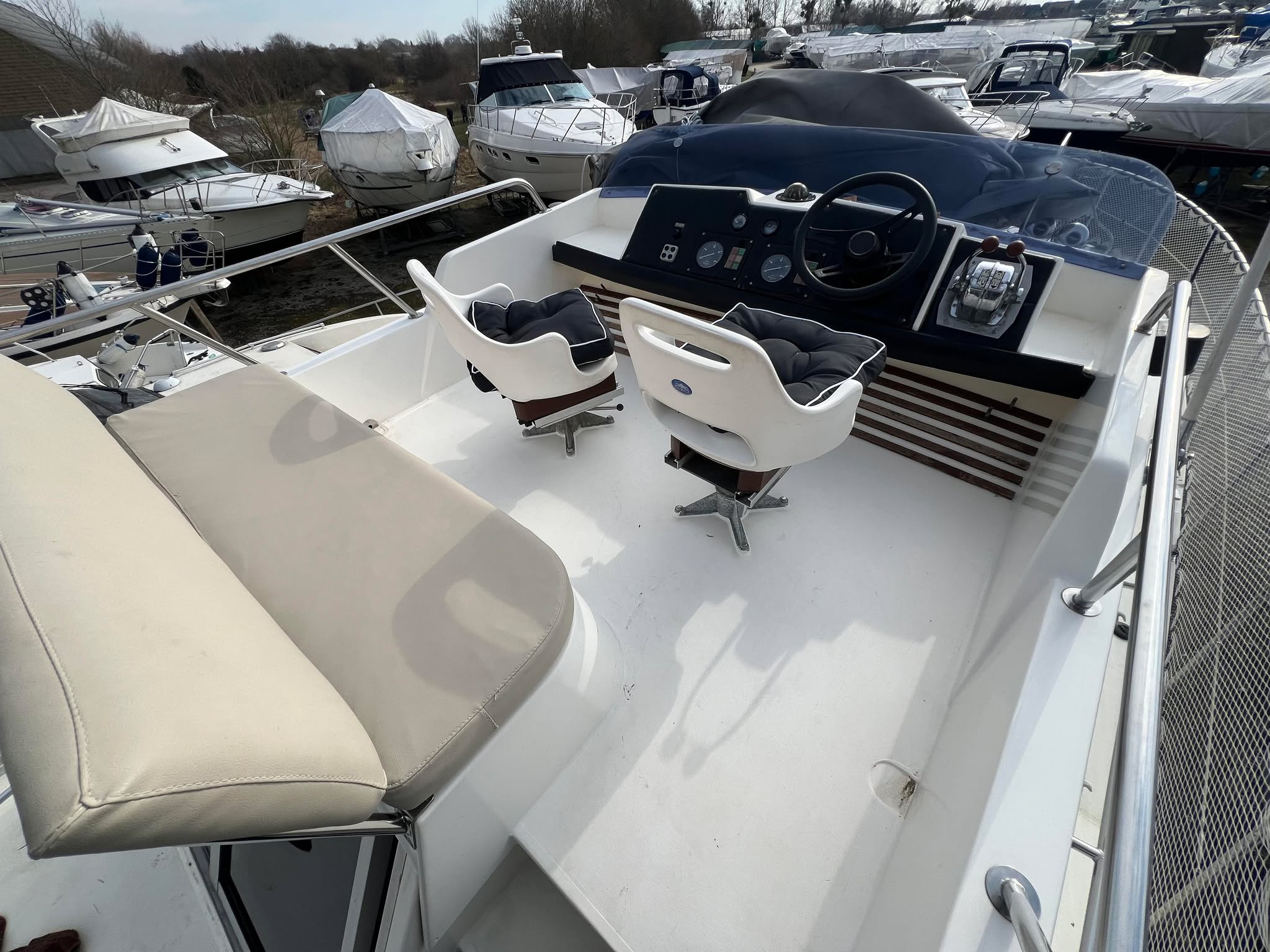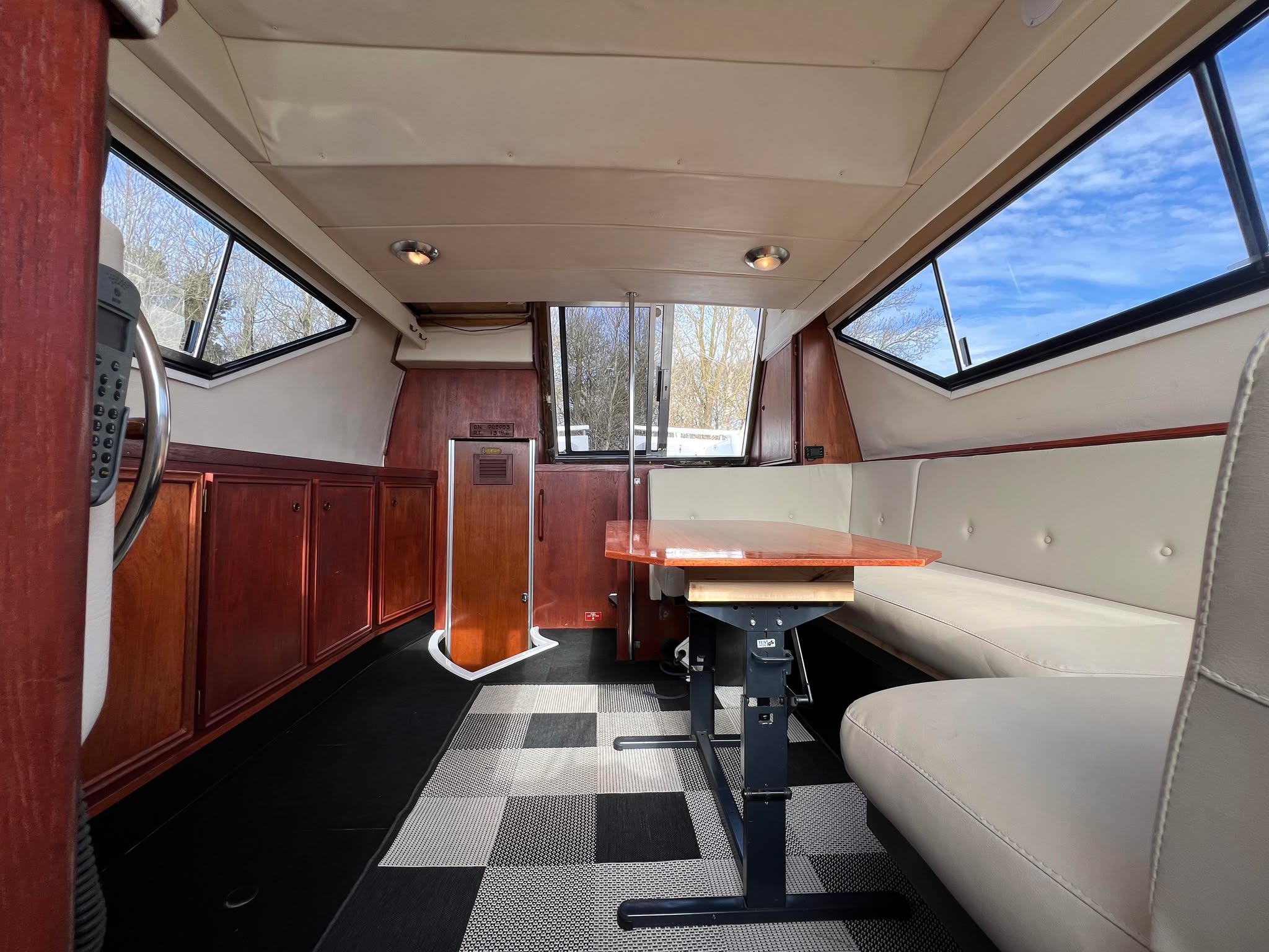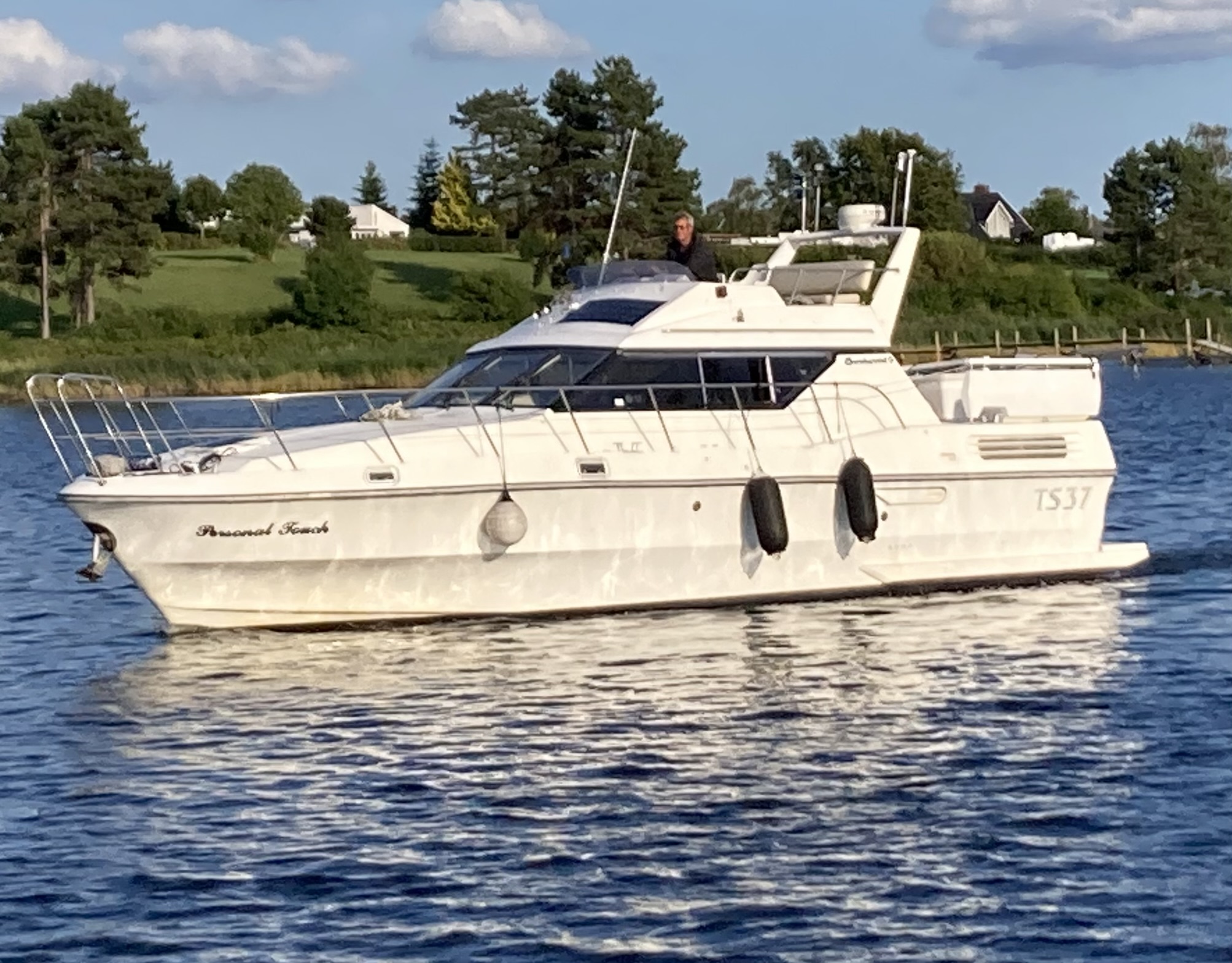 Birchwood TS 37 med Stort agterdæk med gode sidde pladser og nyere hynder til. opgang til flybridge hvor man kan har komplet instrumentering. Fra agtertdæk er der nedgang til en rummelig salon, stor sofa arrangement med pæne hynder, der hurtigt kan gøres til en dobbelt soveplads. Fra Salon ned til Pantry afdelingen med stor spise plads der også kan omgøres til dobbelt soveplads, Toilet rum med brus med holdingtank.