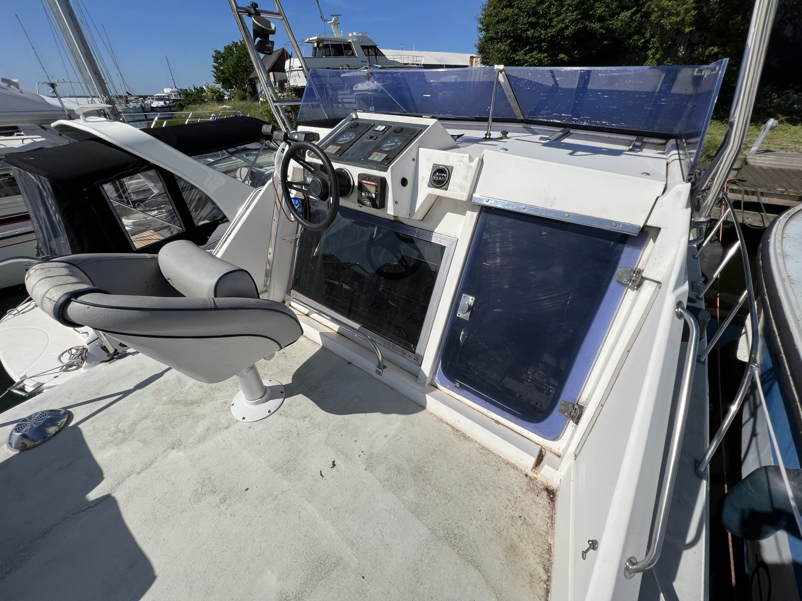 Birchwood 31 Motorbåd, båden trænger til en kærlig hånd på det kosmetiske, men er en velsejlende båd. så hvis man har hænderne skruet ordenligt på kan man virkelig få en rigtig fed motorbåd til en fornuftig penge, den har en størrelse der gør det muligt også og bruge som et lille sommerhus. Ligger i Brøndby havn ved Dansk sejl og motor Aps.