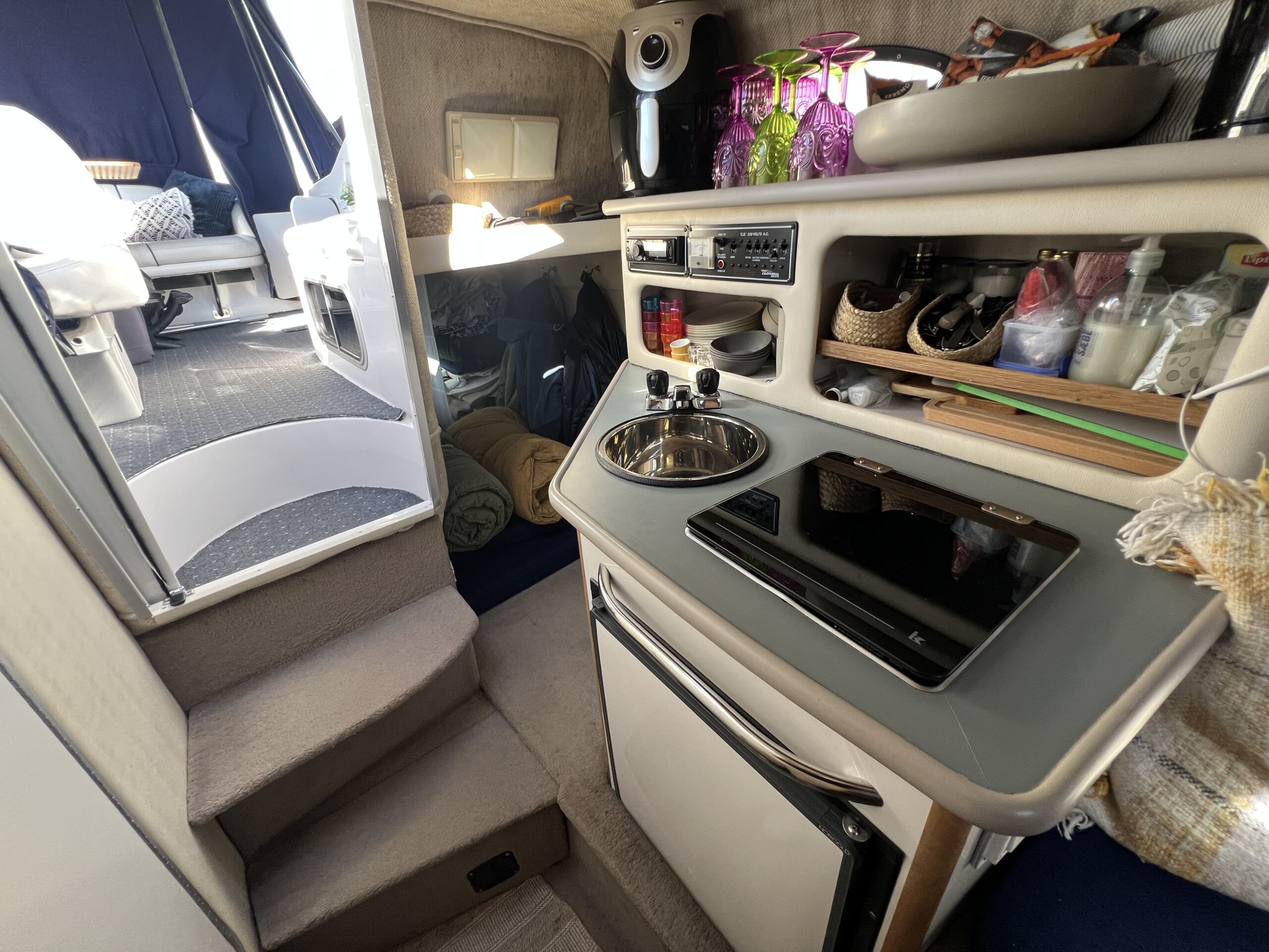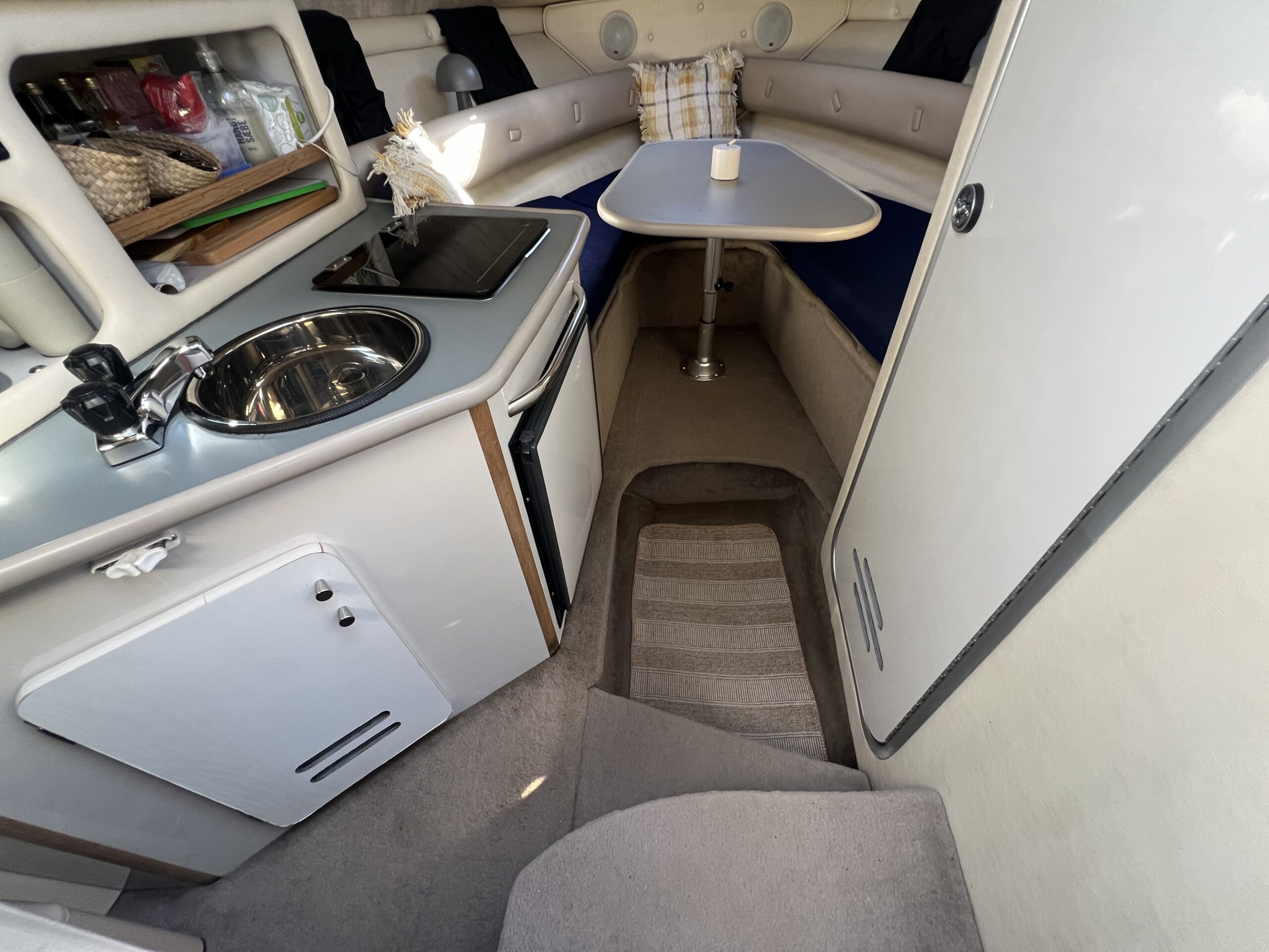 Kahytten er rummelig med et lækkert siddeområde, der kan omdannes til en dobbeltseng. Der er også en separat kahyt under cockpittet med ekstra soveplads. Køkkenet inkluderer en vask, komfur og køleskab, så du kan lave mad ombord.