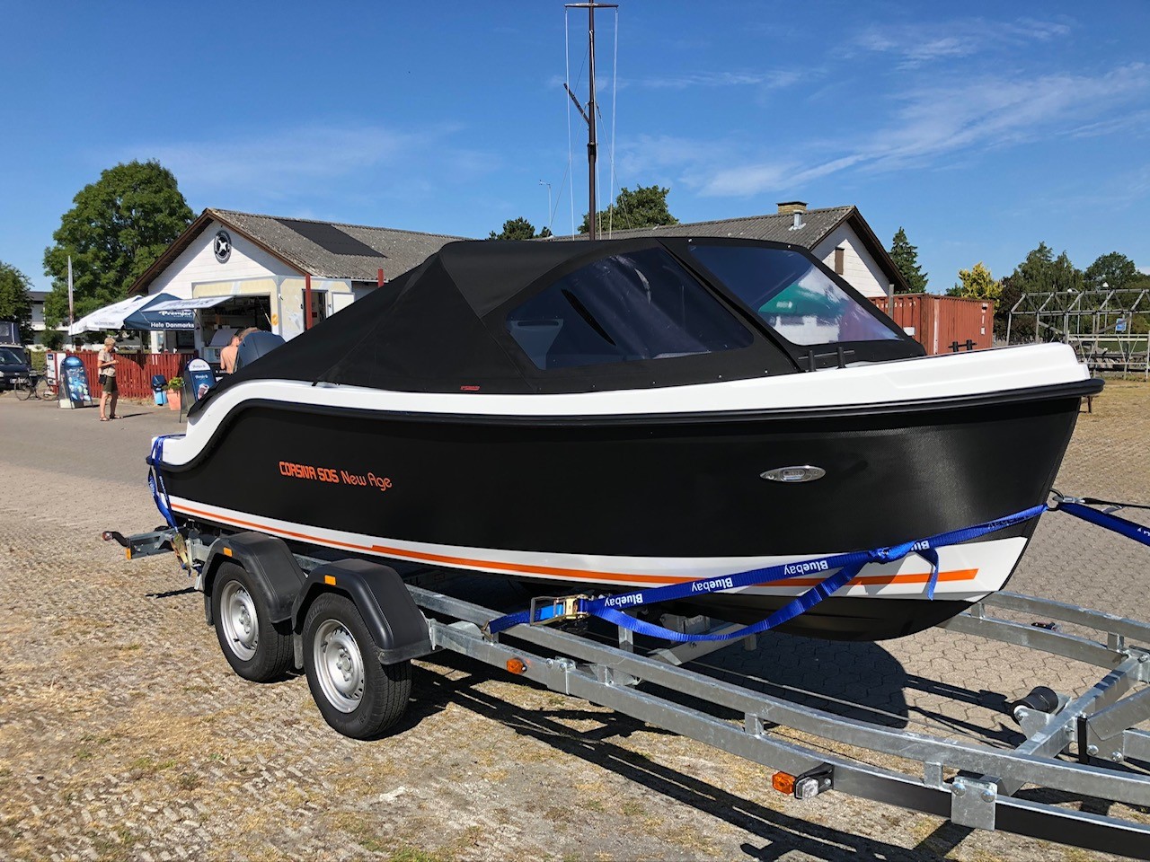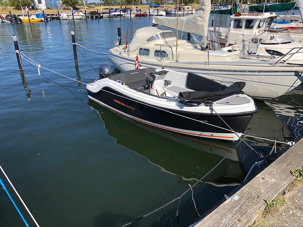 Næsten ny Corsiva 505 New Age Carbon er den Nye model fra Corsiva. Cosiva Tender-model med den store superstærke og økonomiske 40HK og alt i lækkert udstyr. Dejlig familievenlig motorbåd til Københavns kanaler, en tur på søen eller op langs kysten. Velindrettet med dejlig stor sofa i front og bordløsning. Mulighed for at omgøre sofaen til stor solseng eller med mulighed for overnatning. Agter yderligere siddegruppe hvorfra båden sejles. agter solseng med adgang til badeplatform og badestige. Båden er monteret med stor kalecheløsning, Custom Grey i cockpit og agter, fine deluxehynder, LED lys, Carbon på skrog, bundbehandlet og meget meget mere – alt sammen noget der oven i basisprisen på en ny gør dette til et rigtigt fint køb for en næsten ny båd NYPRIS inkl ekstra uudstyr og større motor tæt på 200.000 kr.