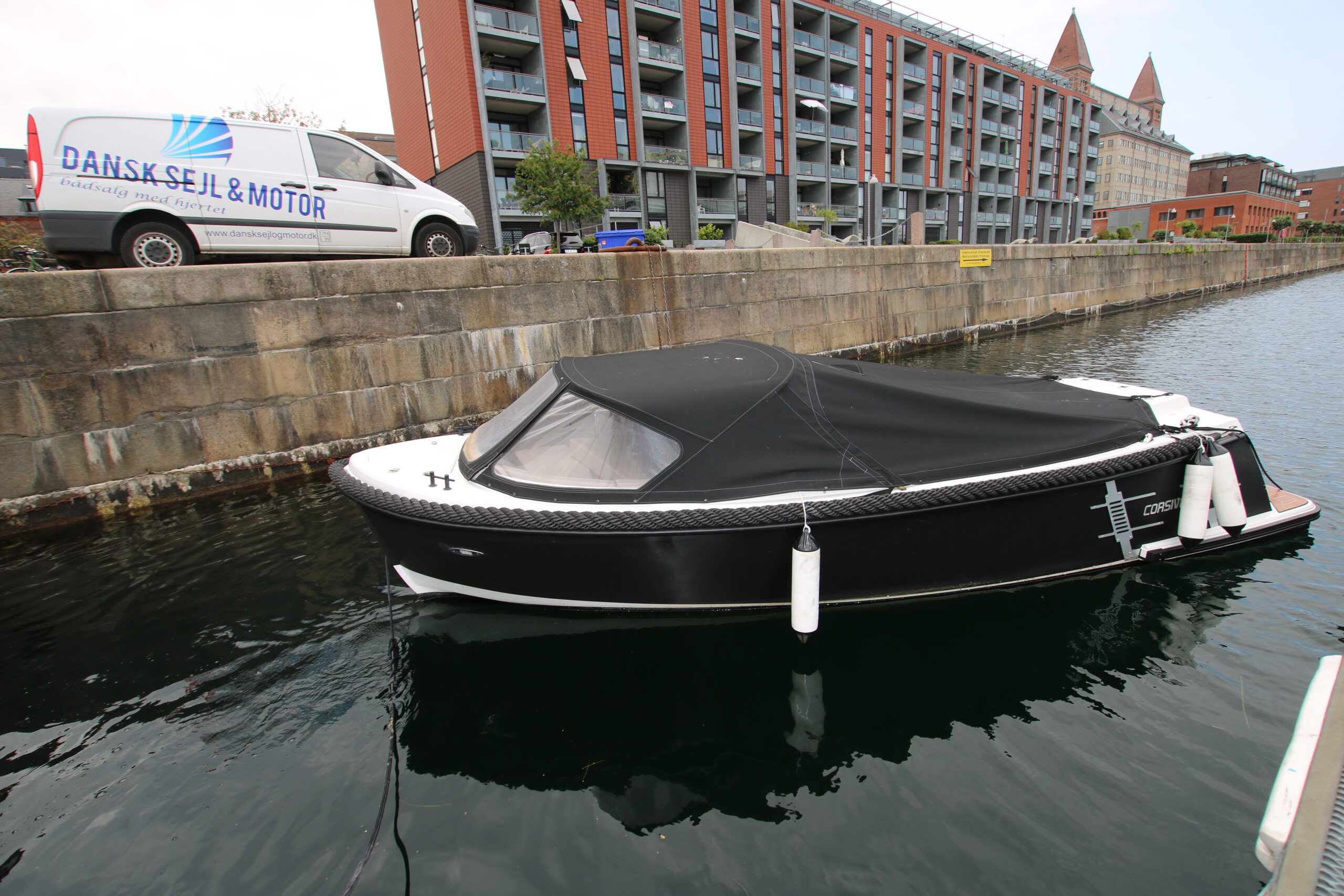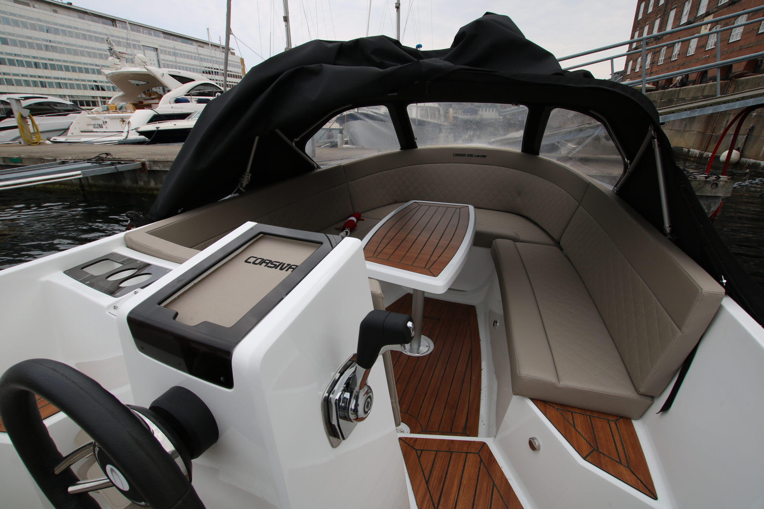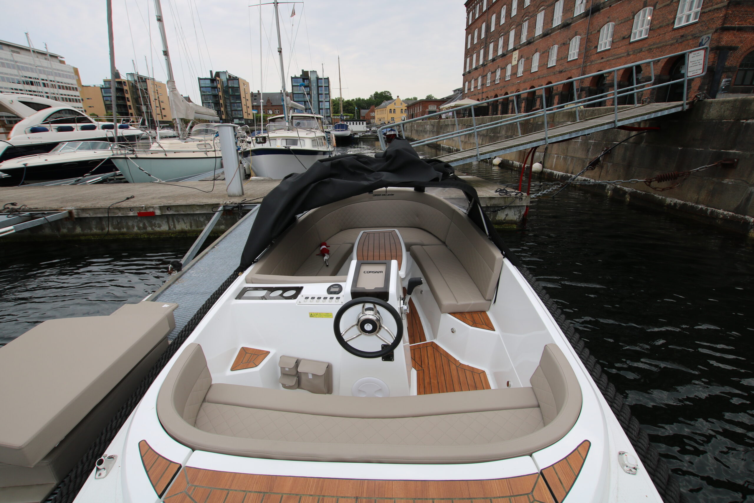 Corsiva 595 Tender er den Nye model fra Corsiva. DK mest solgte Cosiva Tender-model med den store superstærke og økonomiske 40HK og alt i lækkert udstyr. Dejlig familievenlig motorbåd til Københavns kanaler, en tur på søen eller op langs kysten. Velindrettet med dejlig stor sofa i front og bordløsning. Mulighed for at omgøre sofaen til stor solseng eller med mulighed for overnatning. Agter yderligere siddegruppe med plads til 3+ personer hvorfra båden sejles. Adgang agter til badeplatform og badestige. Båden er monteret med stor kalecheløsning, teaklook i cockpit og agter, fine deluxehynder, LED lys, Kewlarlook på skrog, hvidt inderskrog, bundbehandlet og meget meget mere – alt sammen noget der oven i basisprisen på en ny gør dette til et rigtigt fint køb.
