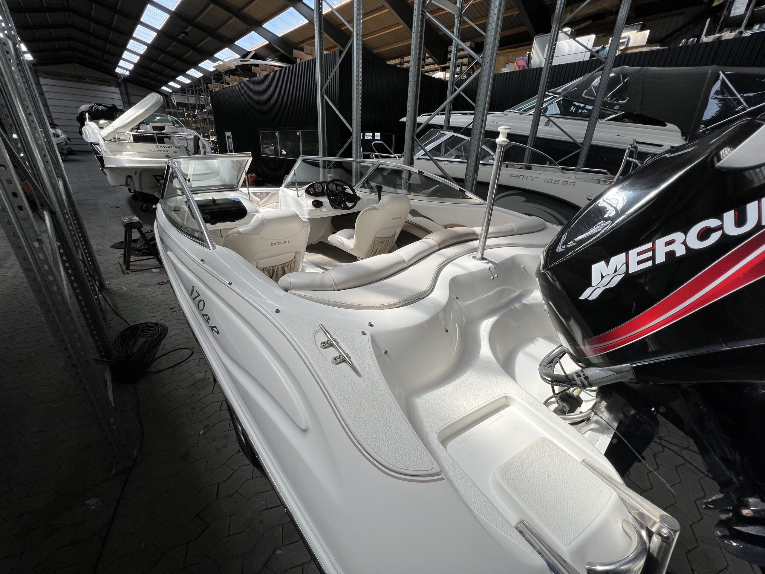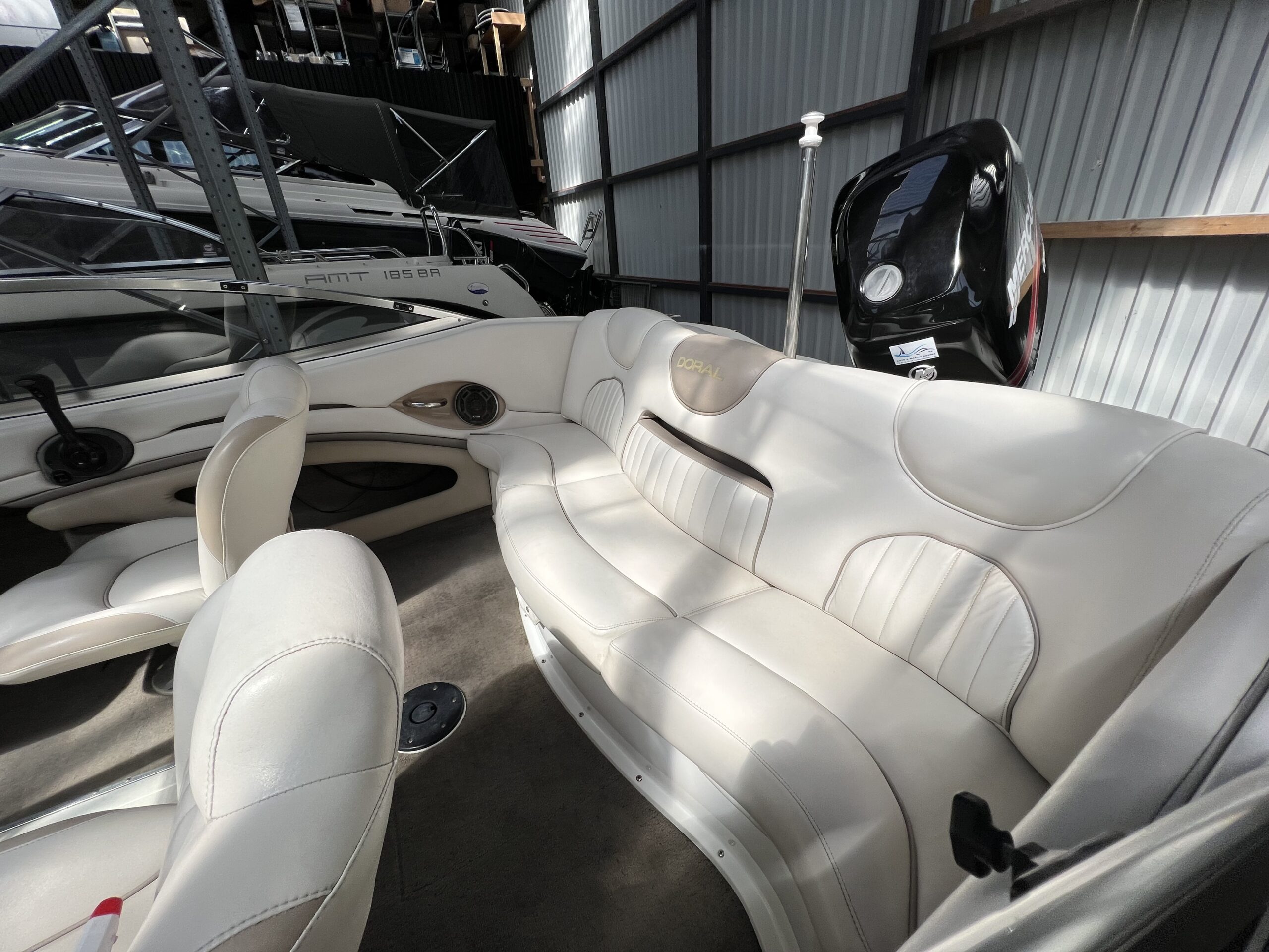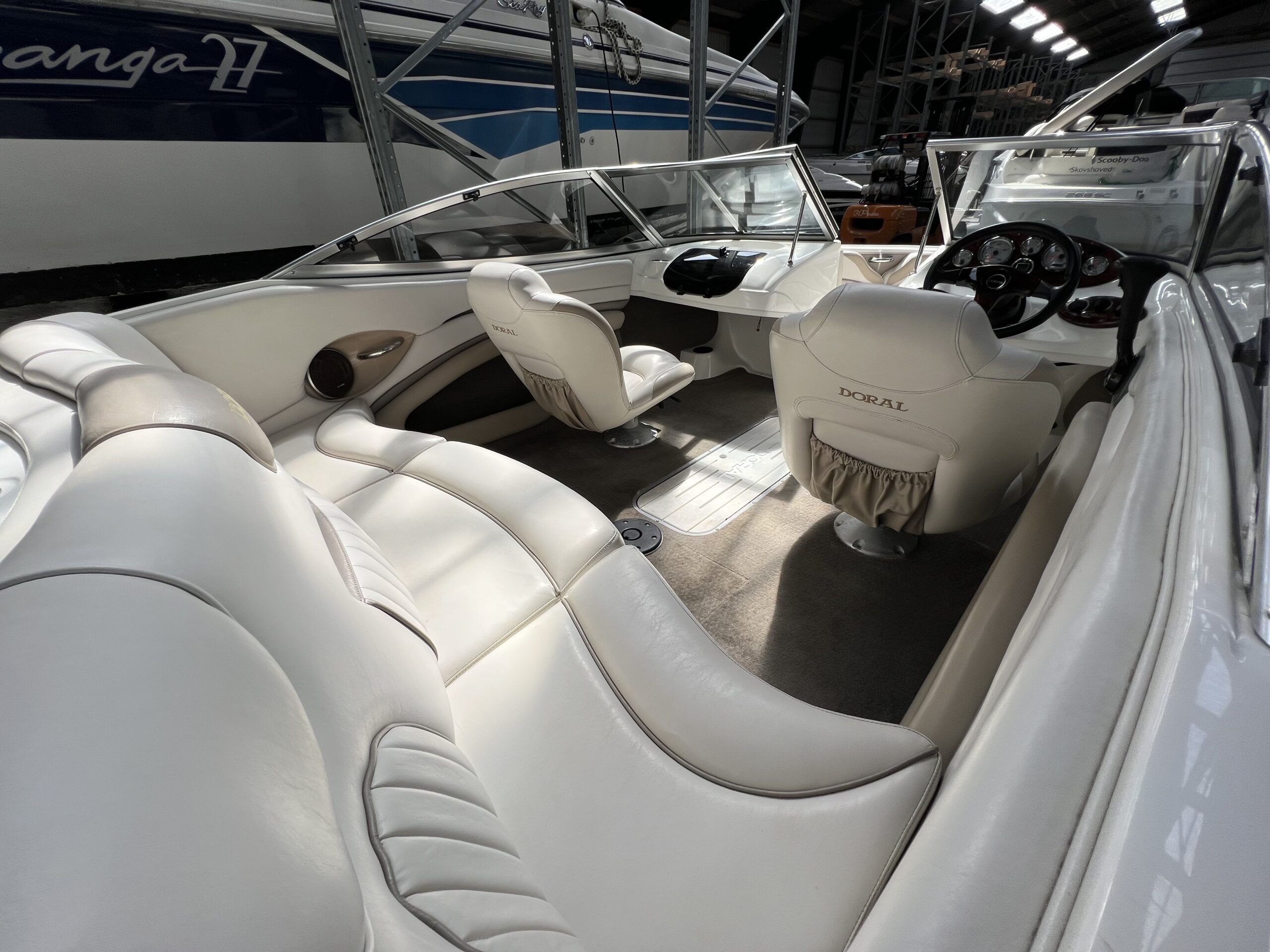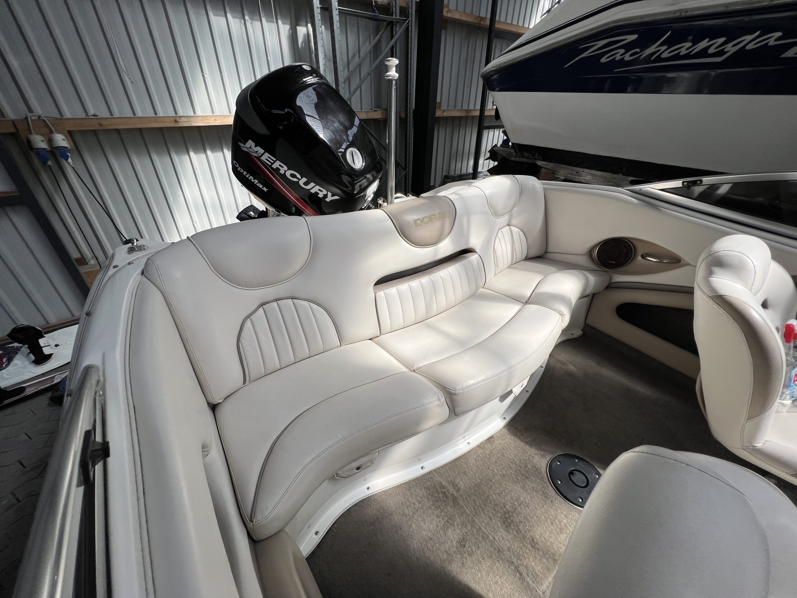 Bowrider fra Doral årg. 2004 – Fint sæt båd og trailer. Dejligt cockpit med to pilotstole og stor sofa, Gennemgang via vindspejl til yderlige fine siddepladser i front. Perfekt til vandski, tube eller familietur på vandet. Monteret med en 115 hk Mercury så du kan trække flere personer på baderingen uden problemer. Trailer medfølger