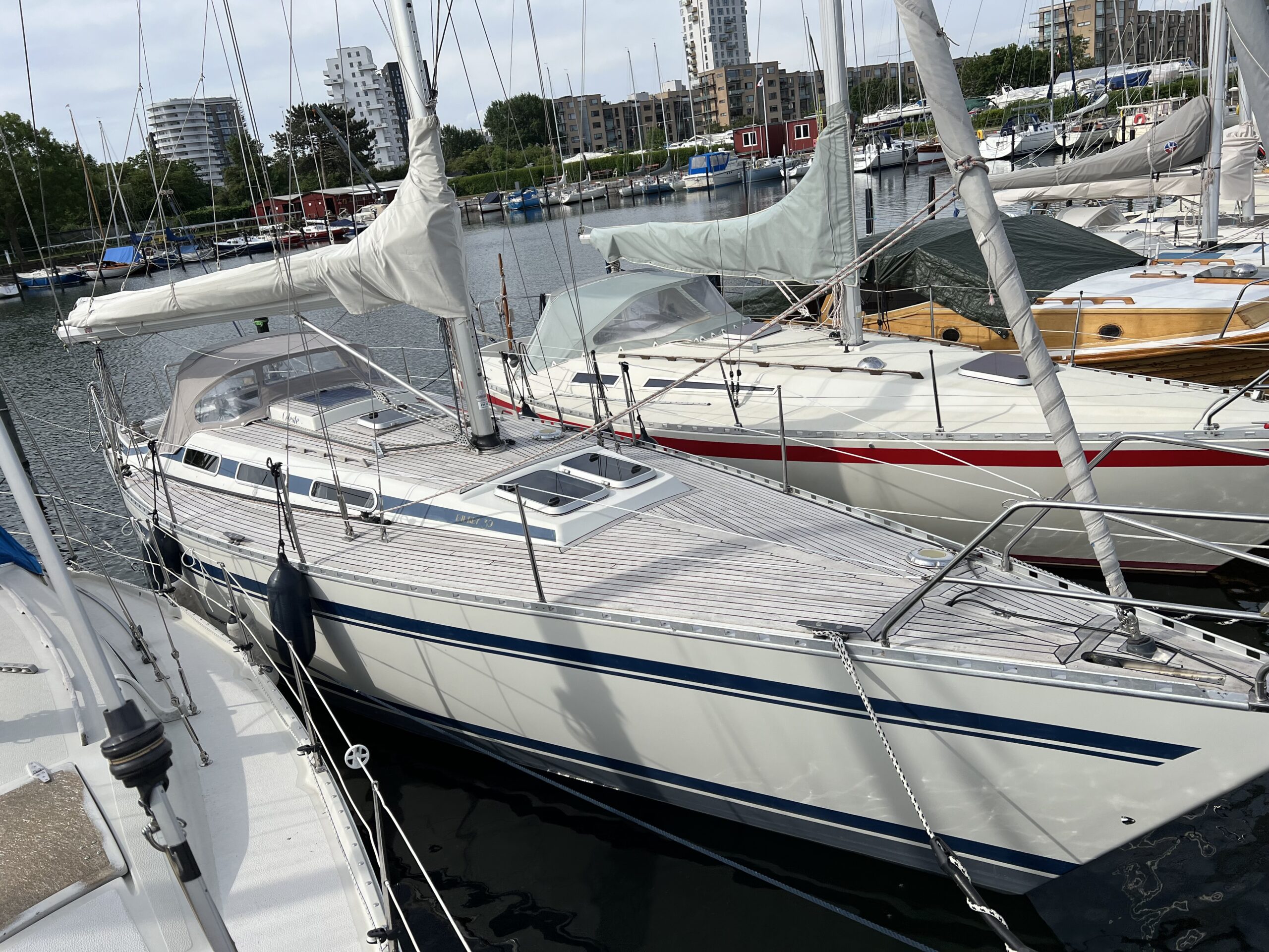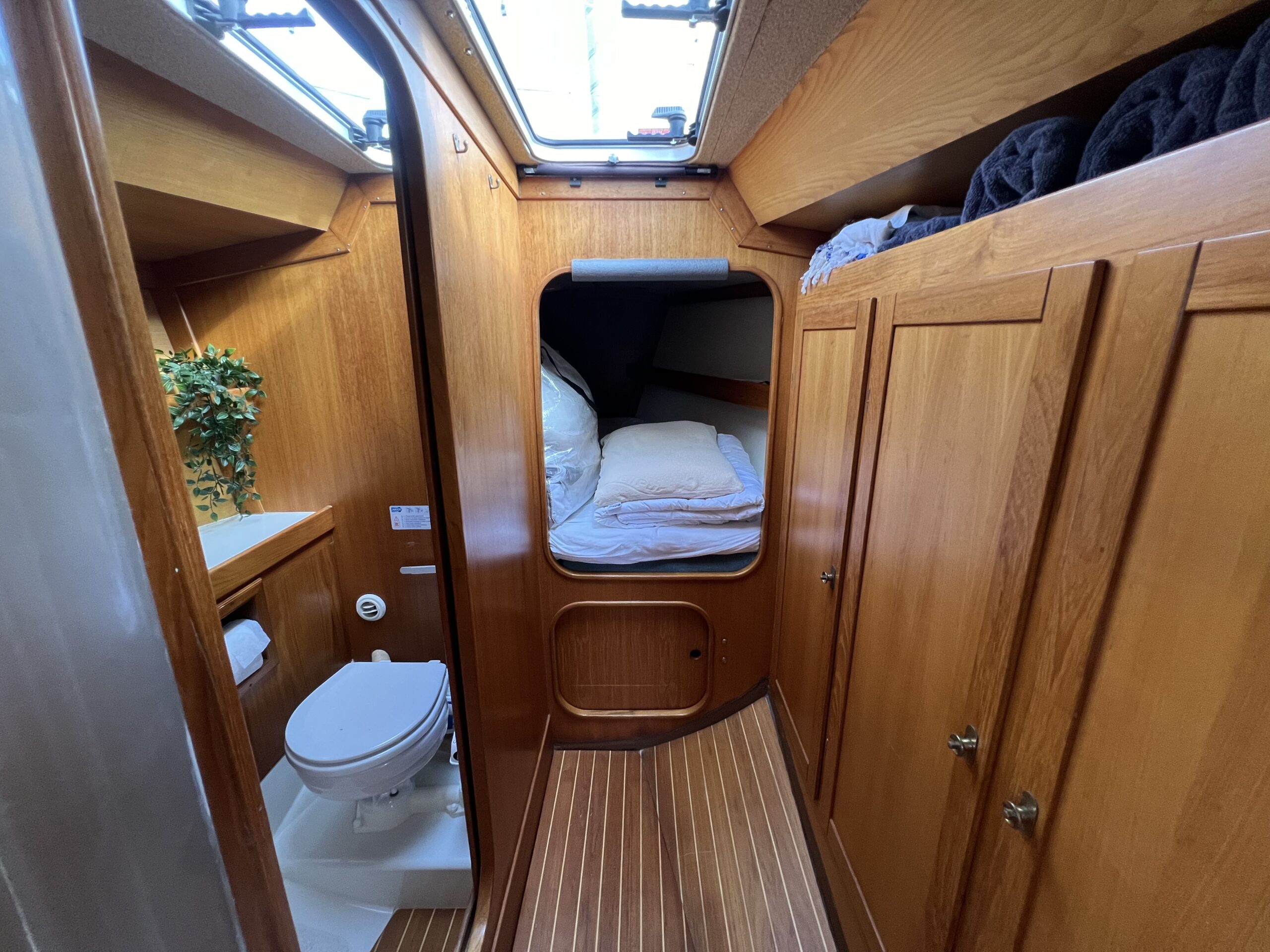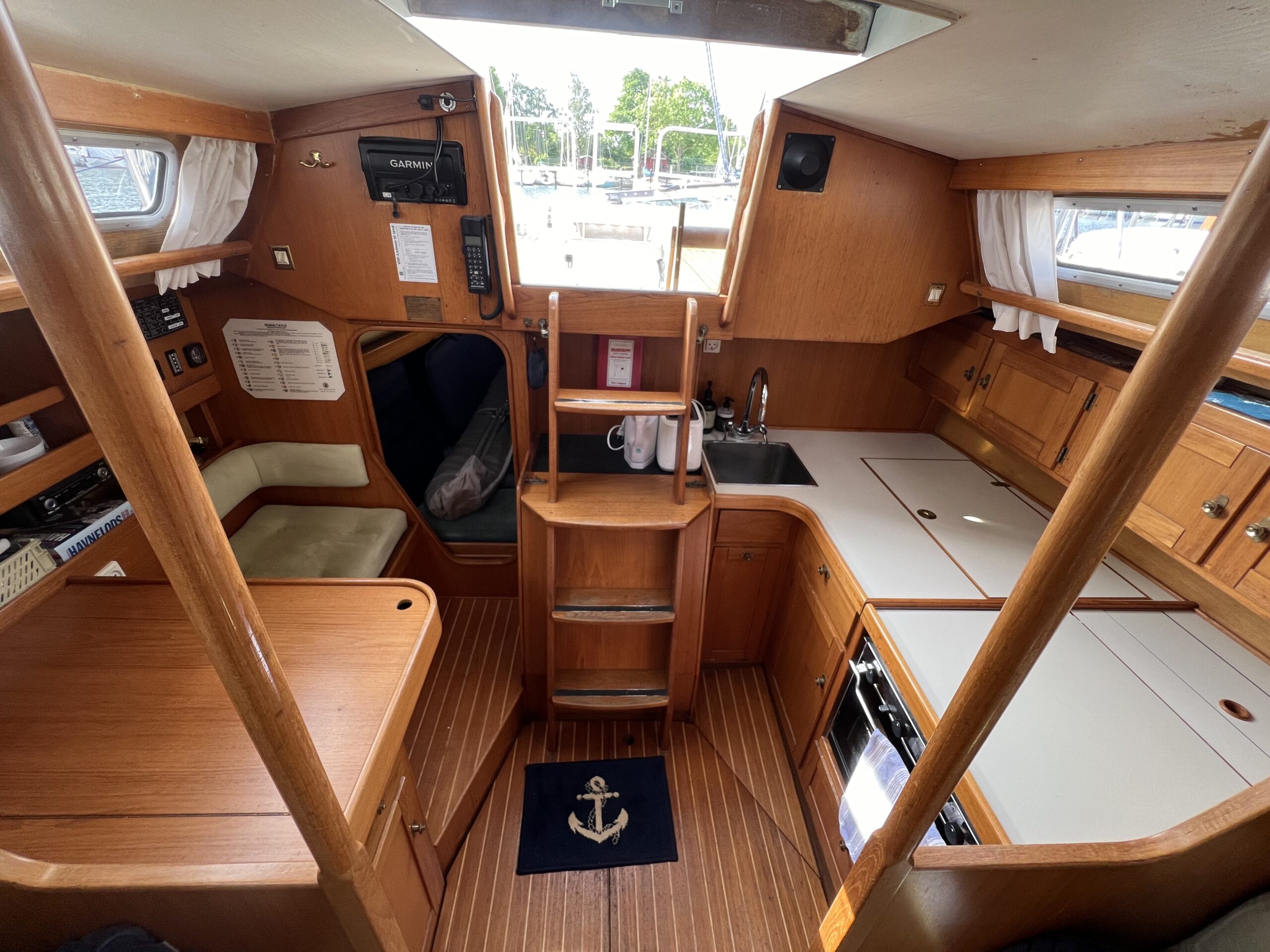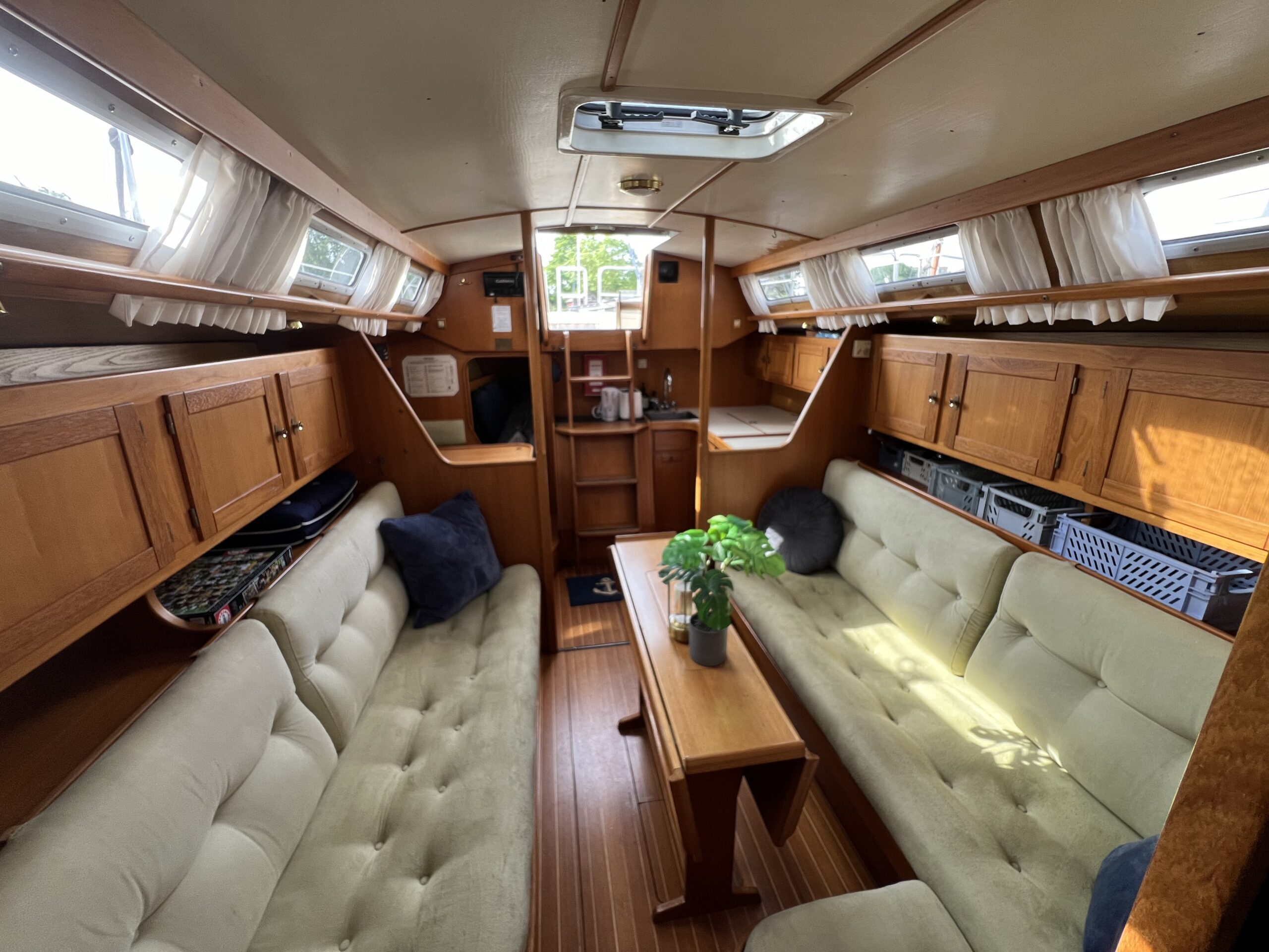 Nedgang til virkelig charmerende og hyggelig salon med pantrysektion og modsat side kortbordsløsning. agter køjer , Salon med stor sofagruppe hvor den helt store familie finder plads omkring bordet eller omgjort giver yderligere 2 køjepladser. Fremme yderligere kahyt med dobbeltkøje. Toiletrum med vaskemodul og skabsløsning. En virkelig fin og ikke mindst flot aptering med mange fine detaljer og skabsløsninger. Båden har med tidligere ejer sejlet kapsejlads og har vundet Sjælland rundt, sejlenes stand er ok. Pænt teak dæk og hele vejen igennem pæn og velholdt.