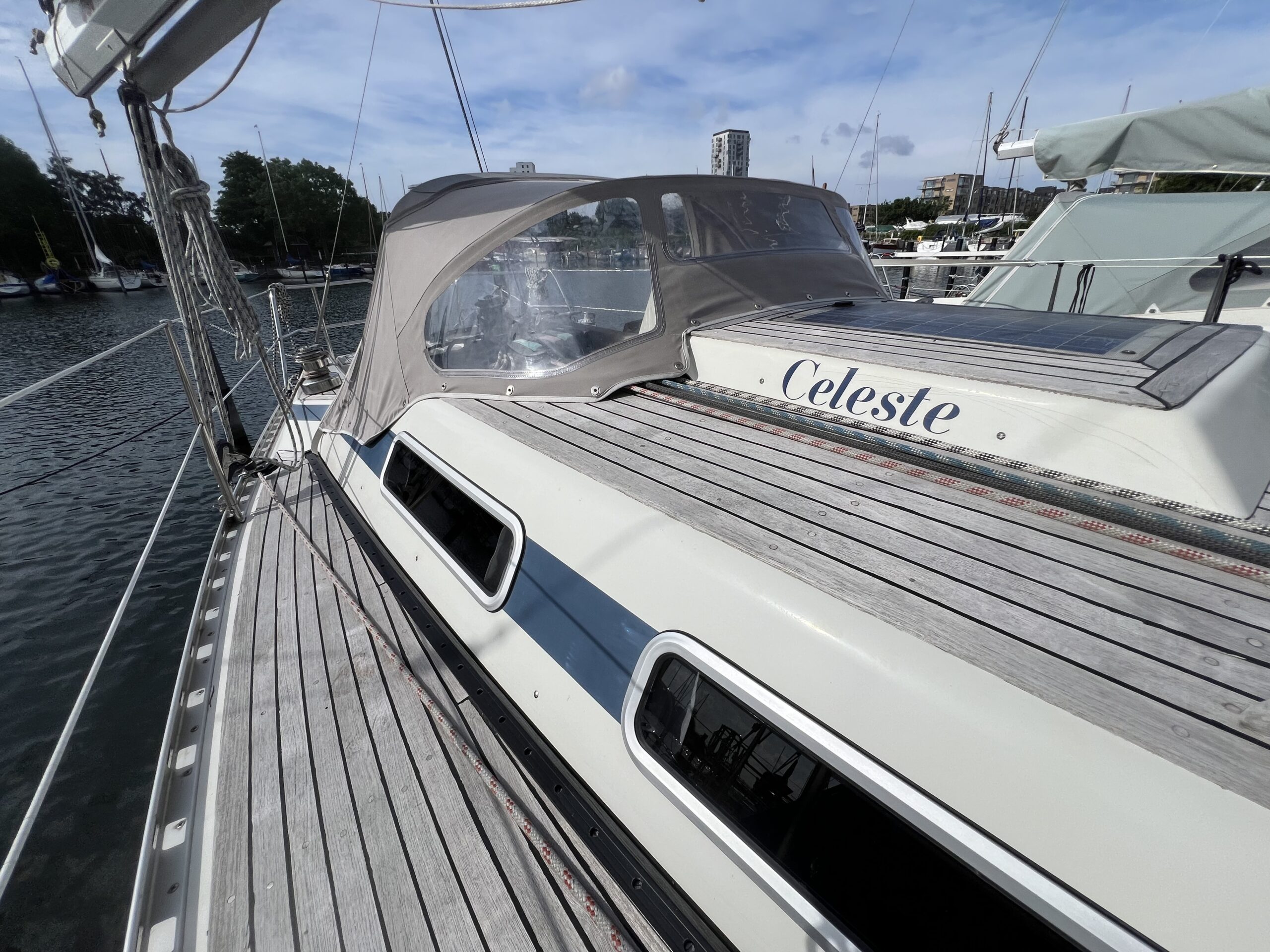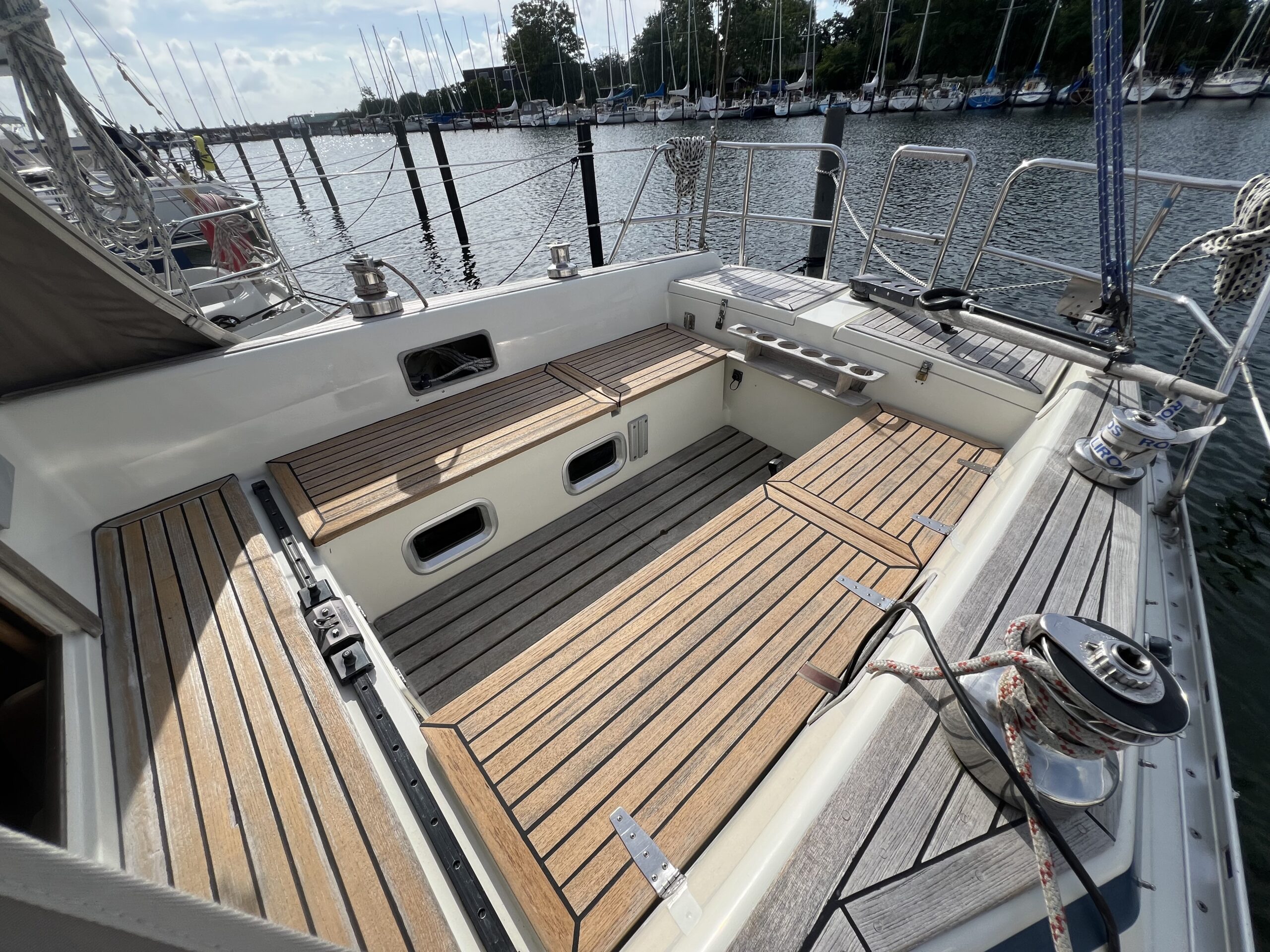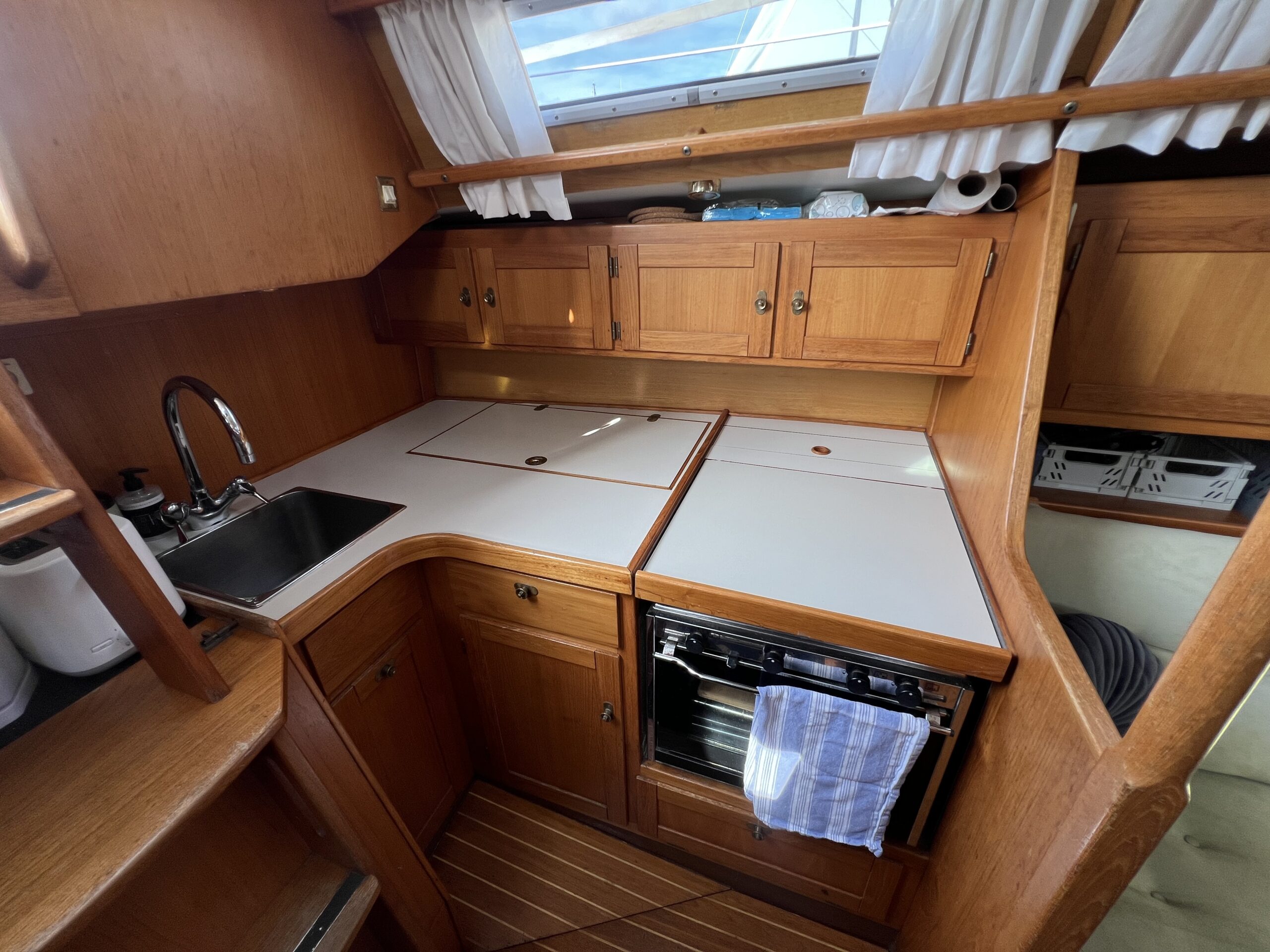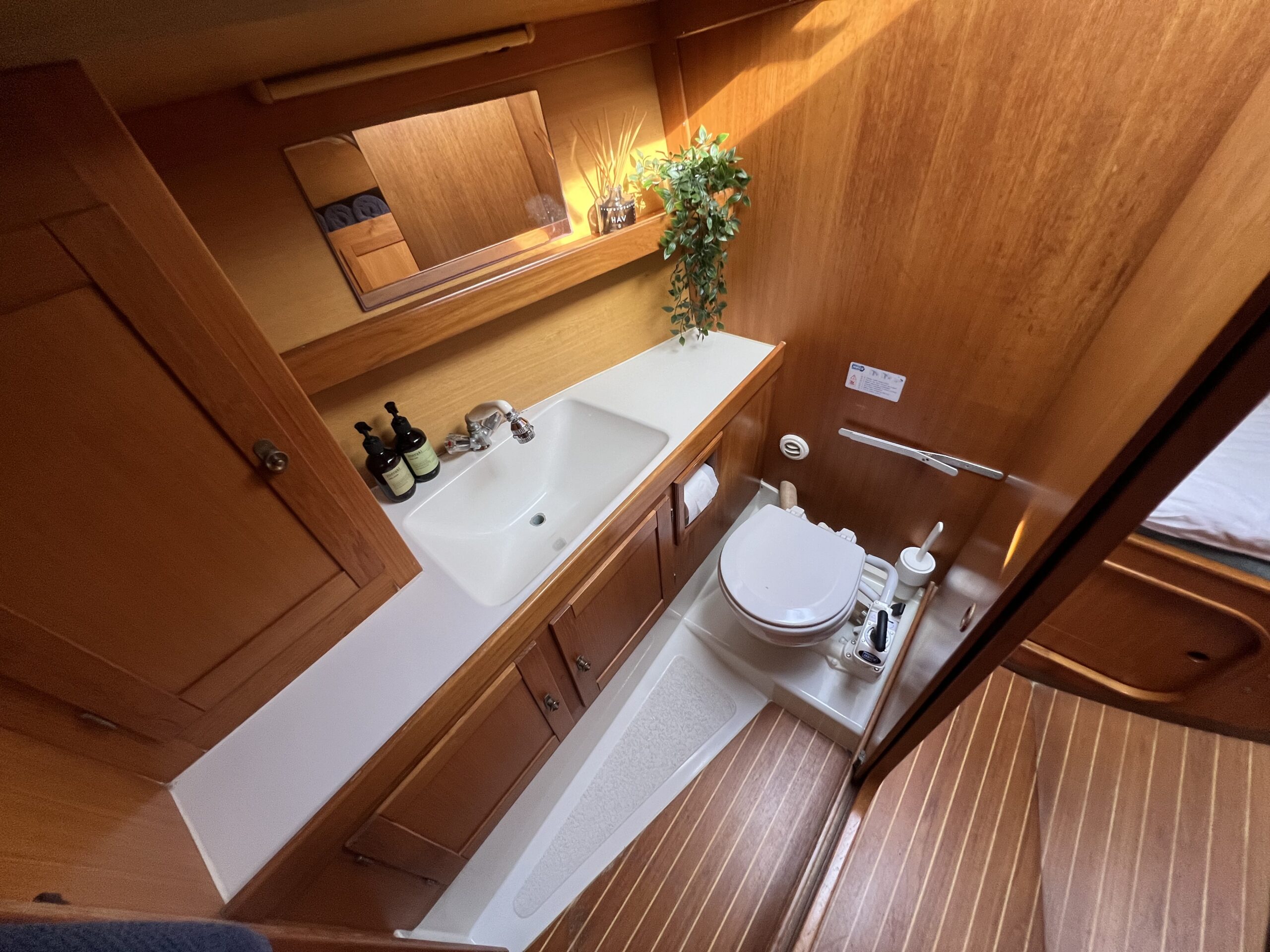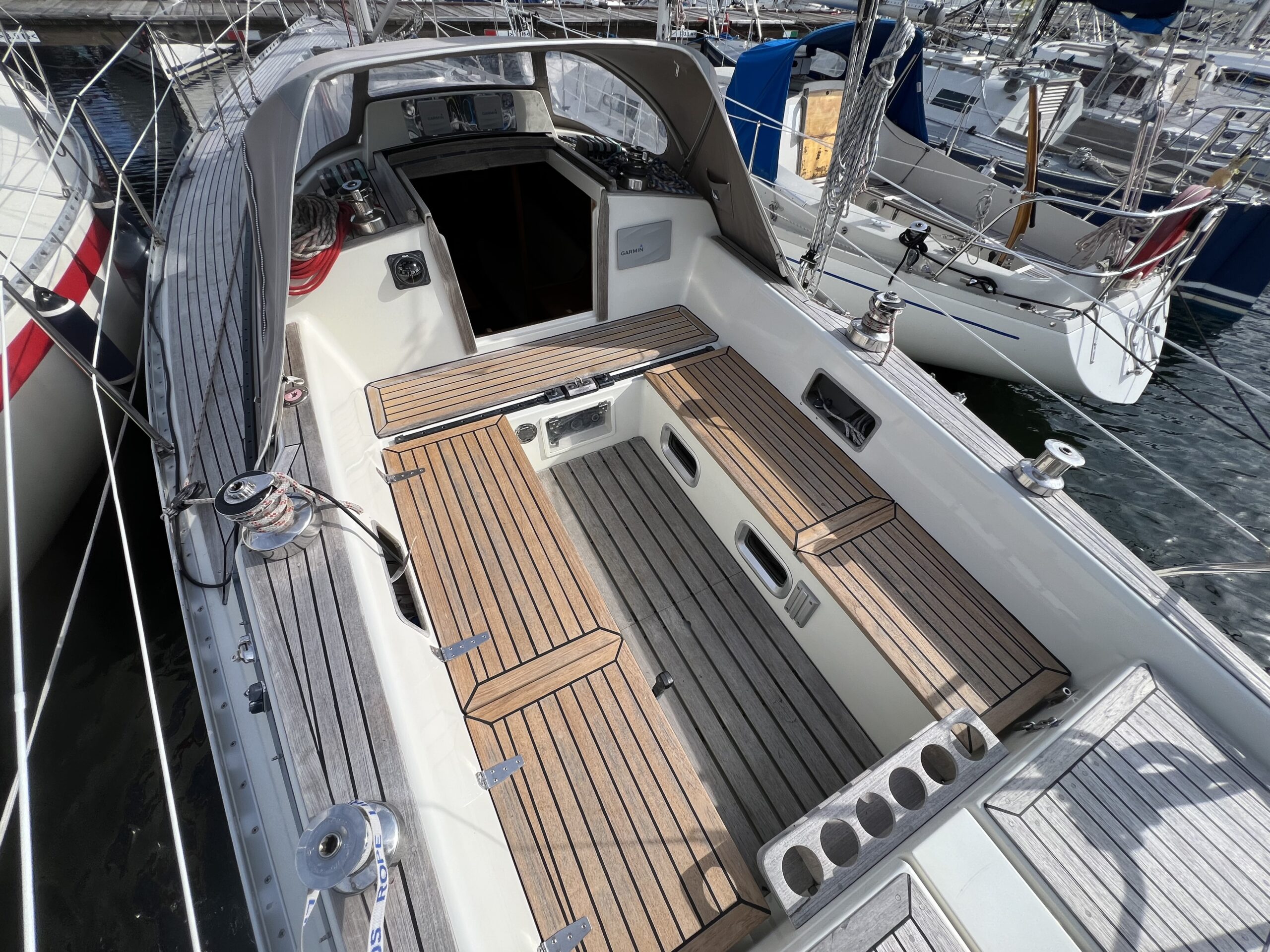 Nedgang til virkelig charmerende og hyggelig salon med pantrysektion og modsat side kortbordsløsning. agter køjer , Salon med stor sofagruppe hvor den helt store familie finder plads omkring bordet eller omgjort giver yderligere 2 køjepladser. Fremme yderligere kahyt med dobbeltkøje. Toiletrum med vaskemodul og skabsløsning. En virkelig fin og ikke mindst flot aptering med mange fine detaljer og skabsløsninger. Båden har med tidligere ejer sejlet kapsejlads og har vundet Sjælland rundt, sejlenes stand er ok. Pænt teak dæk og hele vejen igennem pæn og velholdt.