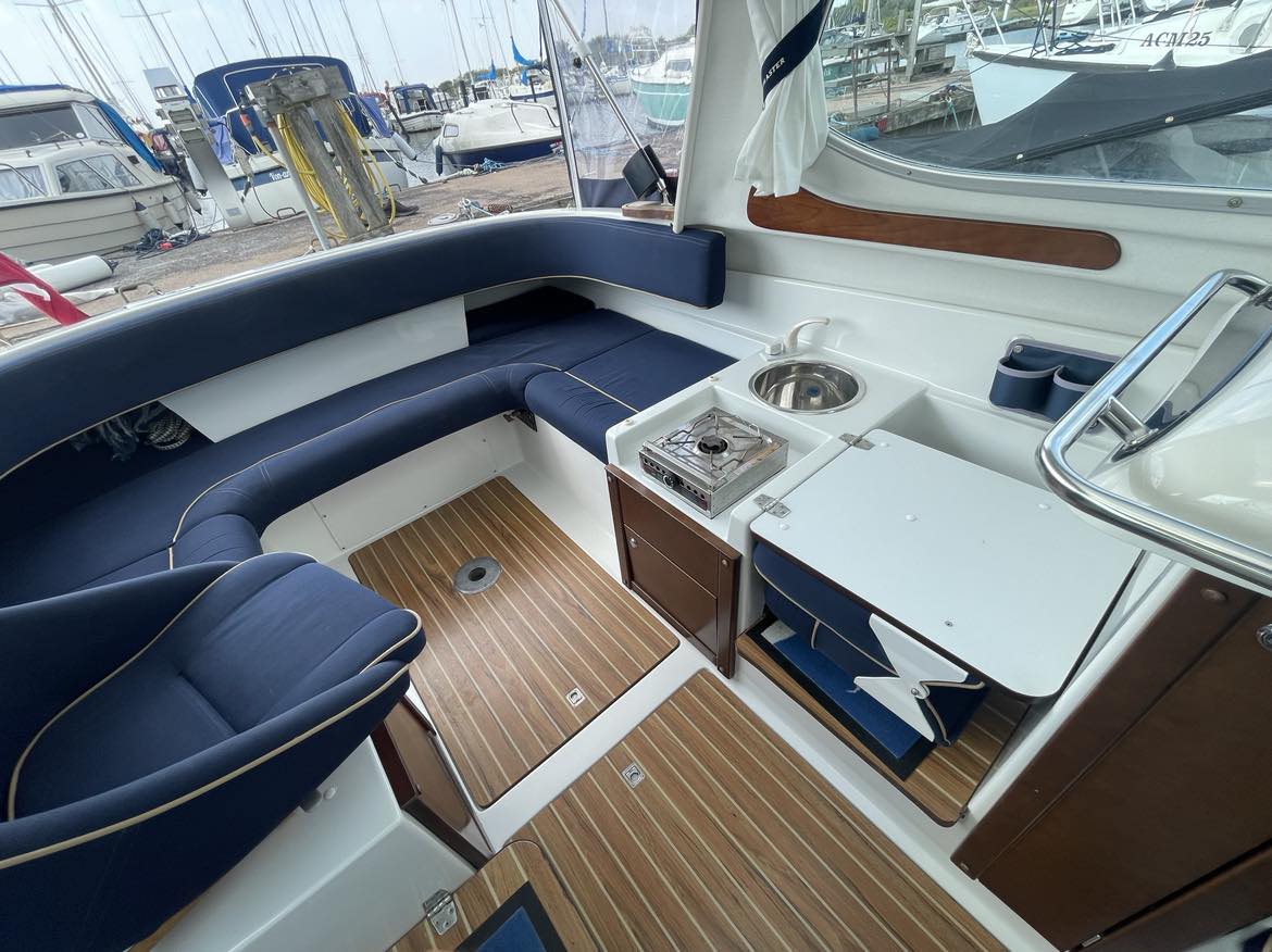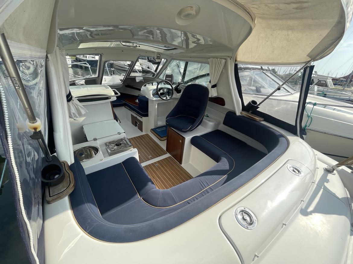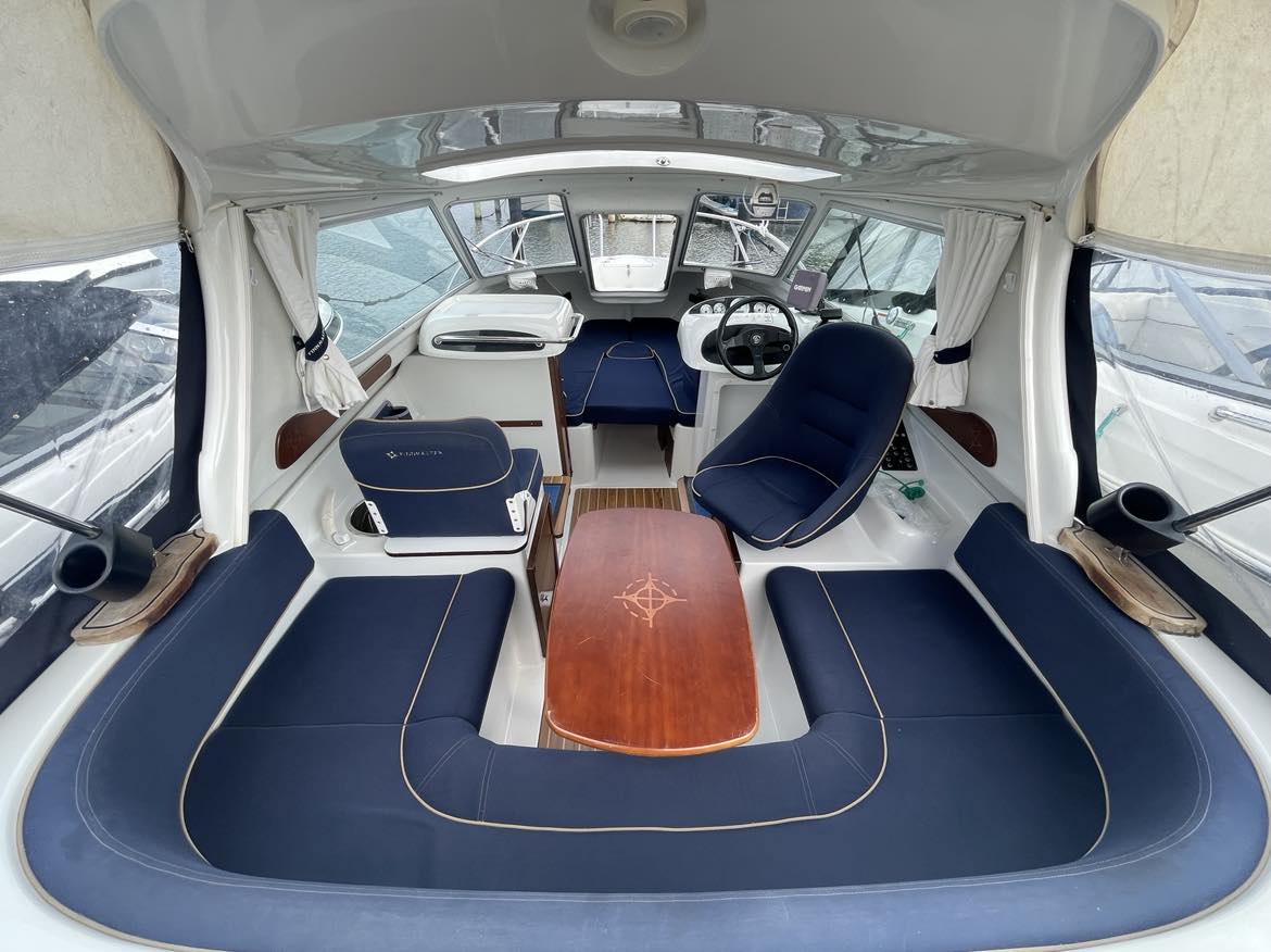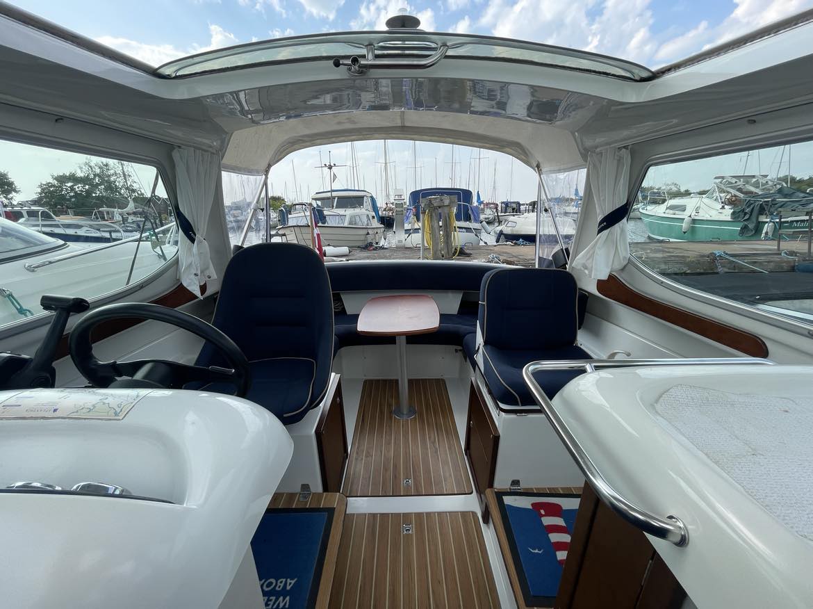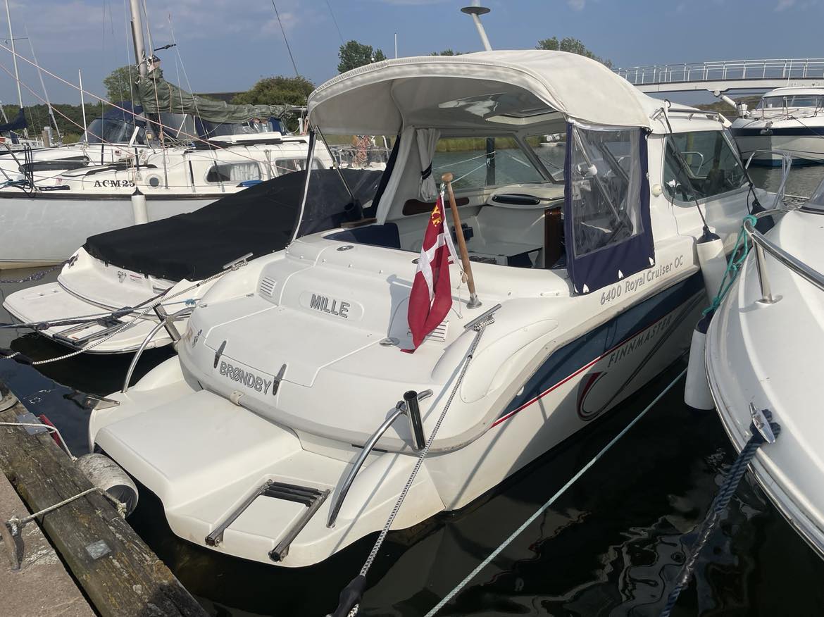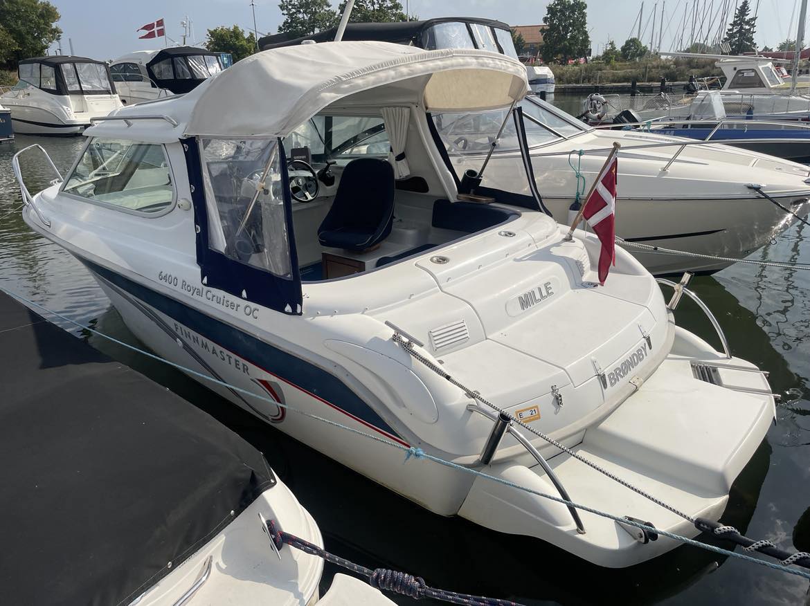 Velbygget familiebåd i bedste materialer fra Finske Finnmaster – søstærk og velsejlende med stærk dieselmaskine. Lækker kabinebåd til familietur og med mulighed for overnatning. Stort cockpit med U-sofa og med mulighed for stor solplads/overnatningsmulighed. Lille praktisk pantrysektion med kogeblus og vask med ferskvand. To pilotstole til hr og fru Finnmaster under det store tag – dejlig i læ så det ikke kommer vind og regn i håret. Mulighed for at åbne op via skydetaget så solen kan skinne ned i cockpittet. Fremme V-køje med plads for to voksne og praktisk lille “træk-ud” toiletløsning. Adgang via dørløsning til front hvor turen kan nydes, eller for at lette adgang til cockpit i havn – virkelig praktisk – og ikke noget med at balancerer usikkert på siden. Dejlig stor badeplatform med badestige. Stærk Volvo Penta D3 med 130 stærke dieselheste giver god fart og ligeledes fin økonomi.