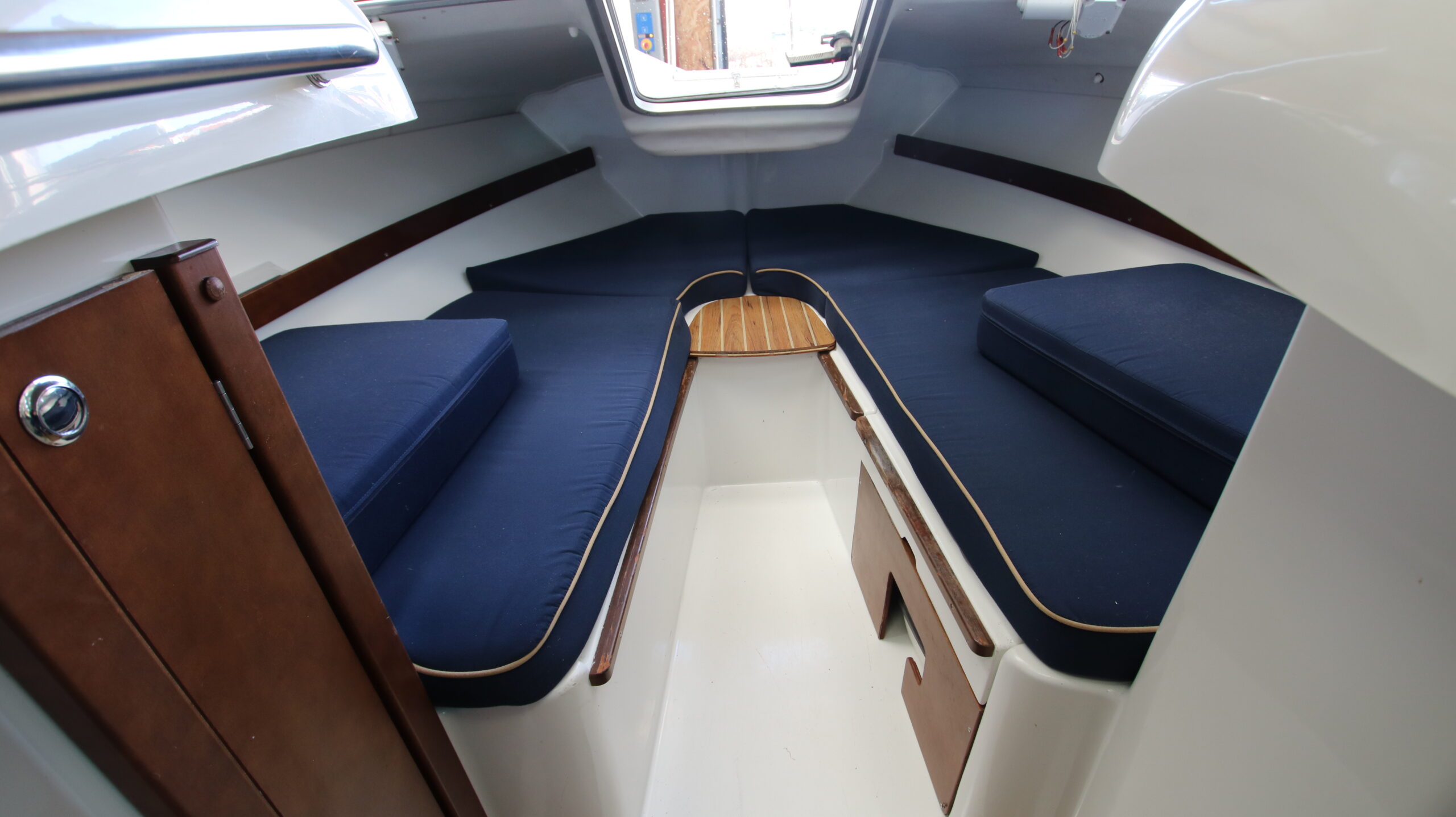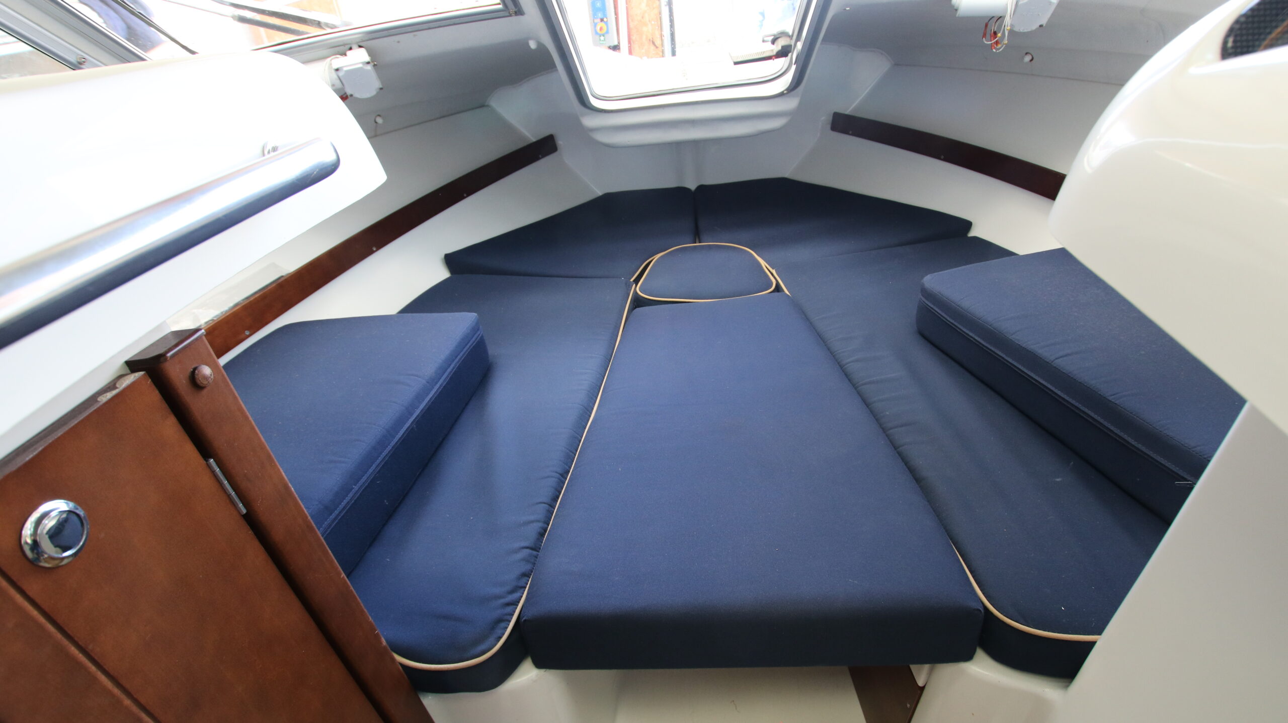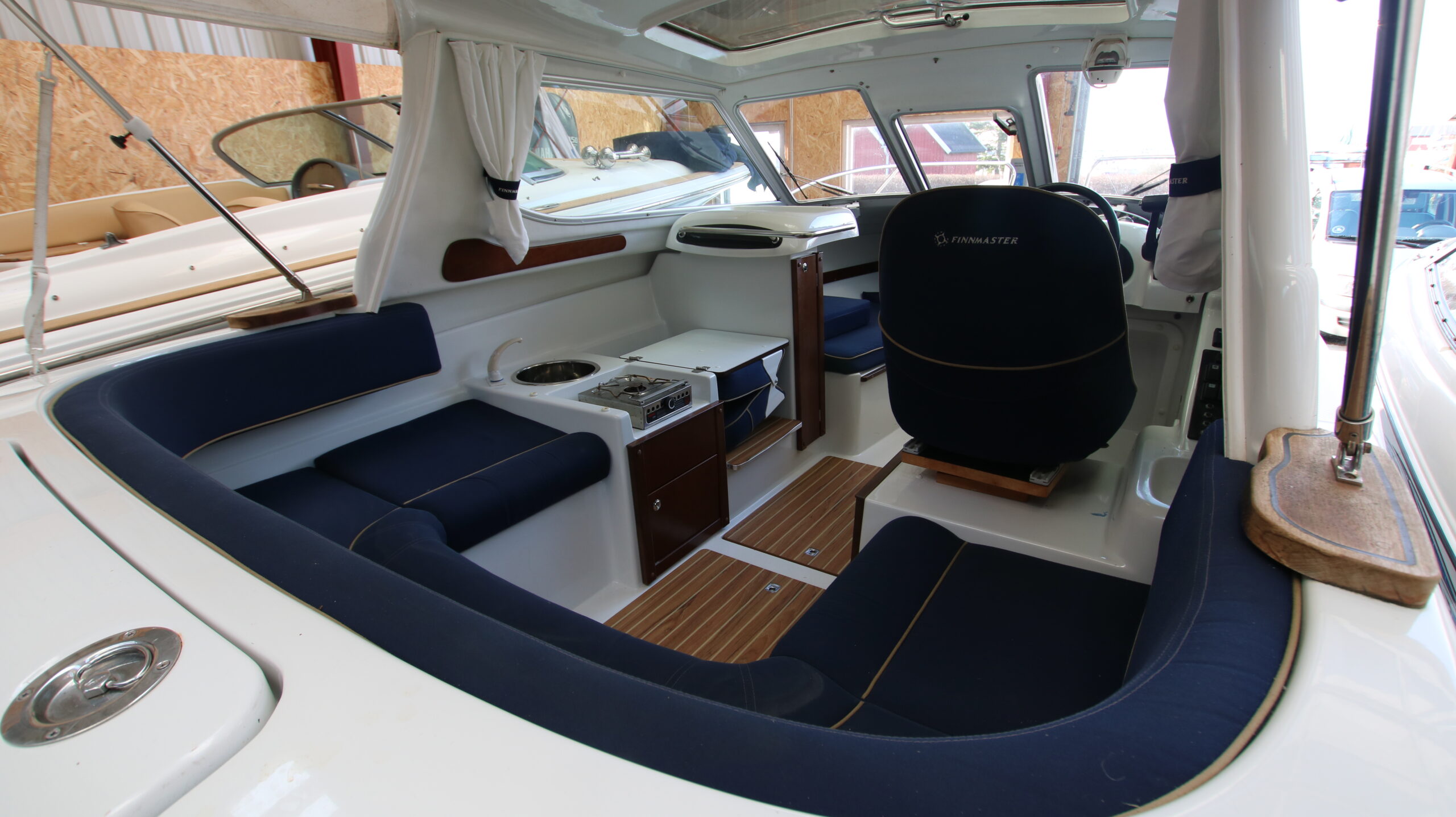 Velbygget familiebåd i bedste materialer fra Finske Finnmaster – søstærk og velsejlende med stærk dieselmaskine. Lækker kabinebåd til familietur og med mulighed for overnatning. Stort cockpit med U-sofa og med mulighed for stor solplads/overnatningsmulighed. Lille praktisk pantrysektion med kogeblus og vask med ferskvand. To pilotstole til hr og fru Finnmaster under det store tag – dejlig i læ så det ikke kommer vind og regn i håret. Mulighed for at åbne op via skydetaget så solen kan skinne ned i cockpittet. Fremme V-køje med plads for to voksne og praktisk lille “træk-ud” toiletløsning. Adgang via dørløsning til front hvor turen kan nydes eller for at lette adgang til cockpit i havn – virkelig praktisk – og ikke nogen med at balancerer usikkert på siden. Dejlig stor badeplatform med badestige. Stærk Volvo Penta D3 med 130 stærke dieselheste giver god fart og ligeledes fin økonomi.