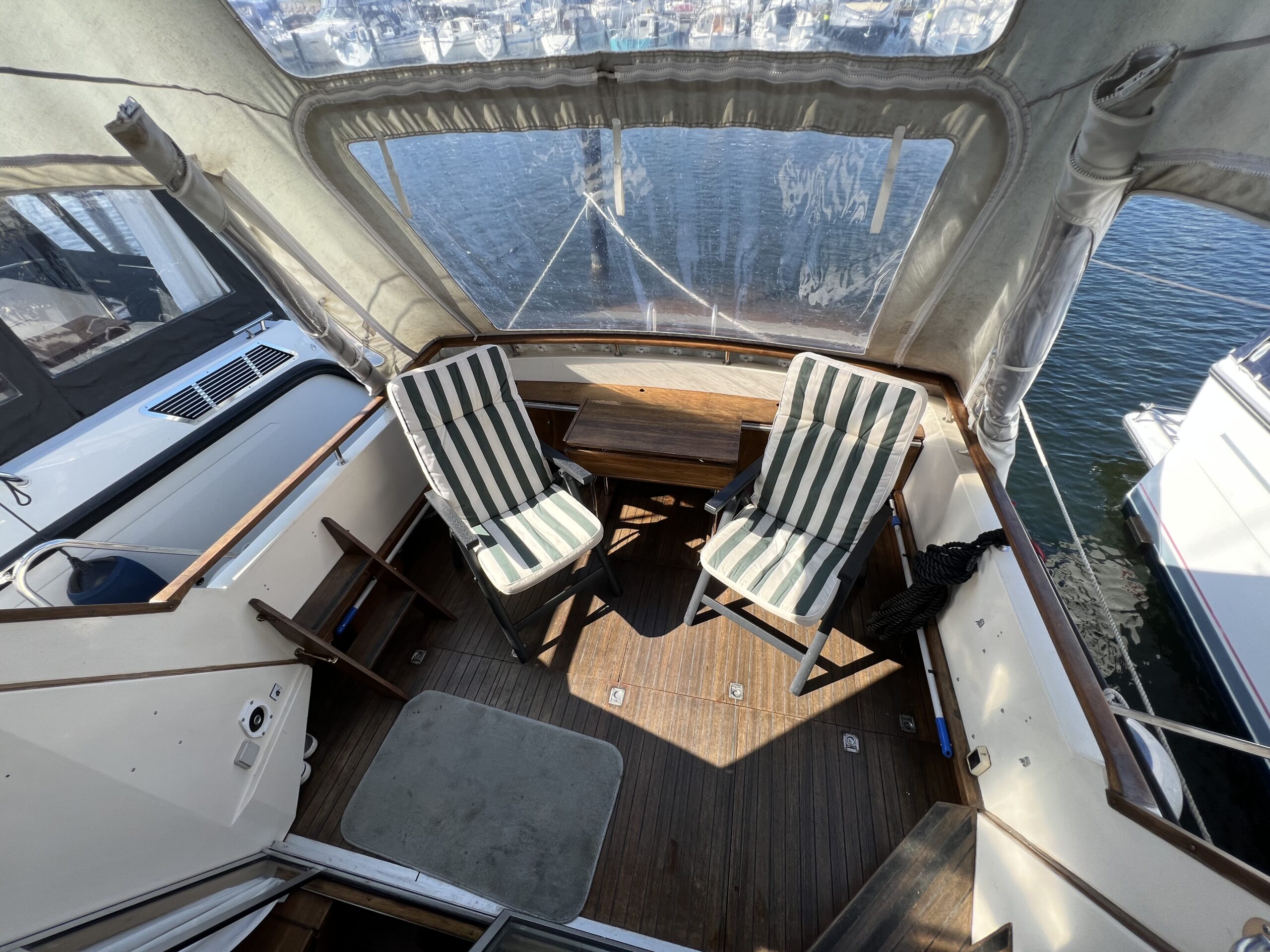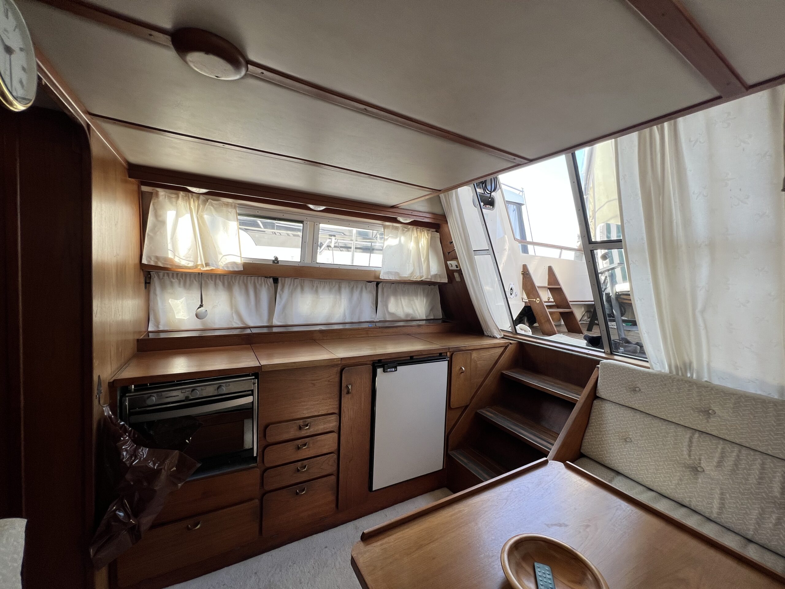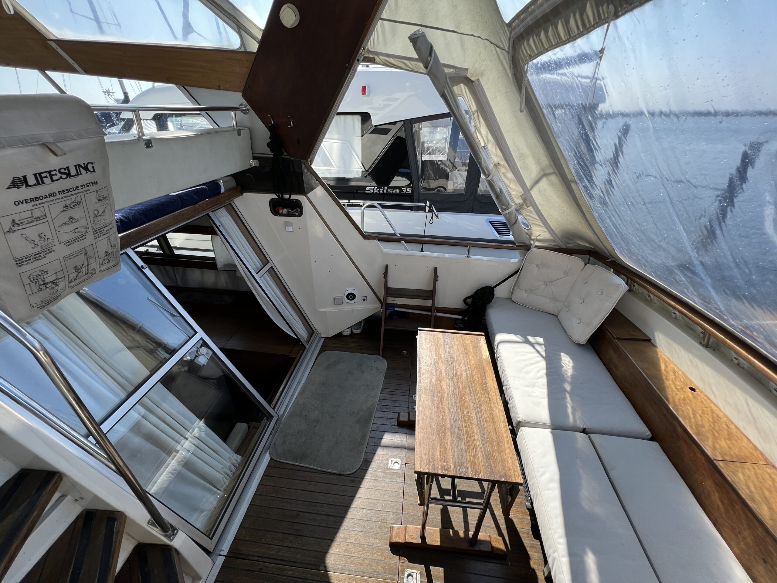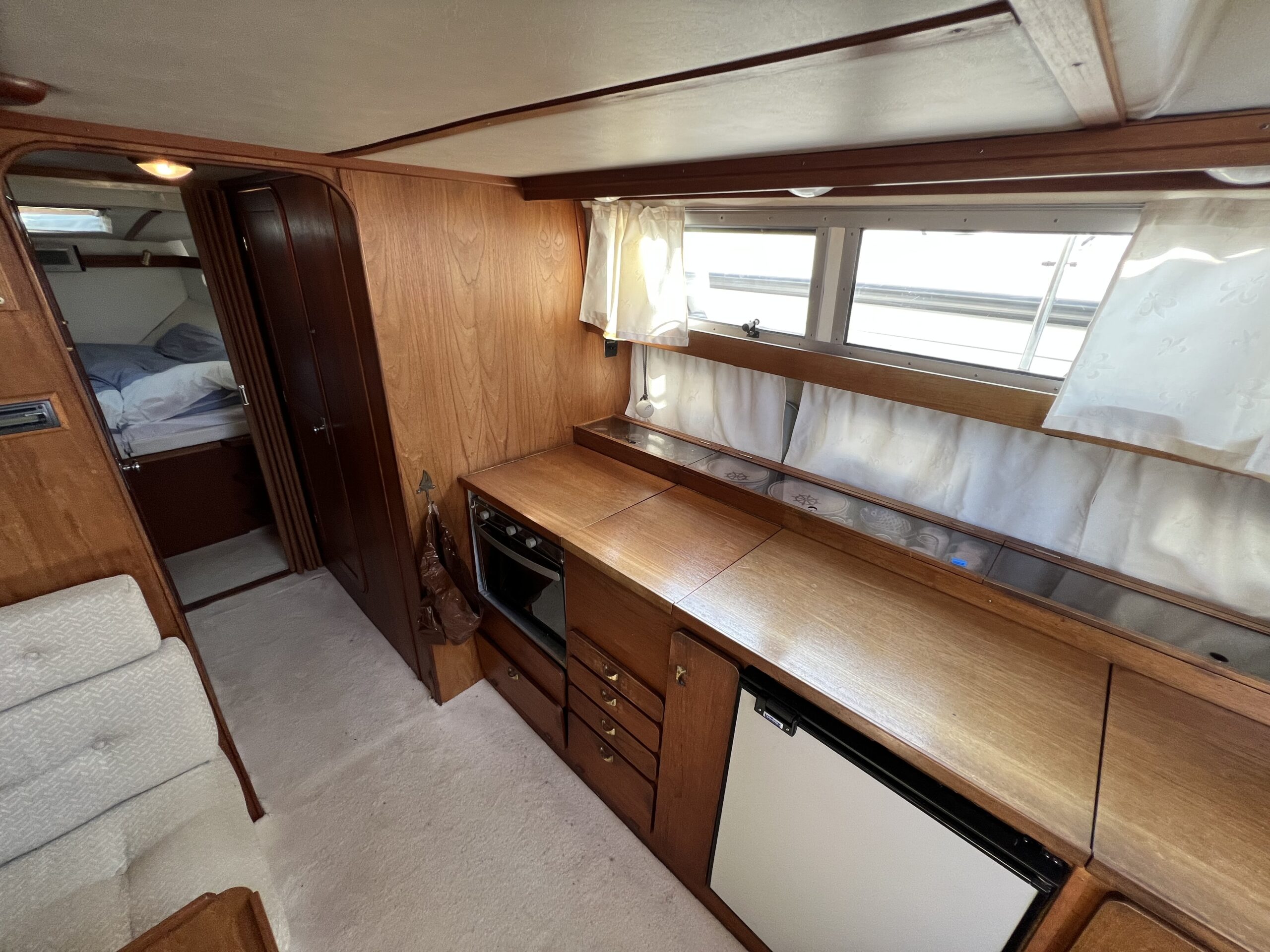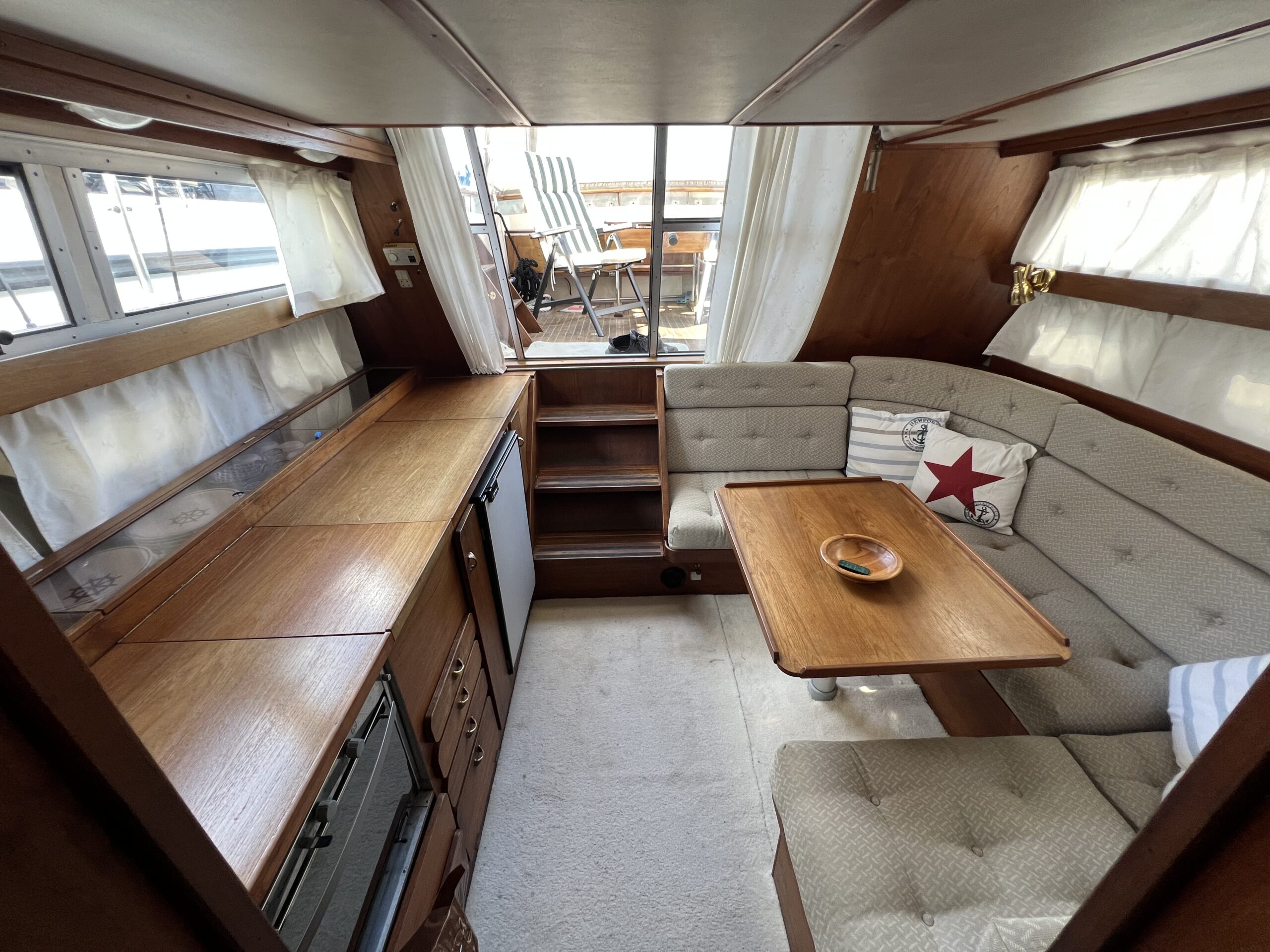 Trappe til overdækket comander bridge med 2 store styrestole med affjedring-L sofa til solbadning, eller nyde med en drink. Nedgang til hyggelig salonen med stor glas skydedør – med stor U sofa med plads til 6 pers, som også kan slås ned til dobbeltseng med fuld længde, desuden stort panty med nyere komfur med ovn og rustfri stålvask, med koldt og varmt vand, stort isoterm 130 ltr køleskab med frys fra 2020, gode skabe og skuffer. 2 kahytter adskilt ved en lille gang og egne døre.