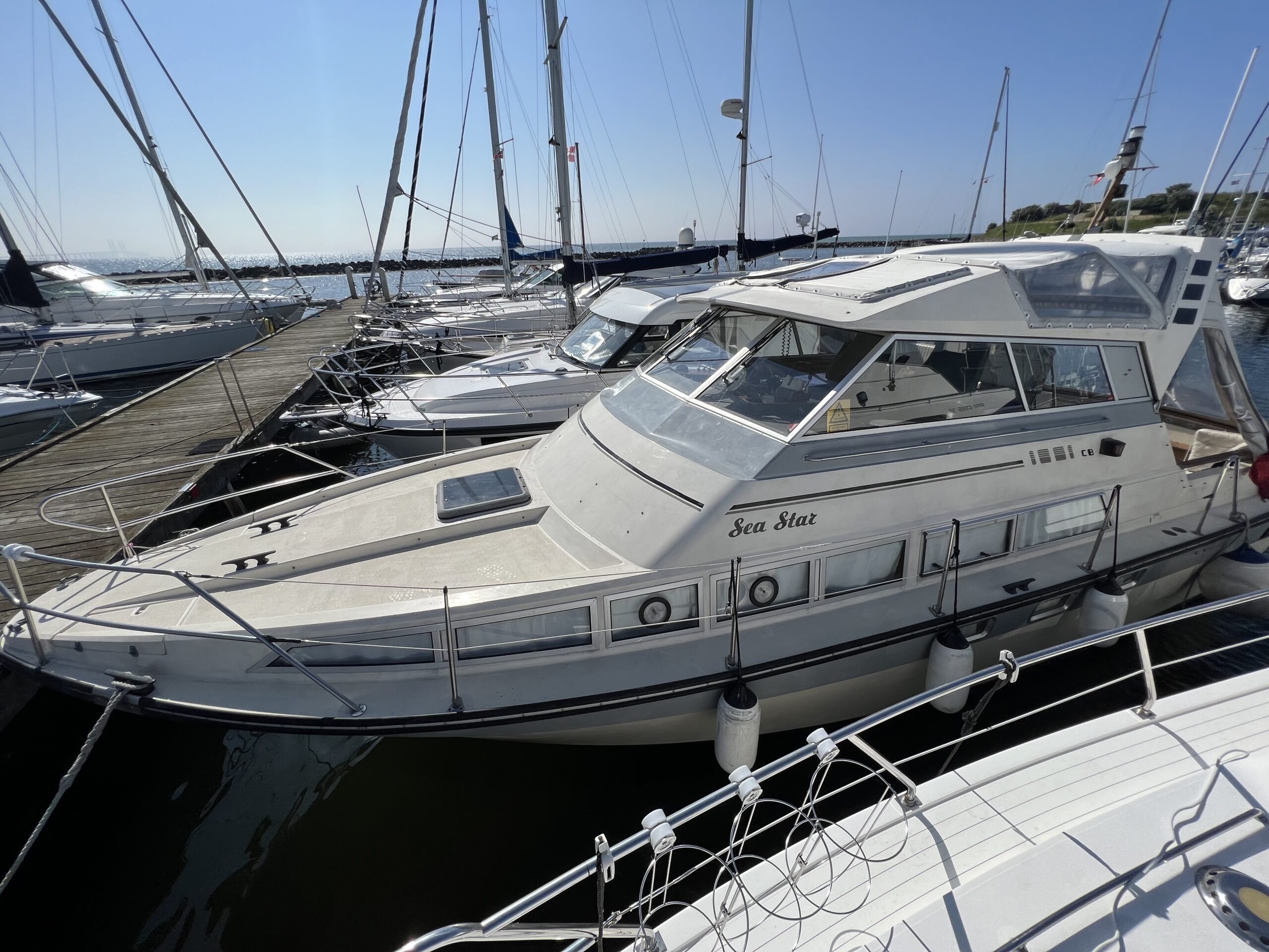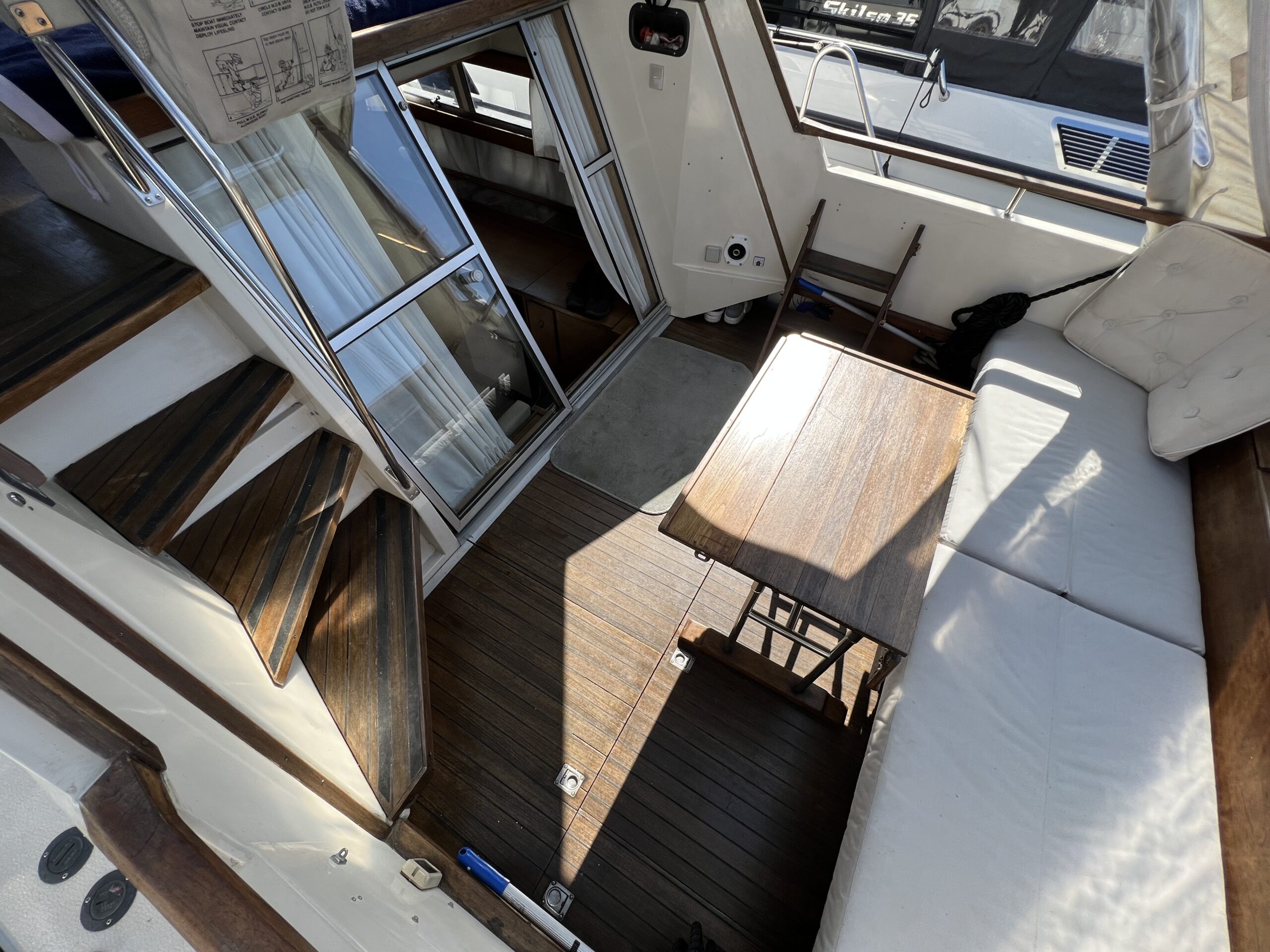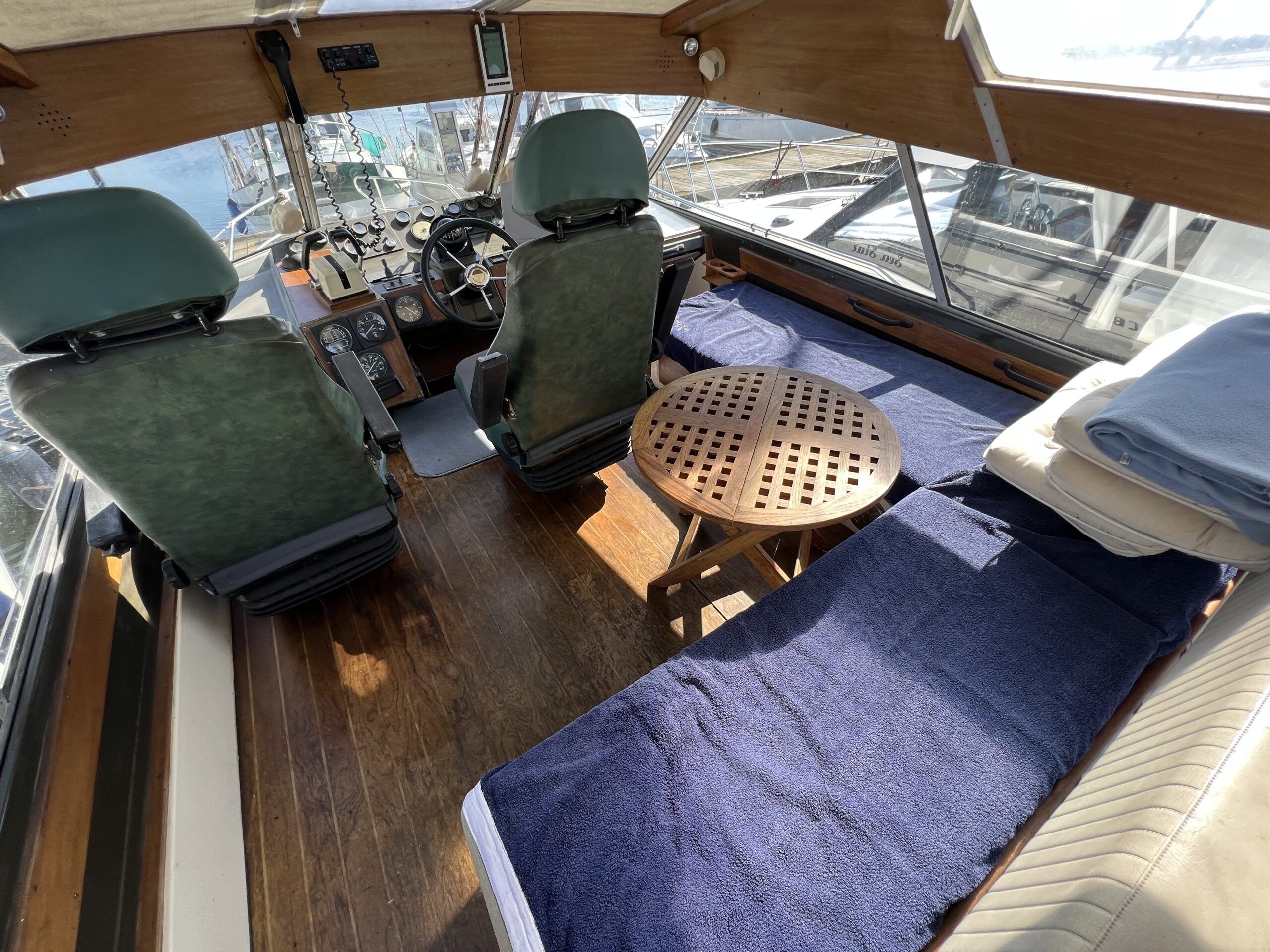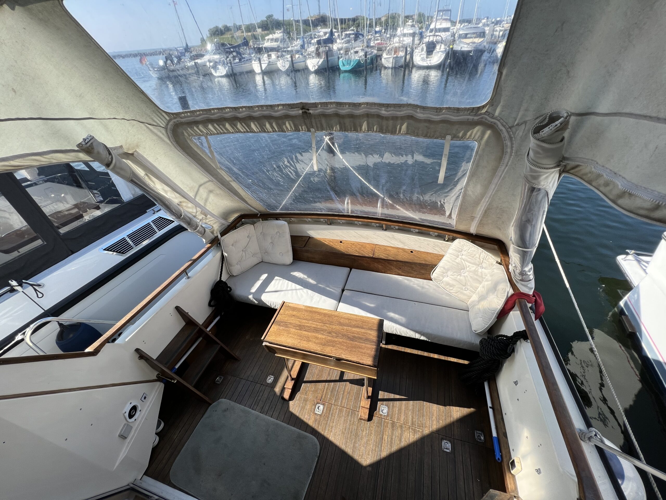 Trappe til overdækket comander bridge med 2 store styrestole med affjedring-L sofa til solbadning, eller nyde med en drink. Nedgang til hyggelig salonen med stor glas skydedør – med stor U sofa med plads til 6 pers, som også kan slås ned til dobbeltseng med fuld længde, desuden stort panty med nyere komfur med ovn og rustfri stålvask, med koldt og varmt vand, stort isoterm 130 ltr køleskab med frys fra 2020, gode skabe og skuffer. 2 kahytter adskilt ved en lille gang og egne døre.