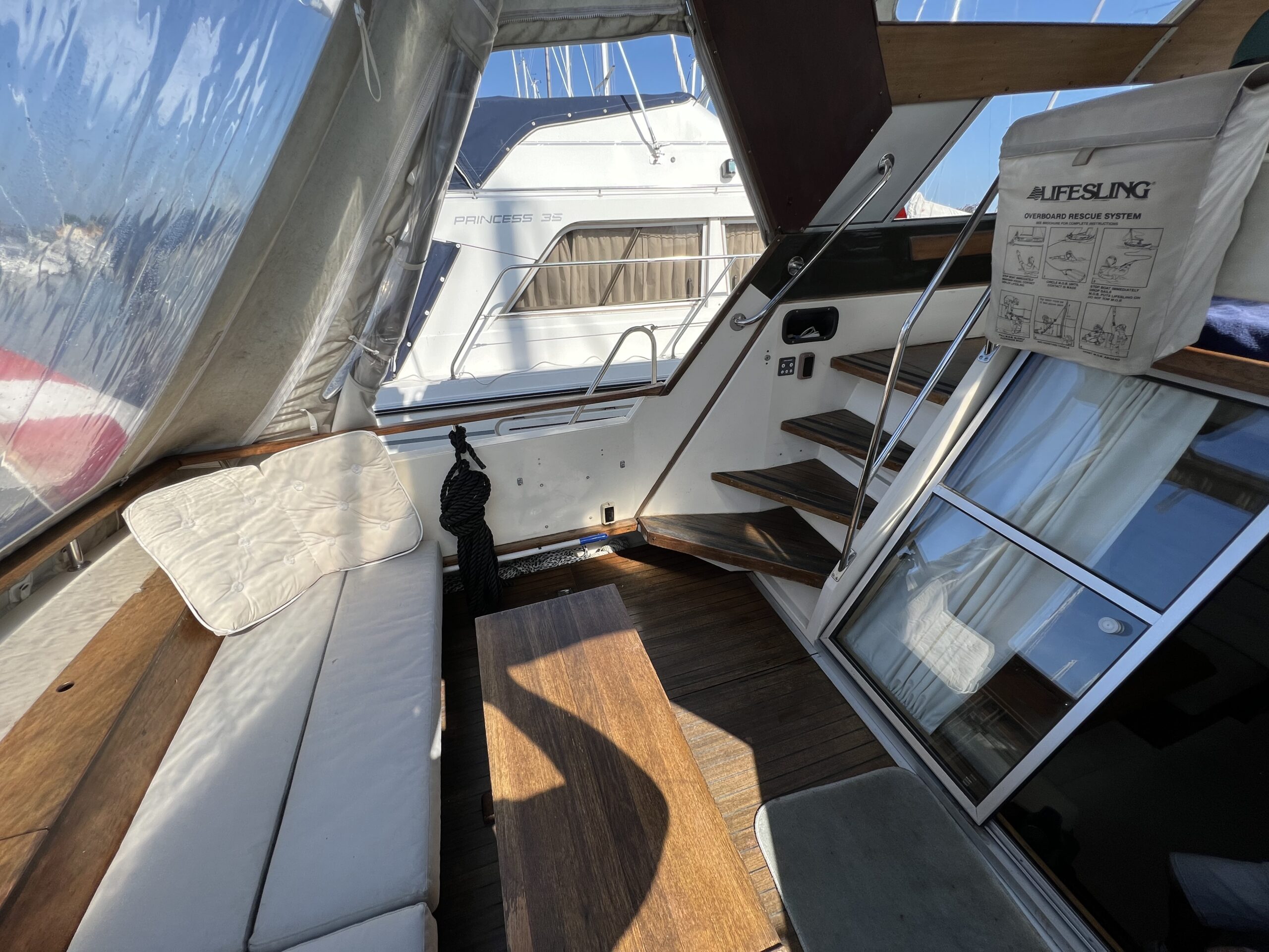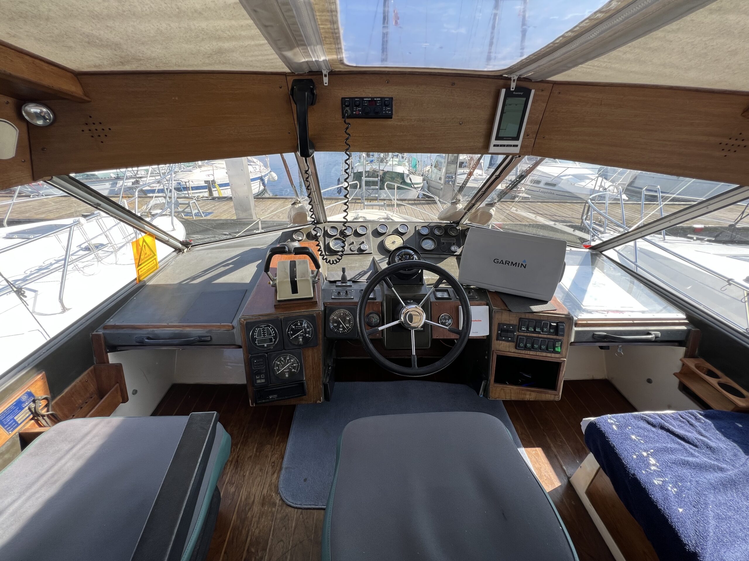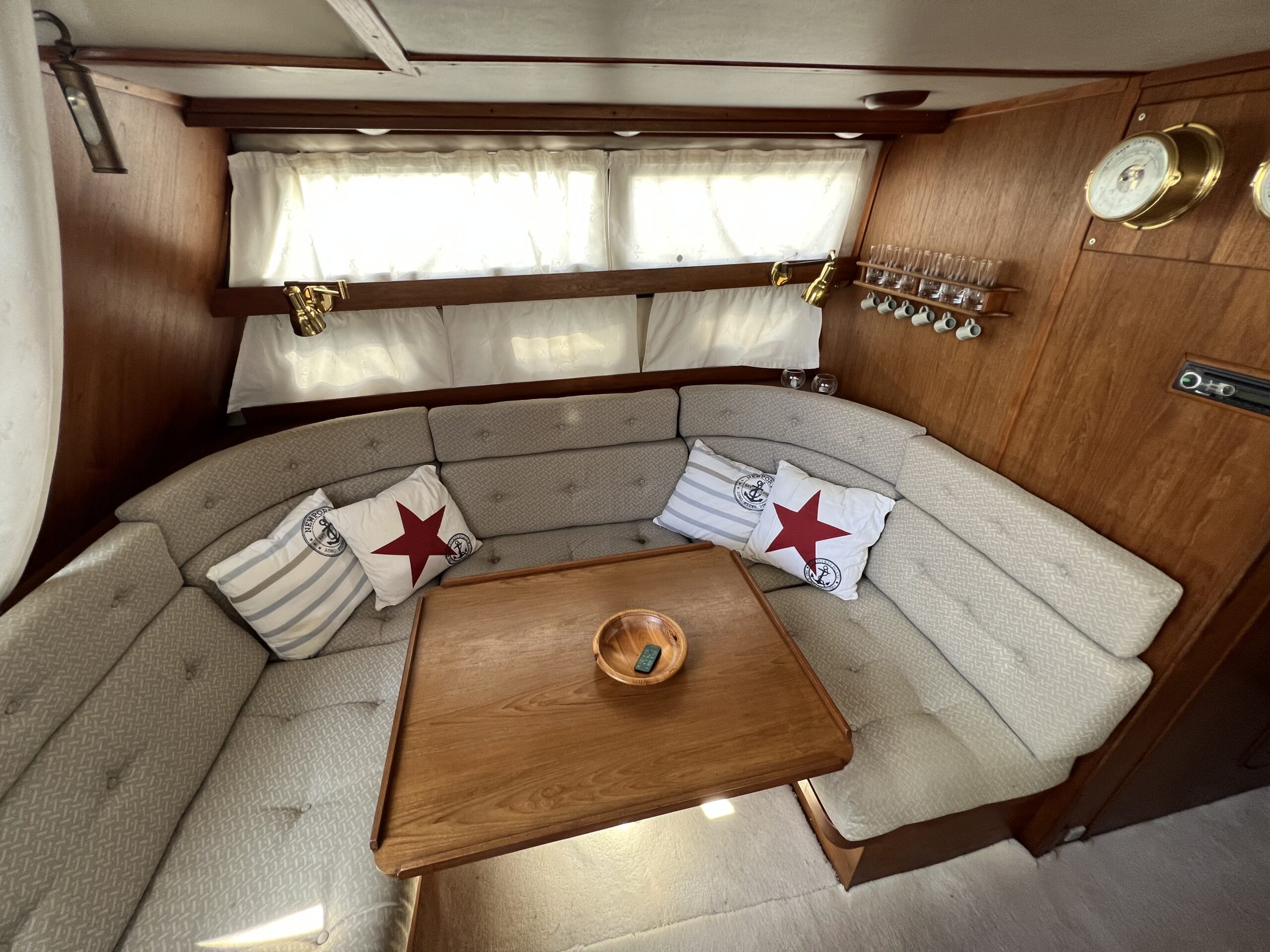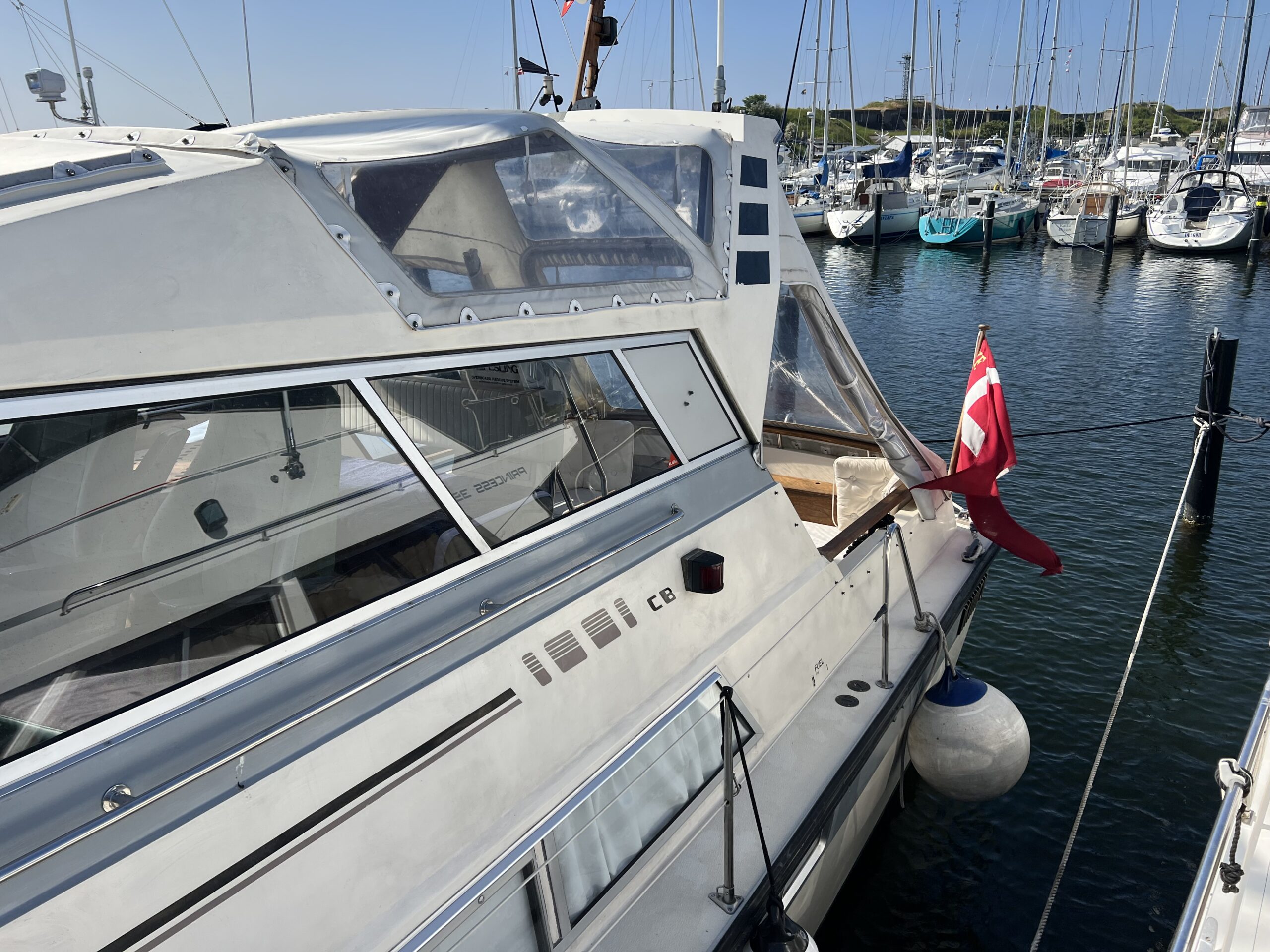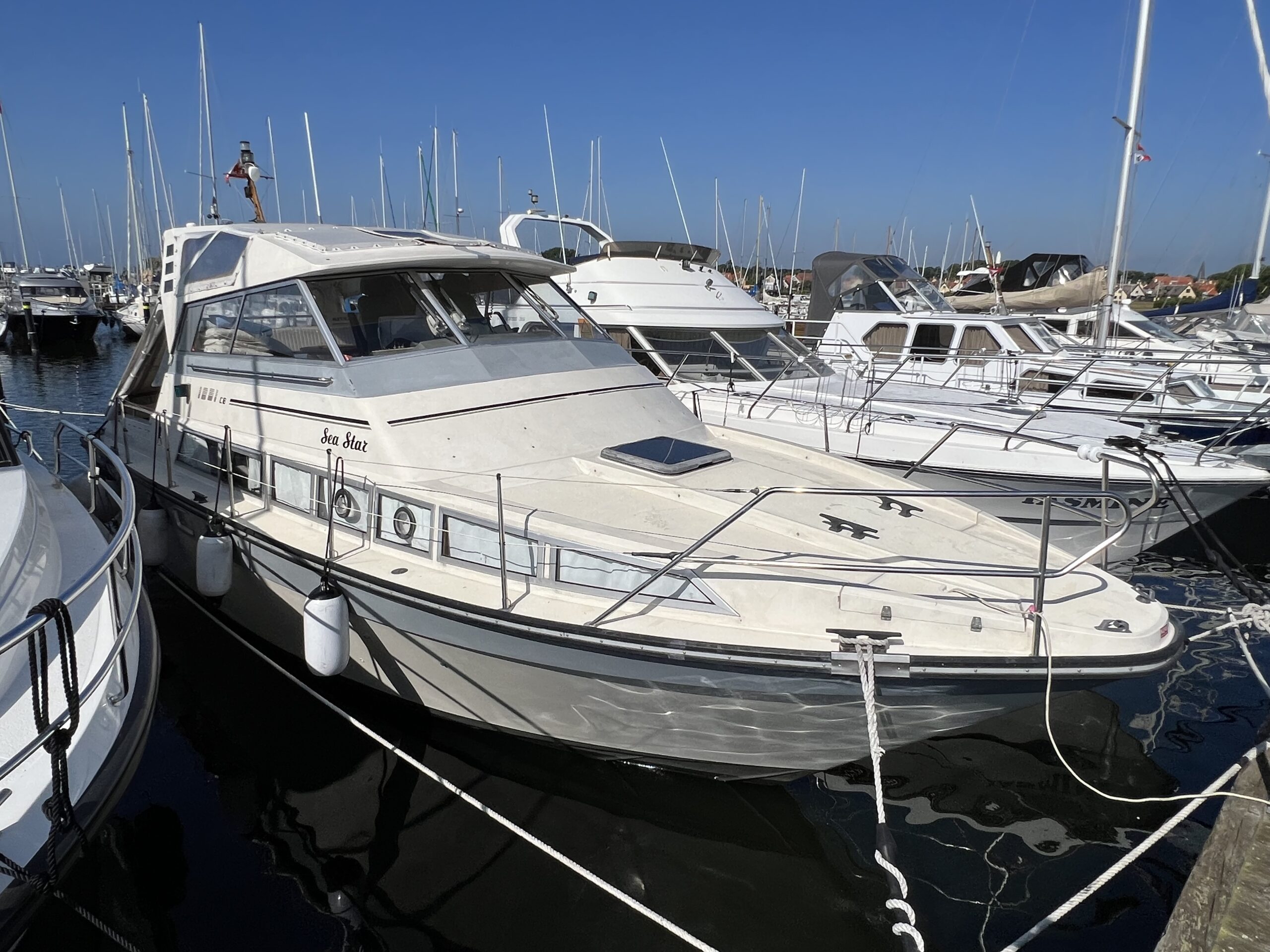 Trappe til overdækket comander bridge med 2 store styrestole med affjedring-L sofa til solbadning, eller nyde med en drink. Nedgang til hyggelig salonen med stor glas skydedør – med stor U sofa med plads til 6 pers, som også kan slås ned til dobbeltseng med fuld længde, desuden stort panty med nyere komfur med ovn og rustfri stålvask, med koldt og varmt vand, stort isoterm 130 ltr køleskab med frys fra 2020, gode skabe og skuffer. 2 kahytter adskilt ved en lille gang og egne døre.