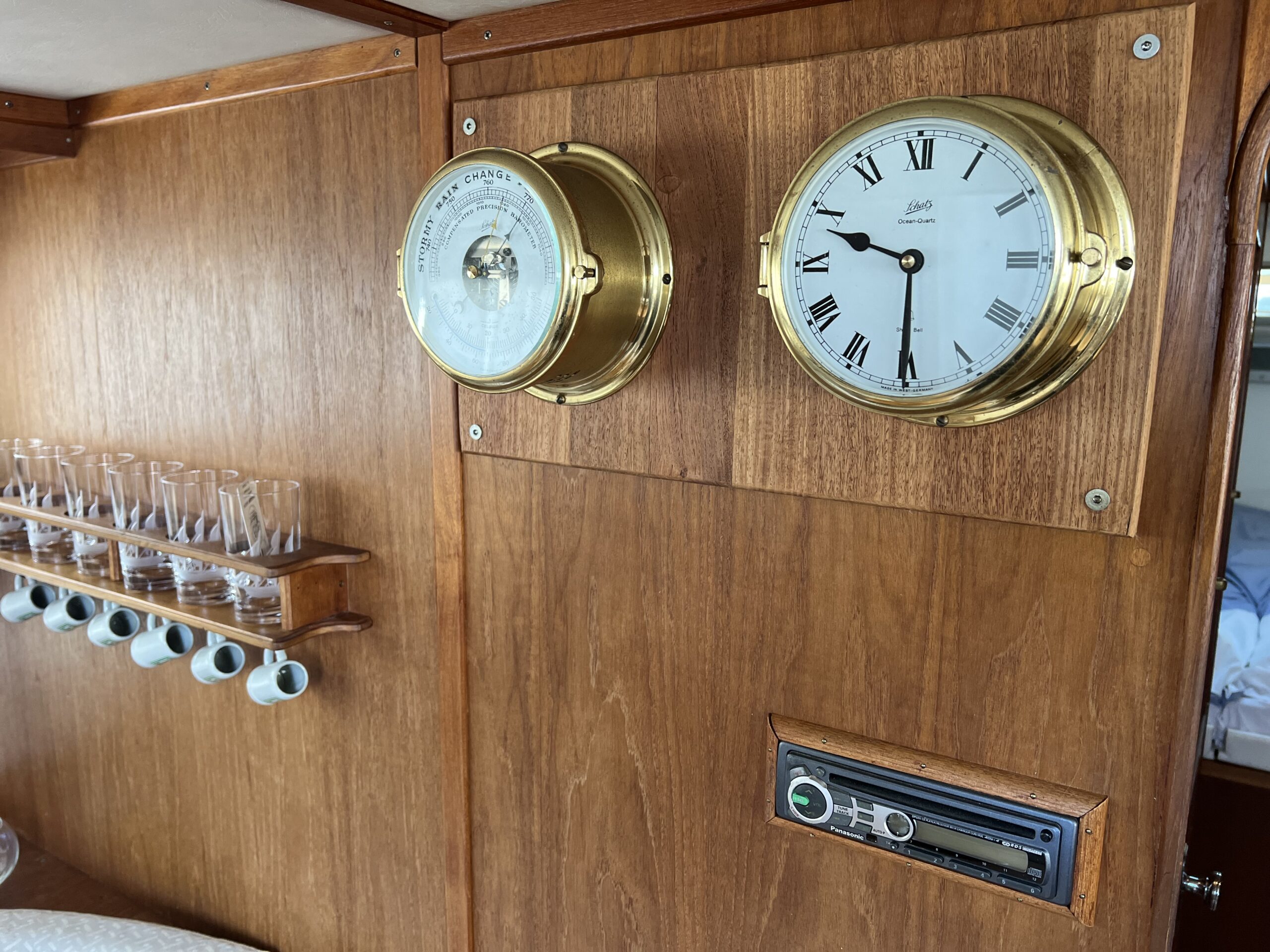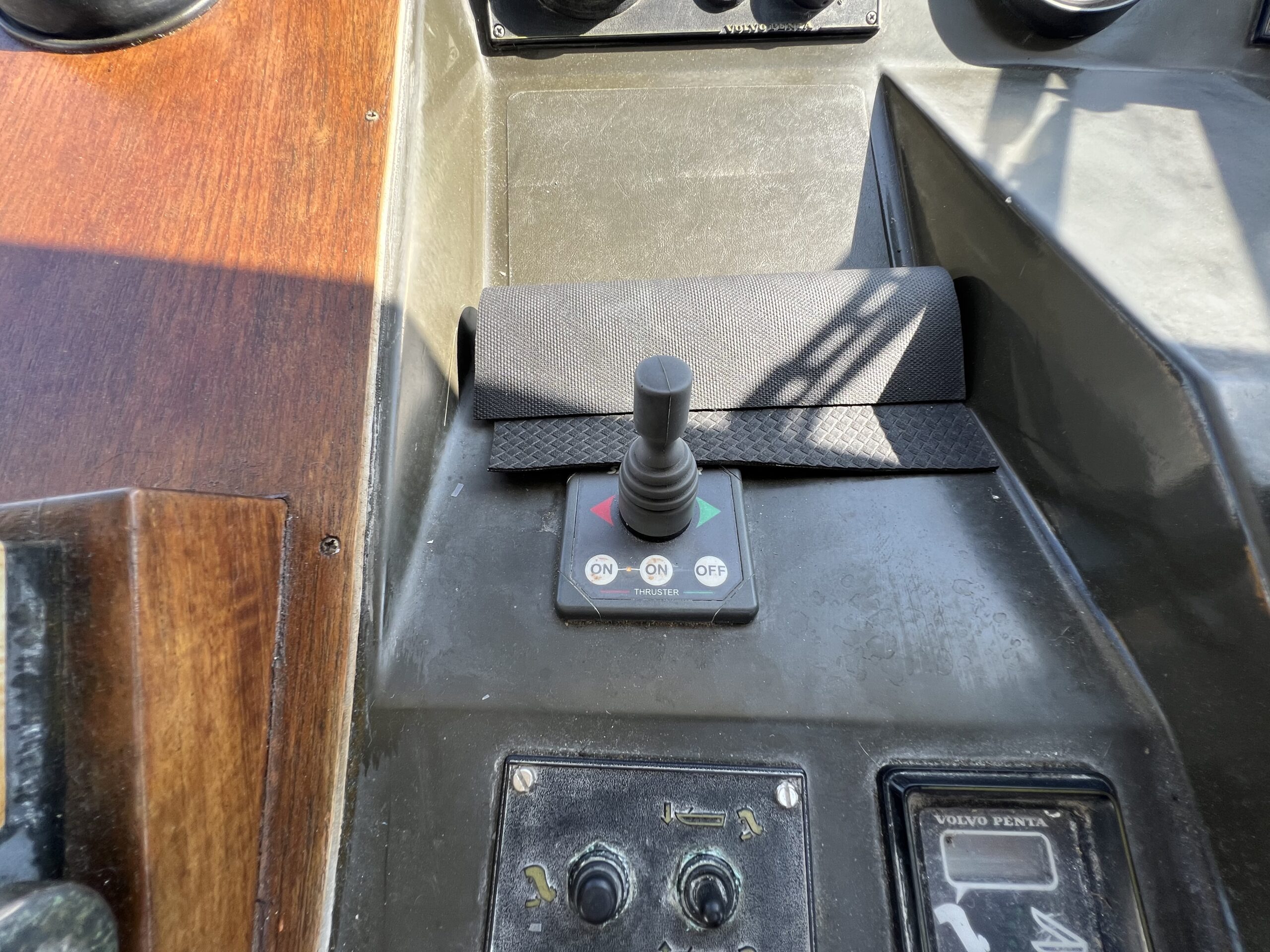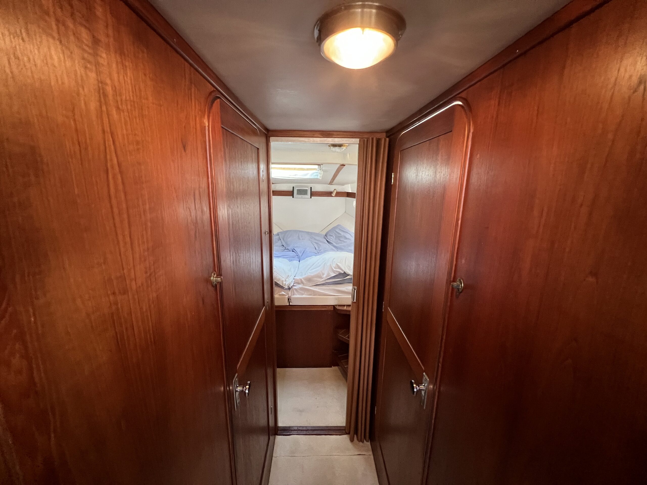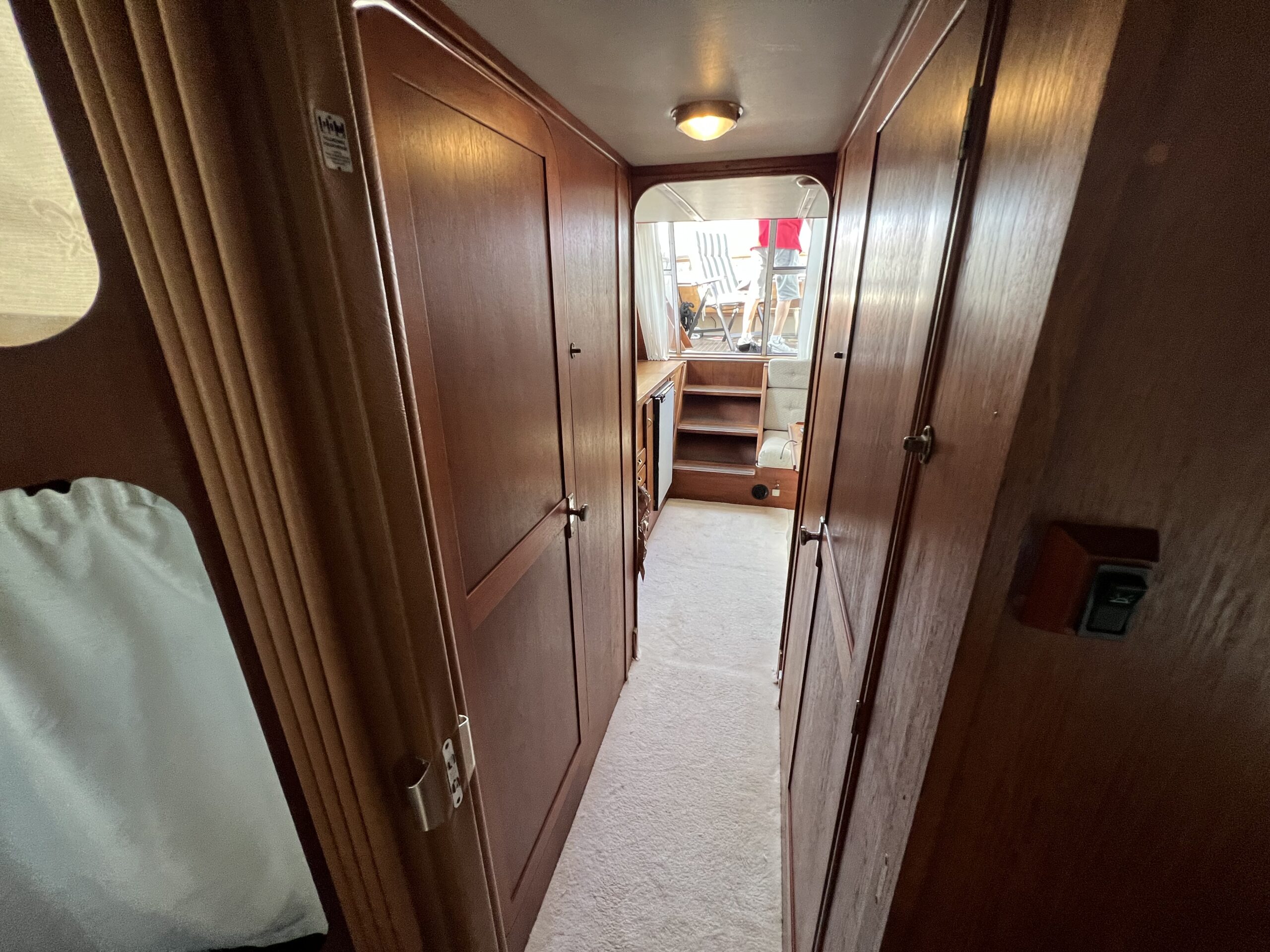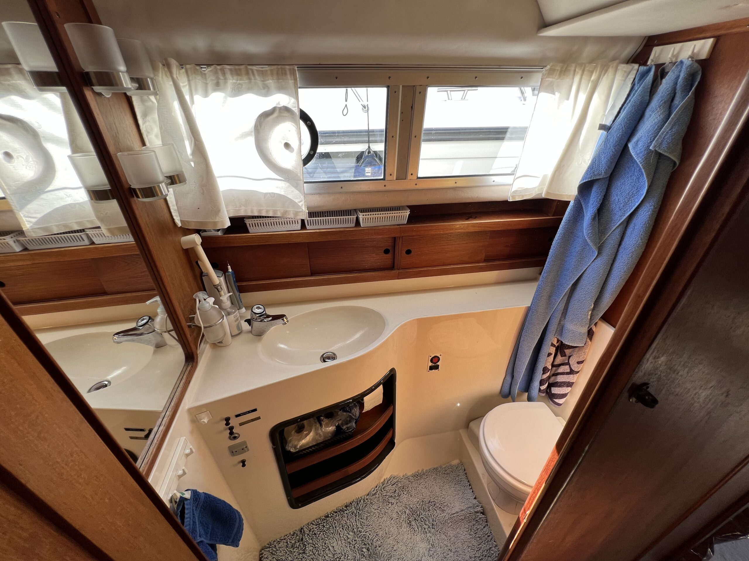 Trappe til overdækket comander bridge med 2 store styrestole med affjedring-L sofa til solbadning, eller nyde med en drink. Nedgang til hyggelig salonen med stor glas skydedør – med stor U sofa med plads til 6 pers, som også kan slås ned til dobbeltseng med fuld længde, desuden stort panty med nyere komfur med ovn og rustfri stålvask, med koldt og varmt vand, stort isoterm 130 ltr køleskab med frys fra 2020, gode skabe og skuffer. 2 kahytter adskilt ved en lille gang og egne døre.