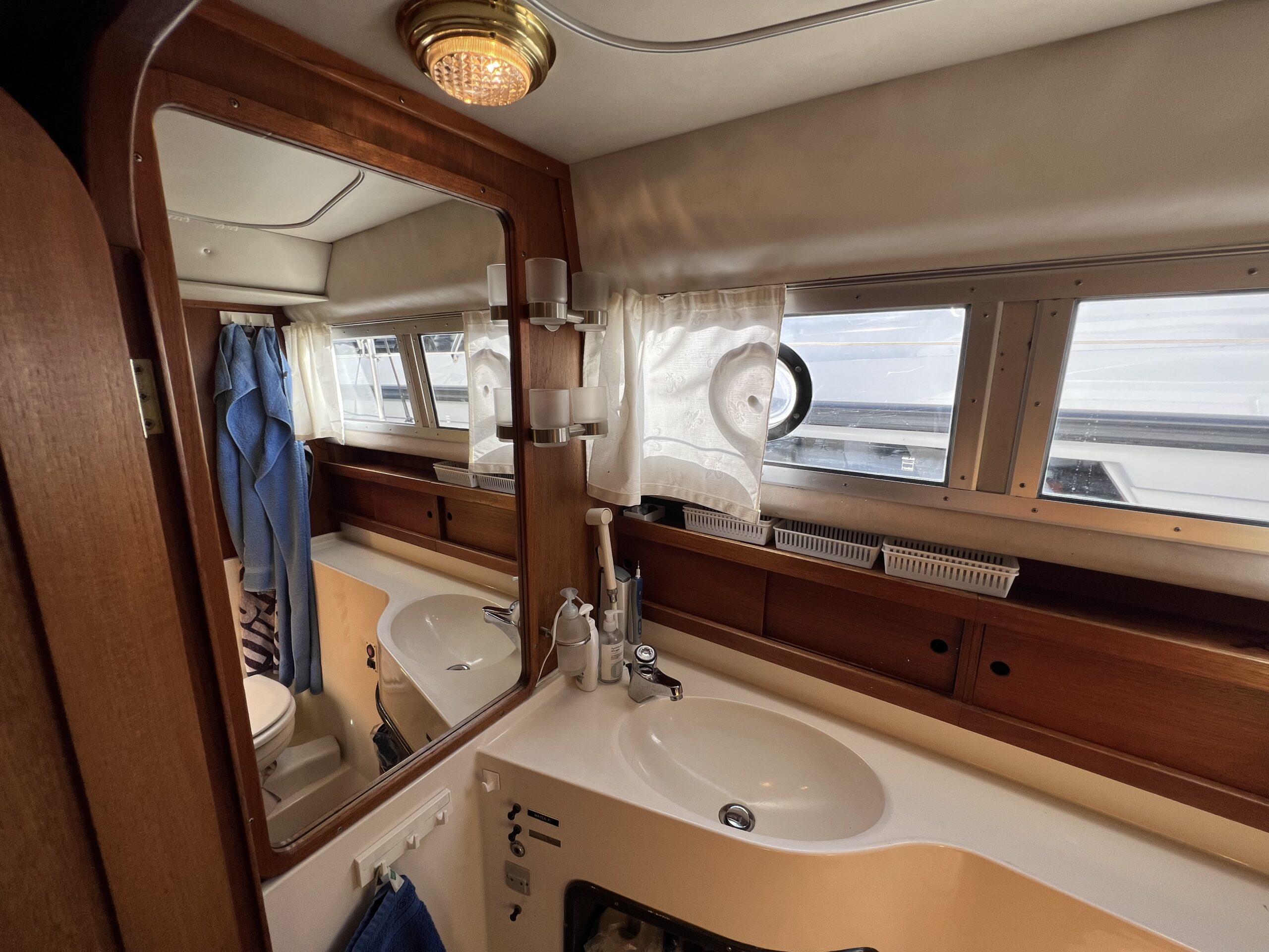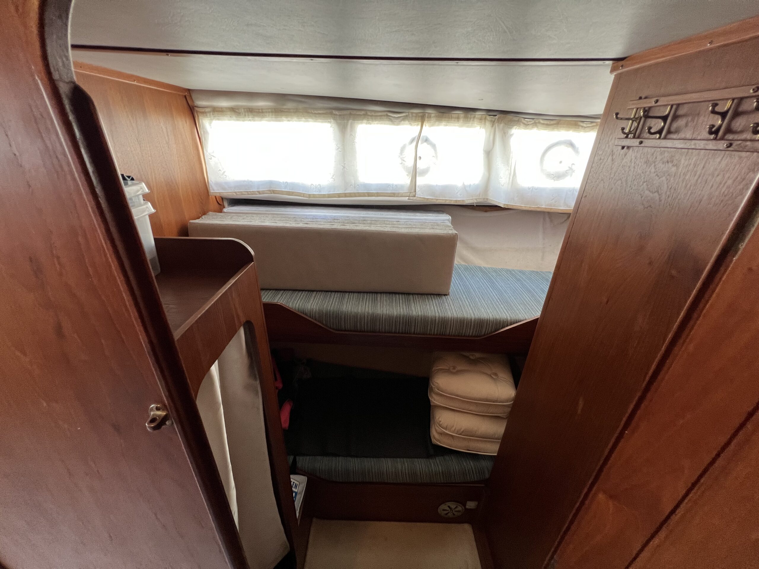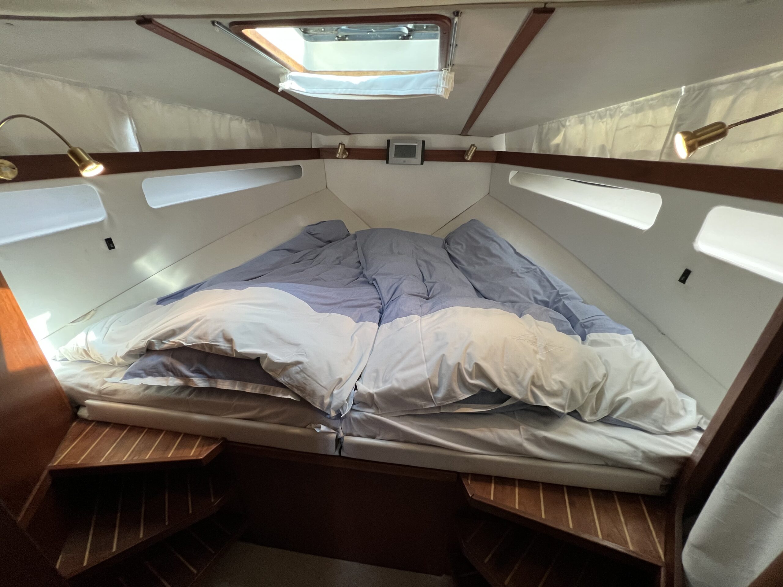 Kahyt med 2 køjer. Masterbedroom med dobbeltseng og delt elevation. Toilet/bad separat med dør. El-toilet og håndvask, brus med varmt og koldt vand og lænsepumpe. Vinduer hele vejen rundt, godt lysindfald. Båden indbyder til hyggelige ferieture og evt. beboelse. Båden fremstår original og har igennem tiden, fået mange opgraderinger. Båden er bundmalet, og båden ligger klar i vandet til sin nye ejer