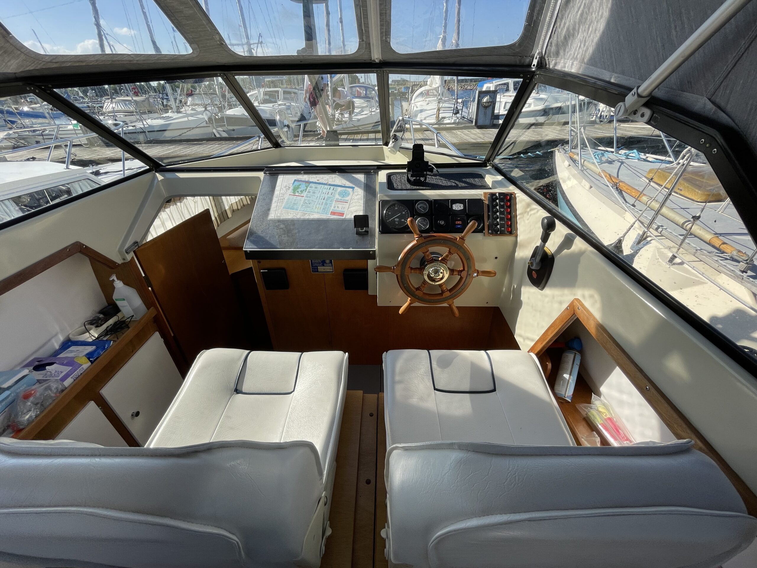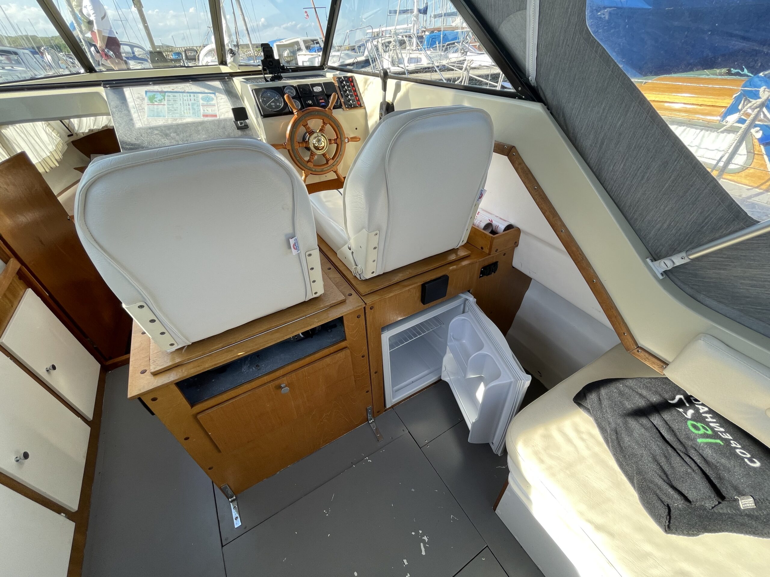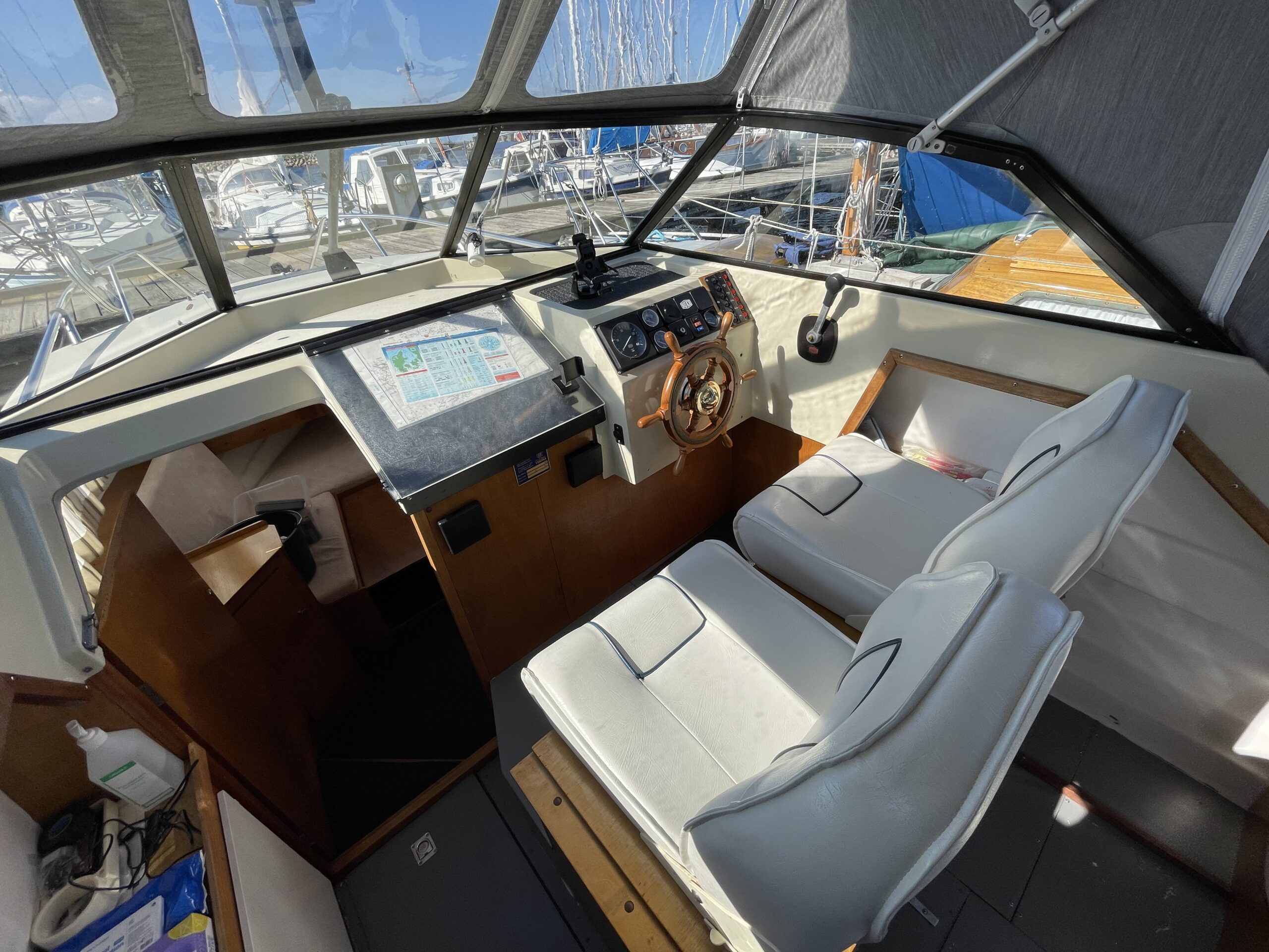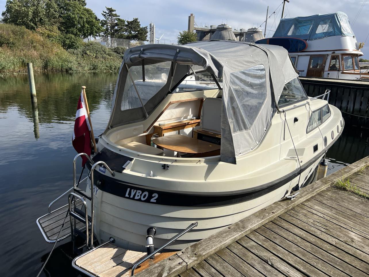 Skøn norsk kvalitet – kendt for sødygtighed og top håndværk. Dejligt familiecockpit med U-sofa agter med bordløsning. Fremme dobbelt førerplads hvor der er komfur og køleskab “under” sæderne. fin pantryløsning med vask og Nedgang til fin hyggelig kahyt med sofagruppe og bord som kan omgøres til stor familiekøje. Lille toiletrum og fine opbevaringsrum. Båden er absolut velpasset med nyere hynder og kaleche, alder taget i betrækning er det en pæn båd