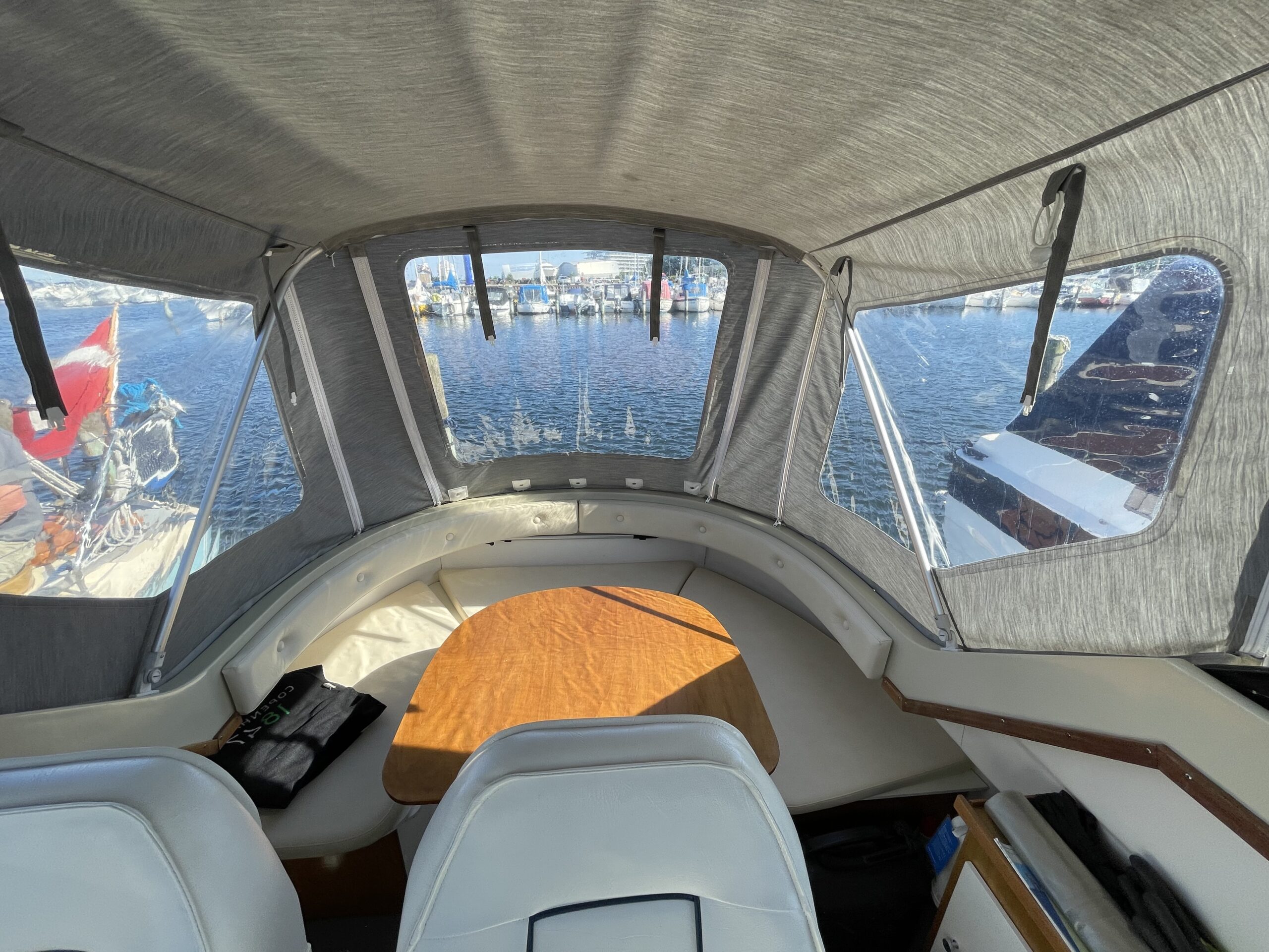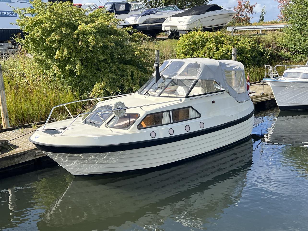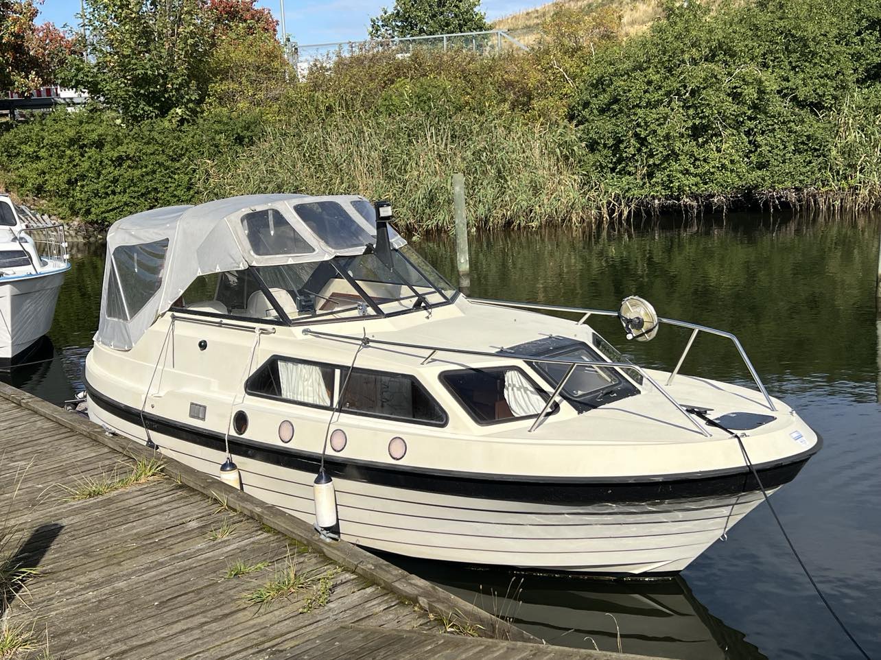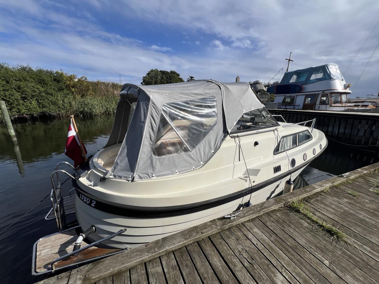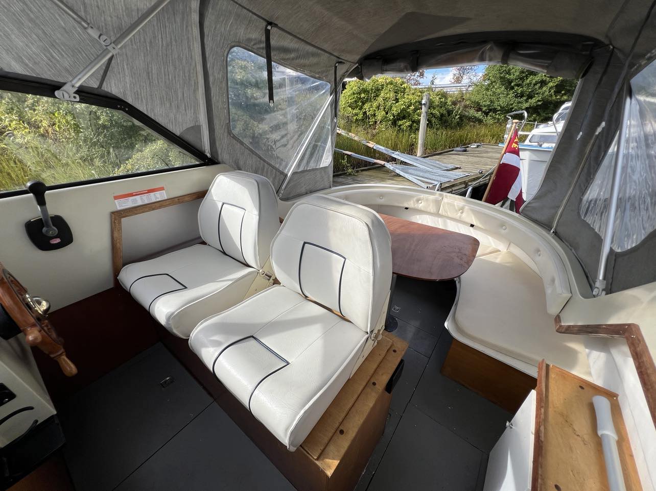 Skøn norsk kvalitet – kendt for sødygtighed og top håndværk. Dejligt familiecockpit med U-sofa agter med bordløsning. Fremme dobbelt førerplads hvor der er komfur og køleskab “under” sæderne. fin pantryløsning med vask og Nedgang til fin hyggelig kahyt med sofagruppe og bord som kan omgøres til stor familiekøje. Lille toiletrum og fine opbevaringsrum. Båden er absolut velpasset med nyere hynder og kaleche, alder taget i betrækning er det en pæn båd