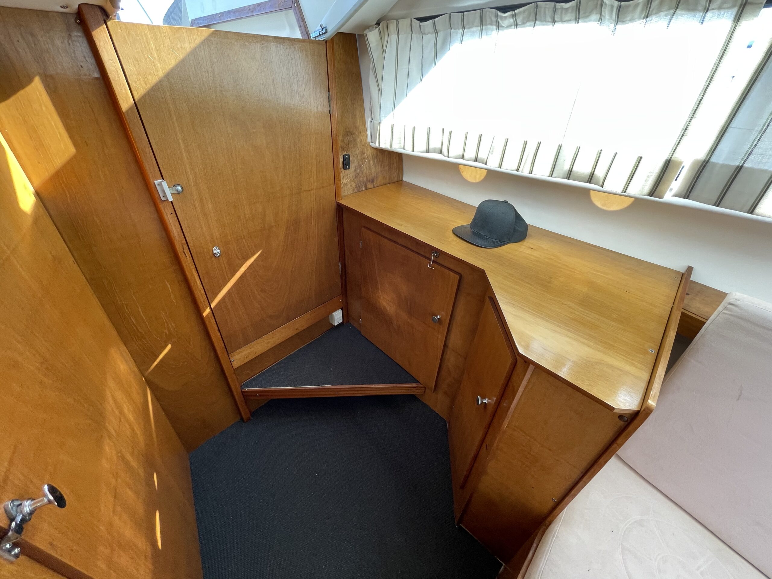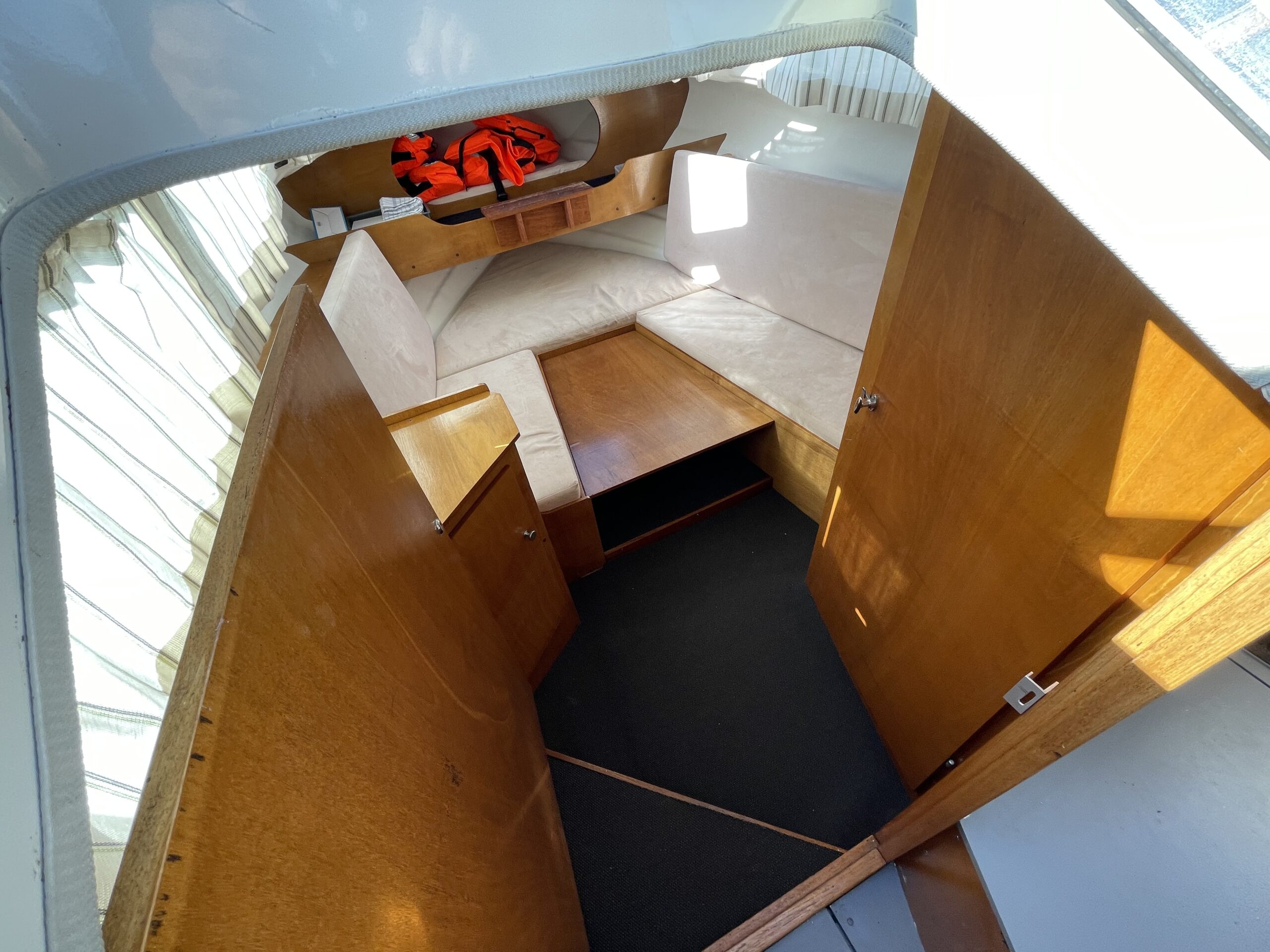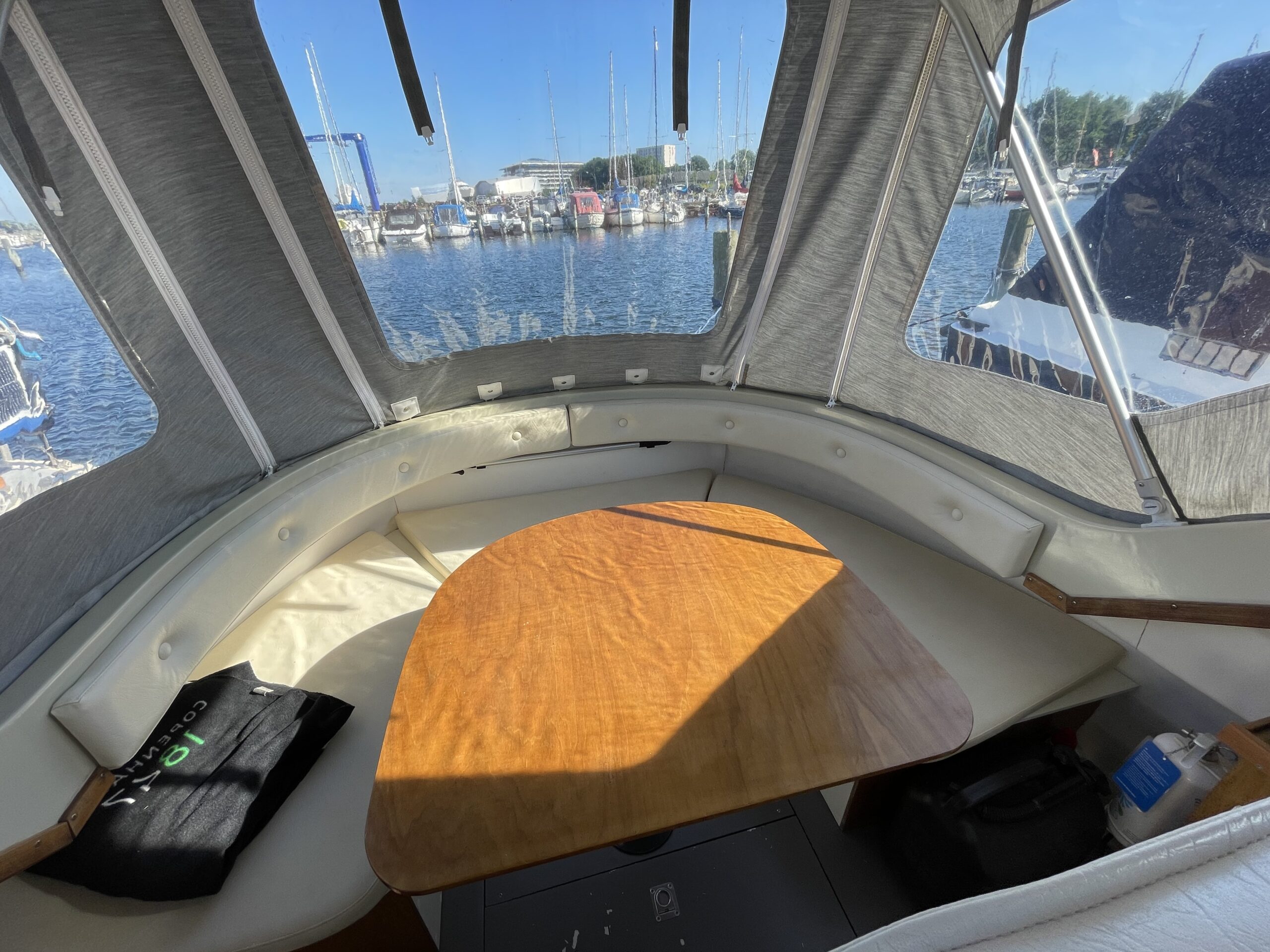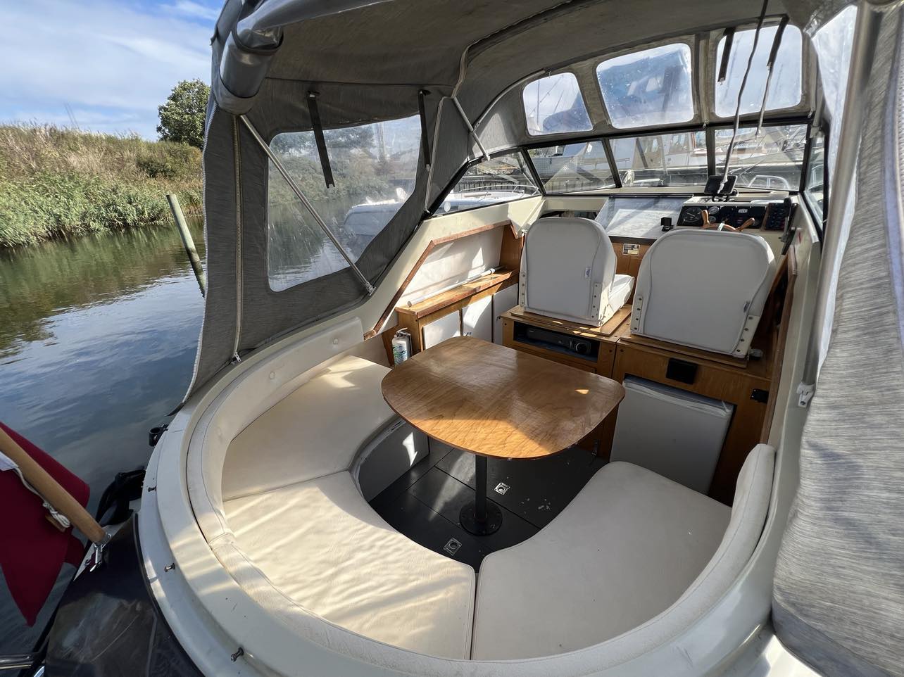 Skøn norsk kvalitet – kendt for sødygtighed og top håndværk. Dejligt familiecockpit med U-sofa agter med bordløsning. Fremme dobbelt førerplads hvor der er komfur og køleskab “under” sæderne. fin pantryløsning med vask og Nedgang til fin hyggelig kahyt med sofagruppe og bord som kan omgøres til stor familiekøje. Lille toiletrum og fine opbevaringsrum. Båden er absolut velpasset med nyere hynder og kaleche, alder taget i betrækning er det en pæn båd