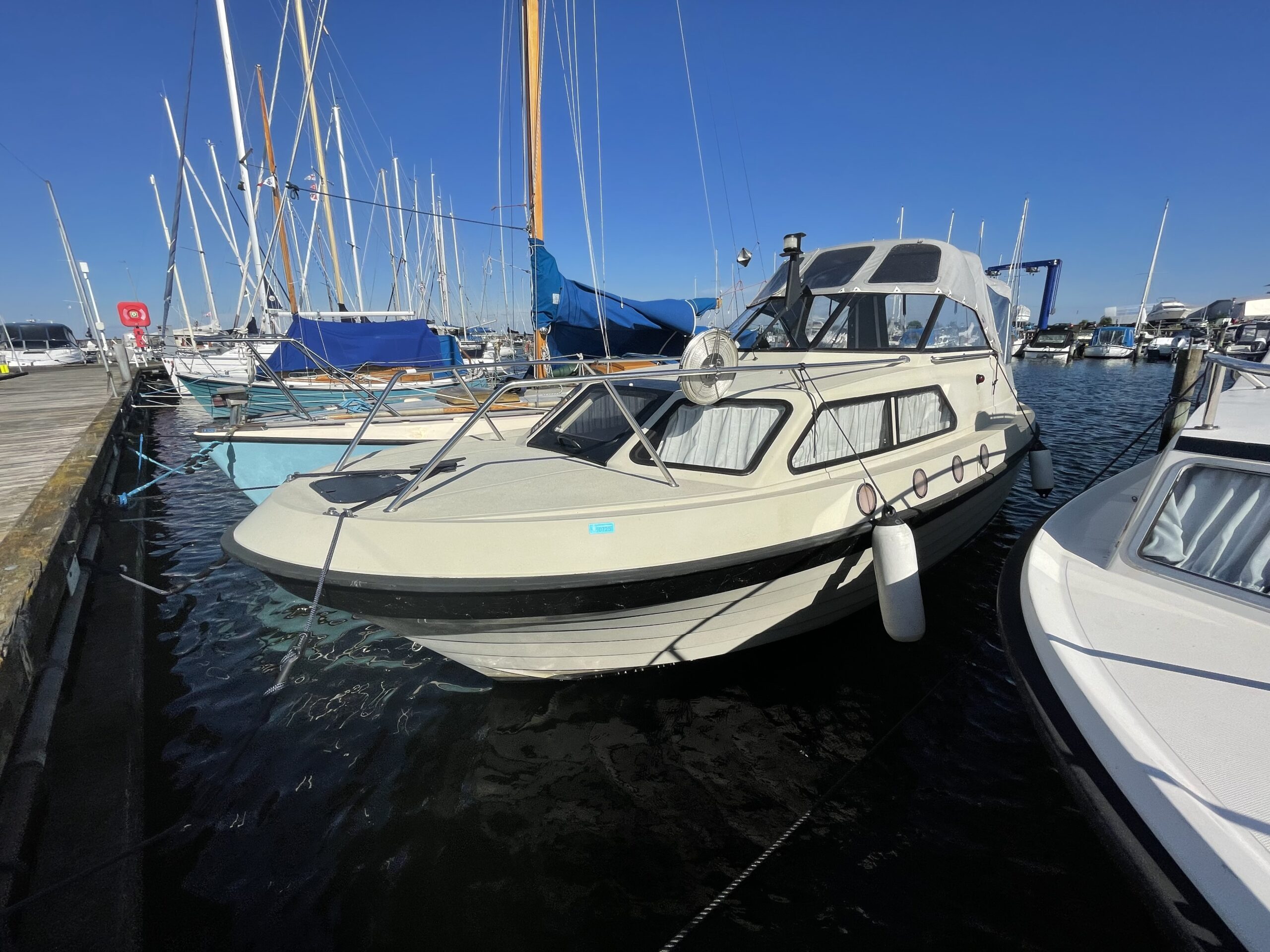 Skøn norsk kvalitet – kendt for sødygtighed og top håndværk. Dejligt familiecockpit med U-sofa agter med bordløsning. Fremme dobbelt føreplads hvor der er komfur og køleskab “under” sæderne. fin pantryløsning med vask og Nedgang til fin hyggelig kahyt med sofagruppe og bord som kan omgøres til stor familiekøje. Lille toiletrum og fine opbevaringsrum. Båden er absolut velpasset med nyere hynder og kaleche, alder i taget i betrækning er det en pæn båd, Motor er ny serviceret inkl vandpumpe og termostat. Båden ligger i Kastrup og er klar til ny ejer.