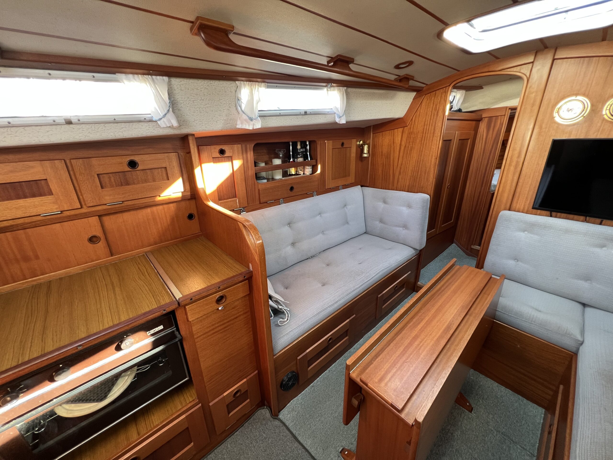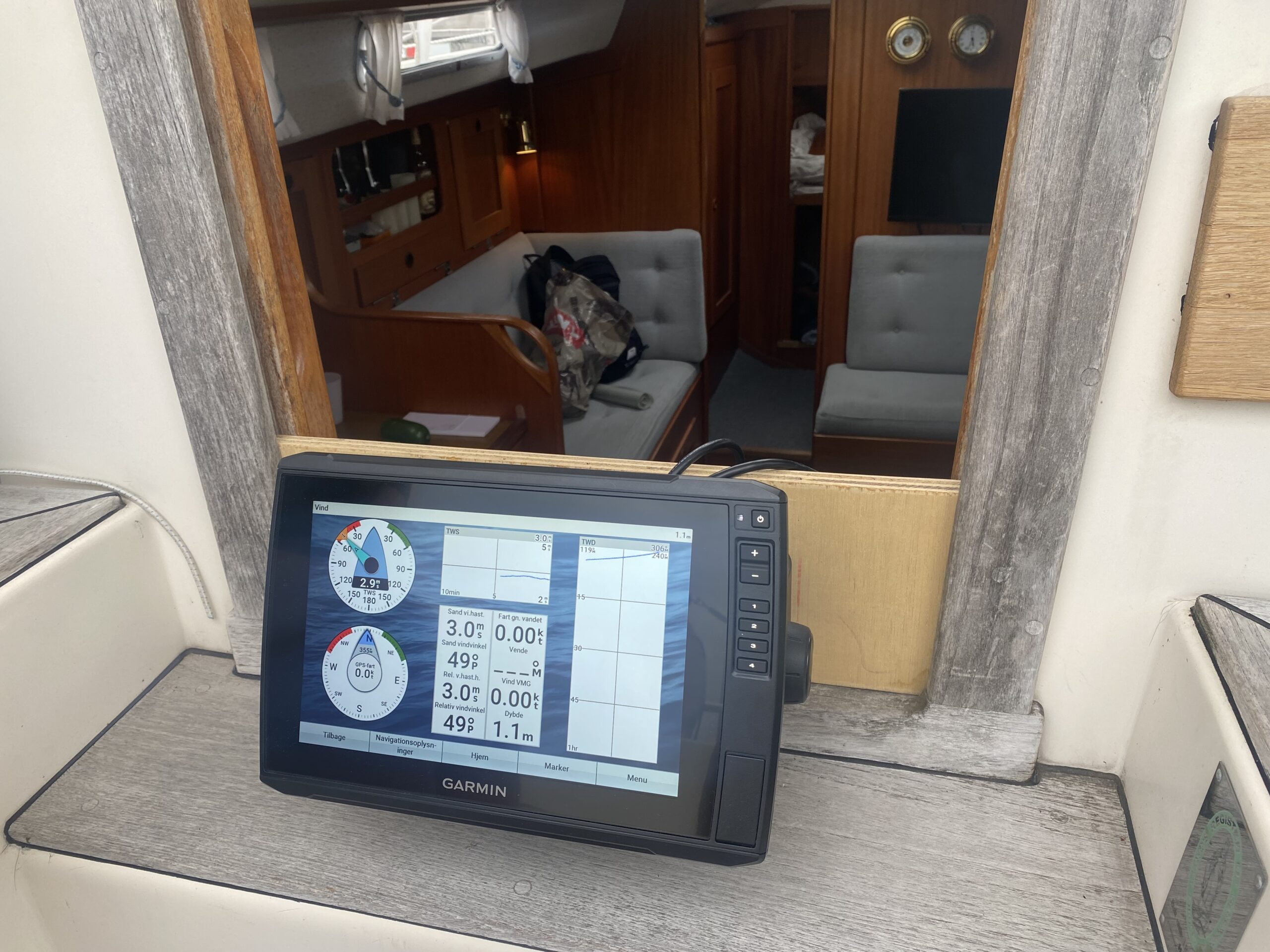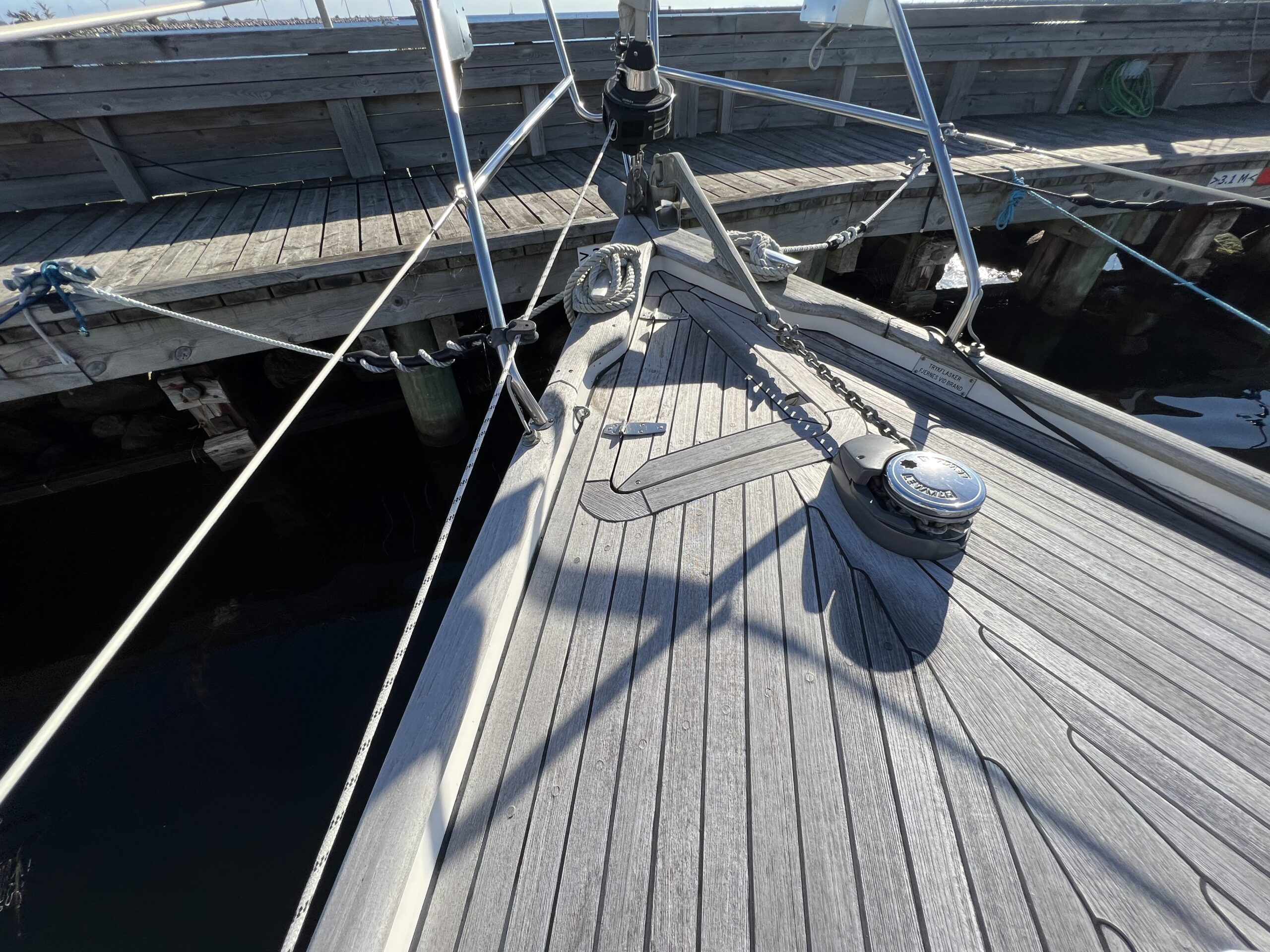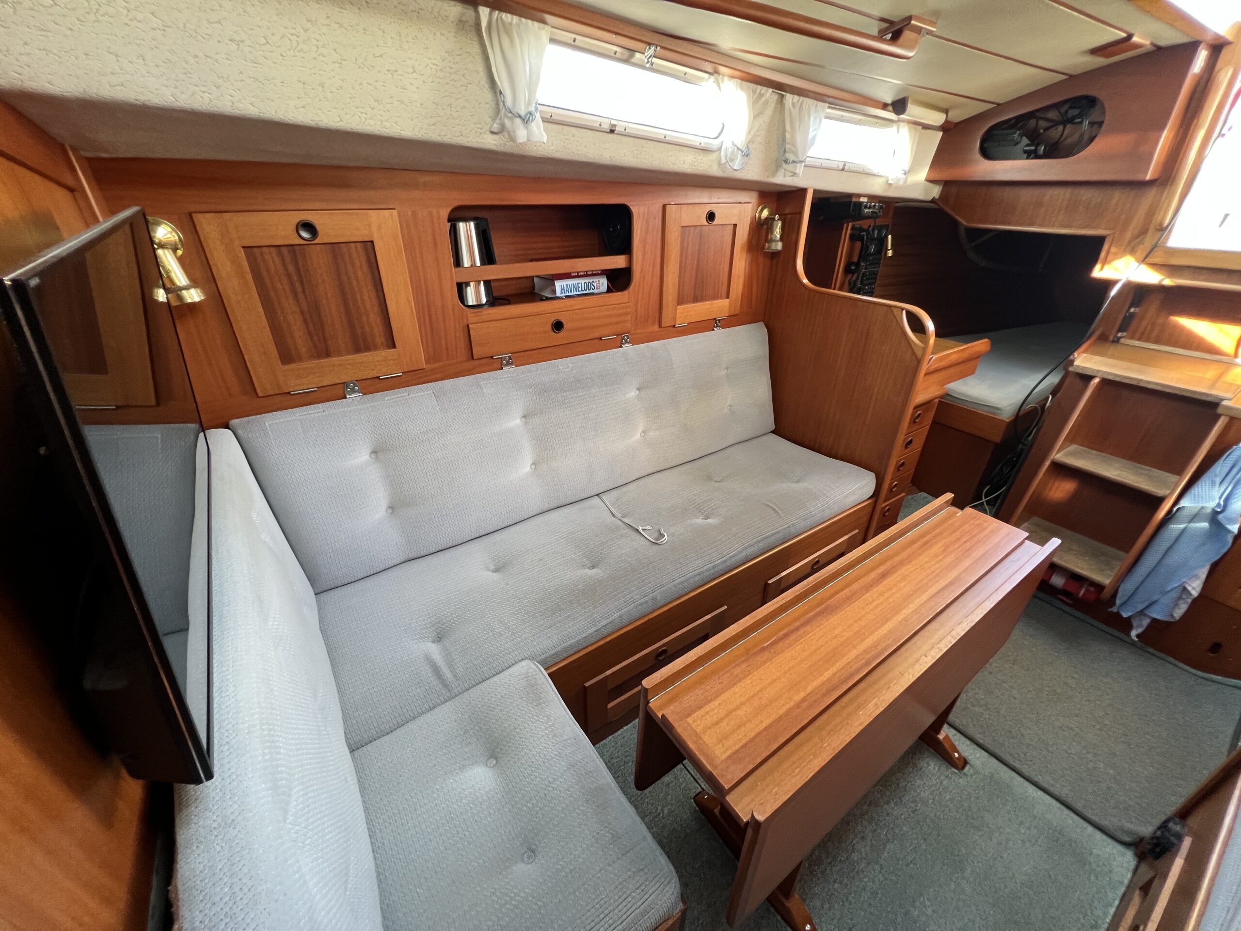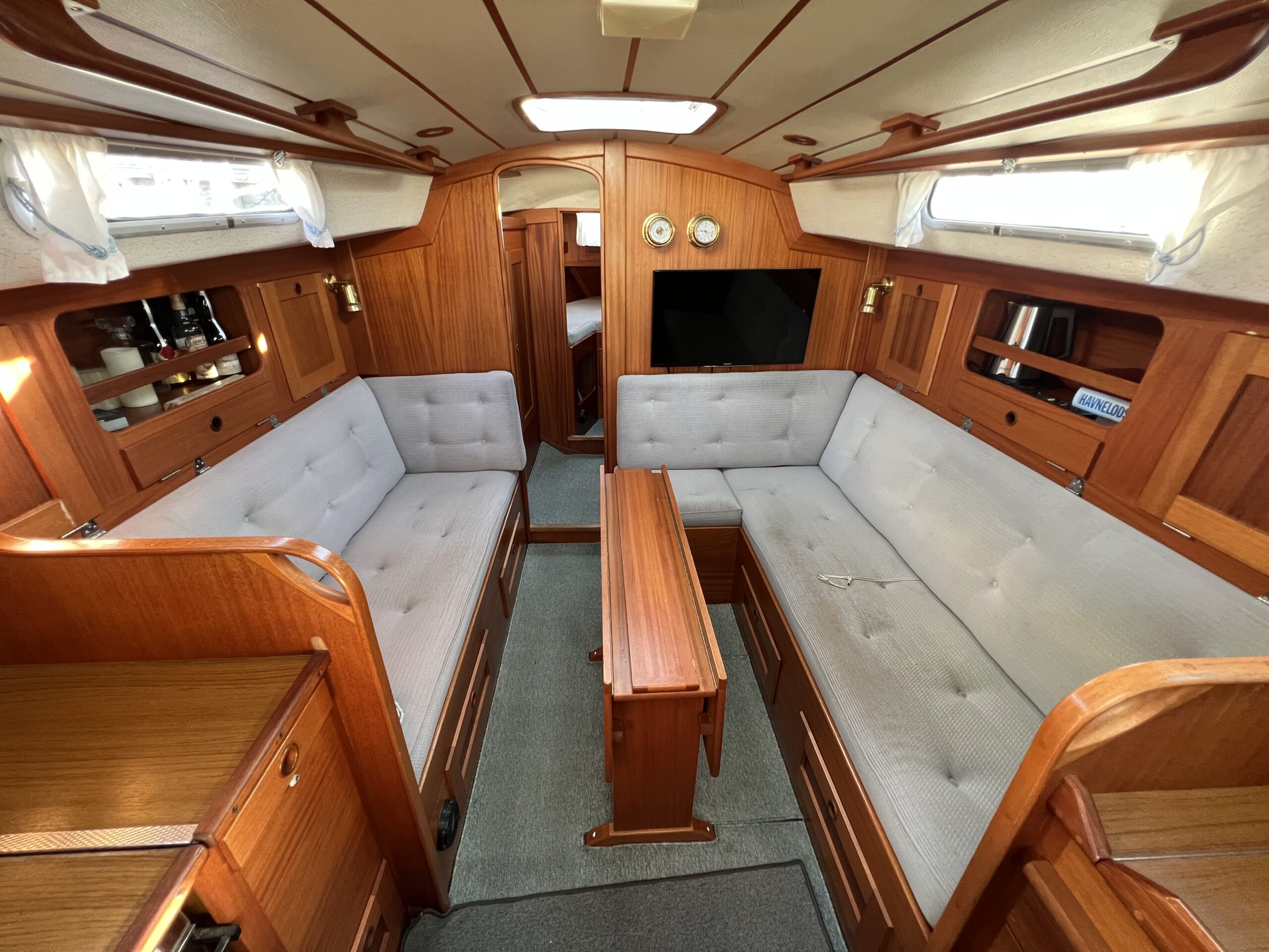 Nedgang til velindrettet salon med pantrysektion, kortbordsløsning og fin bred stikkøje. Sofagruppe med bordløsning (ejer har bordet i kælderen). Sofaer i begge sider har ryglæn der foldes op således at der etableres to skønne køjer. Fremme toiletrum, skabsløsning og forkahyt i traditionel V-format. (dør og hylder i begge sider ligeledes i ejers kælder) Bemærk den fine nye Volvo Penta D1-30 motor med KUN 21 timer, bovpropel samt opgraderingen på navigation og instrumenter. Teakdækket er i øvrigt fra 2007 og i rigtig fin stand. Ejeren elsker båden – har haft den i mange år, men drømmer om et skifte til en nyere kvalitetsmotorbåd – gerne en Nimbus 310 eller lign.