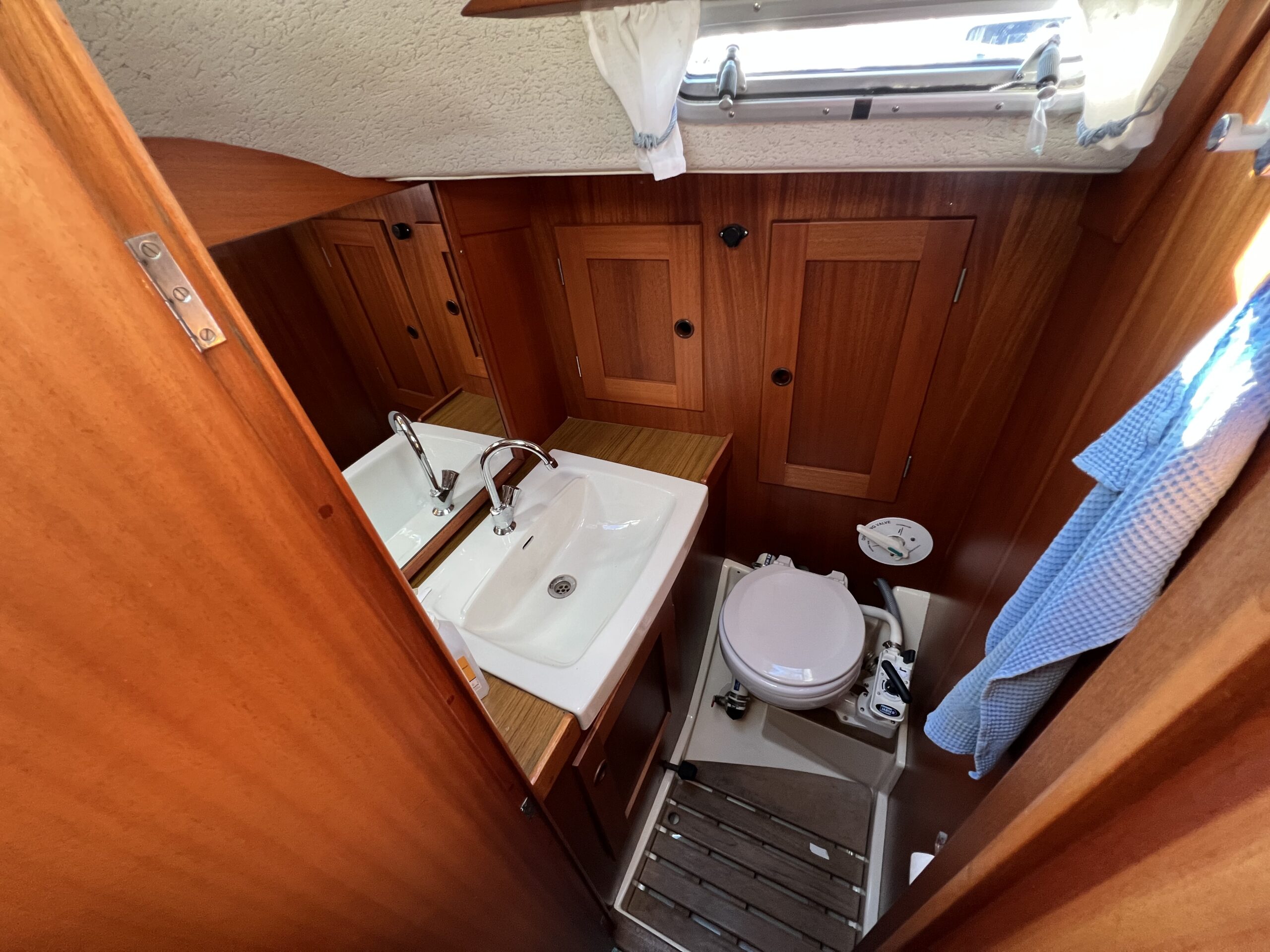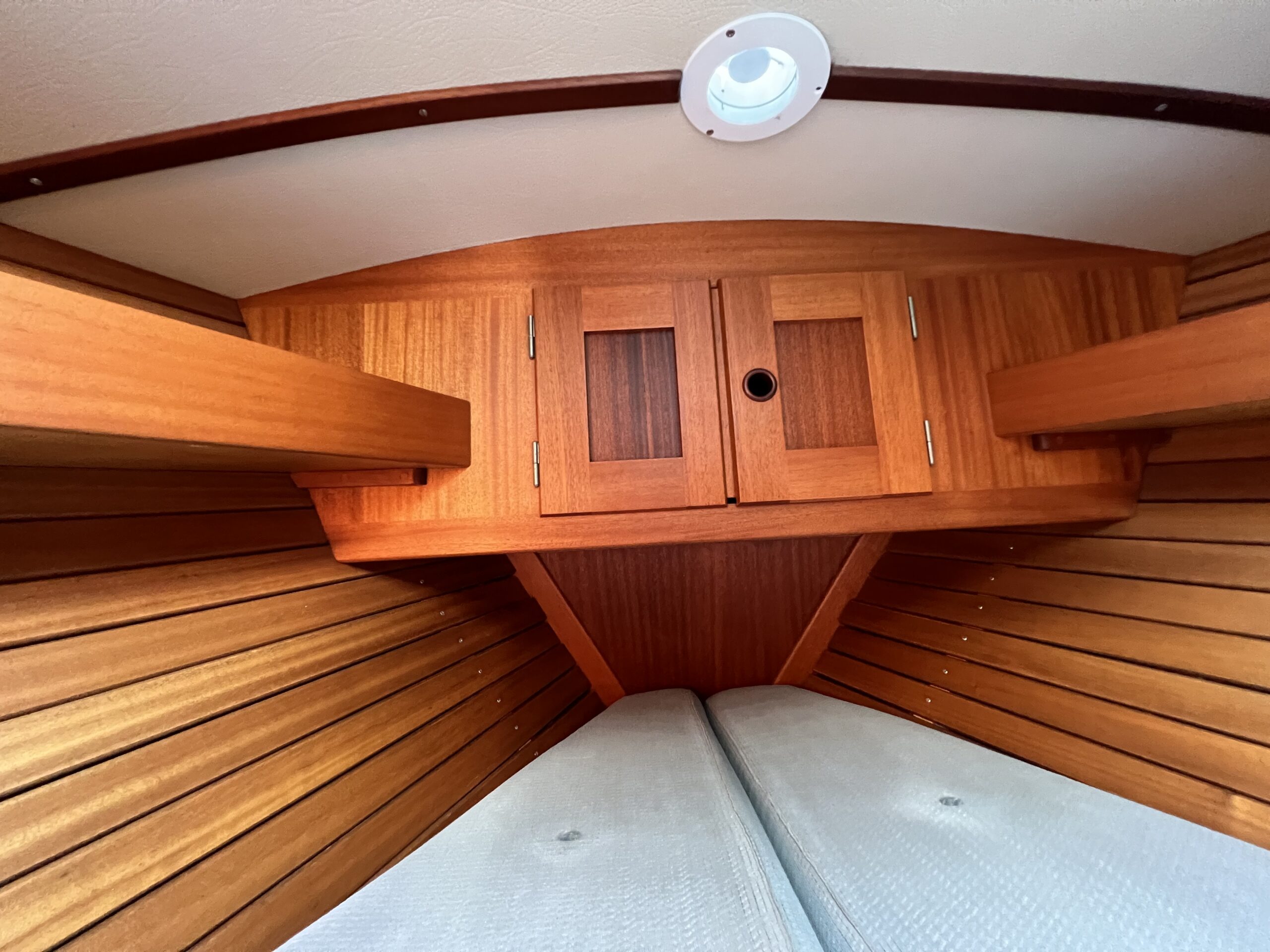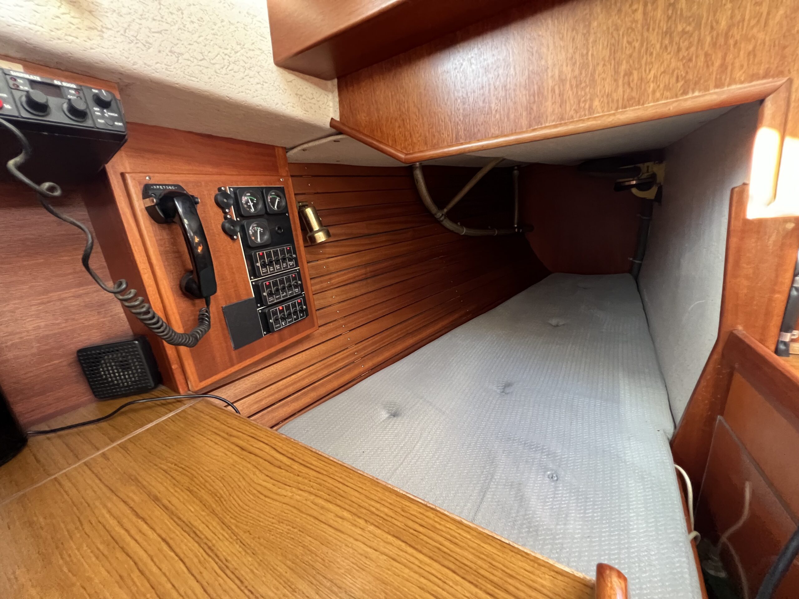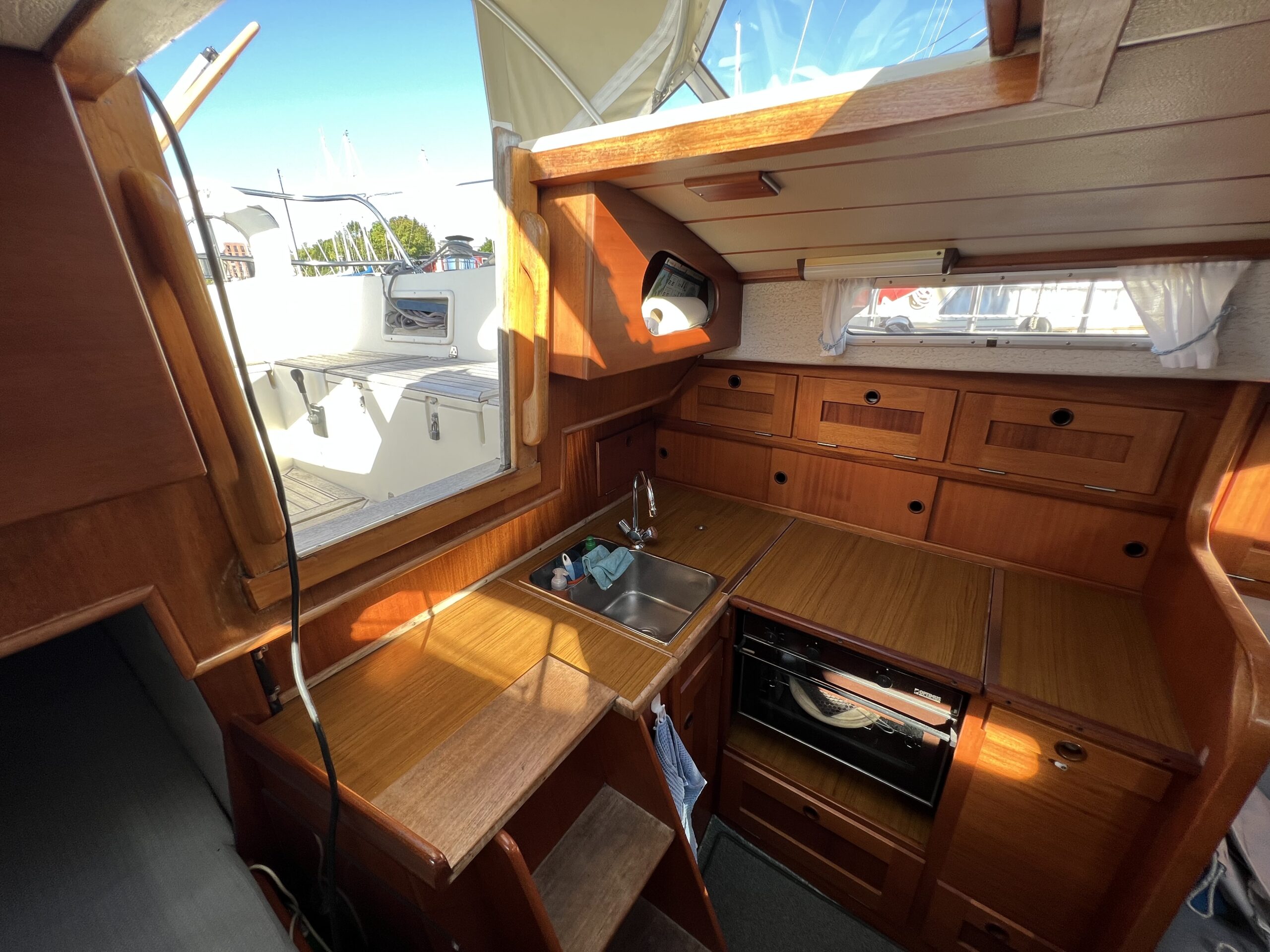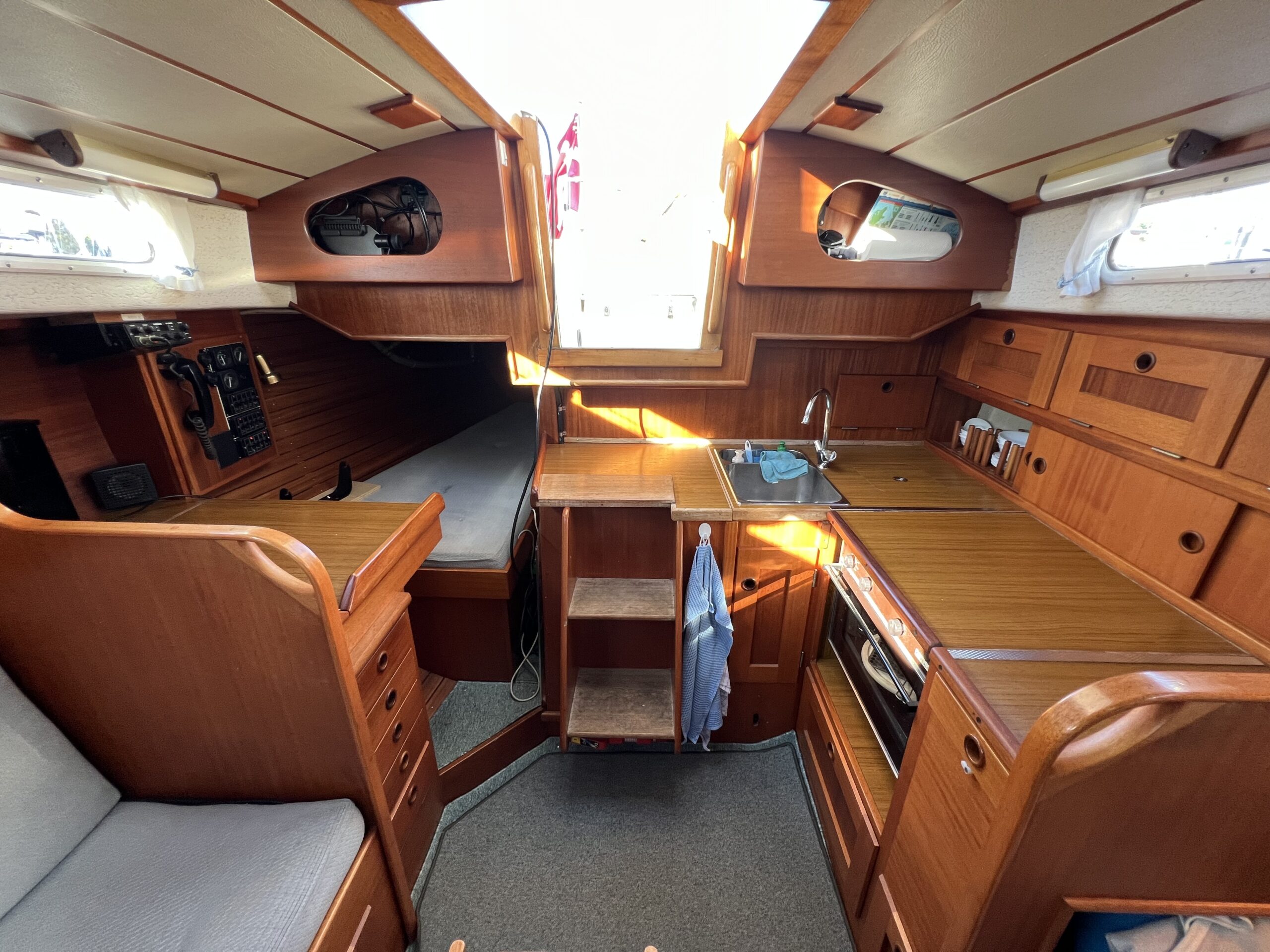 Nedgang til velindrettet salon med pantrysektion, kortbordsløsning og fin bred stikkøje. Sofagruppe med bordløsning (ejer har bordet i kælderen). Sofaer i begge sider har ryglæn der foldes op således at der etableres to skønne køjer. Fremme toiletrum, skabsløsning og forkahyt i traditionel V-format. (dør og hylder i begge sider ligeledes i ejers kælder) Bemærk den fine nye Volvo Penta D1-30 motor med KUN 21 timer, bovpropel samt opgraderingen på navigation og instrumenter. Teakdækket er i øvrigt fra 2007 og i rigtig fin stand. Ejeren elsker båden – har haft den i mange år, men drømmer om et skifte til en nyere kvalitetsmotorbåd – gerne en Nimbus 310 eller lign.