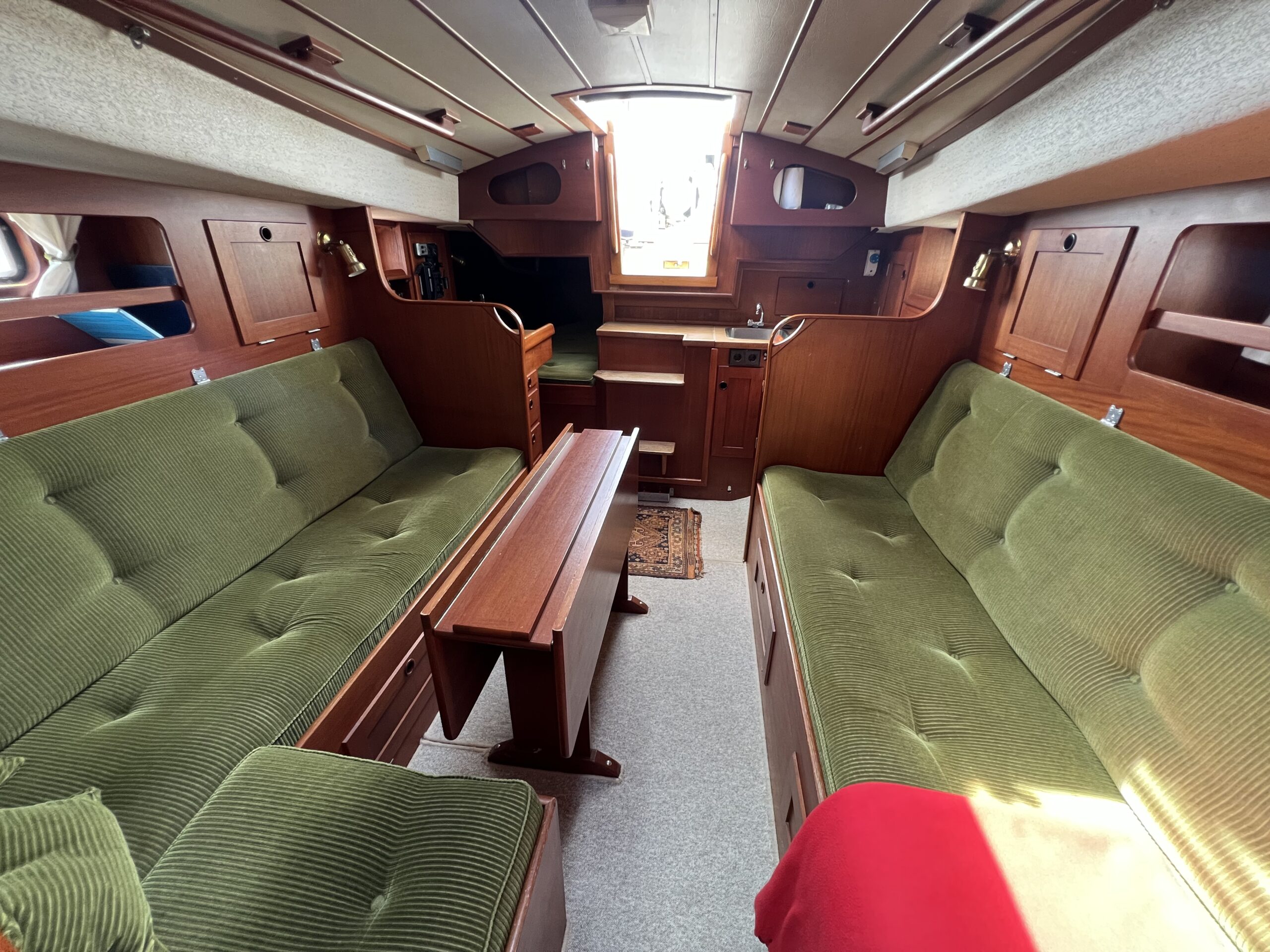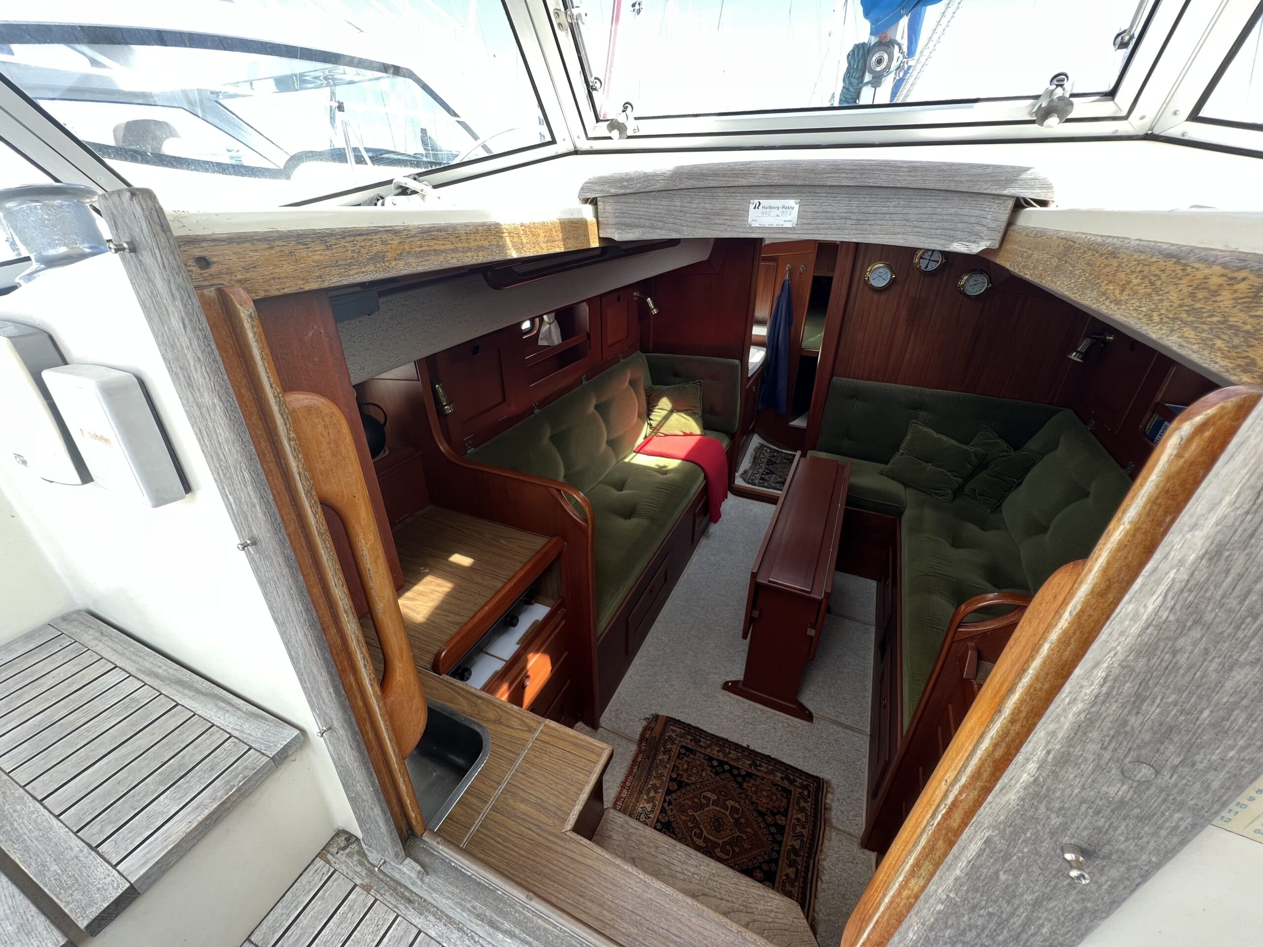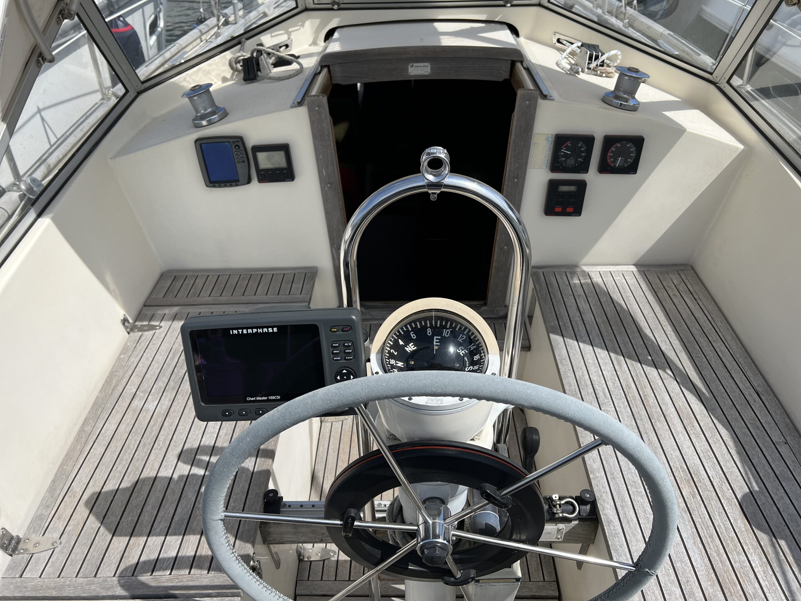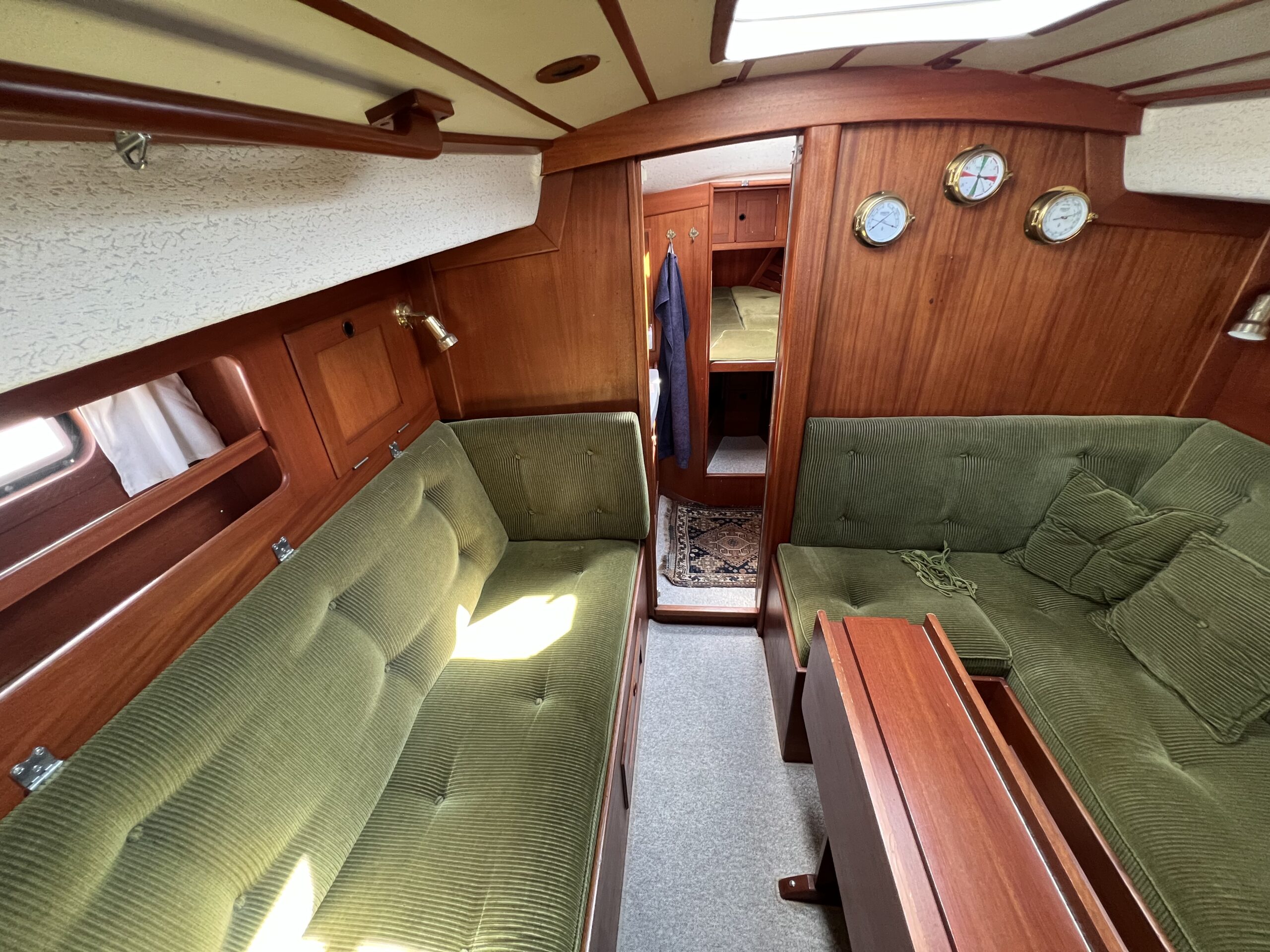 Enkelt agter køje i SB side sammen med kort bord. Sofaarrangement med to langsgående sofaer som kan omgøres til to voksenkøjer. Fremme toiletrum med vaskmodul, Forkøje med dobbelt soveplads. En virkelig velfungerende sejlbåd med flot aptering og nyere Volvo penta D2-40F Motor og sejldrev. Bemærk Ratstyring, Wallas varmeanlæg og fuld teak dæk – hvad kan man ønske sig mere ?’ Båden kan ses i Skovshoved. besigtigelse aftales med Dansk Sejl og Motor 77 340 828