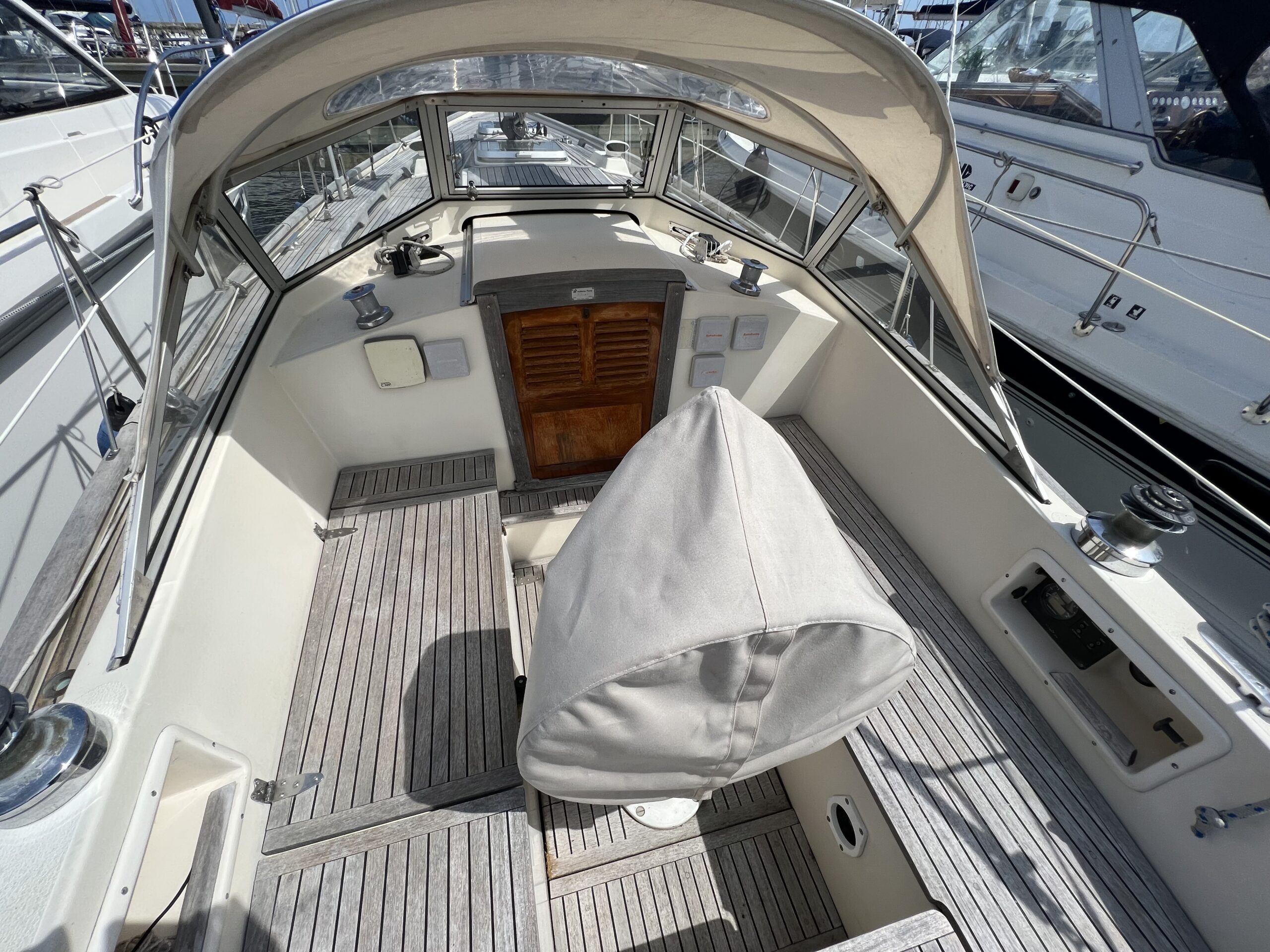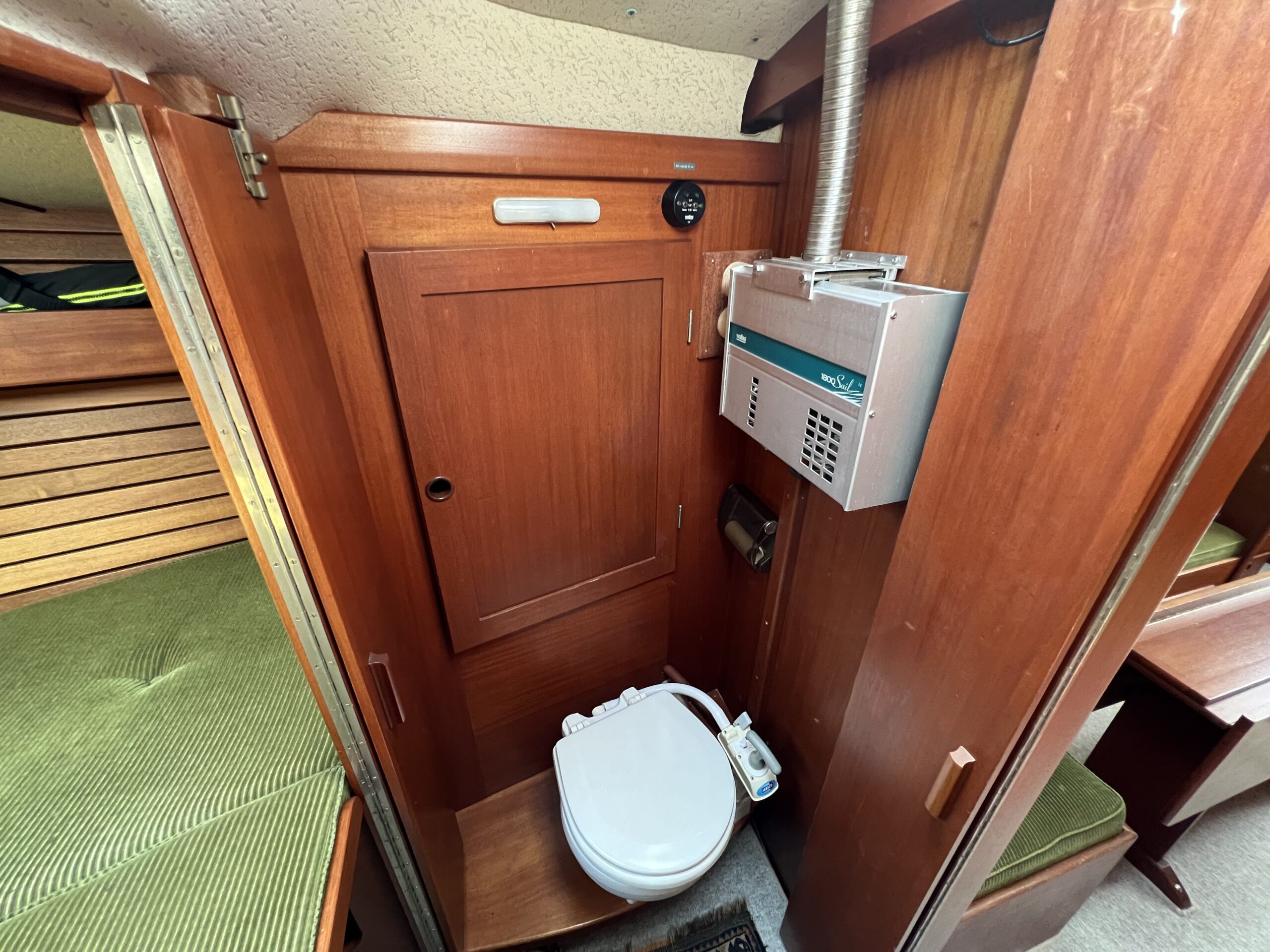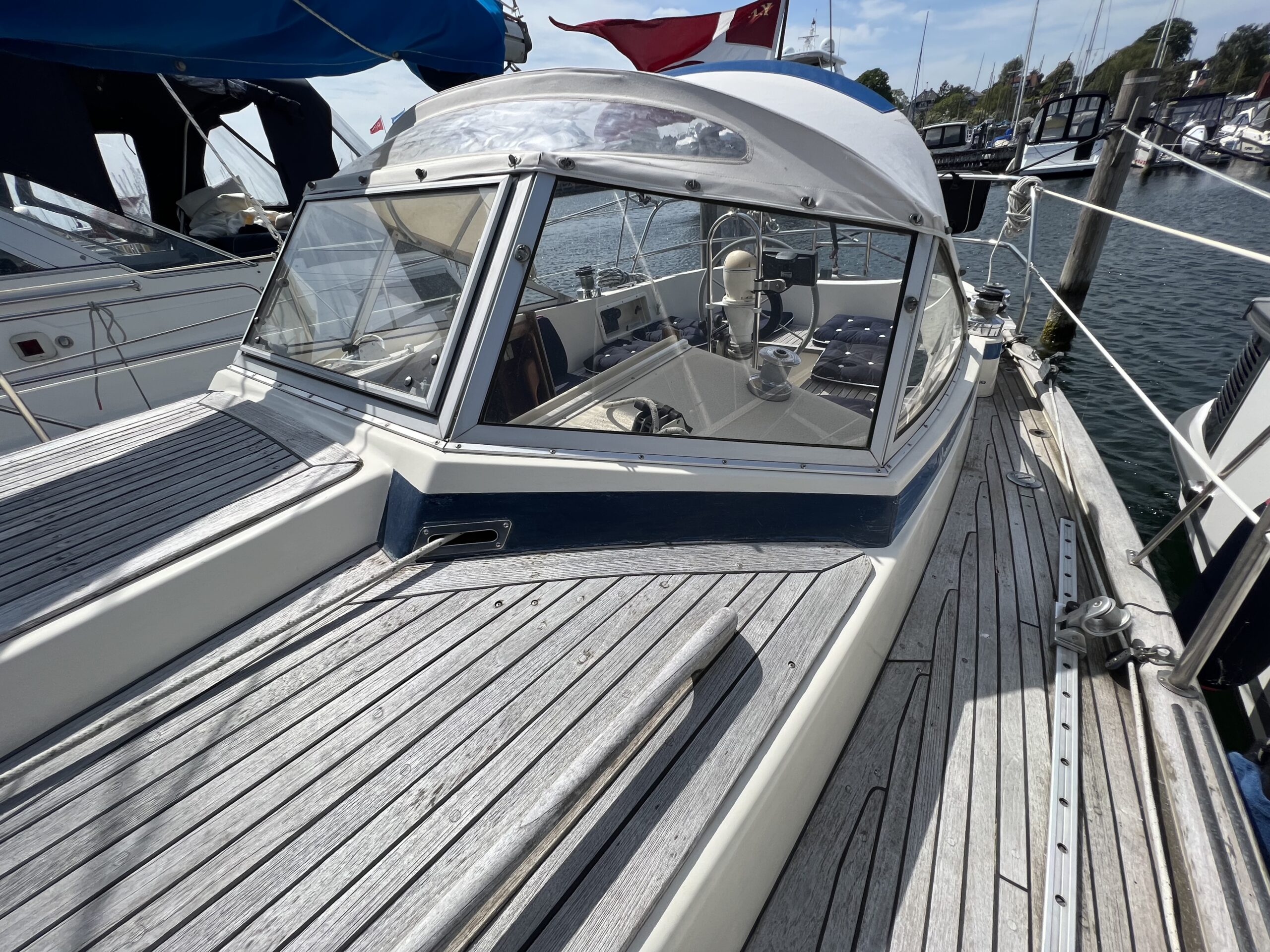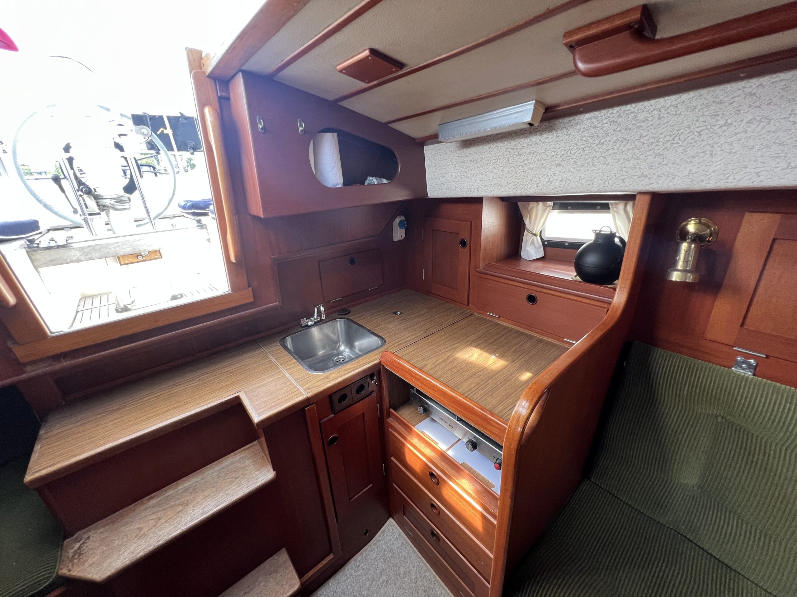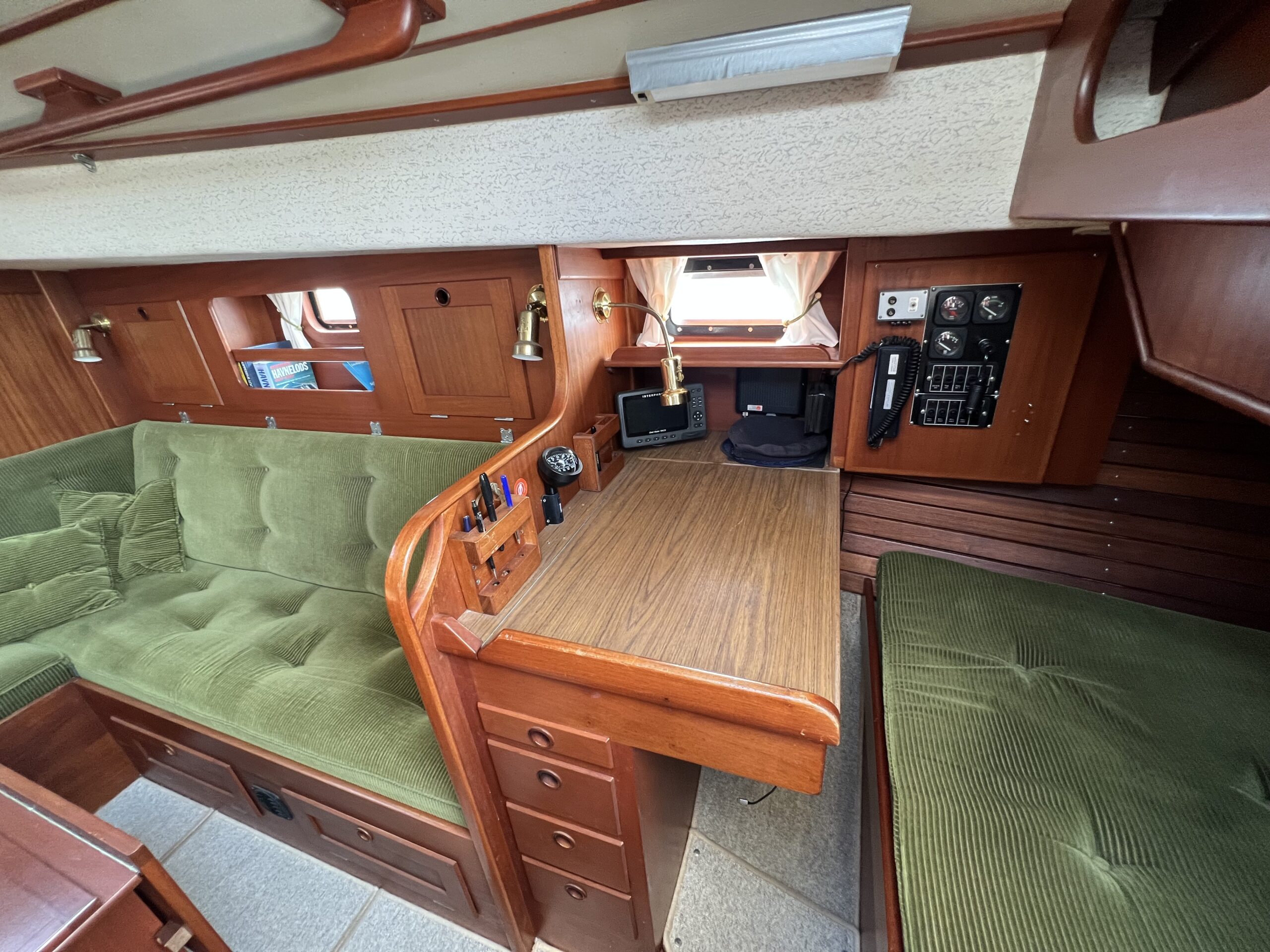 Enkelt agter køje i SB side sammen med kort bord. Sofaarrangement med to langsgående sofaer som kan omgøres til to voksenkøjer. Fremme toiletrum med vaskmodul, Forkøje med dobbelt soveplads. En virkelig velfungerende sejlbåd med flot aptering og nyere Volvo penta D2-40F Motor og sejldrev. Bemærk Ratstyring, Wallas varmeanlæg og fuld teak dæk – hvad kan man ønske sig mere ?’ Båden kan ses i Skovshoved. besigtigelse aftales med Dansk Sejl og Motor 77 340 828