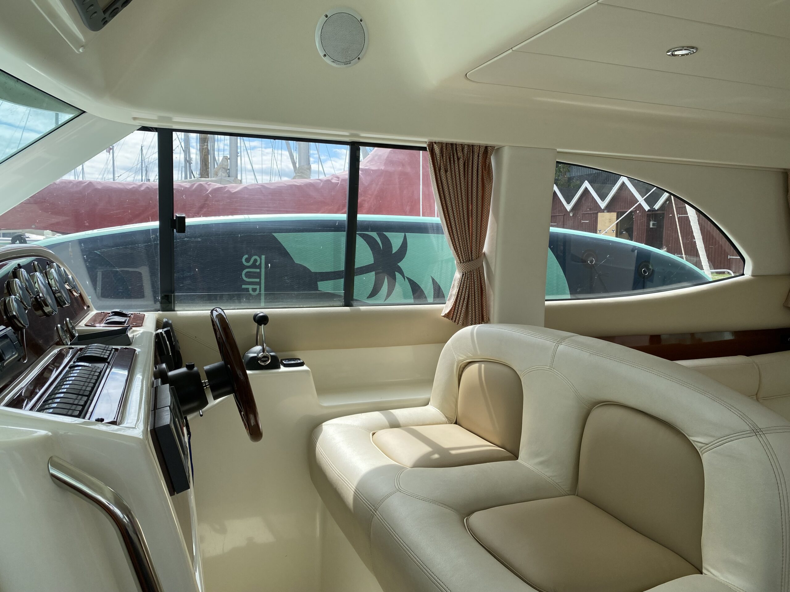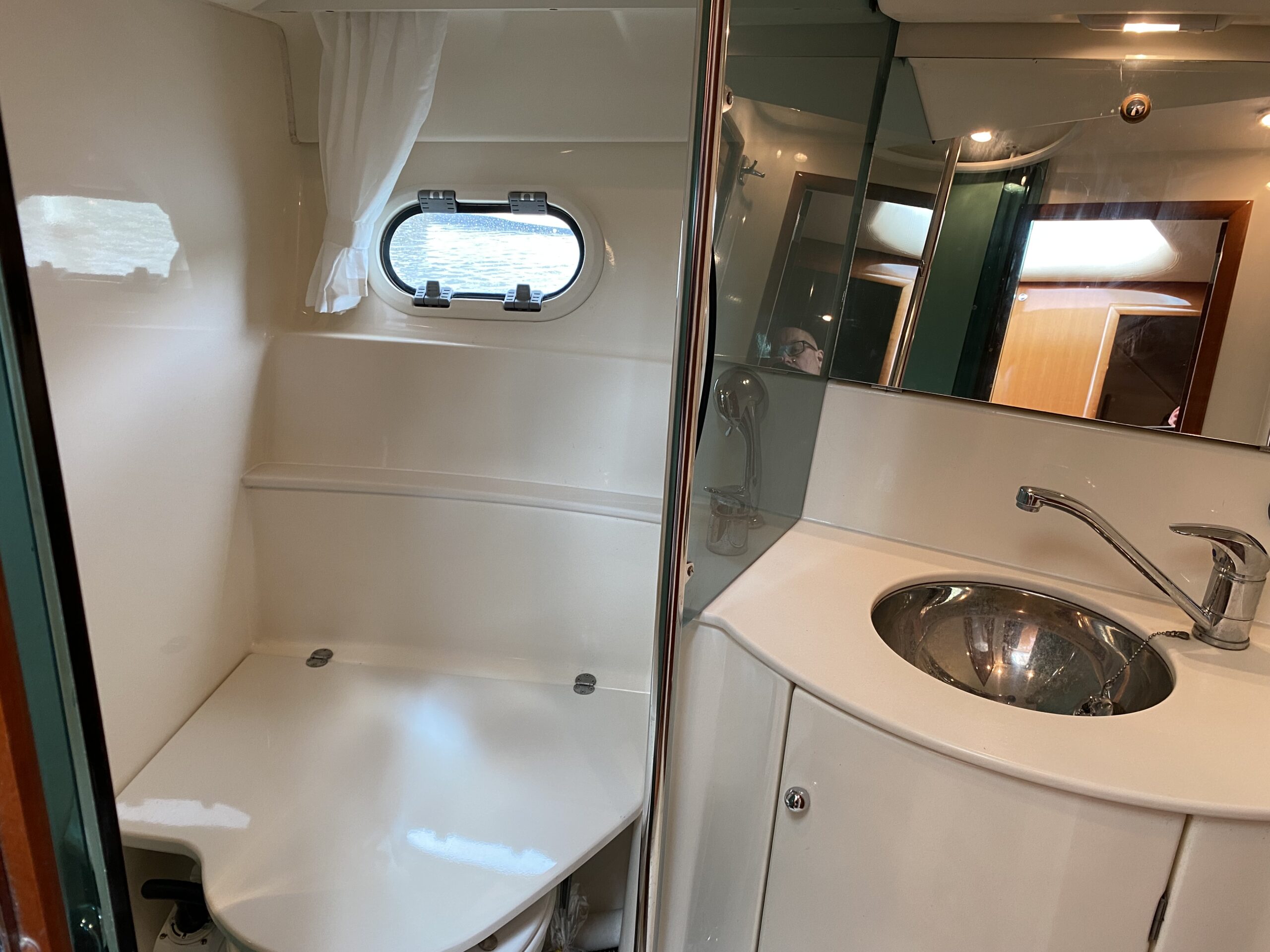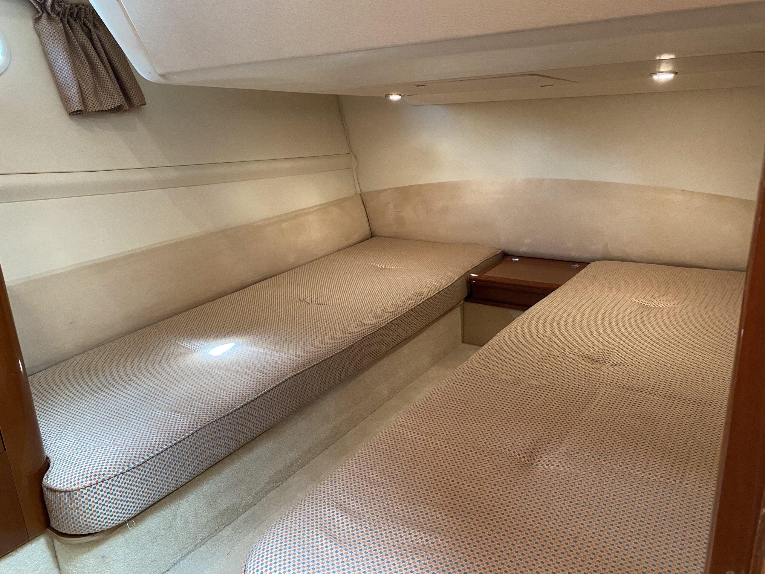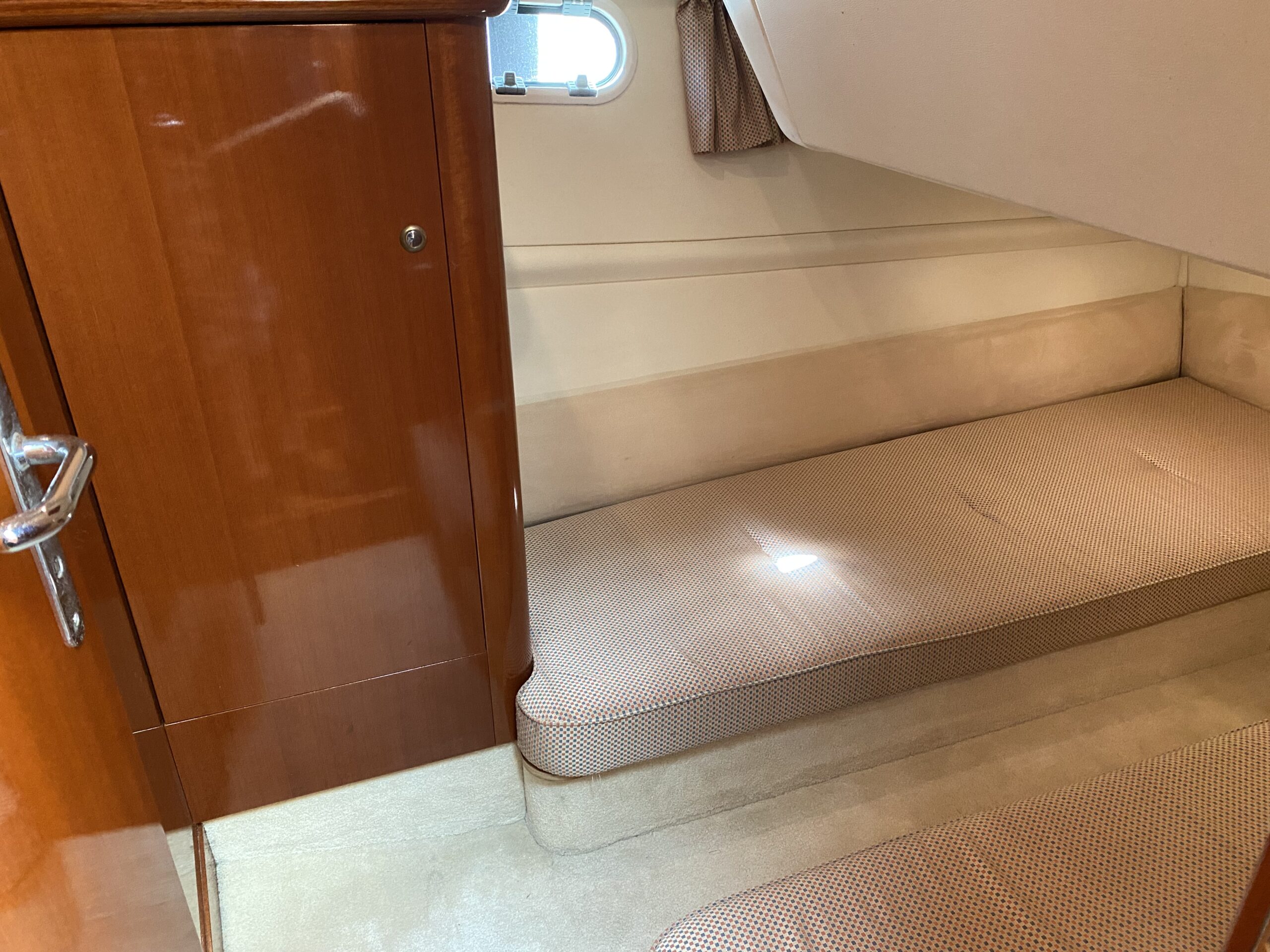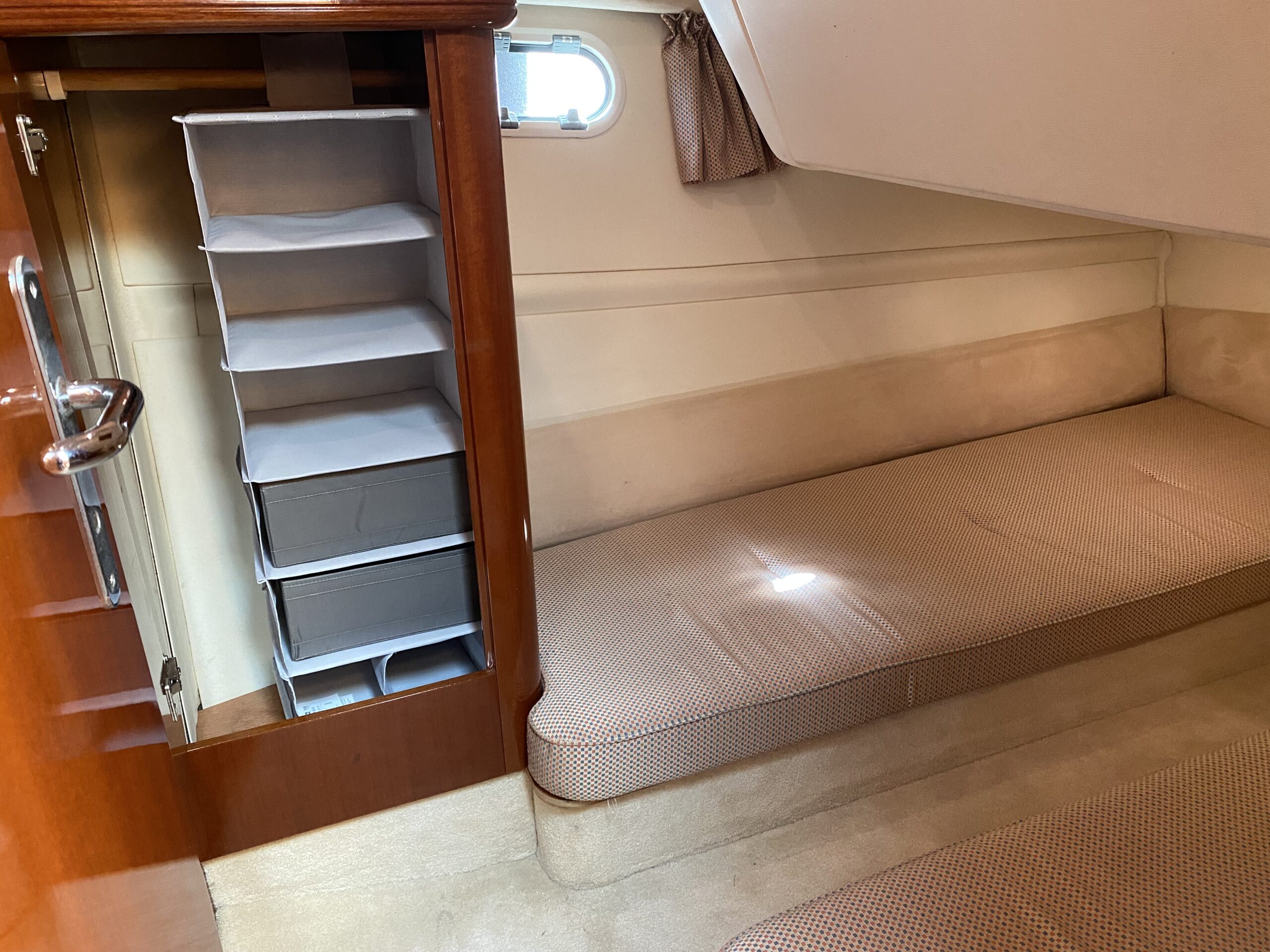 Overfor pantryet er gæstekahytten. Rigtig fin størrelse med to langsgående køjer, klædeskab, små skabe, lille natbord mellem køjerne og koøje som kan åbnes. I dækssalonens styrbord side er den indvendige førerplads placeret. En bred dobbeltstol giver god komfort med fin plads. Førerpladsen fungerer fantastisk og der er godt med plads til to personer. Ringdækker er bredt og der er et velfungerende søgelænder på for- og sidedækket, Udstyrsmæssigt er der intet der kan eftermonteres på denne båd for den har alt hvad du har brug for – standen er absolut i top og den er velpasset af de to ejere der har haft båden.