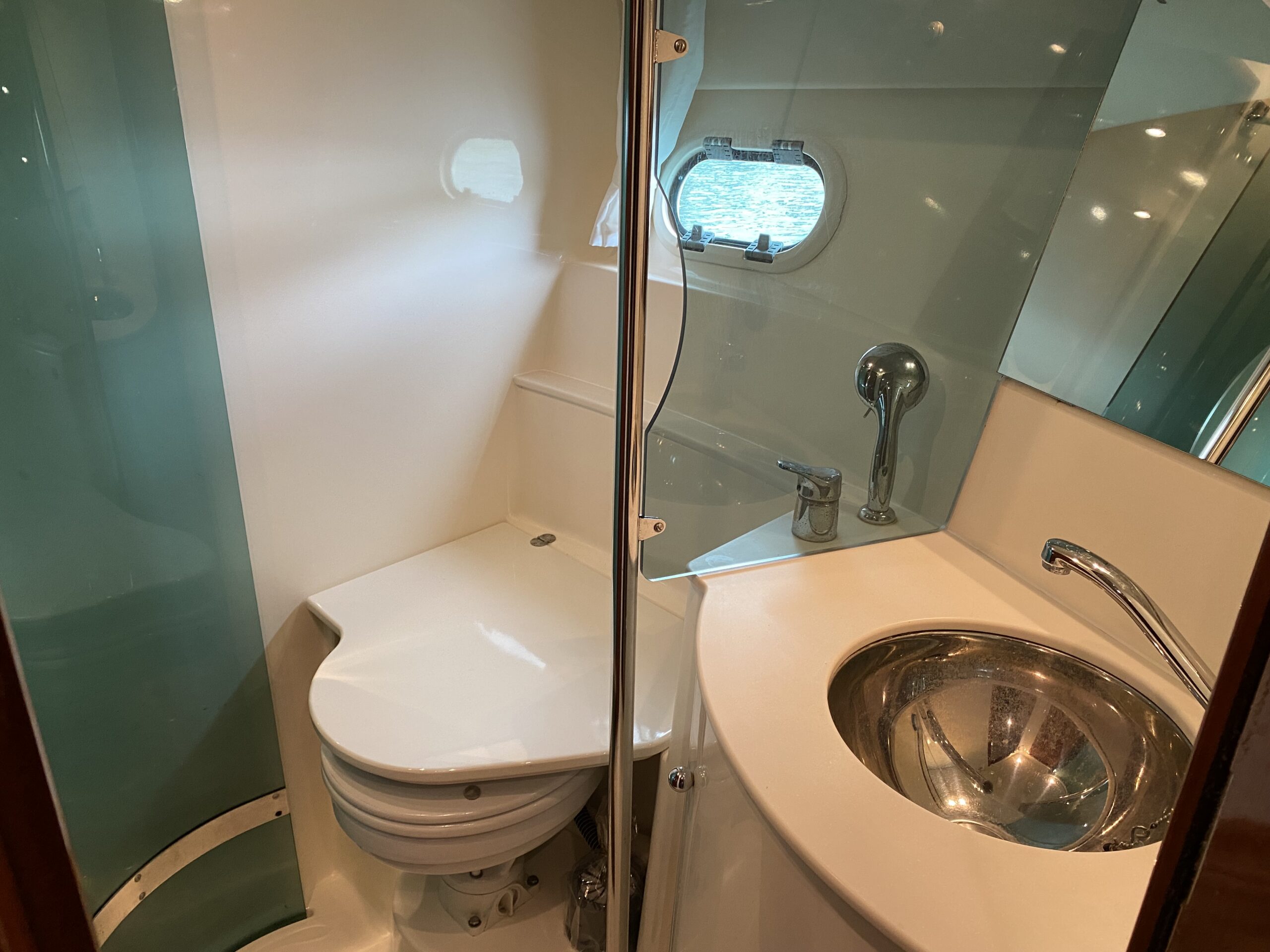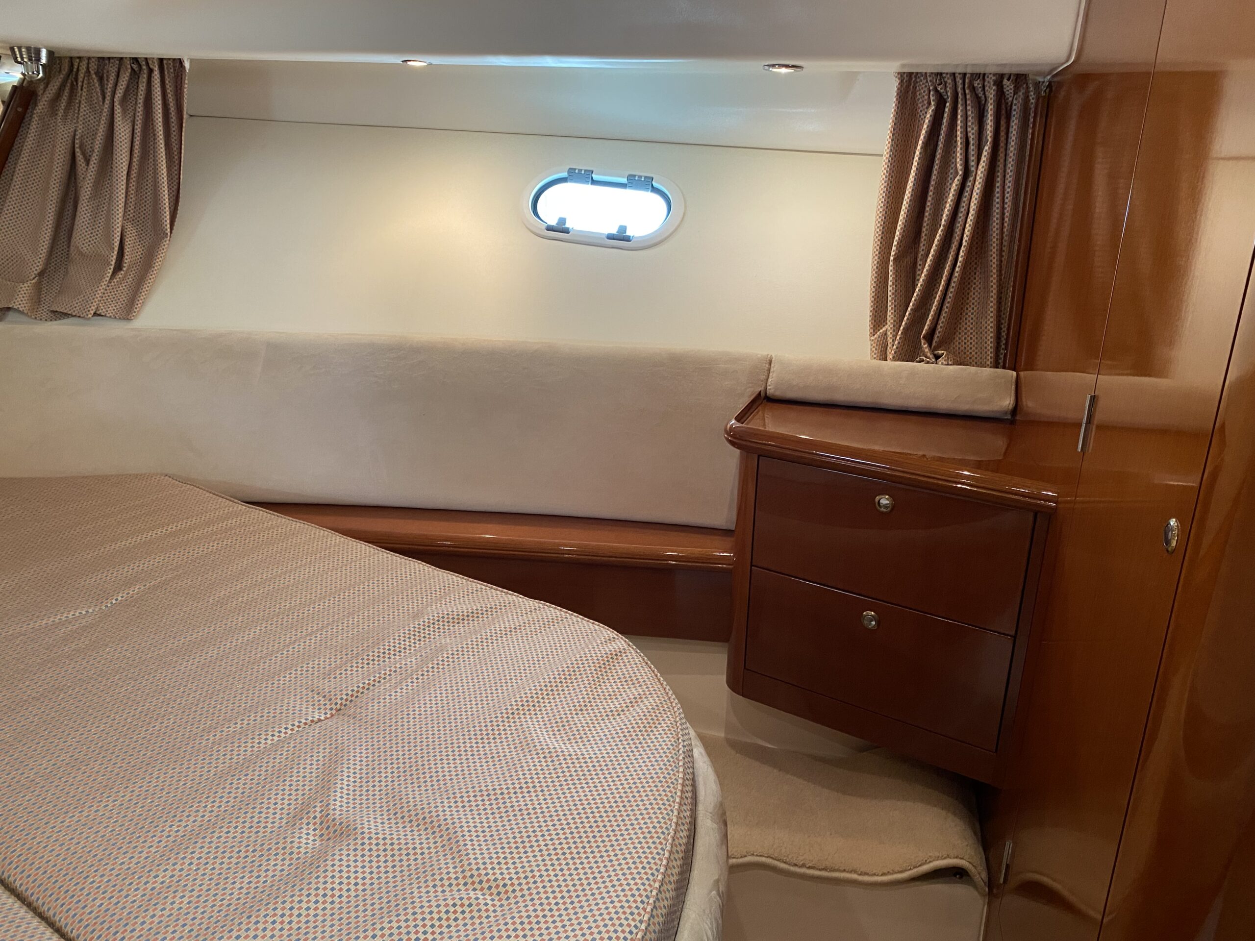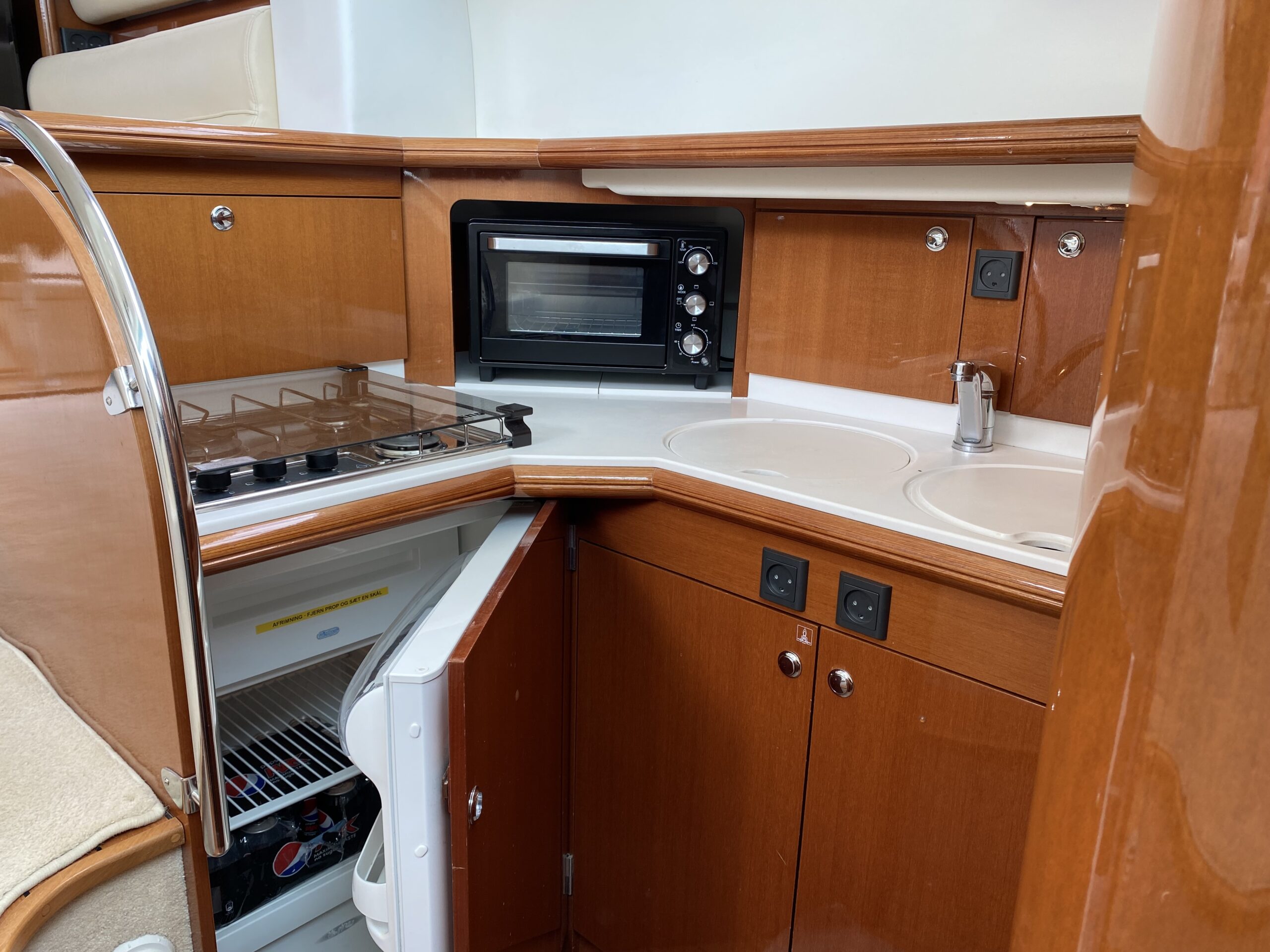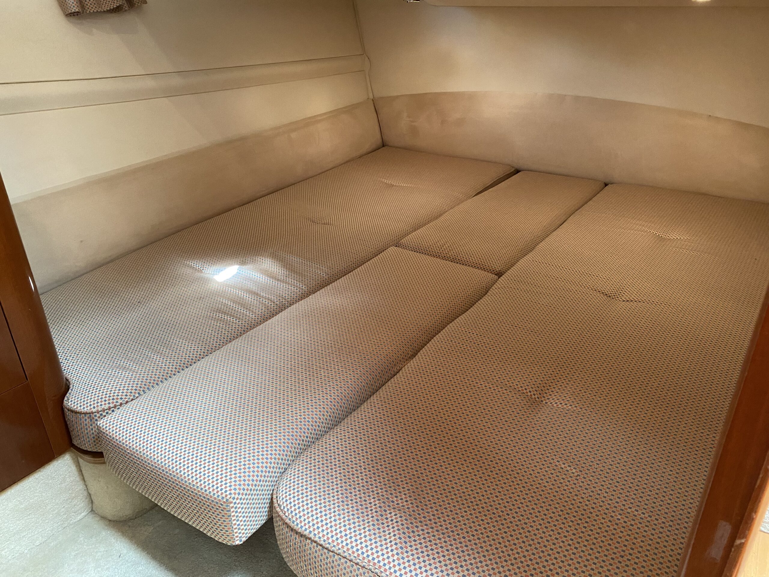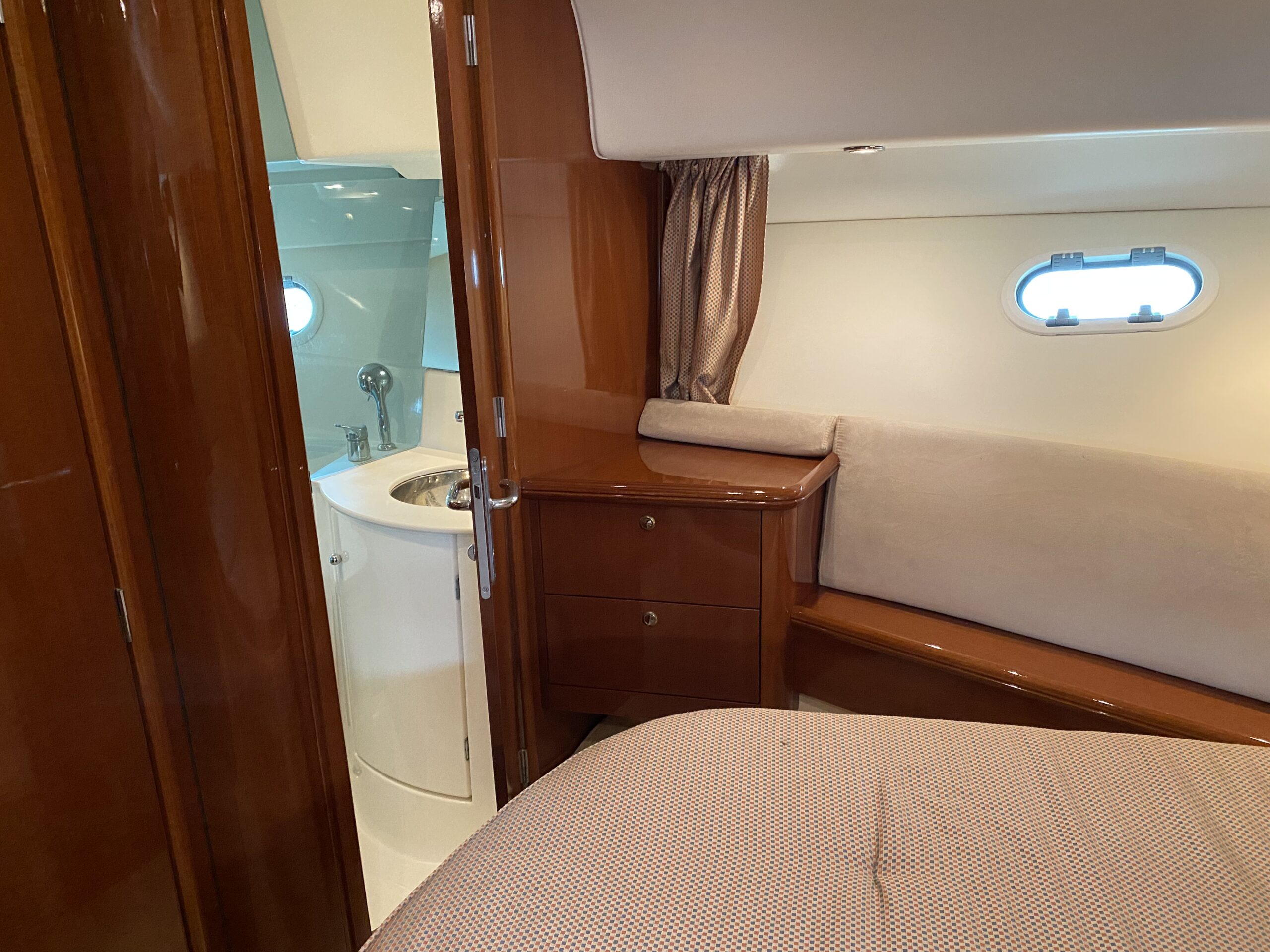 Overfor pantryet er gæstekahytten. Rigtig fin størrelse med to langsgående køjer, klædeskab, små skabe, lille natbord mellem køjerne og koøje som kan åbnes. I dækssalonens styrbord side er den indvendige førerplads placeret. En bred dobbeltstol giver god komfort med fin plads. Førerpladsen fungerer fantastisk og der er godt med plads til to personer. Ringdækker er bredt og der er et velfungerende søgelænder på for- og sidedækket, Udstyrsmæssigt er der intet der kan eftermonteres på denne båd for den har alt hvad du har brug for – standen er absolut i top og den er velpasset af de to ejere der har haft båden.