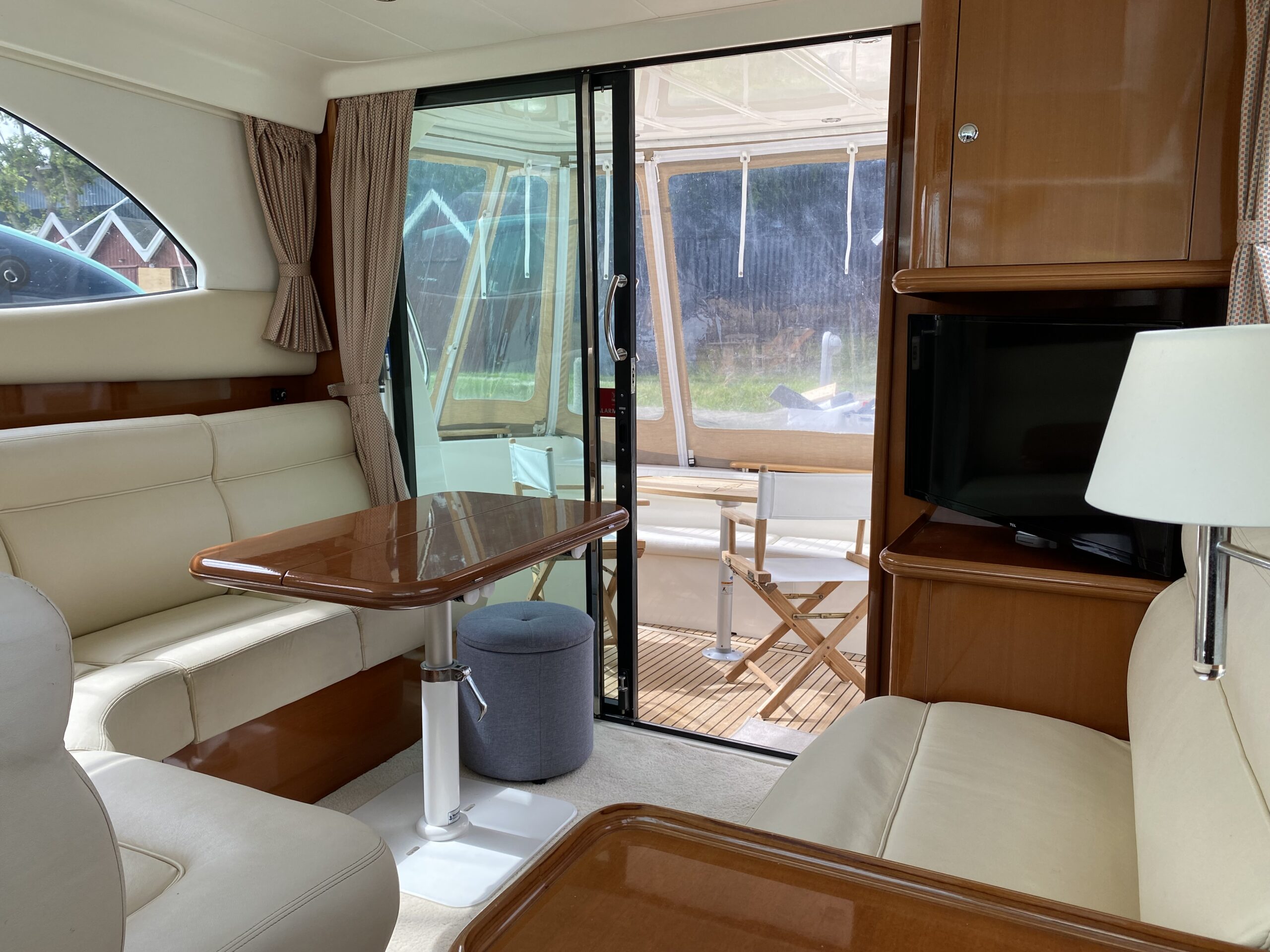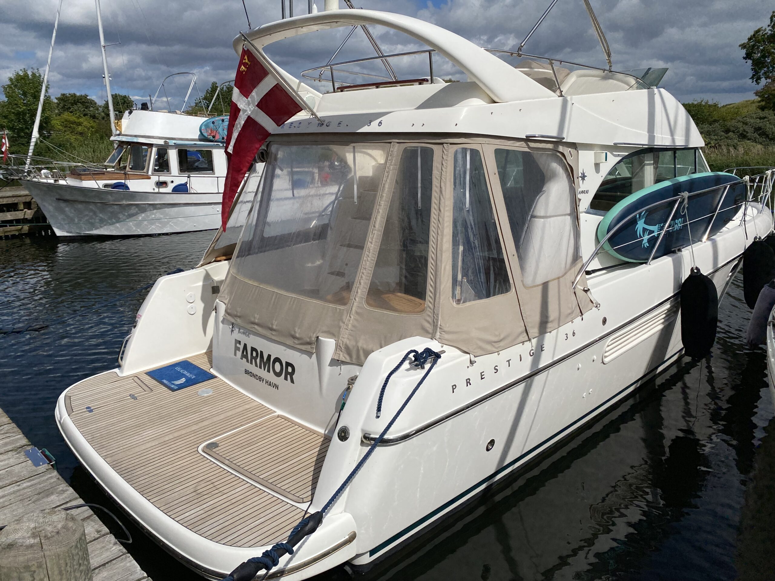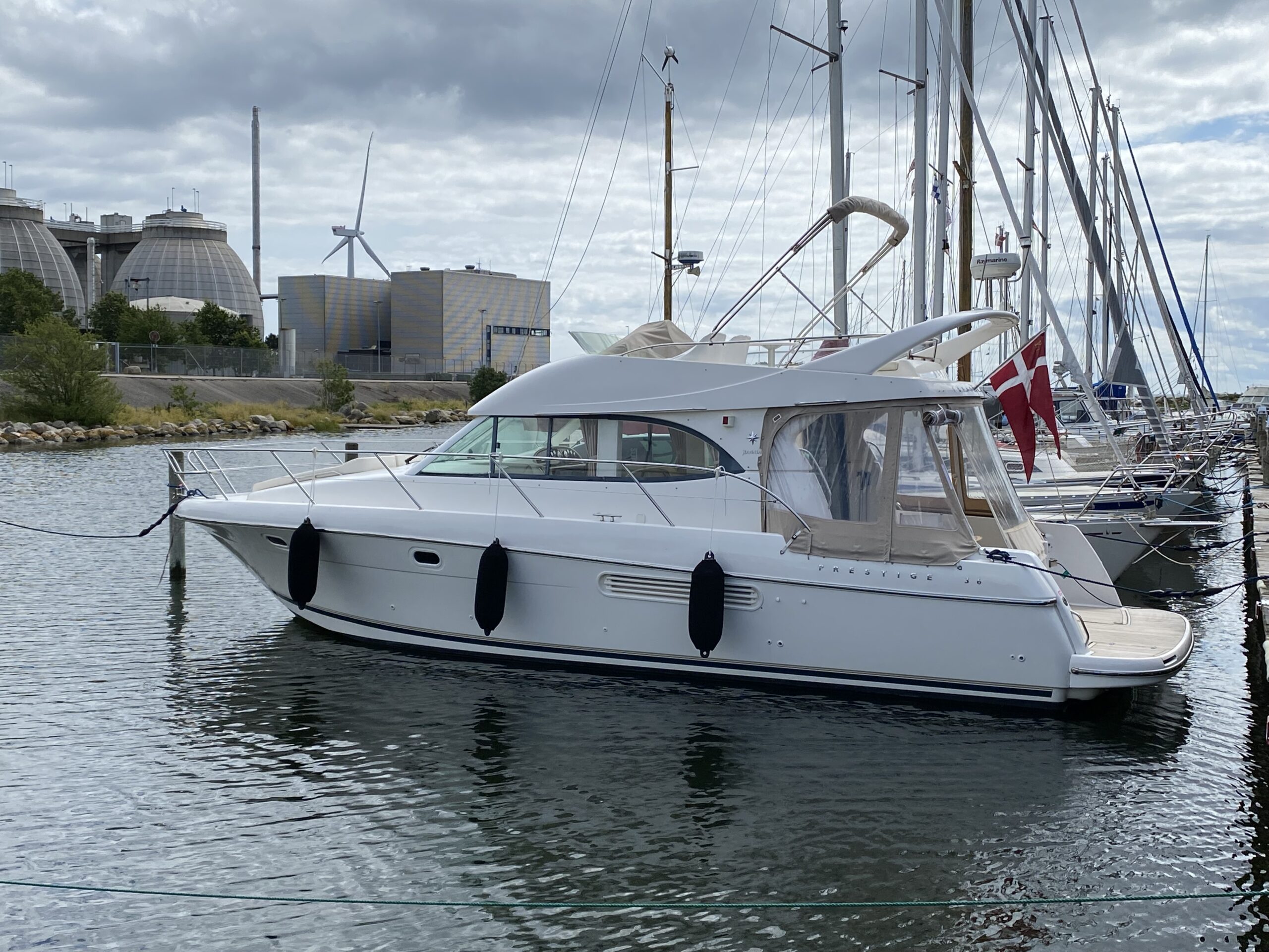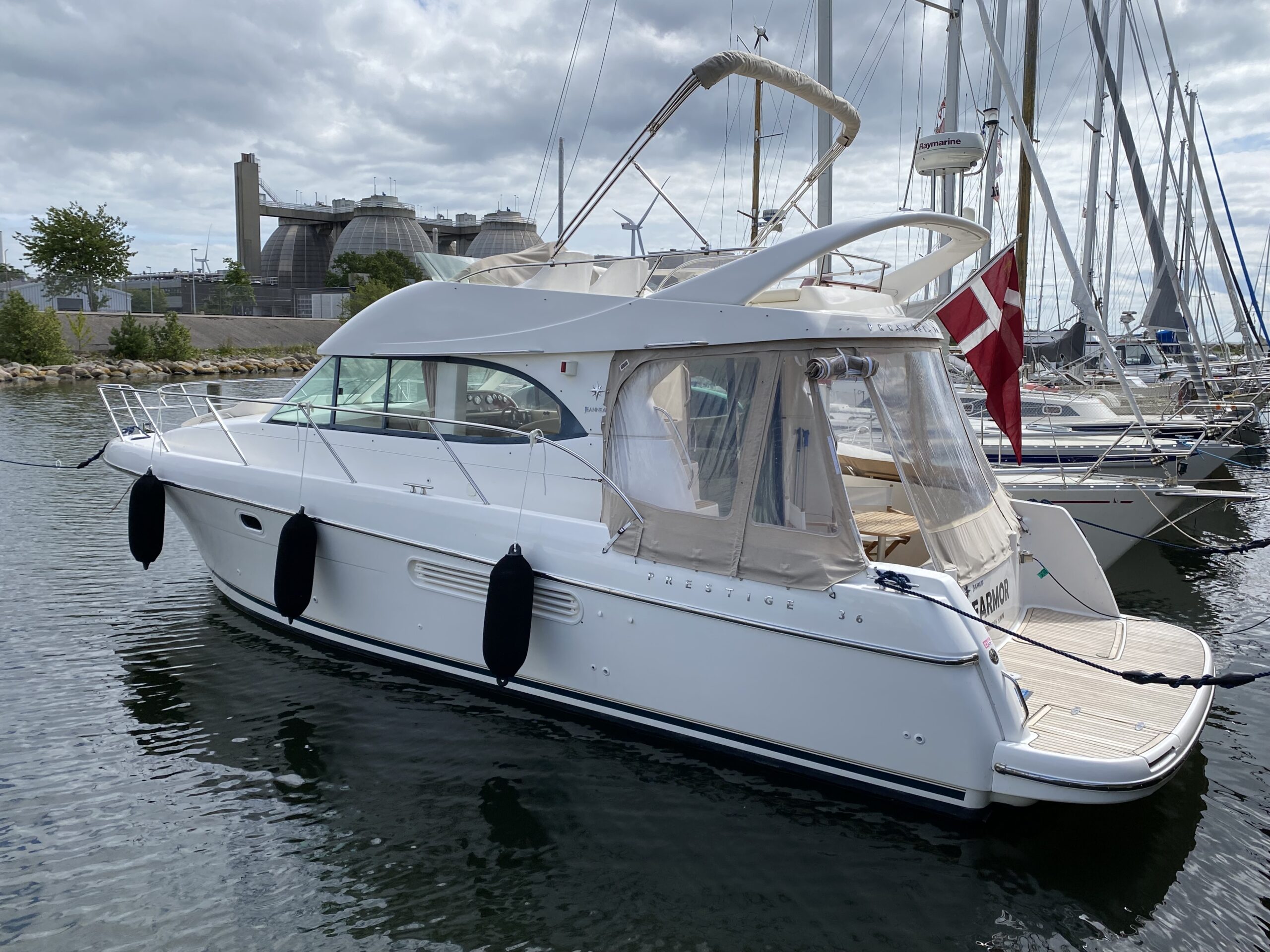 Jeanneau 36 Prestige er en stor velbygget flybridgebåd fra et af verdens største værft. Båden er velsejlende og velindrettet til familien som ønsker plads, komfort og sikker sejlads. En fantastisk turbåd til fire personer som leverer komfort også på de lange ture. Den føles sikker, tung og stabil hele vejen – også i skarpe sving. Båden cruiser meget behageligt, harmonisk og med mere graciøse bevægelser end mange af konkurrenterne – selv i regn og blæst. Båden har en dejlig stor, rektangulær badeplatform med badestige og brusemulighed. Adgangsdør til agterdækket med gode stuverum. Både badeplatform og dørk samt trappe er teakbelagt. Flybridgen er trukket et godt stykke agterover og med kalechen giver den en god beskyttelse af agterdækket. Her er god plads og kan byde hele familien velkommen. Adgang til flybridge via den faste trappe. Her er to pilotstole, stort instrumentbord og L-sofa med bord samt god solmulighed. Fra agterdækket er der via stor rustfri skydedør adgang til hovedsalonen. Her er lækker stor L-formet sofa med god plads til 4-5 personer. I bagbord side er der yderligere en topersoners sofa. Dækssalonen er meget elegant, der er cremefarvet handskeskind på førerstol og sofaer. Alt er lyst og lækkert med en flot imponerende træapteringen i mahogny. Et lækkert salonbord med klapper således at de to sofaer kan indgå i fælles hygge omkring bordet. I hver side er der skydevinduer og det L-formede pantry er placeret to trin nede, forude i bagbord side. Her er to vaske i rustfrit stål, miniovn, tre-blus gaskomfur, stort køleskab med frys og store og små skabe. Mellem pantry og forkahytten er toiletrummet. Det er meget funktionelt, helstøbt og med skydeglasvæg til bruserummet. Der er to døre – den ene direkte til ”owners cabin” fremme i båden. Forkahytten har en stor, fritstående dobbeltseng med god plads rundt om. Lys og ventilation kommer ind ad dækslugen og to ovale, oplukkelige koøjer. Der er mange stuverum og et stort klædeskab.