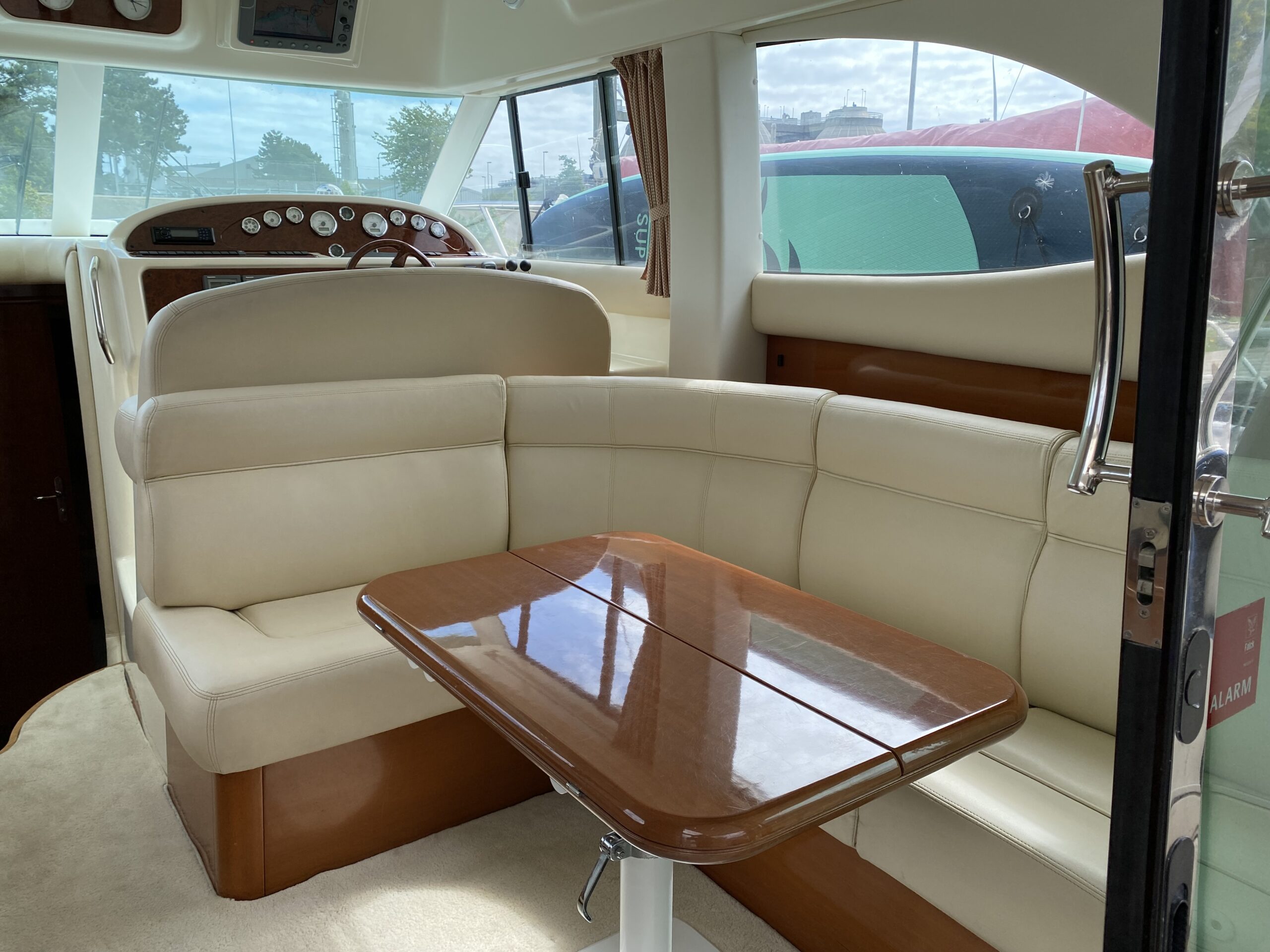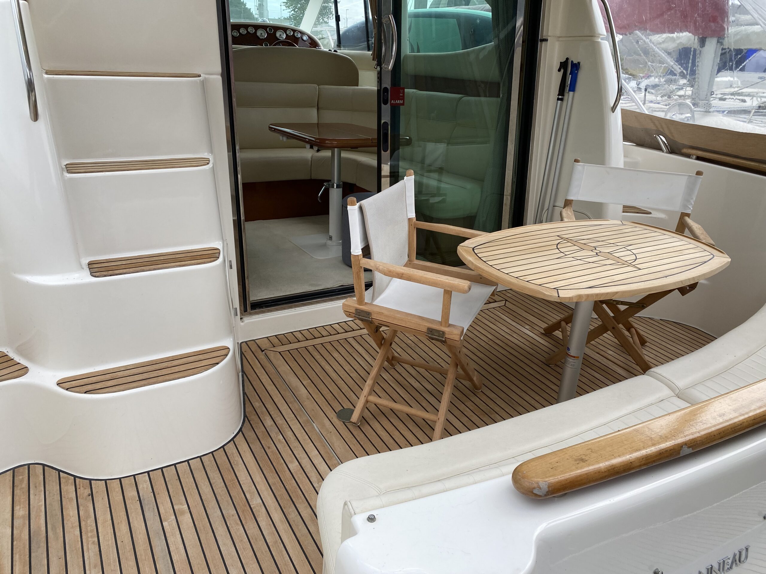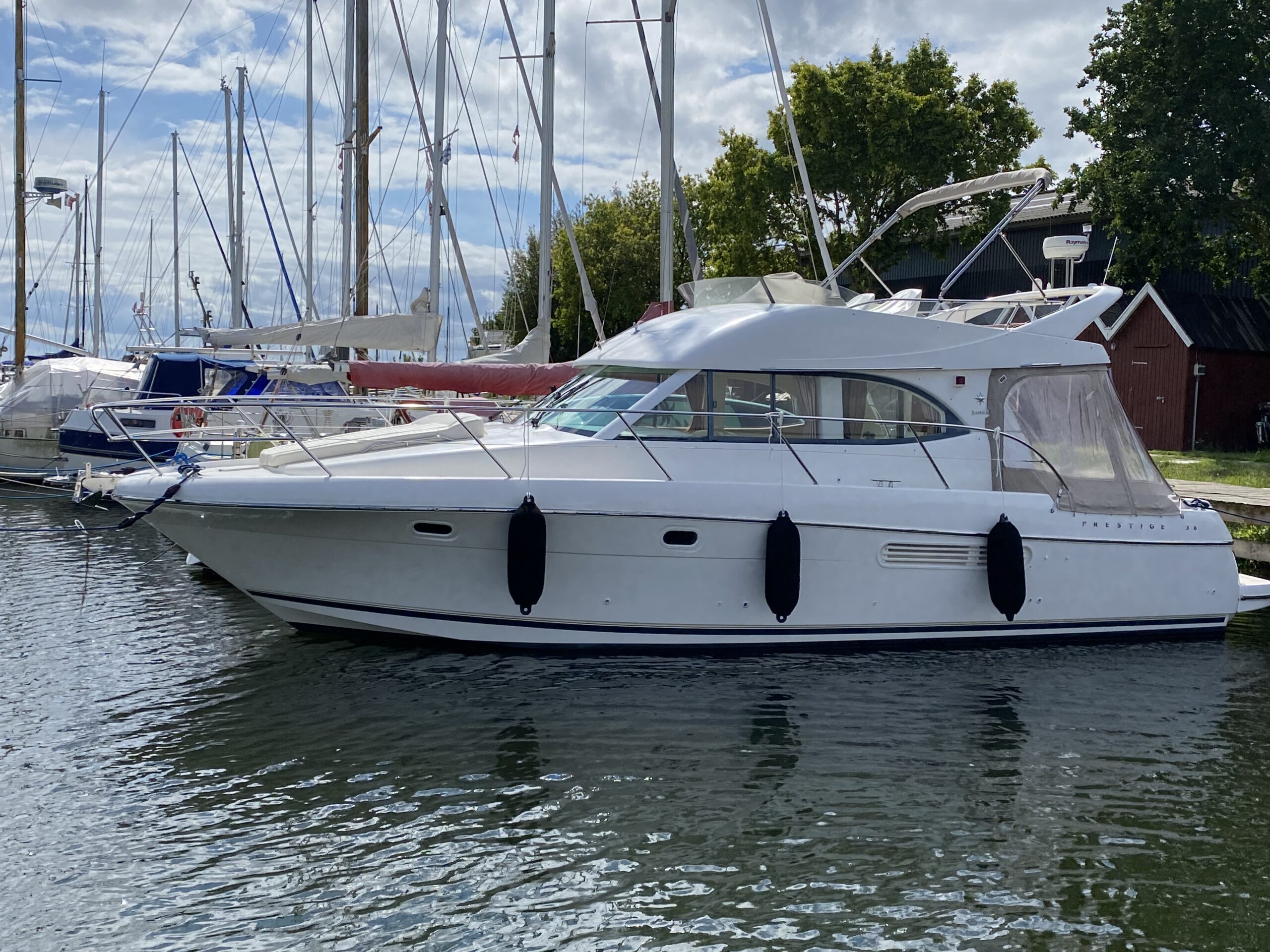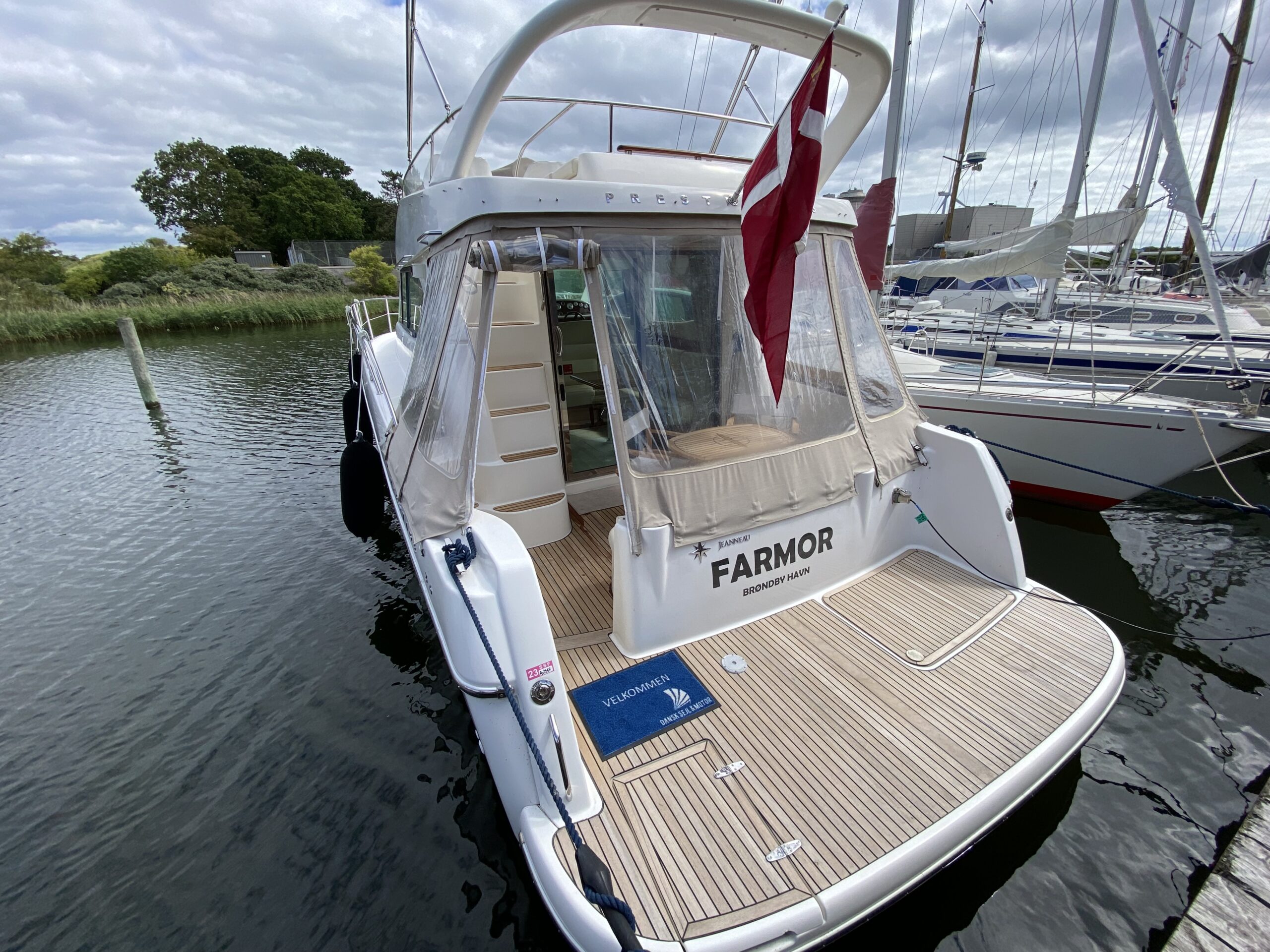 Jeanneau 36 Prestige er en stor velbygget flybridgebåd fra et af verdens største værft. Båden er velsejlende og velindrettet til familien som ønsker plads, komfort og sikker sejlads. En fantastisk turbåd til fire personer som leverer komfort også på de lange ture. Den føles sikker, tung og stabil hele vejen – også i skarpe sving. Båden cruiser meget behageligt, harmonisk og med mere graciøse bevægelser end mange af konkurrenterne – selv i regn og blæst. Båden har en dejlig stor, rektangulær badeplatform med badestige og brusemulighed. Adgangsdør til agterdækket med gode stuverum. Både badeplatform og dørk samt trappe er teakbelagt. Flybridgen er trukket et godt stykke agterover og med kalechen giver den en god beskyttelse af agterdækket. Her er god plads og kan byde hele familien velkommen. Adgang til flybridge via den faste trappe. Her er to pilotstole, stort instrumentbord og L-sofa med bord samt god solmulighed. Fra agterdækket er der via stor rustfri skydedør adgang til hovedsalonen. Her er lækker stor L-formet sofa med god plads til 4-5 personer. I bagbord side er der yderligere en topersoners sofa. Dækssalonen er meget elegant, der er cremefarvet handskeskind på førerstol og sofaer. Alt er lyst og lækkert med en flot imponerende træapteringen i mahogny. Et lækkert salonbord med klapper således at de to sofaer kan indgå i fælles hygge omkring bordet. I hver side er der skydevinduer og det L-formede pantry er placeret to trin nede, forude i bagbord side. Her er to vaske i rustfrit stål, miniovn, tre-blus gaskomfur, stort køleskab med frys og store og små skabe. Mellem pantry og forkahytten er toiletrummet. Det er meget funktionelt, helstøbt og med skydeglasvæg til bruserummet. Der er to døre – den ene direkte til ”owners cabin” fremme i båden. Forkahytten har en stor, fritstående dobbeltseng med god plads rundt om. Lys og ventilation kommer ind ad dækslugen og to ovale, oplukkelige koøjer. Der er mange stuverum og et stort klædeskab.