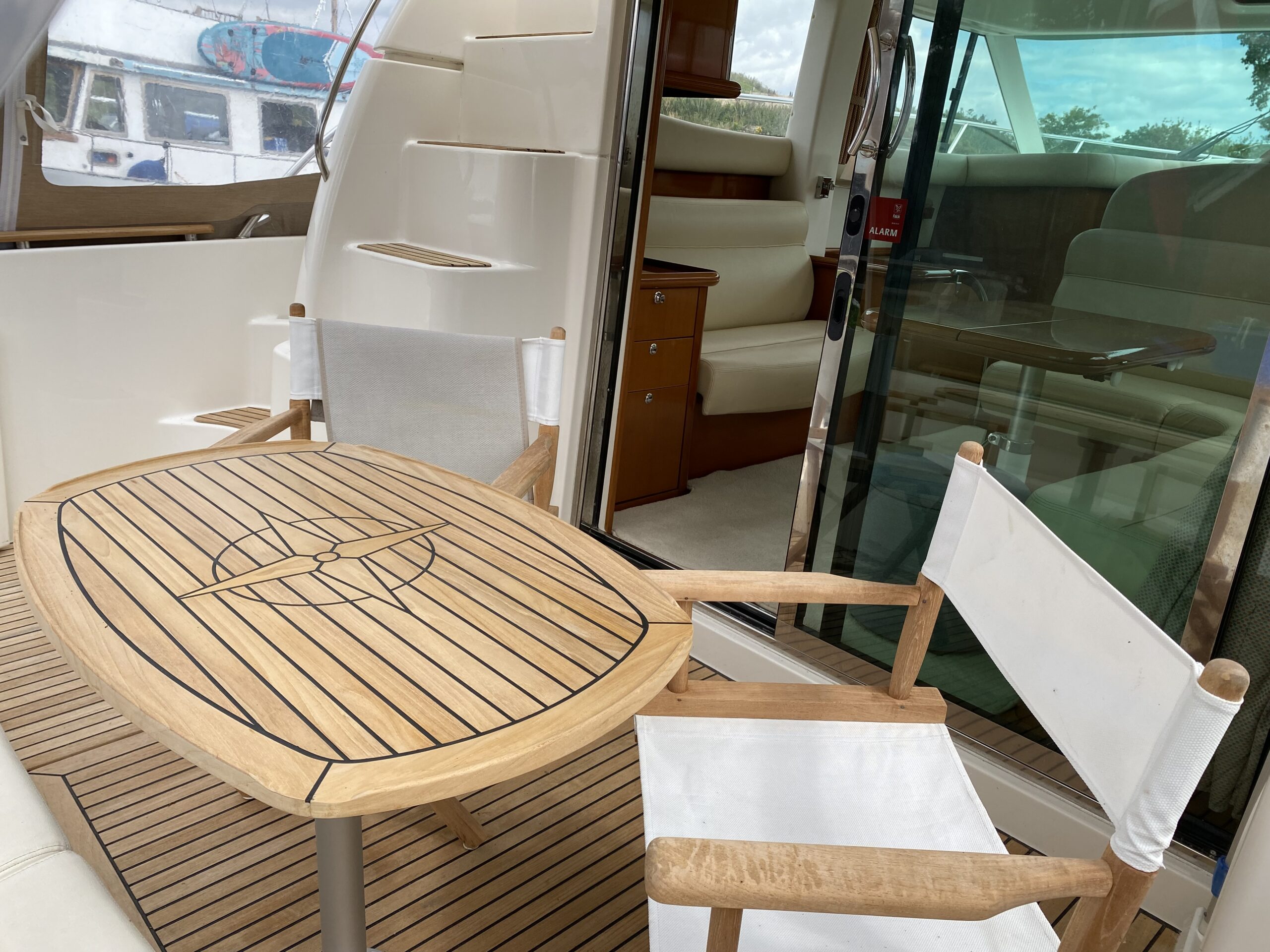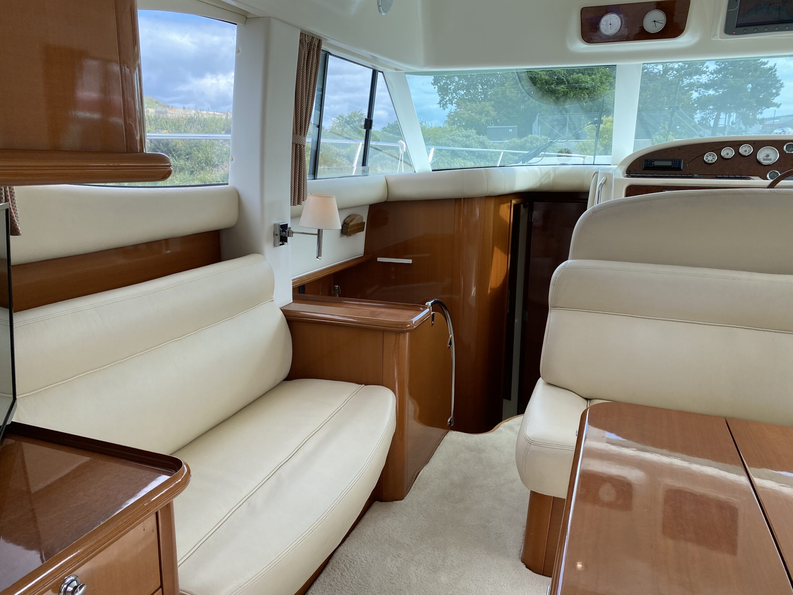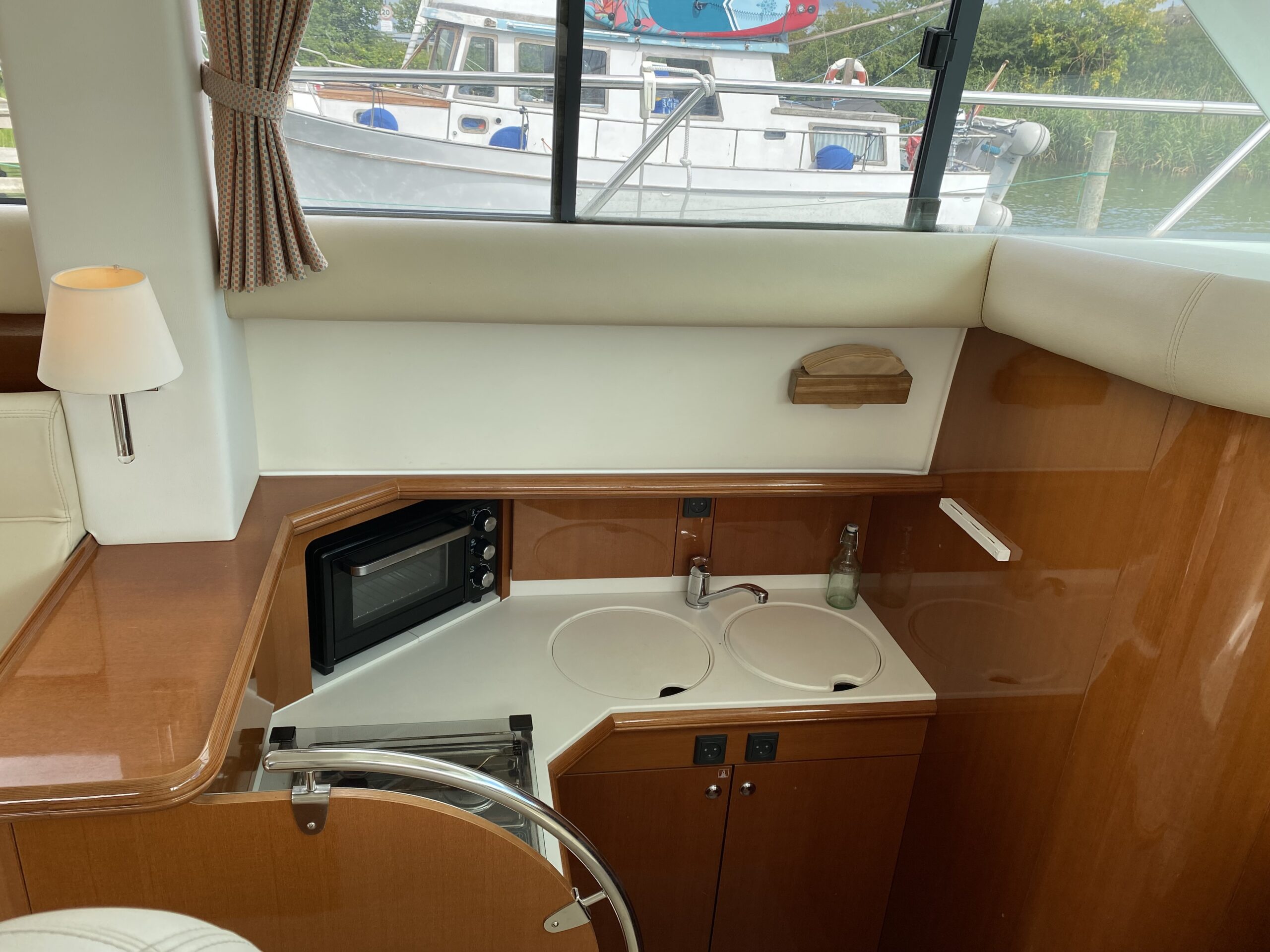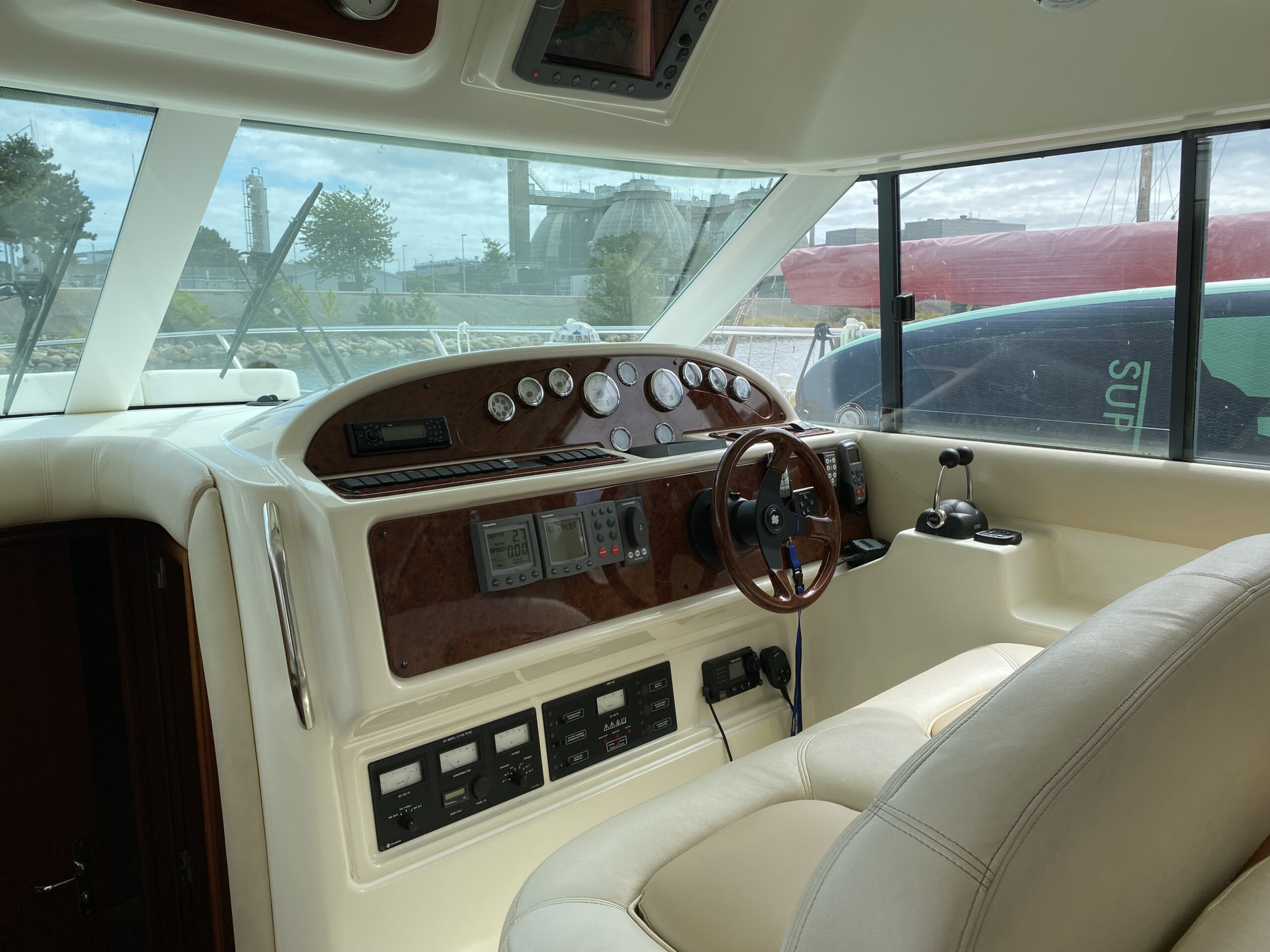 Jeanneau 36 Prestige er en stor velbygget flybridgebåd fra et af verdens største værft. Båden er velsejlende og velindrettet til familien som ønsker plads, komfort og sikker sejlads. En fantastisk turbåd til fire personer som leverer komfort også på de lange ture. Den føles sikker, tung og stabil hele vejen – også i skarpe sving. Båden cruiser meget behageligt, harmonisk og med mere graciøse bevægelser end mange af konkurrenterne – selv i regn og blæst. Båden har en dejlig stor, rektangulær badeplatform med badestige og brusemulighed. Adgangsdør til agterdækket med gode stuverum. Både badeplatform og dørk samt trappe er teakbelagt. Flybridgen er trukket et godt stykke agterover og med kalechen giver den en god beskyttelse af agterdækket. Her er god plads og kan byde hele familien velkommen. Adgang til flybridge via den faste trappe. Her er to pilotstole, stort instrumentbord og L-sofa med bord samt god solmulighed. Fra agterdækket er der via stor rustfri skydedør adgang til hovedsalonen. Her er lækker stor L-formet sofa med god plads til 4-5 personer. I bagbord side er der yderligere en topersoners sofa. Dækssalonen er meget elegant, der er cremefarvet handskeskind på førerstol og sofaer. Alt er lyst og lækkert med en flot imponerende træapteringen i mahogny. Et lækkert salonbord med klapper således at de to sofaer kan indgå i fælles hygge omkring bordet. I hver side er der skydevinduer og det L-formede pantry er placeret to trin nede, forude i bagbord side. Her er to vaske i rustfrit stål, miniovn, tre-blus gaskomfur, stort køleskab med frys og store og små skabe. Mellem pantry og forkahytten er toiletrummet. Det er meget funktionelt, helstøbt og med skydeglasvæg til bruserummet. Der er to døre – den ene direkte til ”owners cabin” fremme i båden. Forkahytten har en stor, fritstående dobbeltseng med god plads rundt om. Lys og ventilation kommer ind ad dækslugen og to ovale, oplukkelige koøjer. Der er mange stuverum og et stort klædeskab.