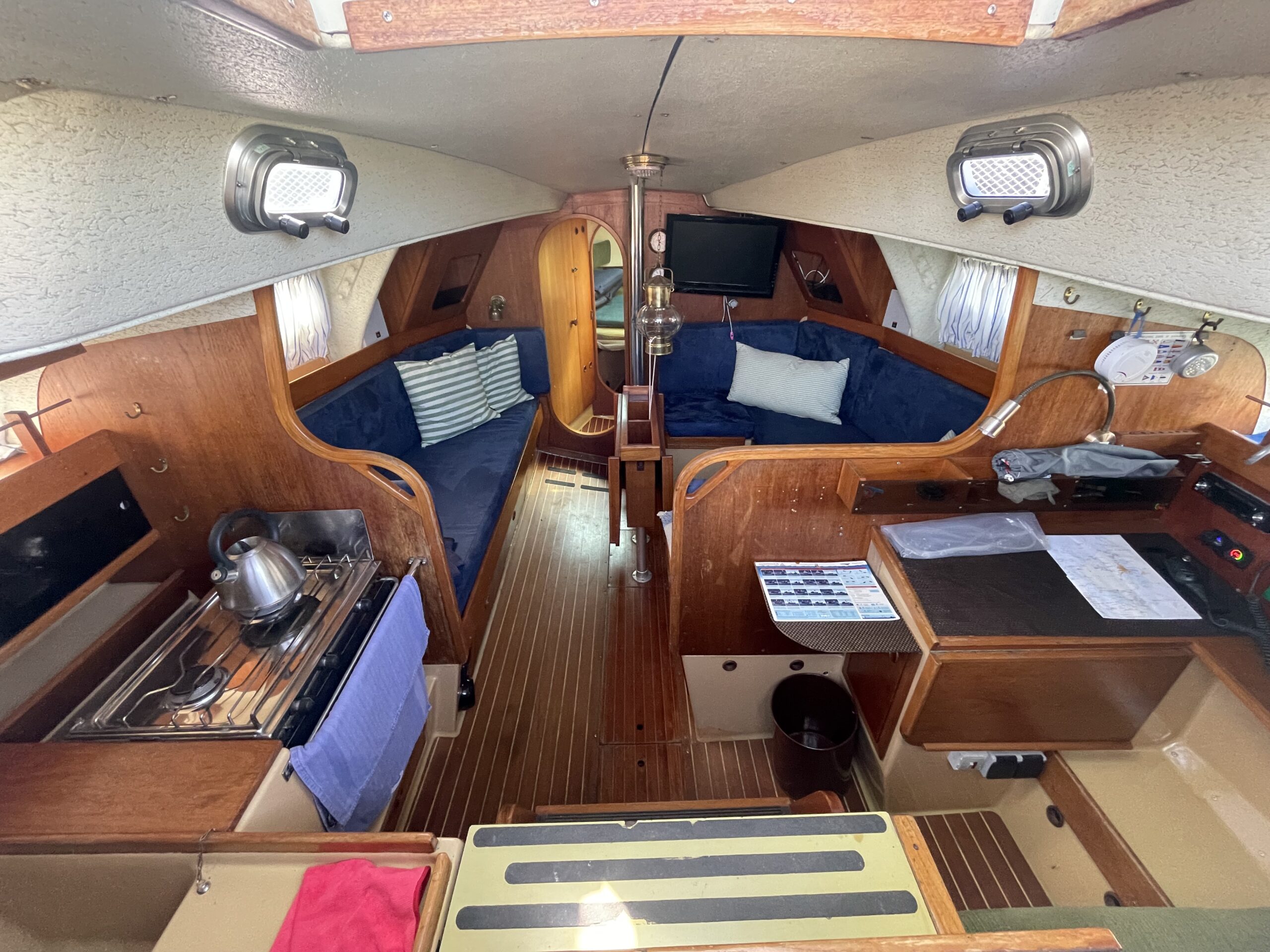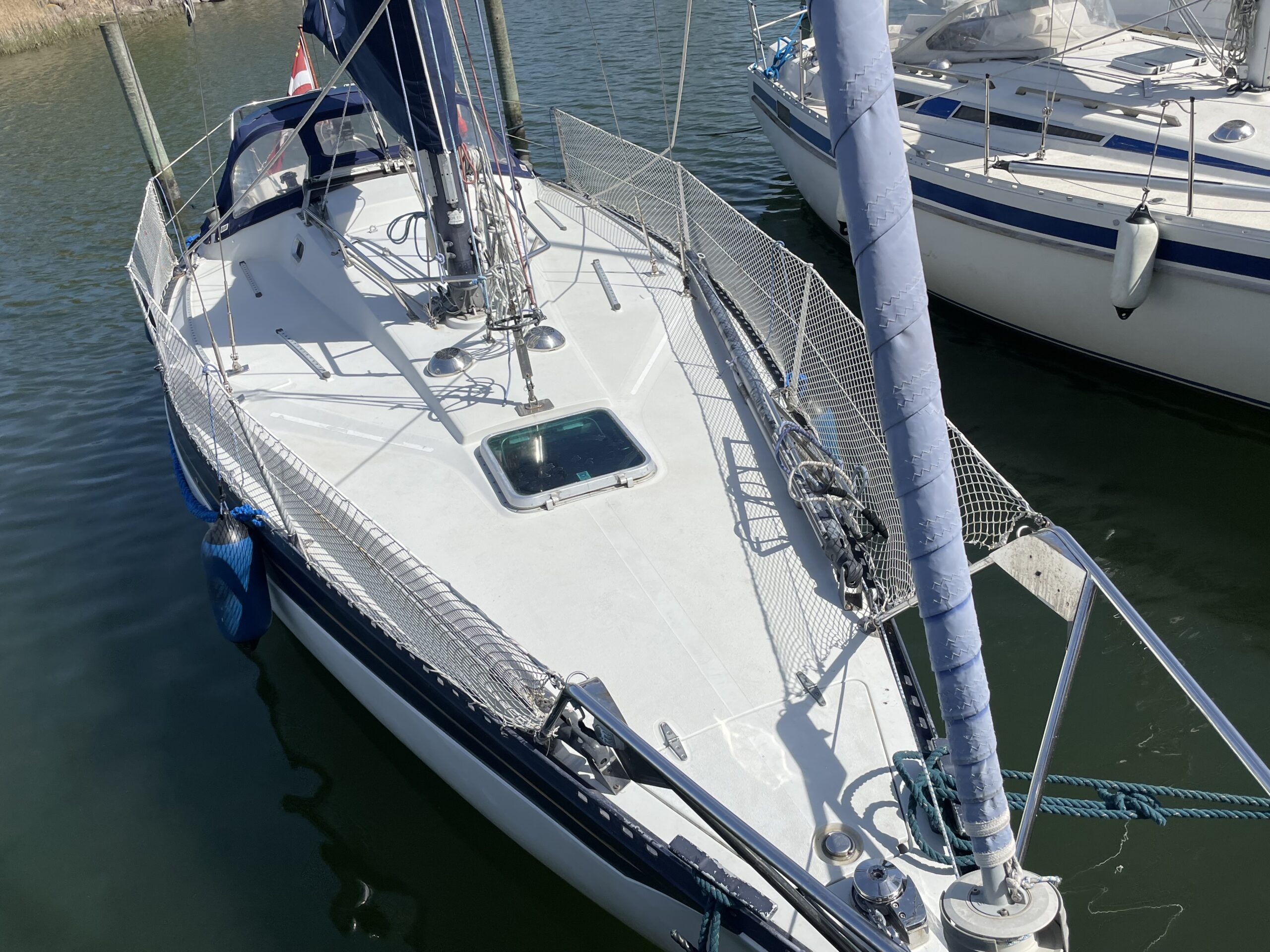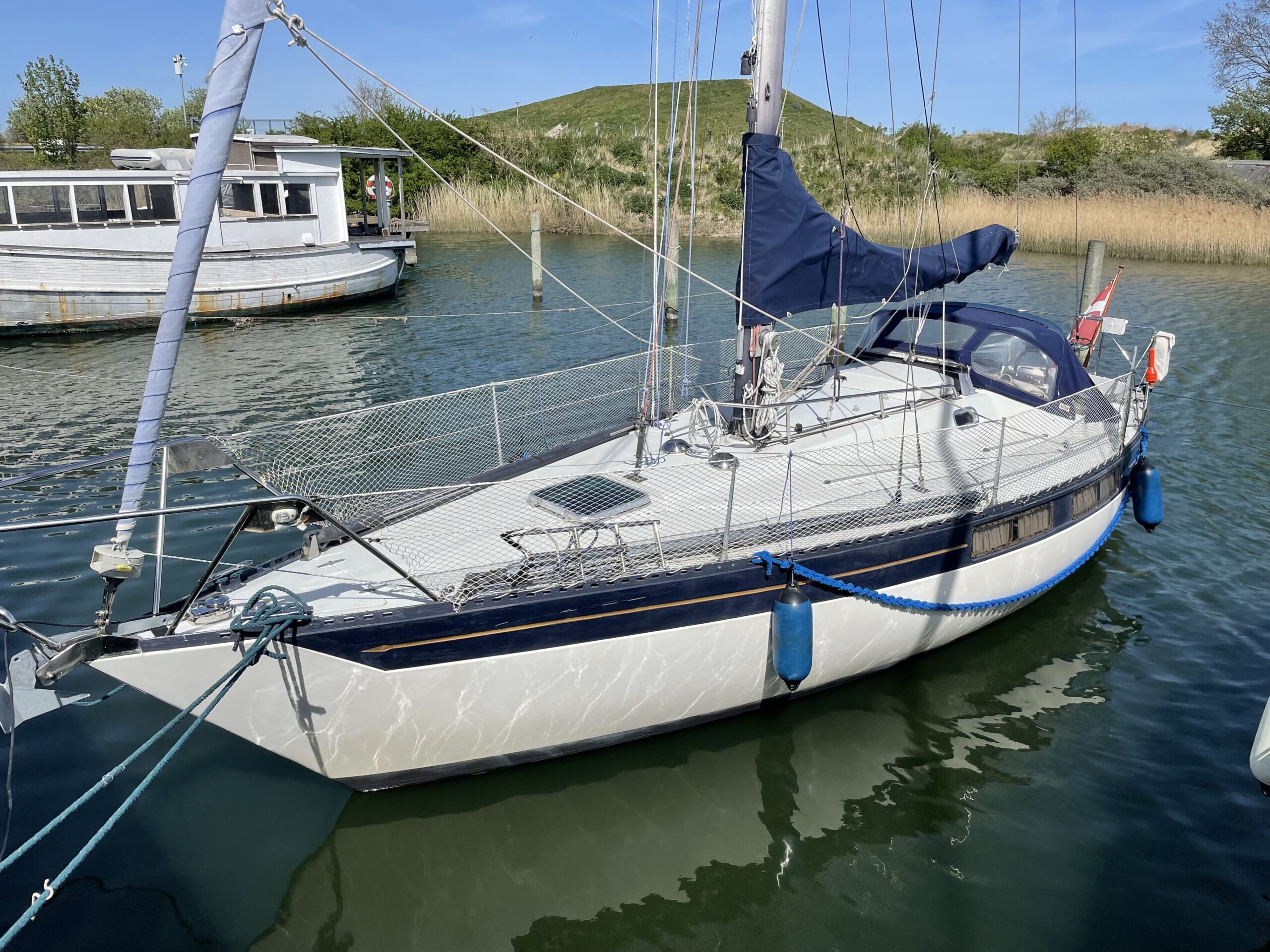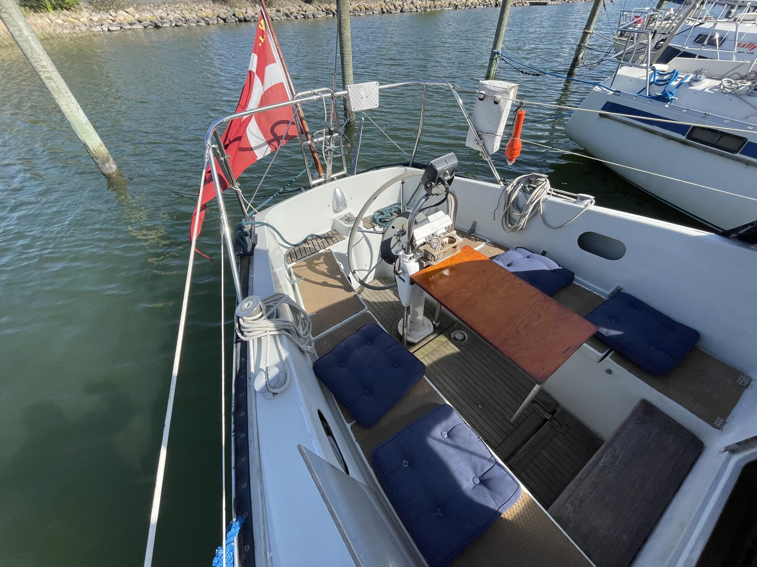 Familievenlig og velsejlende sejlskib med masser af plads og comfort. Denne Kings Cruiser er fra 1975 , en helt igennem en regulær og velfungerende båd for familien som ikke er klar til at bruge halve eller hele millioner på 33 fod. Stort cockpit med Sprayhood og kaleche sikre god udnyttelse også på de regnfulde dage. Nedgang til hyggelig og rummelig kahyt med fin pantryløsning og modsat kortbord. lille Agter køje. Stor sofagruppe med bordløsning som kan benyttes som to ekstra køjepladser og fremme yderligere kahyt med dobbeltkøje og skabsløsning. Toiletrum med vaskemodul. Båden er løbende opdateret med div udstyr og er velfungerende – En god pris for rigtig meget båd.