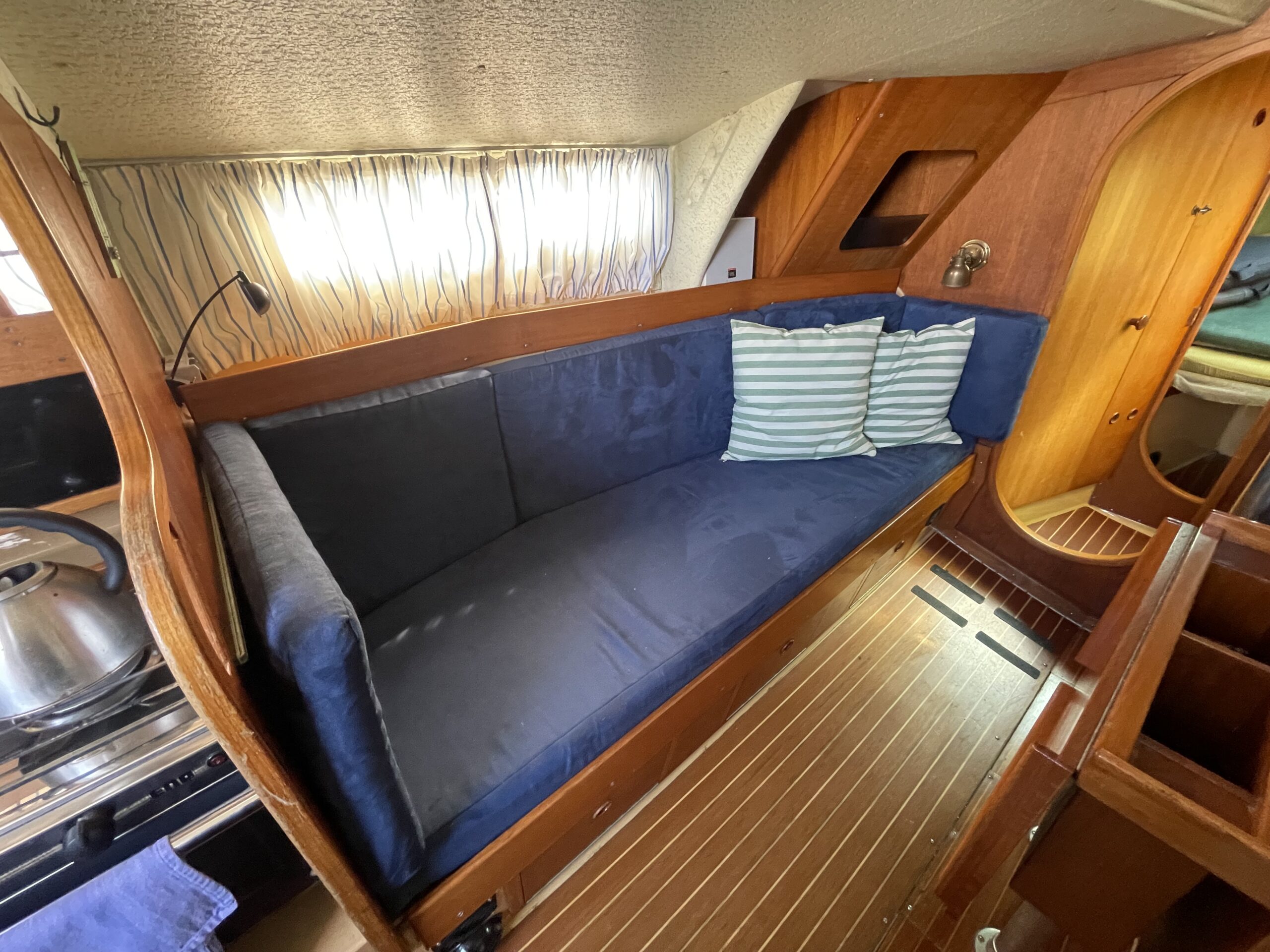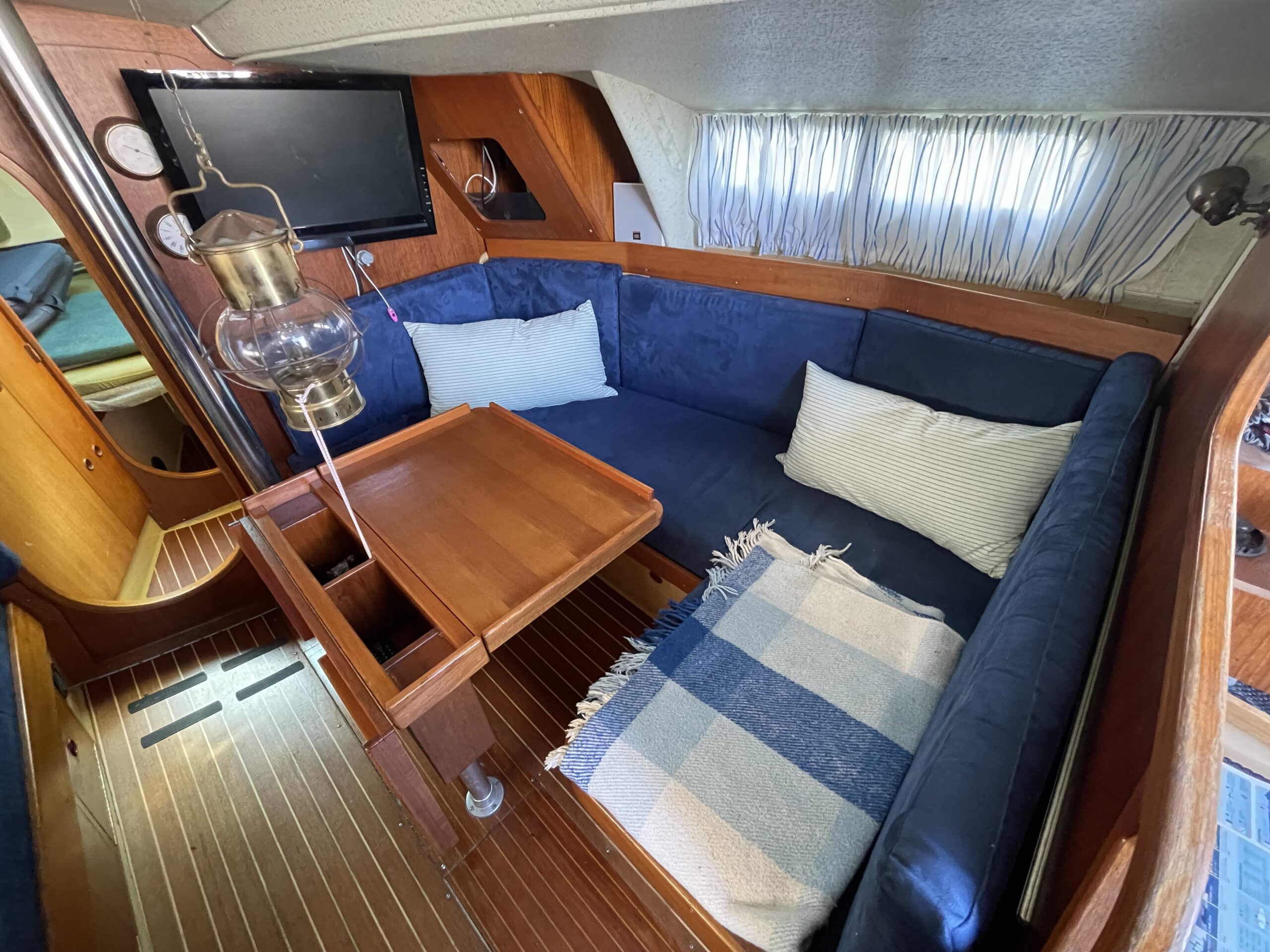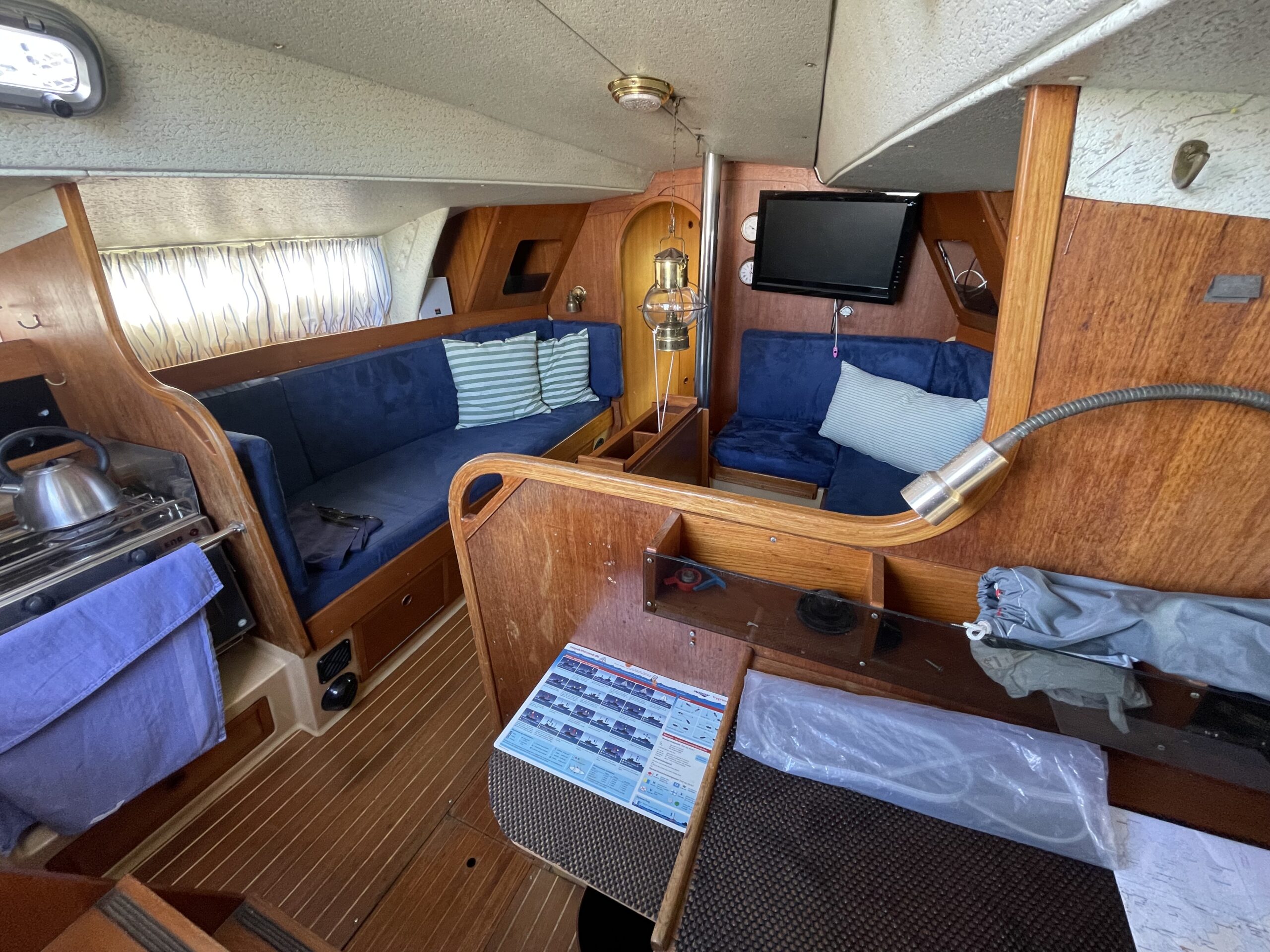 Familievenlig og velsejlende sejlskib med masser af plads og comfort. Denne Kings Cruiser er fra 1975 , en helt igennem en regulær og velfungerende båd for familien som ikke er klar til at bruge halve eller hele millioner på 33 fod. Stort cockpit med Sprayhood og kaleche sikre god udnyttelse også på de regnfulde dage. Nedgang til hyggelig og rummelig kahyt med fin pantryløsning og modsat kortbord. lille Agter køje. Stor sofagruppe med bordløsning som kan benyttes som to ekstra køjepladser og fremme yderligere kahyt med dobbeltkøje og skabsløsning. Toiletrum med vaskemodul. Båden er løbende opdateret med div udstyr og er velfungerende – En god pris for rigtig meget båd.