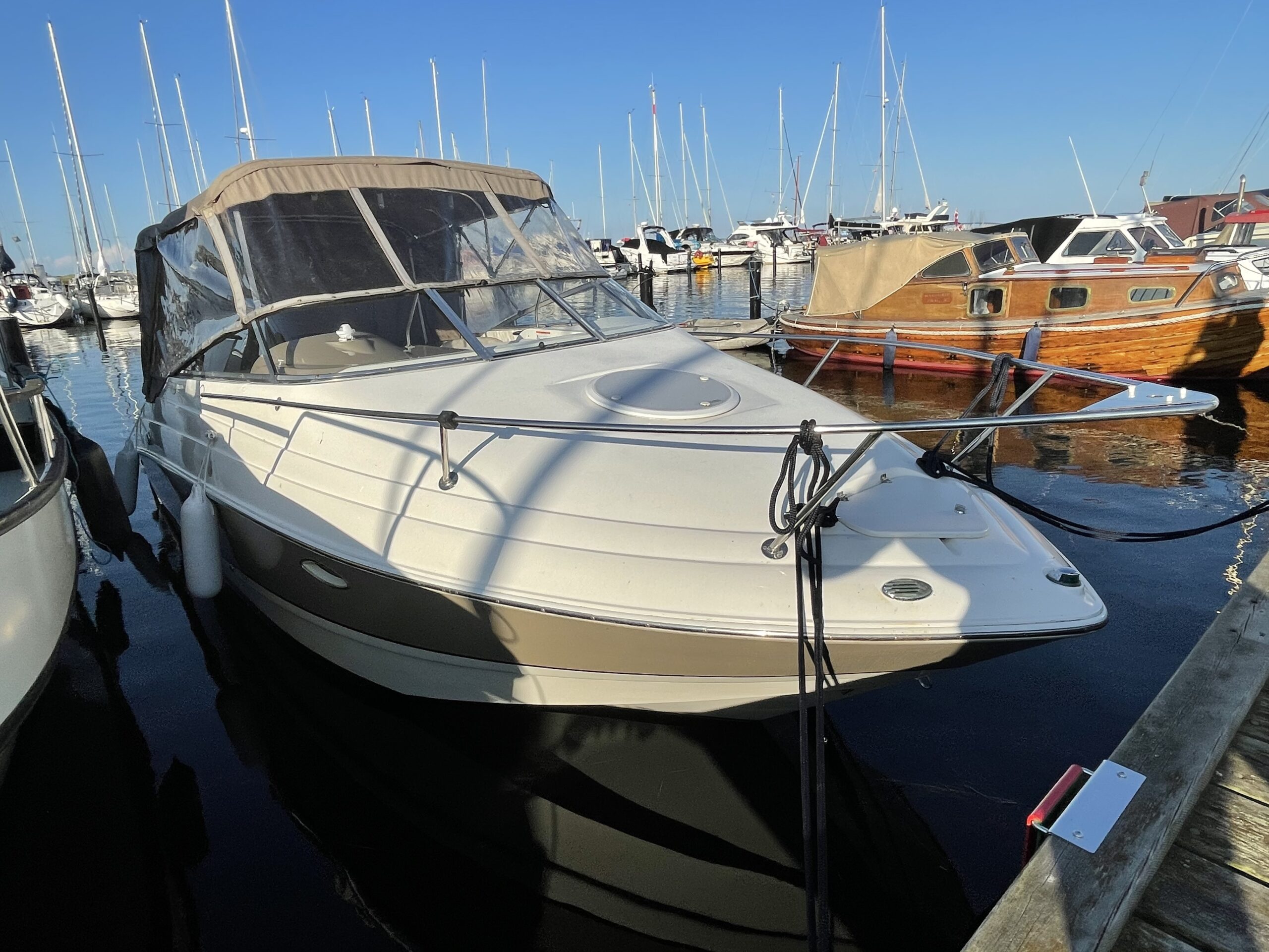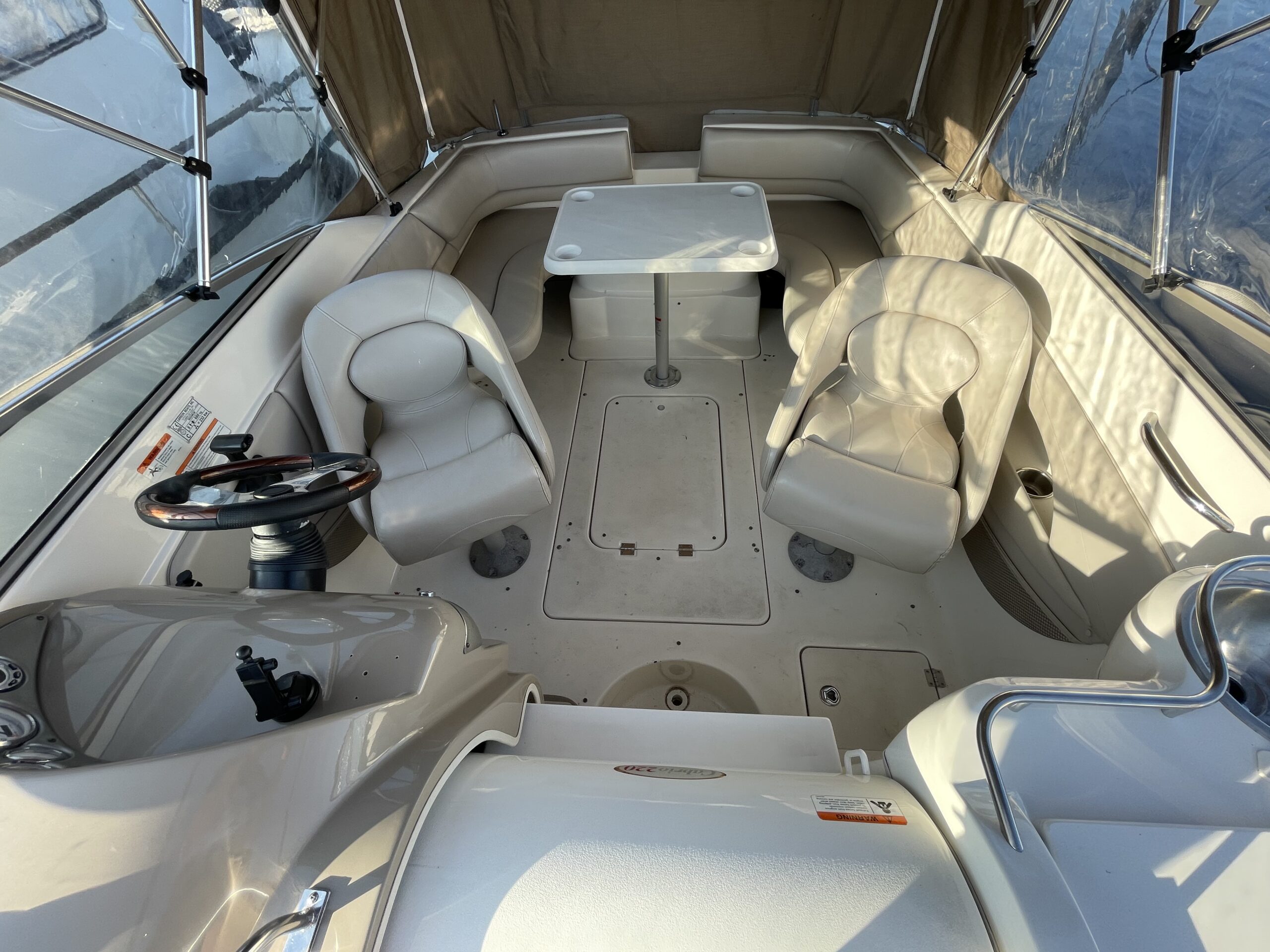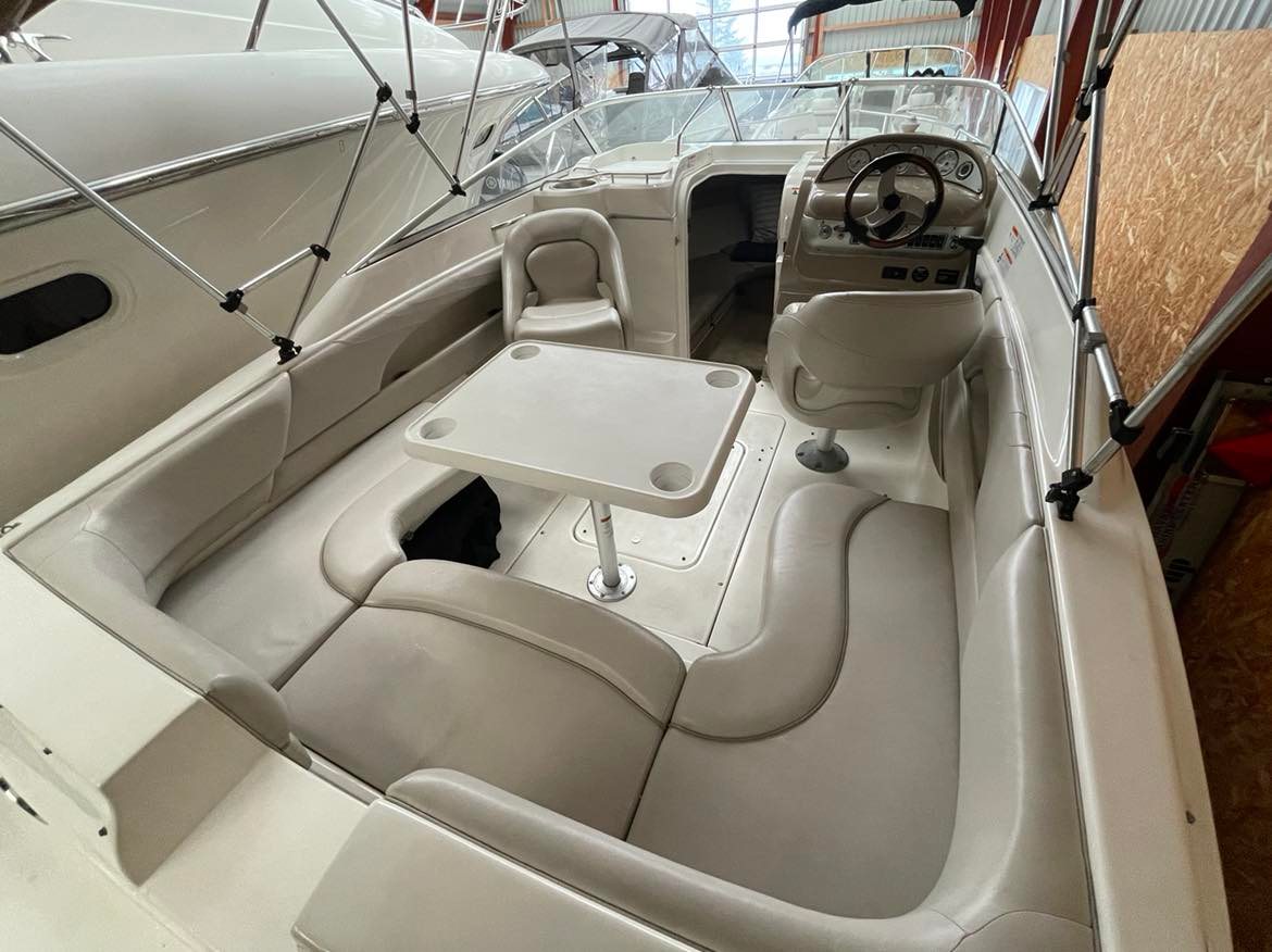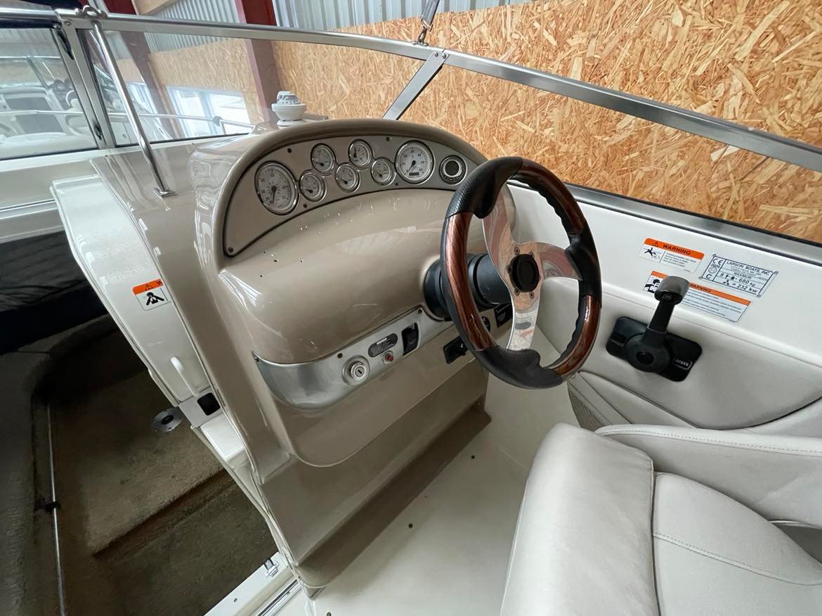 Larson 220 Cabrio Klassens bedste cockpit med stor sofagruppe og bordløsning som let kan omdannes til stor solplads. To førerstole med mulighed for at dreje rundt og deltage i sofahyggen. Fin lille smart pantrysektion med vask, kogeblus. Hyggelig kahyt med god loft højde fin sofagruppe som kan omgøres til stor dobbeltkøje for to voksne. Toilet “afdeling”. Dejlig stor badeplatform med badestige, lækre løsninger over alt. Virkelig en perle for den der søger en day cruiser med gode siddepladser.