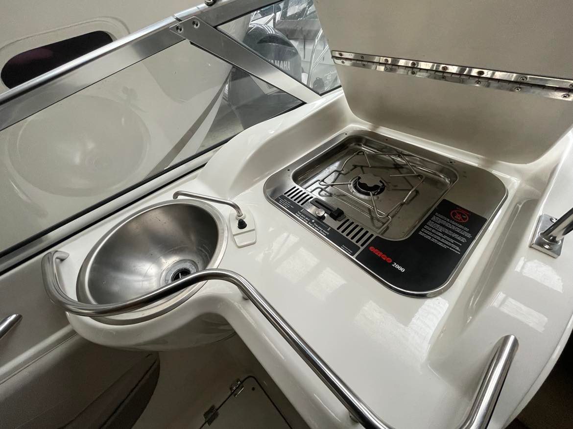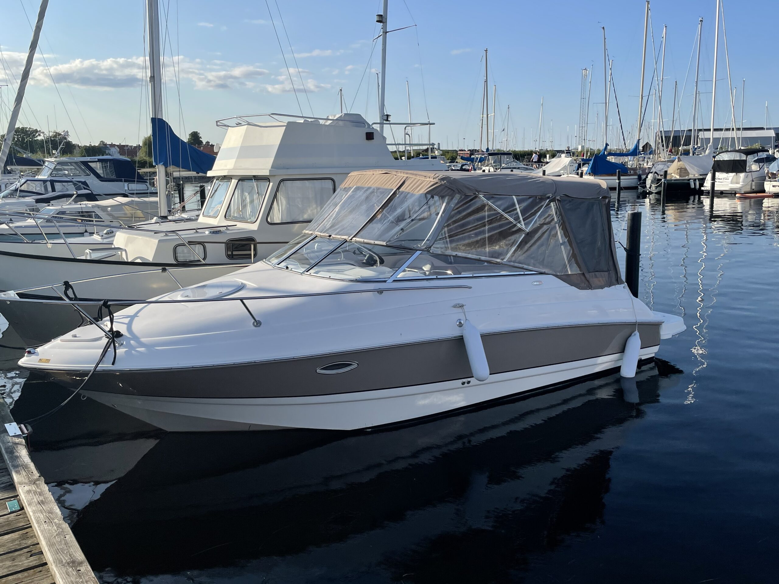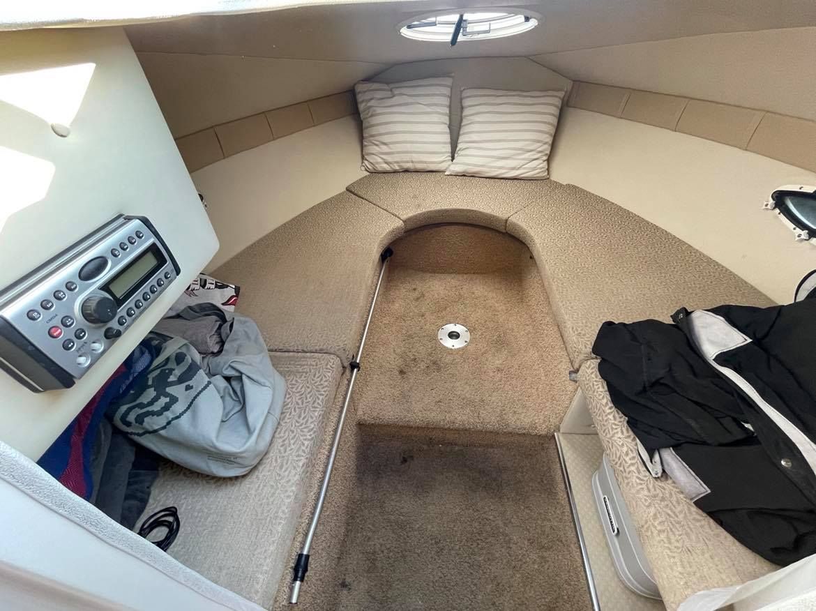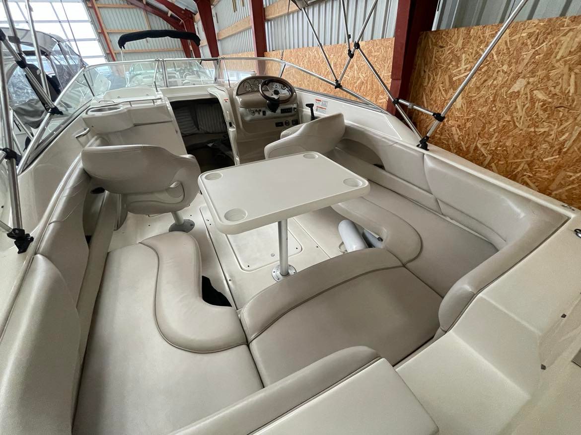 Larson 220 Cabrio Klassens bedste cockpit med stor sofagruppe og bordløsning som let kan omdannes til stor solplads. To førerstole med mulighed for at dreje rundt og deltage i sofahyggen. Fin lille smart pantrysektion med vask, kogeblus. Hyggelig kahyt med god loft højde fin sofagruppe som kan omgøres til stor dobbeltkøje for to voksne. Toilet “afdeling”. Dejlig stor badeplatform med badestige, lækre løsninger over alt. Virkelig en perle for den der søger en day cruiser med gode siddepladser.